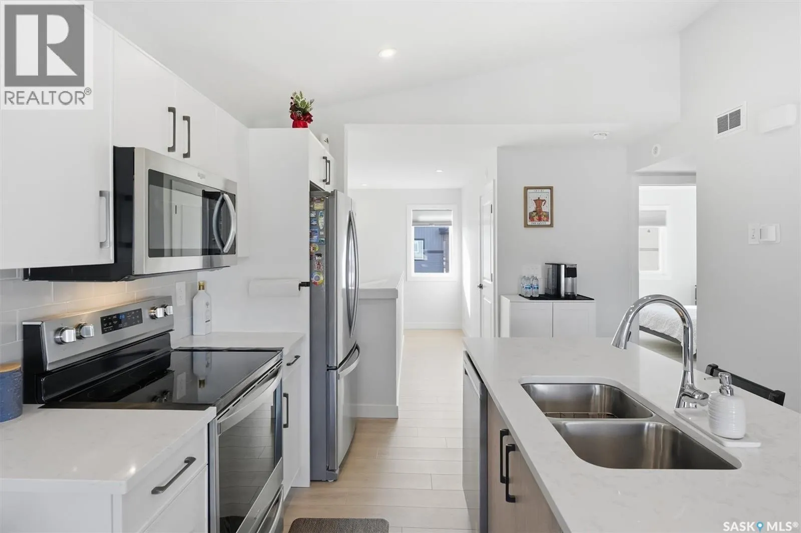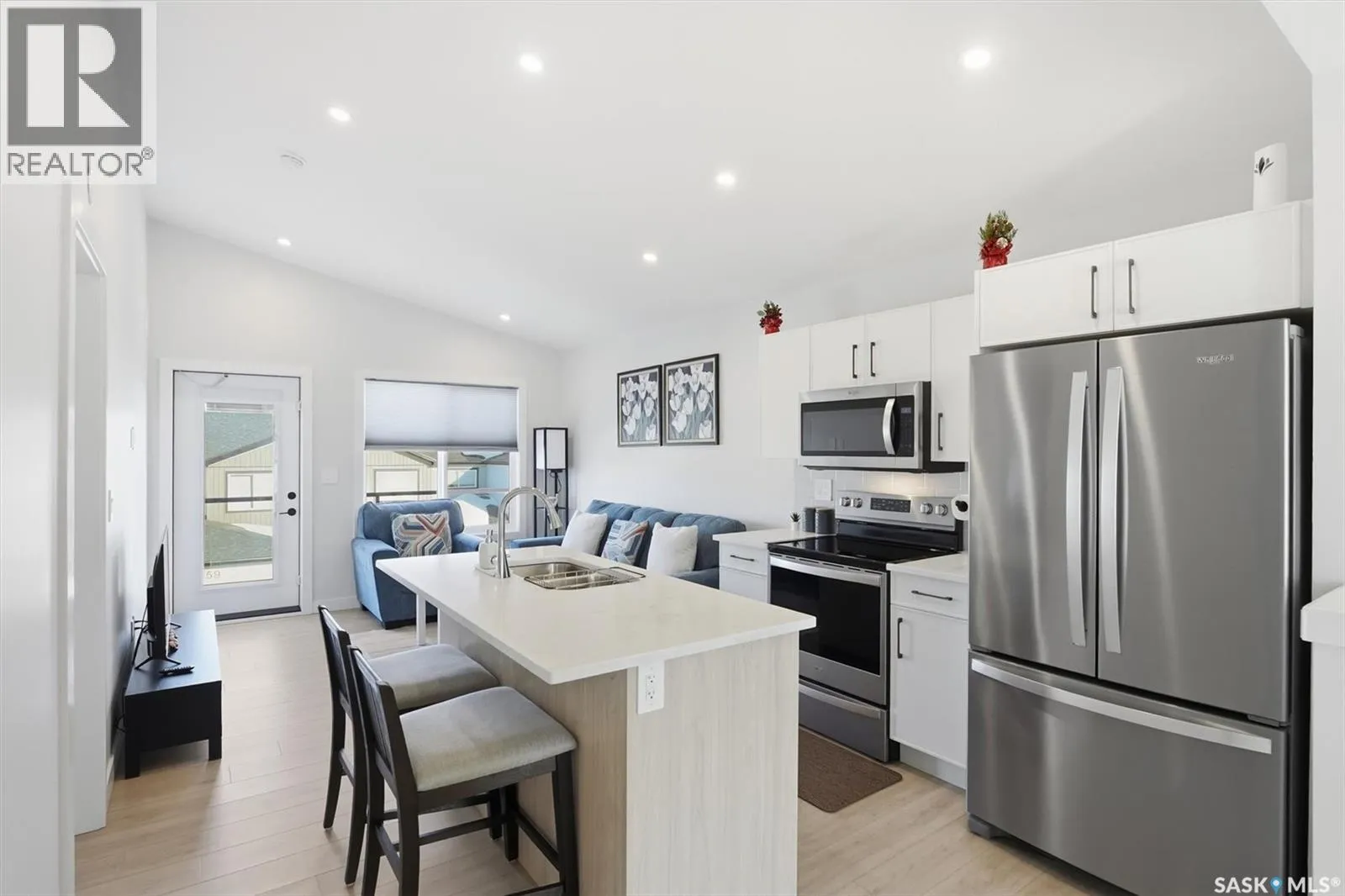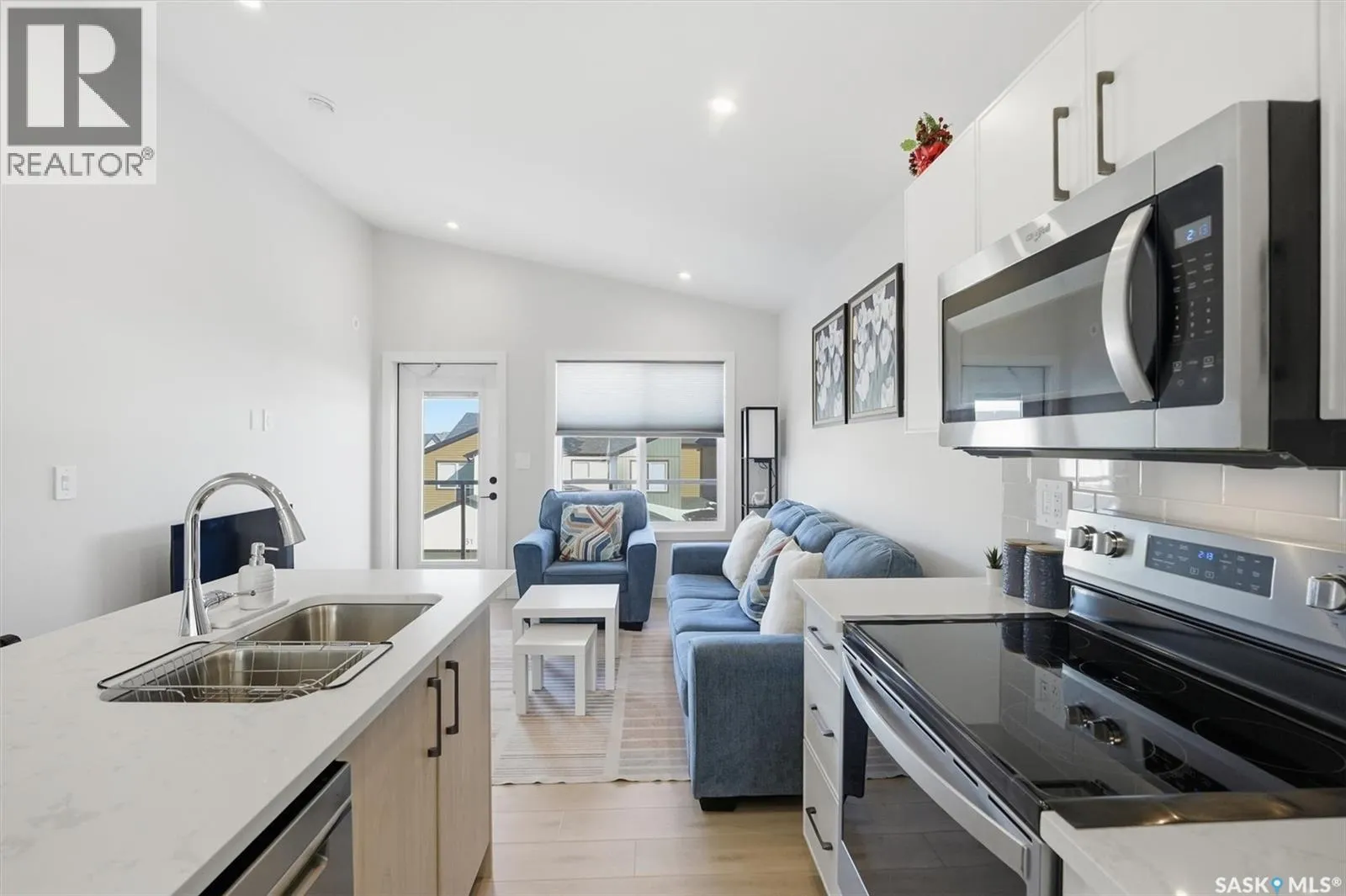 Exceptional 2 bedroom townhouse located at the "North Ridge Towns Dubois" community in Brighton! This 1011 square foot home with single attached garage is in show like condition and has been meticulously kept from top to bottom complete with many stylish finishes including vinyl plank flooring throughout the living spaces! This top floor condo has an open concept design that includes a gorgeous kitchen, a spacious living room, 2 good sized bedrooms, laundry, storage, and a full 4-pce bath. With vaulted ceilings and natural light welcoming you first thing in the morning and into the evening, this home provides a bright and airy feel any time of the day. All construction was complete in 2025 at the North Ridge Towns Dubois project providing a peaceful surrounding for you to enjoy. Located directly across the street from Brighton Core Park, this prime location is only a few minute walk to trails, splash park, playground, sports fields, and future school. Includes kitchen appliances, washer and dryer, central air conditioning, and all window coverings. Call to view! (id:27476)
