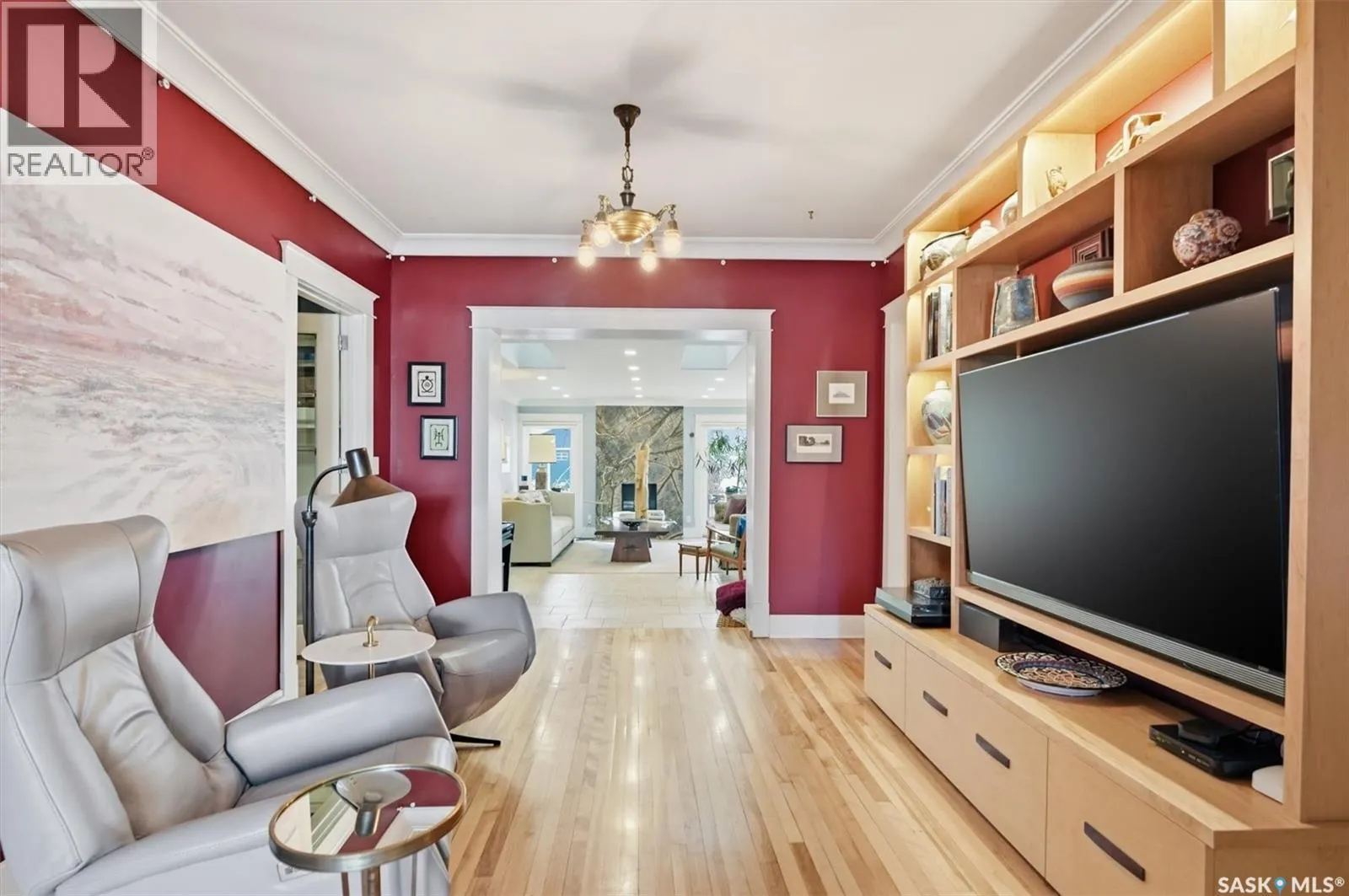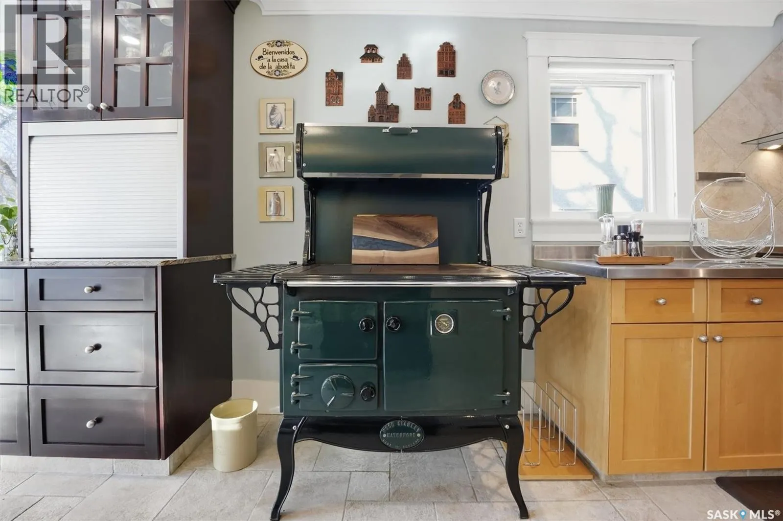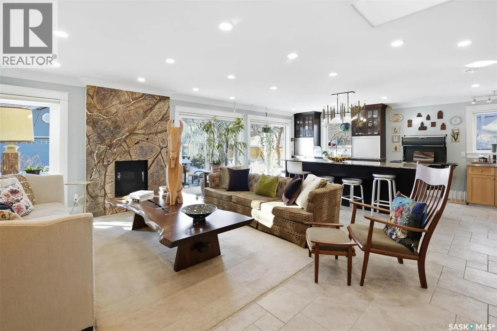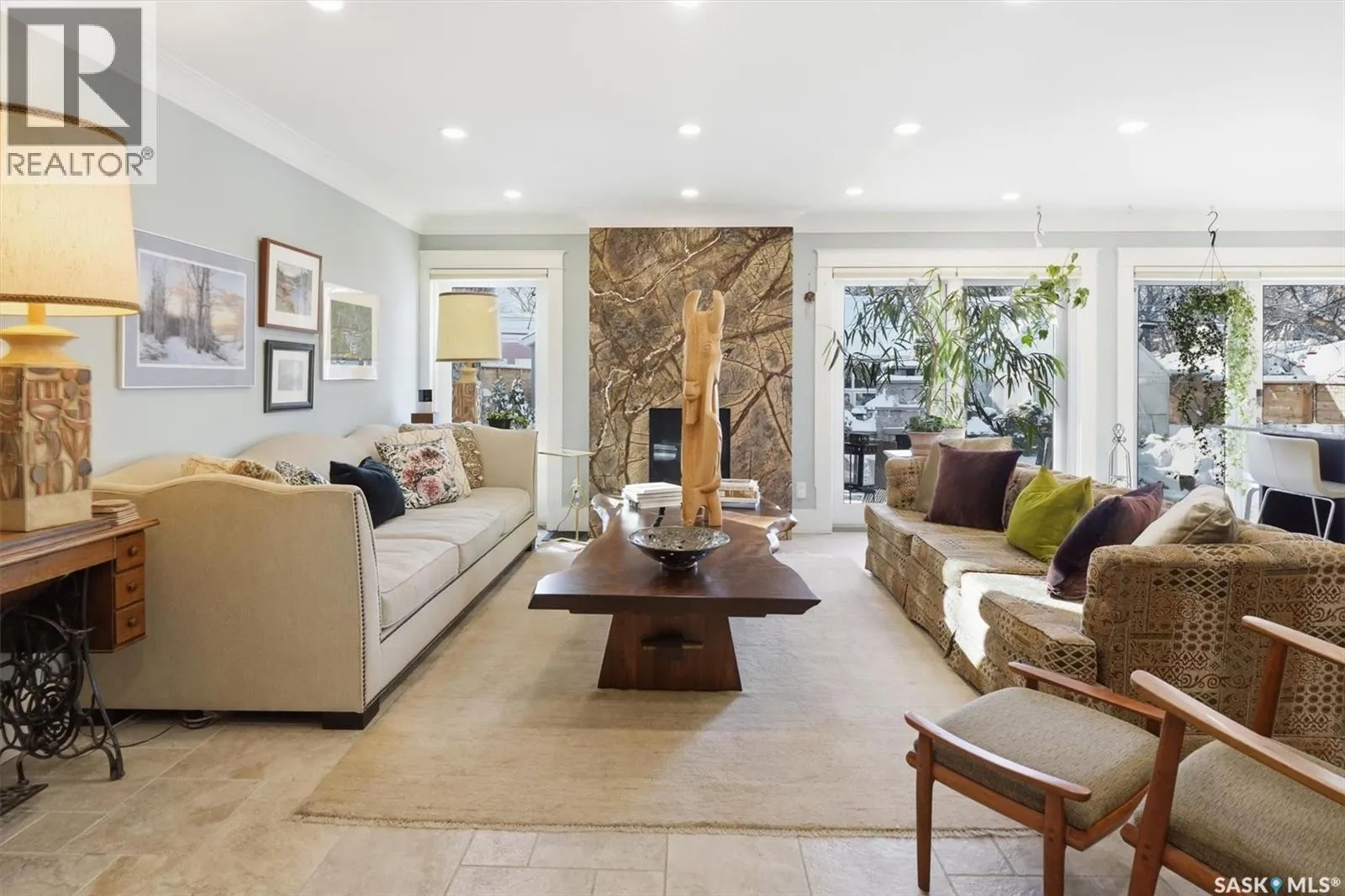 This home is a masterclass in blending timeless character with modern luxury, offering over 2,700 square feet of meticulously renovated living space across three finished levels. From the moment you step inside, the warmth of years is evident, starting with an expansive open floor plan that flows naturally into an incredible great room defined by a wall of windows and a cozy gas fireplace. The heart of the home is undoubtedly the gourmet kitchen, a chefâs dream outfitted with an elite appliance package including Sub-Zero refrigeration, a Wolf gas range, Miele steam and wall ovens, a Bosch dishwasher and a Waterford wood-burning stove. A ten-foot marble island serves as the center of the room. The main floor is designed for both grand entertaining and private retreat, featuring a formal dining room and a cozy TV room, both anchored by beautifully refinished original maple hardwood floors. The primary suite is conveniently located on this level featuring loads of closet space, a spa-like full bath, equipped with a walk-in shower, and a classic clawfoot tub. Practicality meets style in the mudroom, 1/2 bath and laundry area. Ascending to the second level, you will find three well-appointed bedrooms and a full bath, while the third level opens up into a massive bonus room perfect for a home office, gym, or play area. The lower level includes a modern three-piece bathroom alongside ample storage and utility space. Stepping through either of the two sets of garden doors leads you into a south-facing backyard oasis that feels worlds away from the city. Beautifully landscaped, 50 ft. lot with lush perennials, a tranquil fish pond, and a functional B.C. Greenhouse, a patio area features a wood-burning fireplace. The property is completed by a double garage that includes a heated workshop or studio. Located in an absolute prime district, the rare opportunity to walk to the University of Saskatchewan, the vibrant Broadway area, and the downtown core. (id:27476)