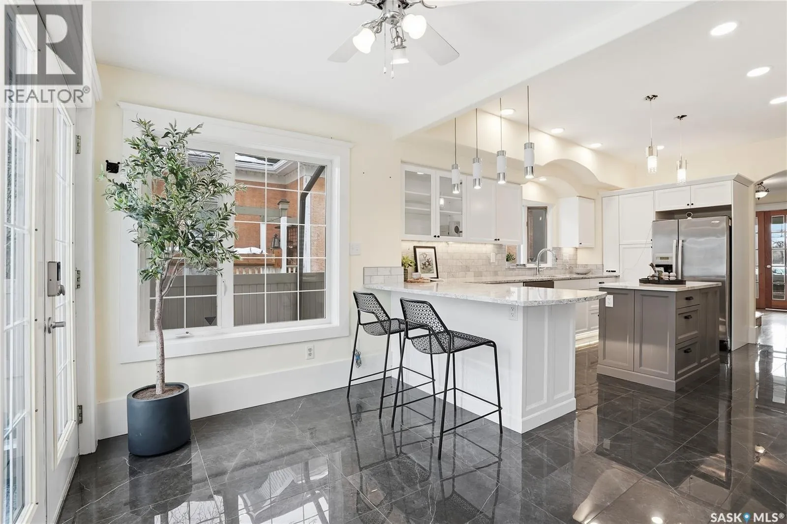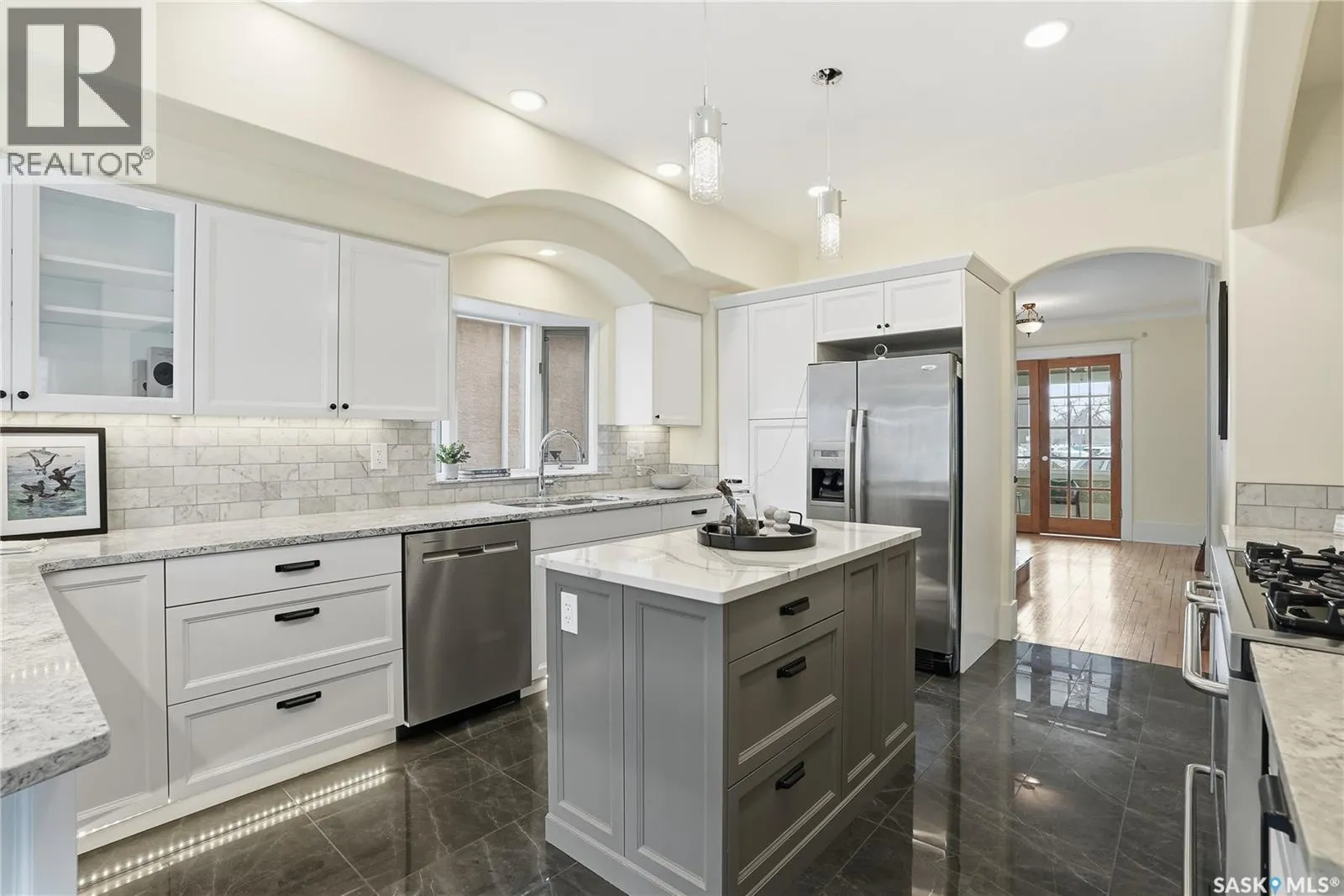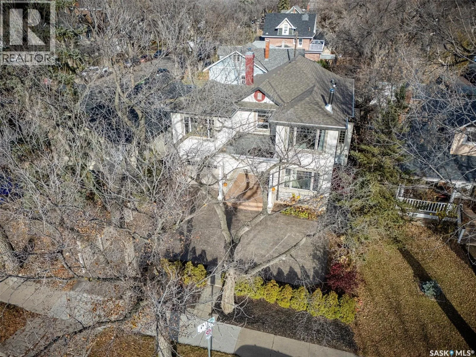 Donât miss this INCREDIBLE character home in one of Saskatoonâs most desirable neighbourhoods! A stately family home with a fully developed basement with separate entry. This property exudes pride of ownership with charm and professional updates throughout. Enter into the main floor to find a welcoming sunroom and foyer, living room with wood burning fireplace, and a formal dining with a bay window. At the heart of the home is a chefâs DREAM KITCHEN- spacious and beautifully appointed with quartz countertops, stainless appliances, and a sit-up eating area that opens onto a sitting room, overlooking a large deck and private yard. A 2-pc bath completes the main. Upstairs, youâll find 3 bedrooms: a primary suite with an ensuite and a charming private deck of the master. Two additional lrg bedrooms and a newly renovated 3-piece bathroom complete 2nd flr. Large windows flood every room with natural light, highlighting the significant character. Extensive renovations and upgrades have been meticulously completed recently, blending heritage with modern class. The unique dev basement offers a modern living room, lounge and 1 bed layout with a sep entrance, 4-pc bath, 2x laundry, kitchenette, and a family room w/ gas fireplace â ideal for additional cash flow. The oversized, heated att garage includes a large attic storage area above. The front yard is low maintenance with a stamped concrete driveway providing parking 3 vehicles. The private backyard will impress w/manicured grounds: a two-tiered deck, garden boxes, artificial turf, curbing, and climbing vines. In total, there are three decks, including a covered front deck and the private balcony off the master. Upgrades include: furnace, hot water heater, shingles, garage, decks, kitchen, two bathrooms, basement development, many new windows, updated exterior, and driveway â the list goes on! This gem is ideally situated within walking distance to the river, downtown, U of S, and all hospitals, the location is unbeatable! (id:27476)