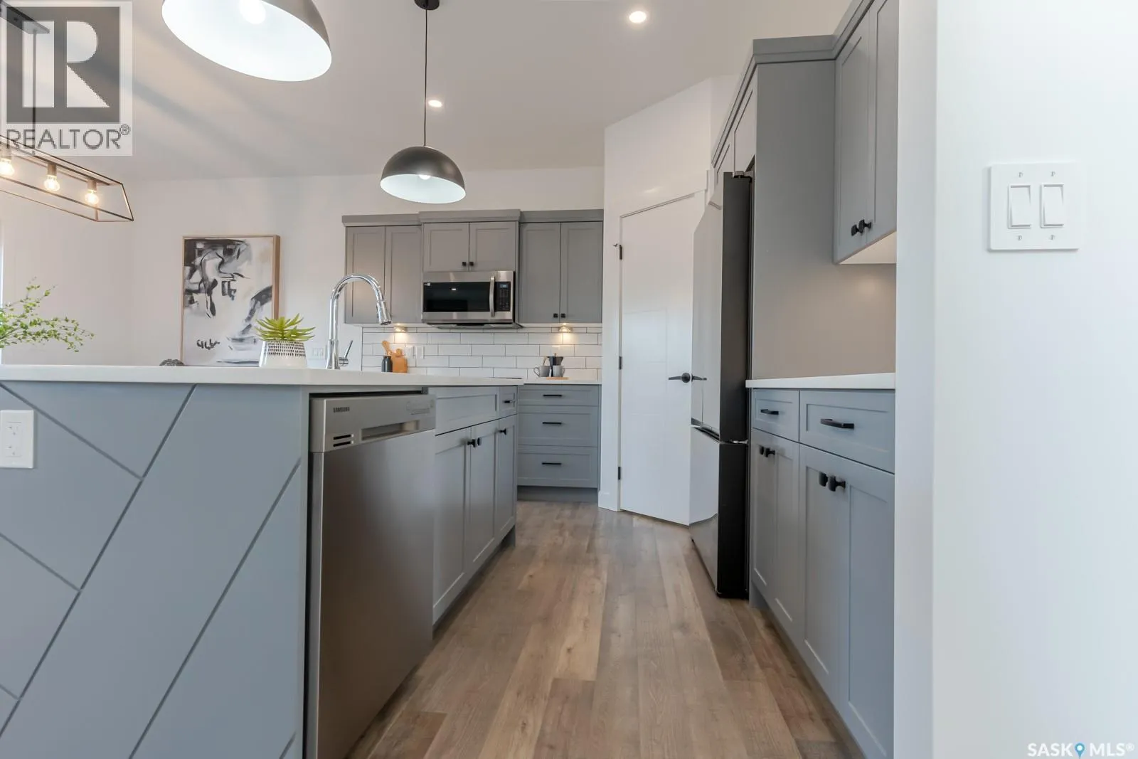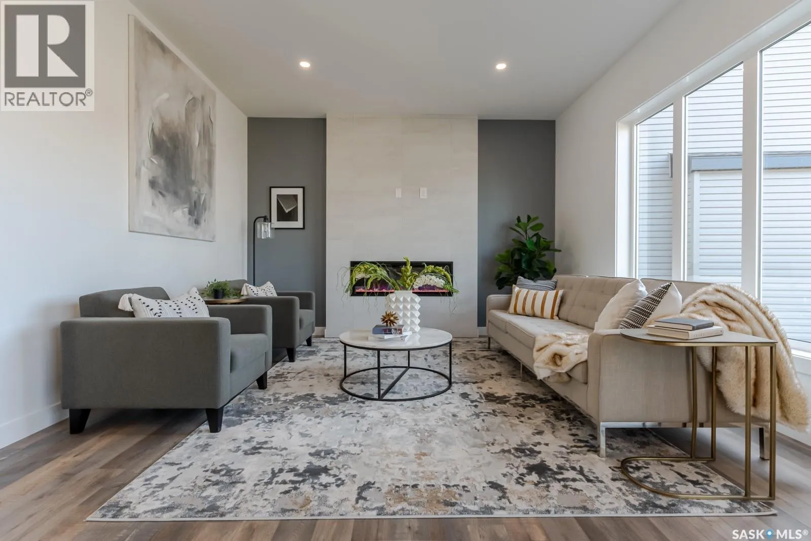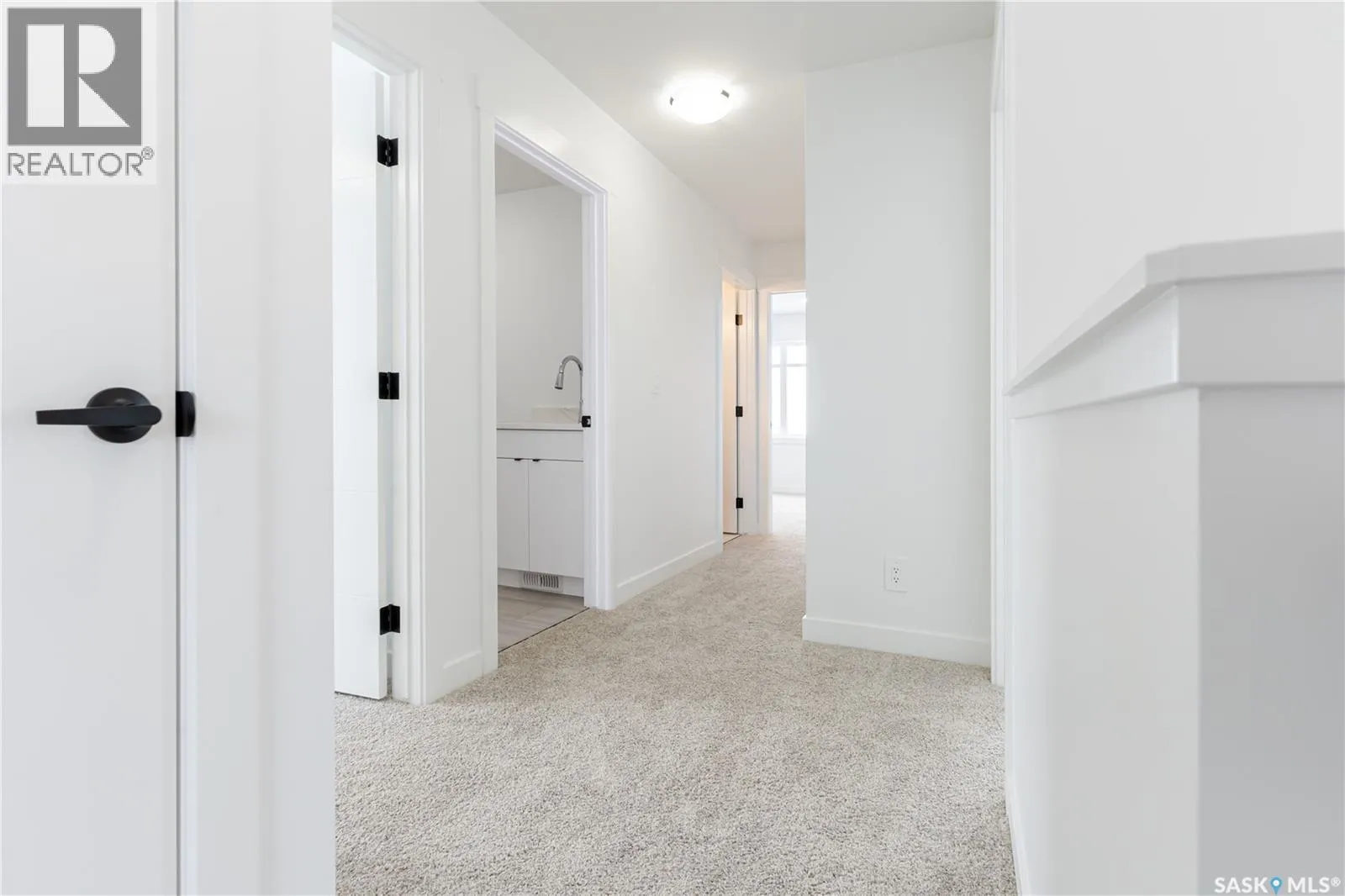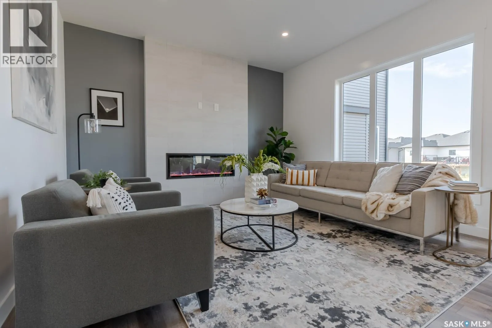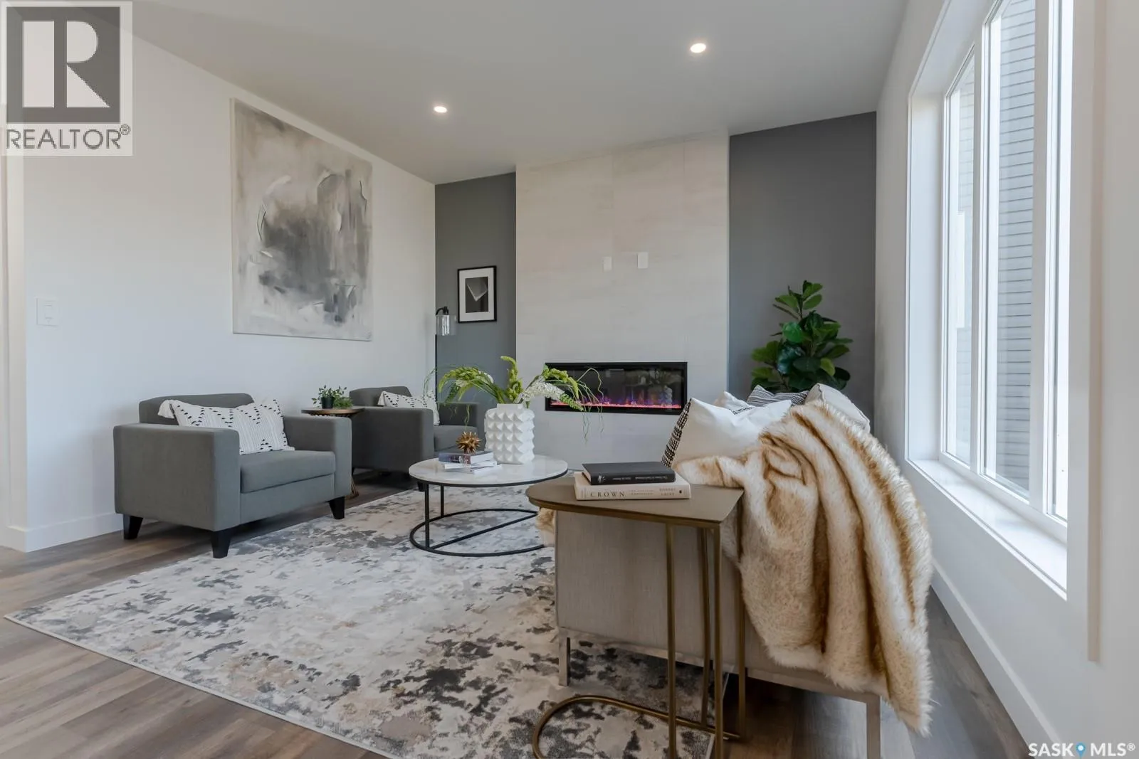 Welcome to The Escada! This beautifully designed 1,848 sq. ft. two-story home. Step inside from the fully insulated garage into a convenient mudroom that leads directly to the walk-through pantry. The modern kitchen features custom cabinetry, quartz countertops, a stylish backsplash, and a spacious island. An oversized patio door in the dining area and large living room windows fill the space with natural light, while the fireplace creates a cozy atmosphere for winter evenings. Upstairs, a bonus room at the front of the home offers additional living space. The primary bedroom, located at the back, boasts a spacious walk-in closet and a 5' custom tiled shower in the ensuite, complete with dual sinks and extra vanity storage. Two additional bedrooms, a laundry area with a cabinet and sink, and a well-appointed main bath complete the second floor. Outside, the home includes a concrete driveway and front landscaping. Built by Edgewater Homes, this property is covered under the Sask New Home Warranty for peace of mind. Please note: Photos may not be exact representations of the home and are for reference only. Errors and omissions excluded. Prices, plans, and specifications are subject to change without notice. PST & GST included with rebate to builder. (id:27476)