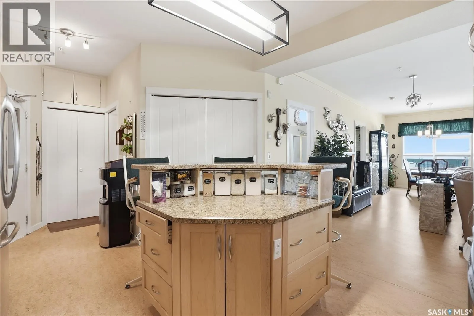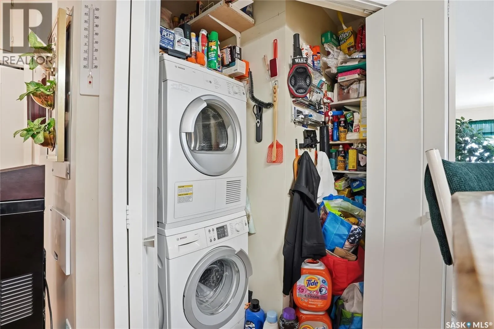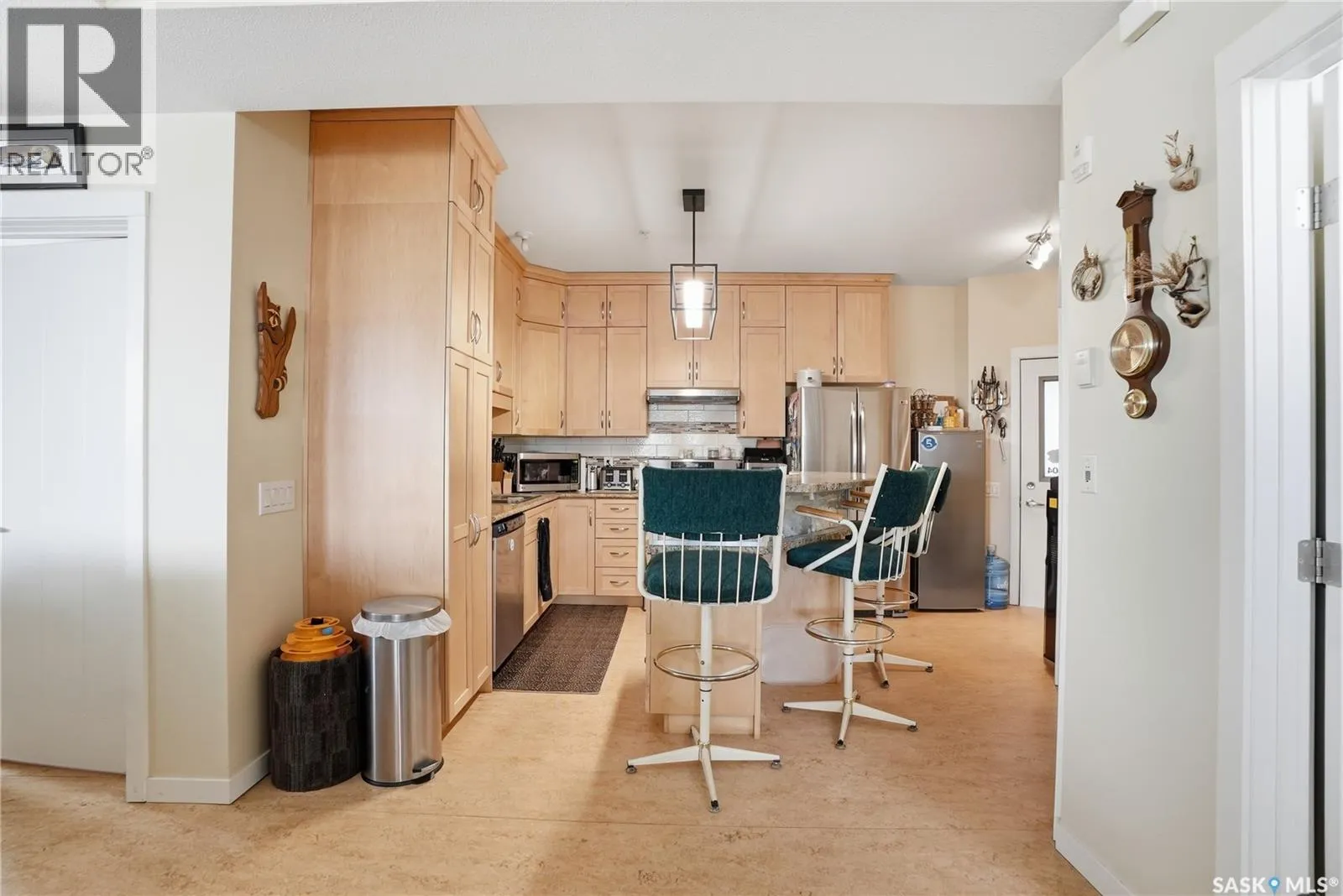 Welcome to another beautiful condo in this one-of-a-kind, community-driven complex in Riversdale. This unit offers 1,044 sq. ft. with 2 bedrooms and a spacious 4pc bathroom featuring both a separate tub and shower. Durable Marmoleum flooring runs throughout, and large north-west facing windows fill the space with natural light, perfect for enjoying sunsets. The foyer leads to an updated kitchen with a bar-style eat-up island, high-end stainless steel appliances, a Bosch dishwasher, gas stove, plus plenty of storage, including a large closet for extras. The generous master bedroom boasts two closets with direct access to the bathroom, while the second bedroom, located on the opposite side for privacy, offers ample storage and could serve as an office or hobby room. Owners share about 5,000 sq. ft. of common space with floor-to-ceiling hallway windows. The building features a new boiler system, in-floor heating, and abundant daylight. Amenities include a sauna, art room, exercise space, wood working shop and a large, welcoming dining hall and lounge that hosts private and public events. Outside, enjoy a lush community garden, two patios, and a rooftop deck for warm evenings. Additional perks include guest suites, secure covered parking, and a smoke-free environment, with the building partnered with SES Solar Cooperative. This is truly a unique community offering an exceptional lifestyle in the heart of downtown, steps from the Meewasin Trails, River Landing, shopping, and restaurants. (id:27476)