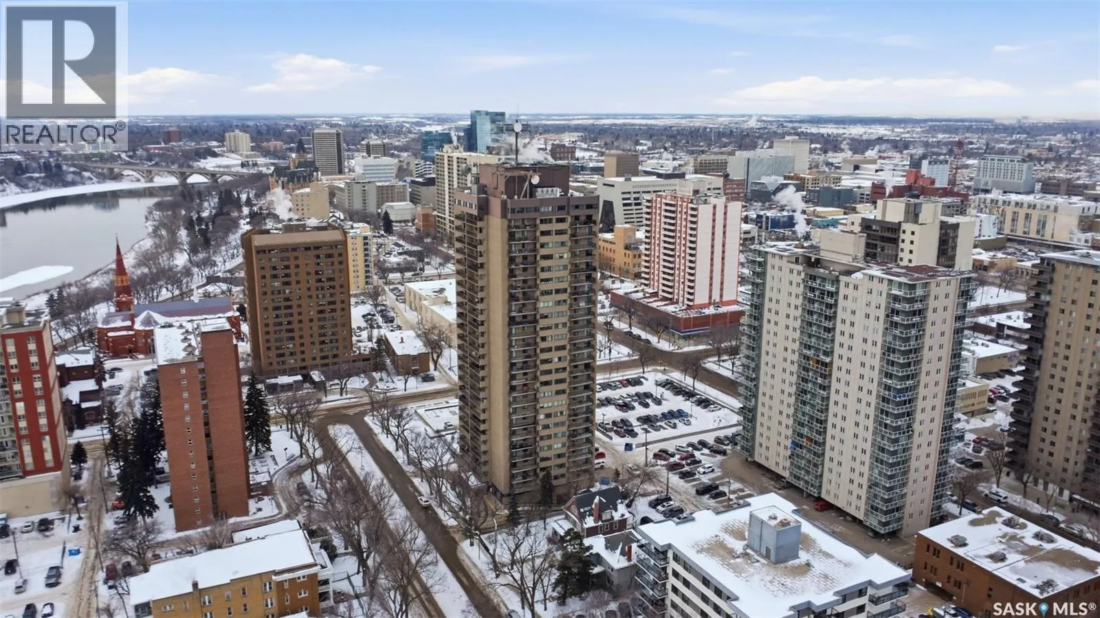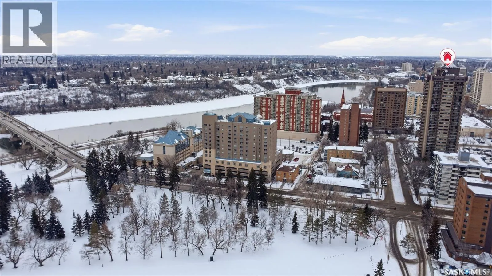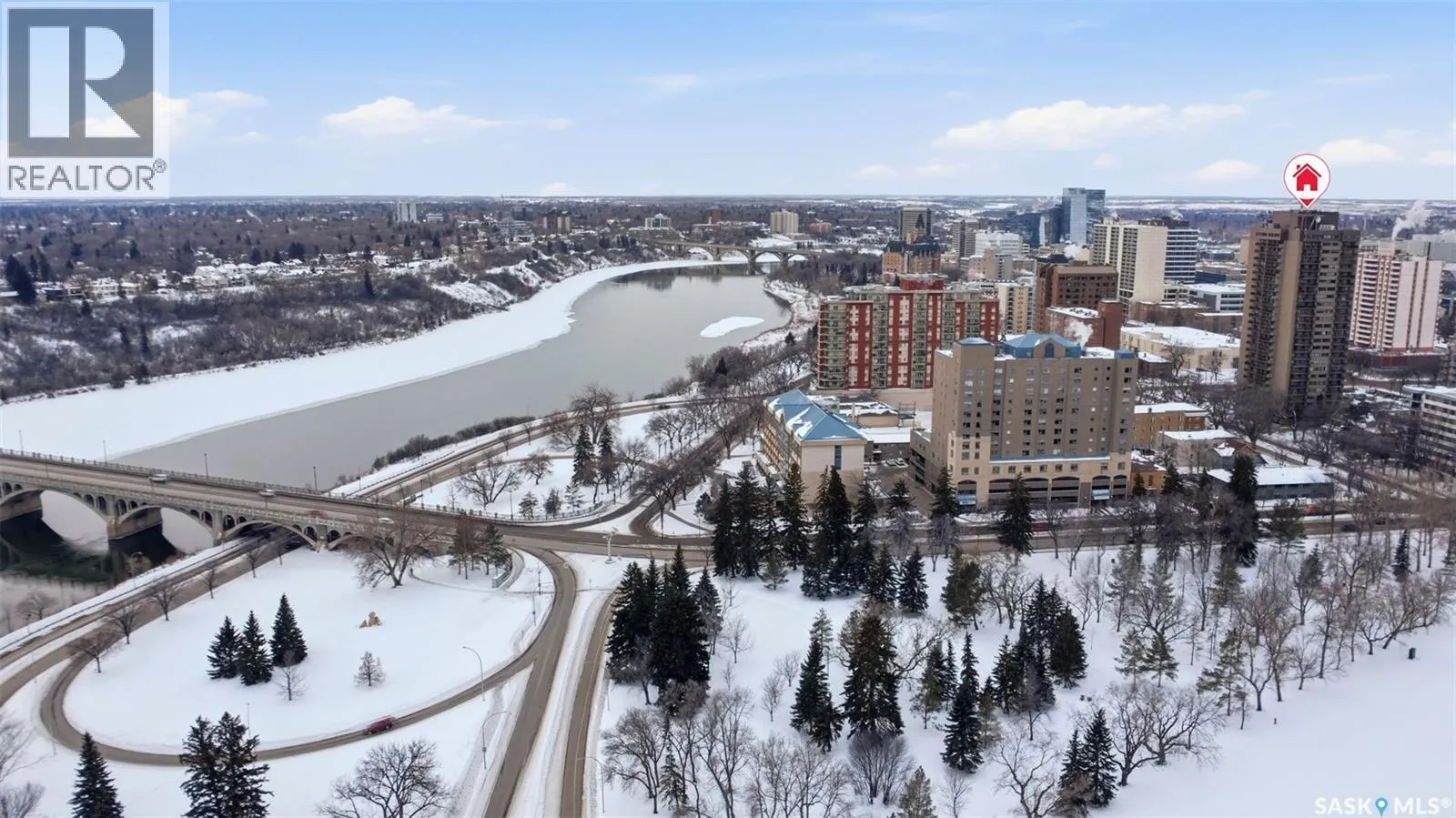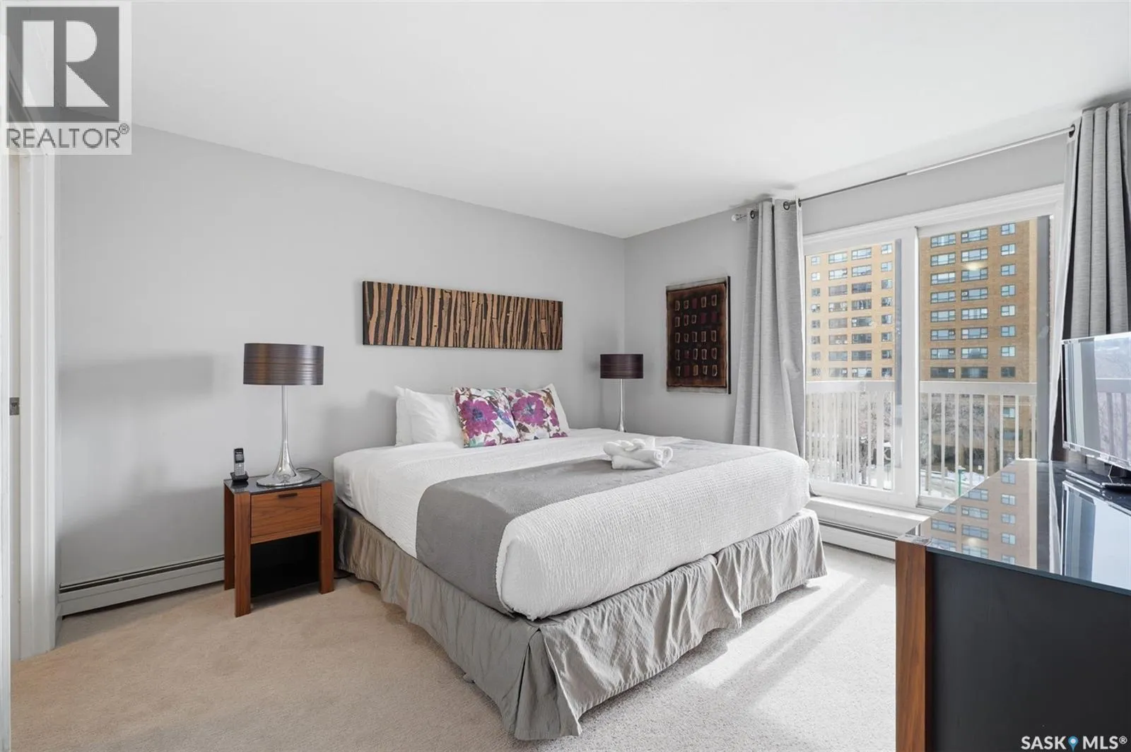 Exceptional city views with a peek of the river await from the 5th floor of Hallmark Place in the heart of Saskatoon! This well-maintained 970 sq. ft. condo offers 2 bedrooms and 1 full bathroom, all in excellent condition with a bright, open-concept layout. The kitchen overlooks the spacious living areaâperfect for casual dining or entertaining. Both bedrooms are generously sized, with the spacious primary suite featuring a large walk-in closet. Freshly painted with new carpet, this move-in-ready unit also includes in-suite laundry and all appliances. Step out onto your private balcony to enjoy city skyline views along with a glimpse of the riverâan ideal setting for morning coffee or relaxing evenings. Hallmark Place is a well-managed concrete building offering fantastic amenities, including an amenities room, exercise area, squash court, outdoor patio, and high-speed elevators. Thereâs even a convenient store right at the entrance for added everyday convenience. While this unit does not include its own parking stall however the seller has secured underground rental parking if there is interest. Donât miss your opportunity to enjoy downtown living with viewsâcall your REALTOR® today to book your private showing! (id:27476)