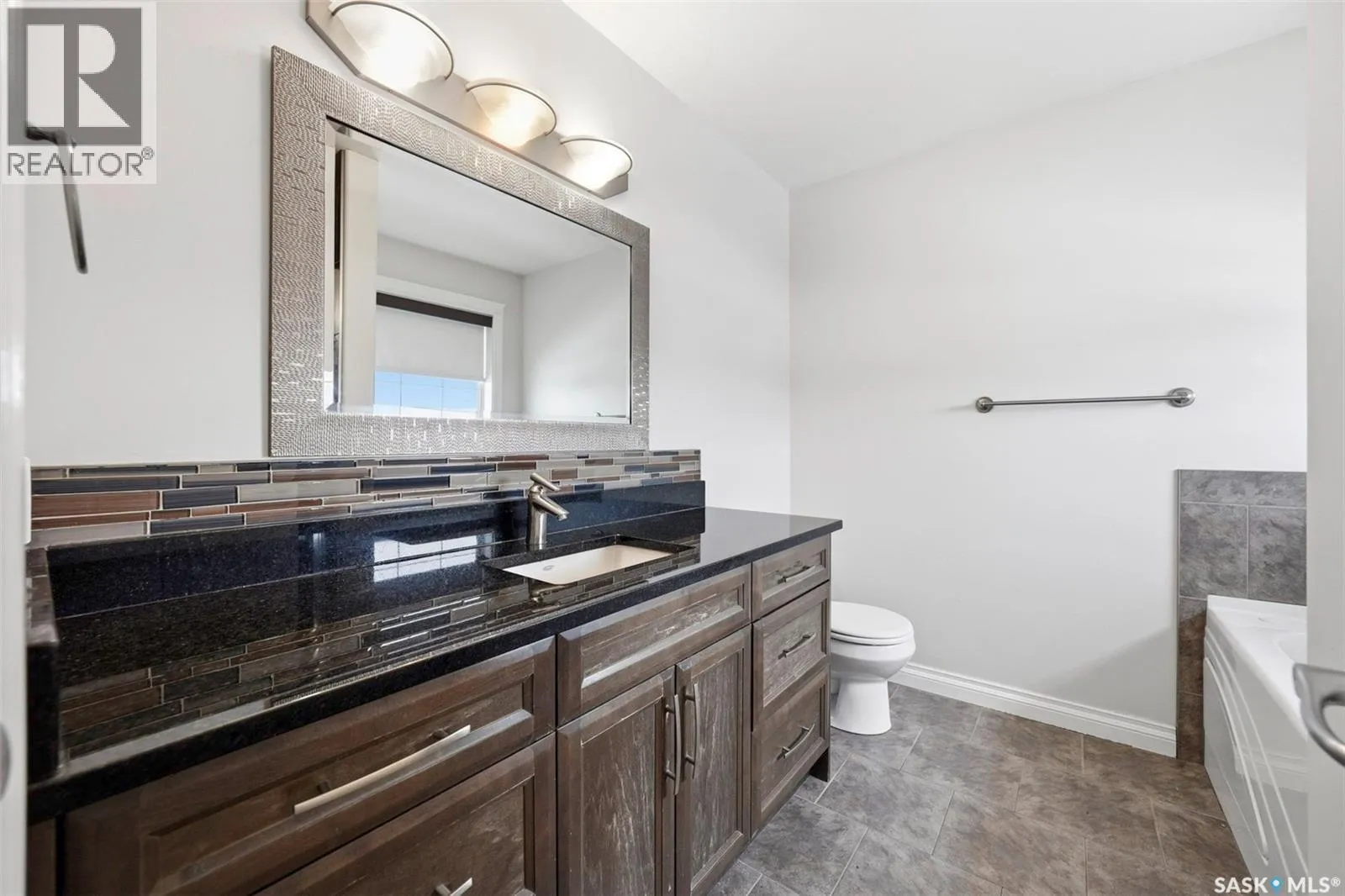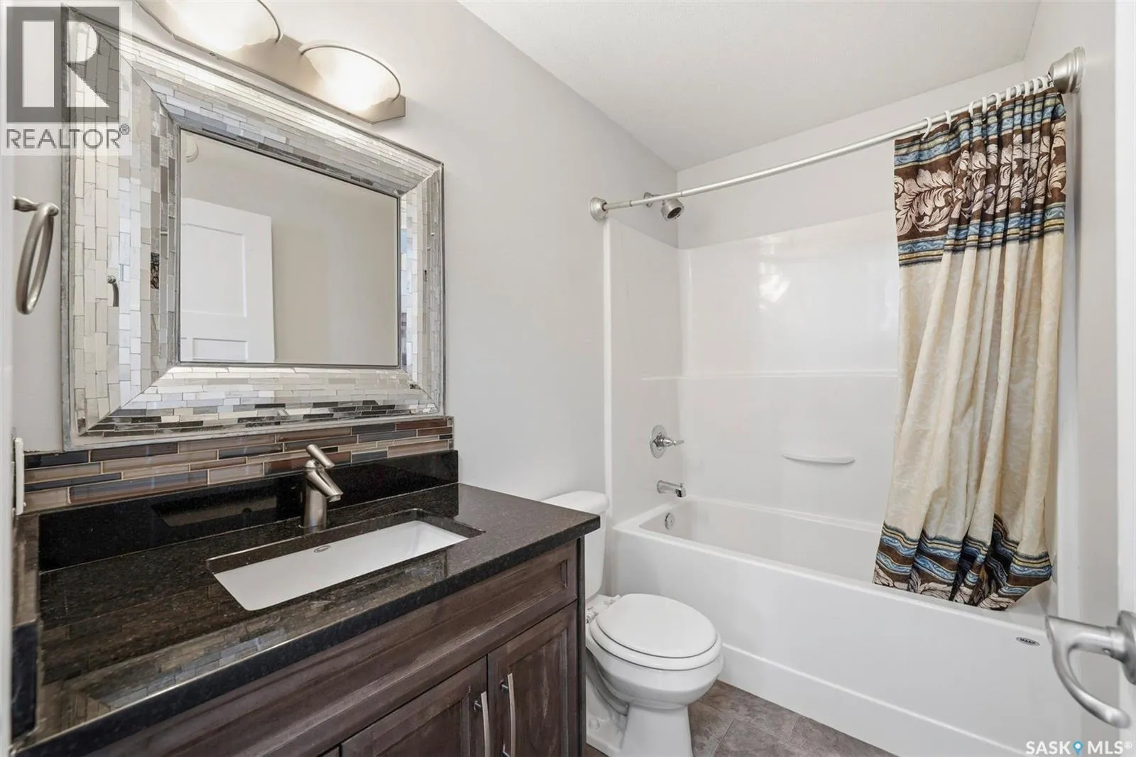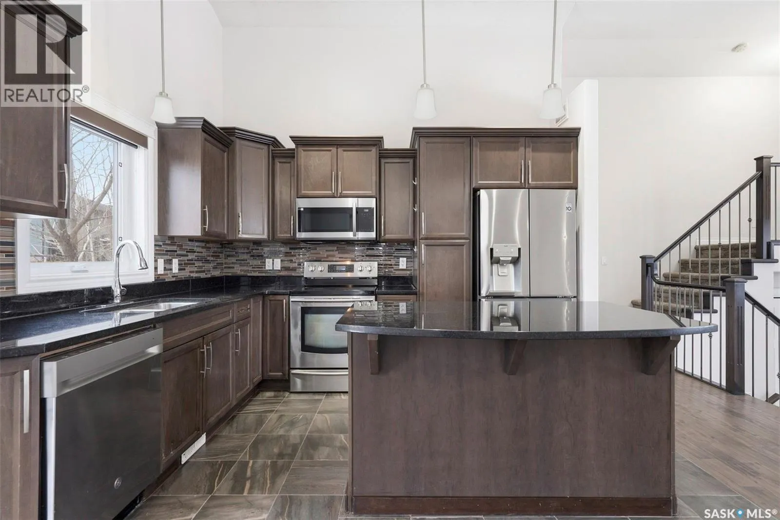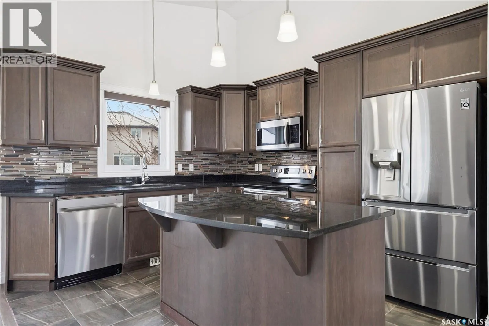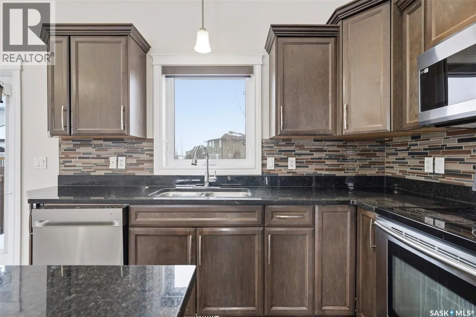 Welcome to this excellent family home located in the vibrant community of Stonebridge, thoughtfully built with quality and functionality in mind. The home features a unique and desirable layout where the entire second level is dedicated to the spacious primary retreat, complete with a deluxe ensuite bathroom and a large walk-in closet. Two additional bedrooms and a second full bathroom are conveniently located on the main level, alongside the bright living space. The main floor living area showcases hardwood floors, granite countertops, and vaulted ceilings - creating an open and inviting atmosphere filled with natural light. Garden doors lead to a large deck and welcoming backyard, perfect for relaxing or entertaining. Quality craftsmanship is evident throughout with soft-close cabinetry, full-extension drawers, low-E triple-pane windows, and an attractive acrylic stucco exterior. Additional highlights include an exposed aggregate driveway, central AC, extra-capacity 50-gallon water heater, and timer-controlled underground sprinklers. In the Basement - on the Owner's Side you also get a Bedroom and a 2-piece Bath & the major bonus is the legal 2-bedroom basement suite, providing excellent mortgage-helping income potential. All appliances are included, making this truly a move-in-ready home in one of Saskatoonâs most desirable neighbourhoods. Call Today to book a Viewing. (id:27476)