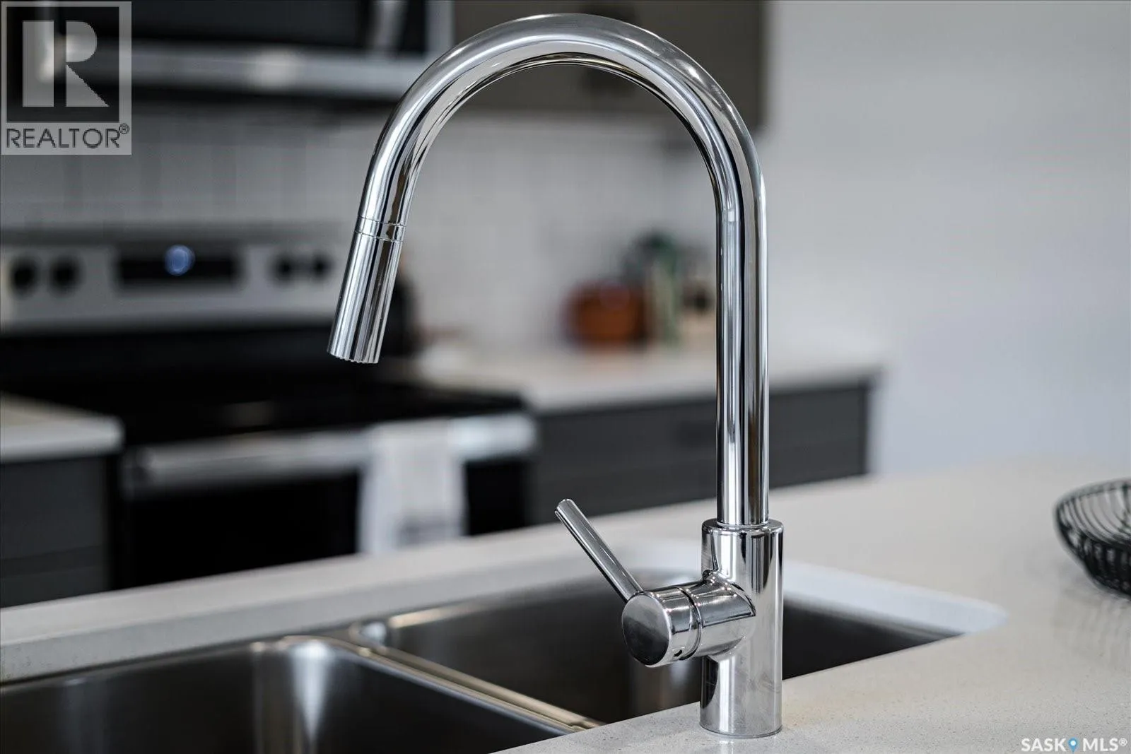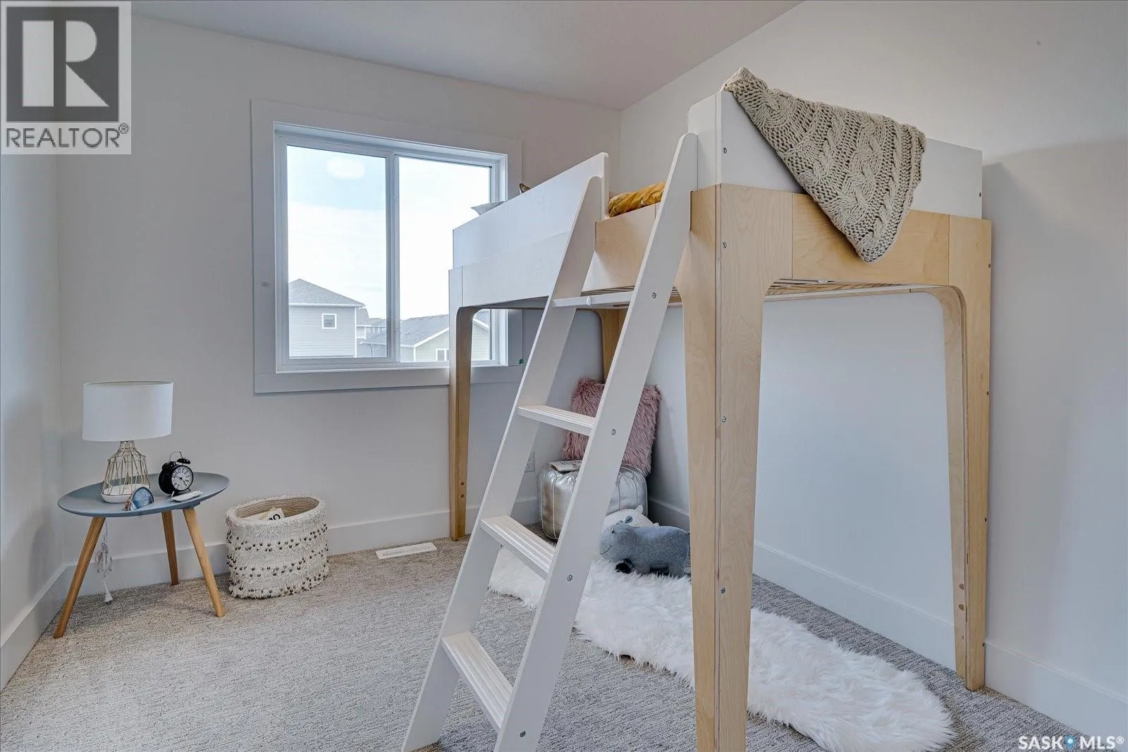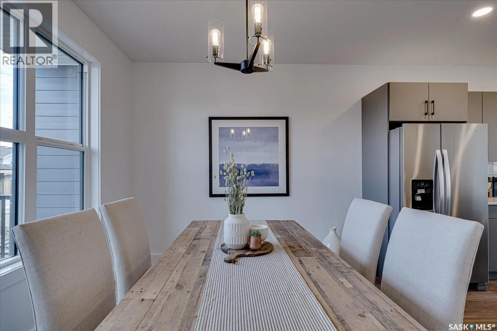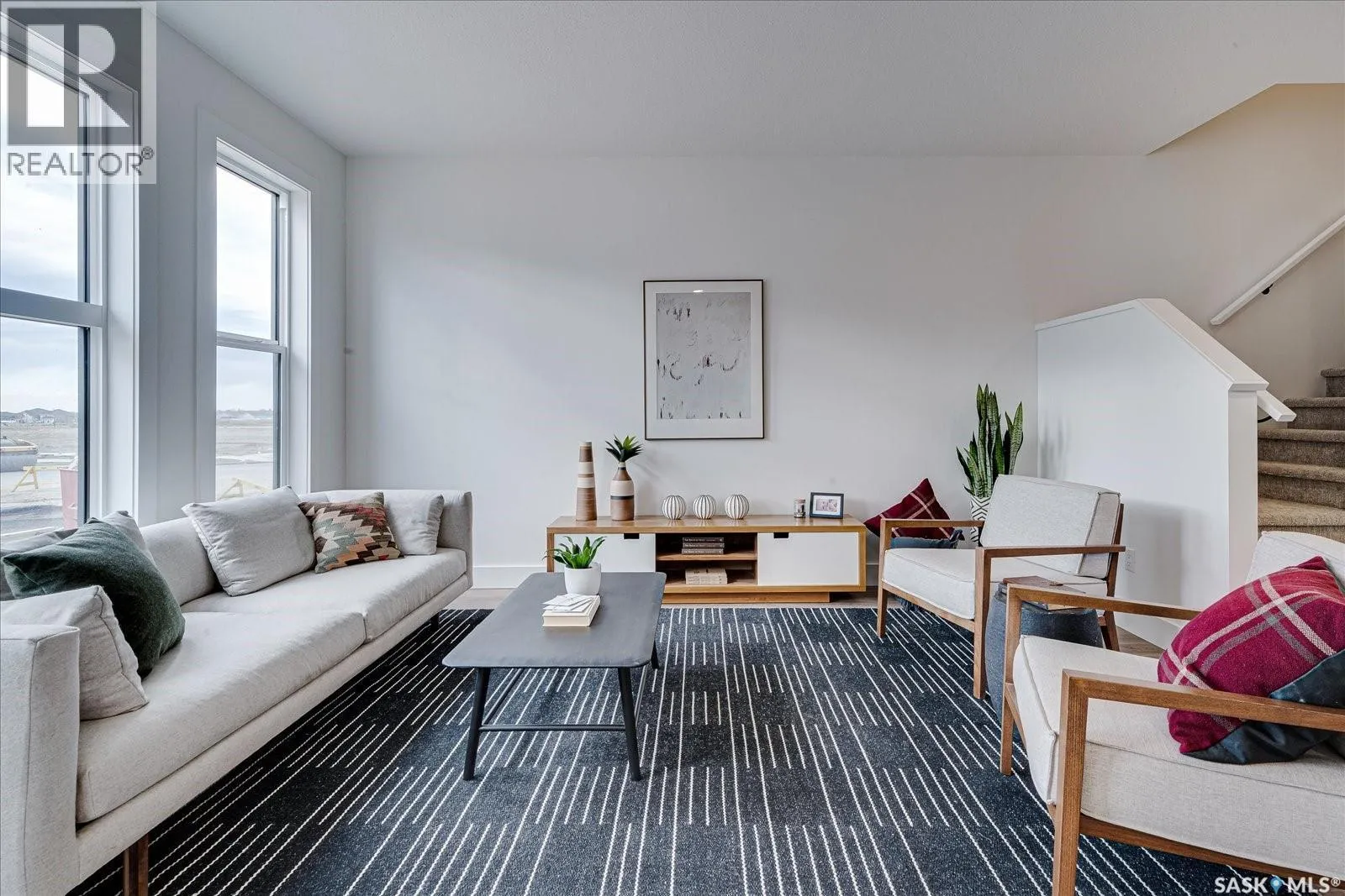 Welcome to Hudson Row 3, Saskatoon’s newest townhome project located in The Meadows at Rosewood. This Scandinavian inspired streetscape will create an unmatched timeless curb appeal that is sure to catch people’s eye. The 1461 SF open concept interior includes all the premium designer finishes people have come to expect with Arbutus Properties. The main floor includes an efficient layout with large front and back windows that flood the space with natural light and is covered by premium flooring. The centrally located chef’s kitchen includes trendy flat panel cabinetry highlighted with matt black hardware, quartz counters, stylish backsplash and a full stainless appliance package. The upper floor includes 3 generously sized bedrooms, 4pc bathroom, a convenient flex space that was designed to cater to a variety of uses and an easy to access laundry closet. Also on the upper floor is the master bedroom that includes a walk-in closet and a private ensuite. The exterior of the home is covered in durable James Hardie composite siding and comes inclusive with private fenced landscaped yards, a rear deck & a double detached garage at the rear. Located near multiple parks, commercial amenities, Costco and within a block from 2 new community schools makes this a must see! "Disclaimer, all cabinets in these units will be flat white , floor tiles will be grey, backsplash is white, AI generated kitchen showing example with Island, but cabinets will be flat panel, picture in listing showing colour patterns! Contact Agent for more information. Garages can not be done until June when frost is all out. Pictures are from our last showhome. (id:27476)