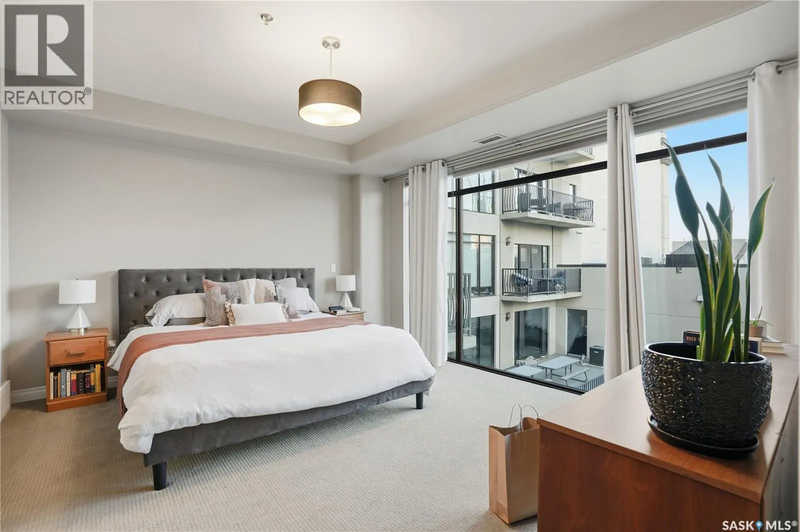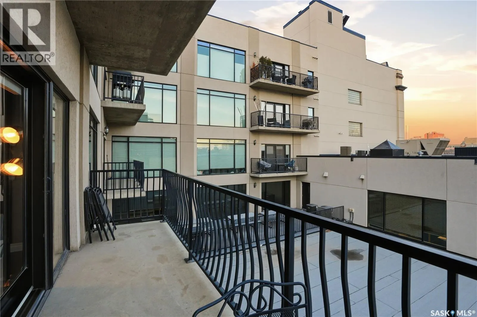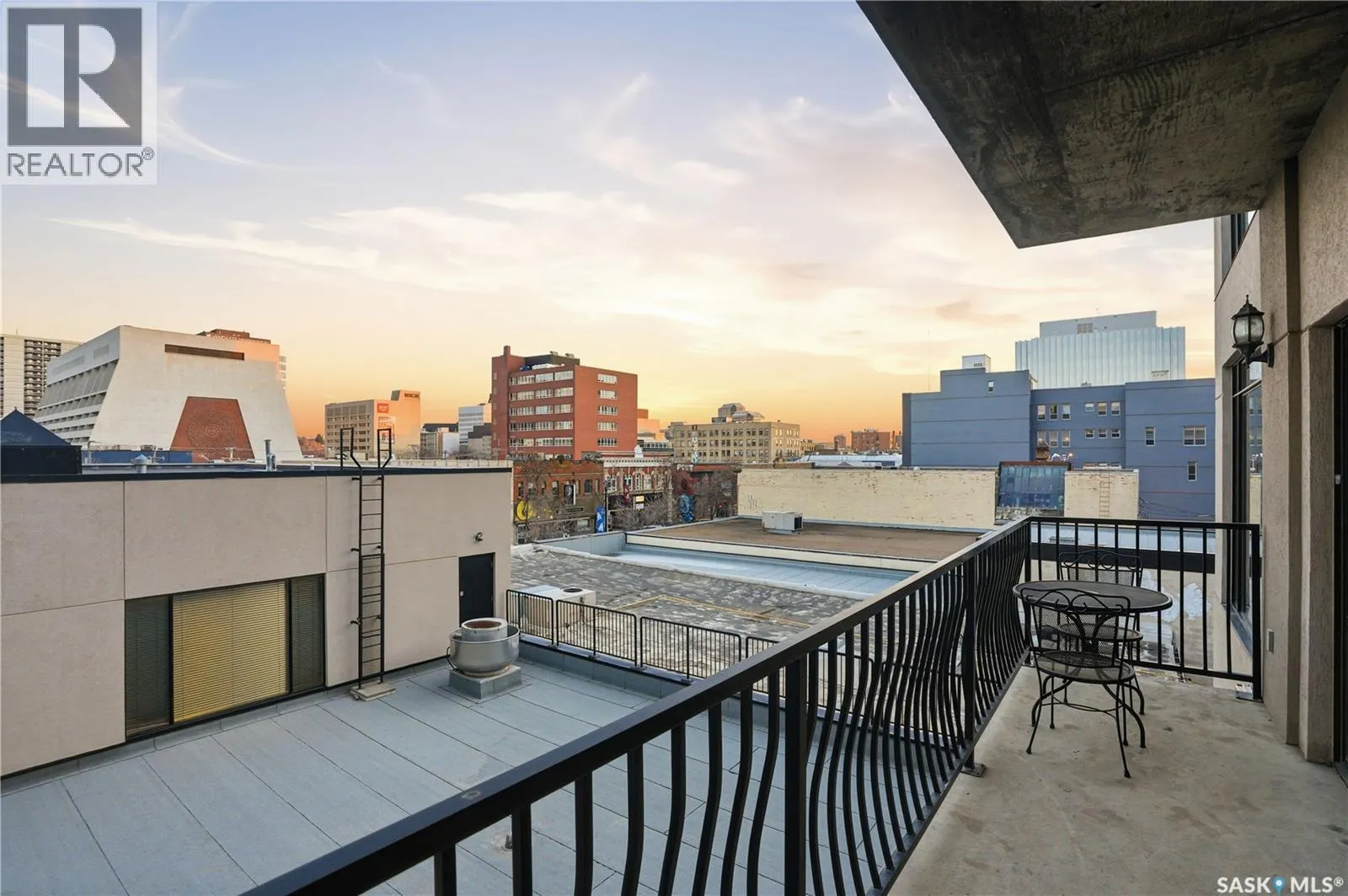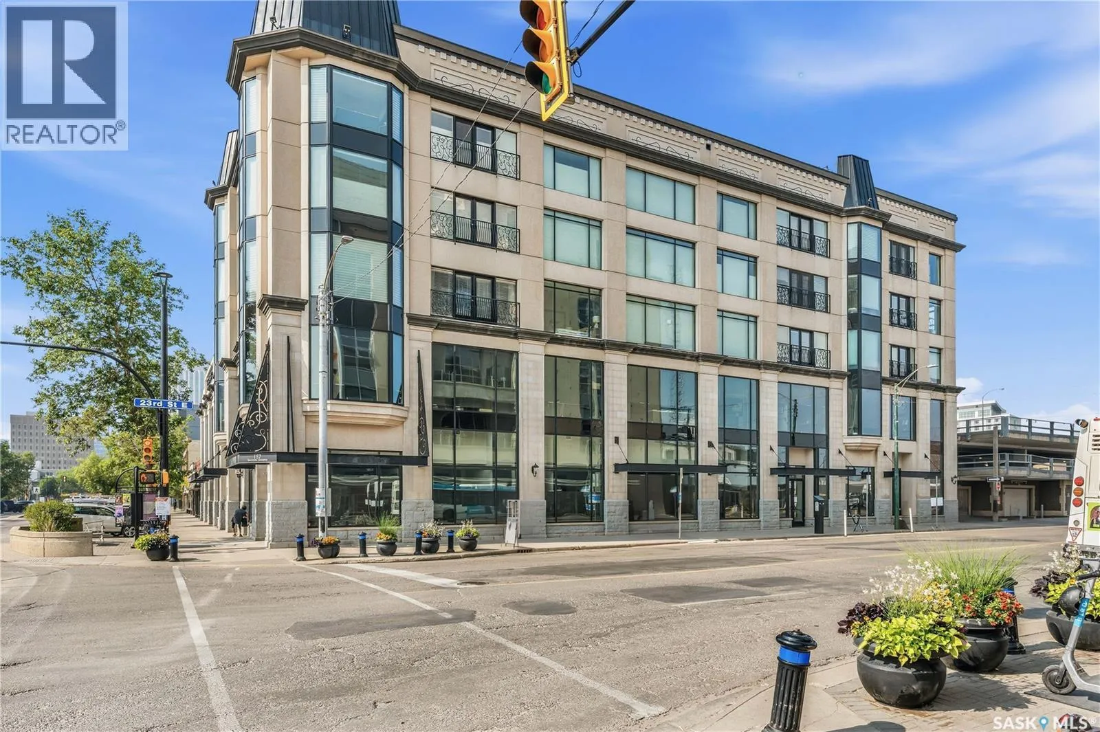 Enjoy luxury living in one of Saskatoon's most prestigious and icon developments; The Residences at the King George. Experience city living at its finest in this 1216 sq ft., 2 bedroom, 2 bathroom condo. The spacious open concept floor plan features executive level finishes designed for both elegant entertaining and everyday comfort. The fully equipped kitchen comes with stainless steel appliances, granite countertops and ample cabinetry throughout. Garden doors off the living room lead to a balcony to enjoy the downtown surroundings. The primary bedroom includes a walk-in closet and a 3-piece ensuite. The spacious second bedroom overlooks the terrace below and would also make for a great home office. Floor to ceiling windows flood the unit with natural light and offer beautiful cityscape views, both day and night. A rooftop patio is available for the residence; complete with a built in BBQ and outdoor kitchen. This unit also features 2 heated underground tandem parking spots, heated storage and a secured entry system. This exceptional home offers the perfect blend of modern urban living and historic charm and is an ideal opportunity to own a piece of Saskatoon history in the heart of the city. (id:27476)
