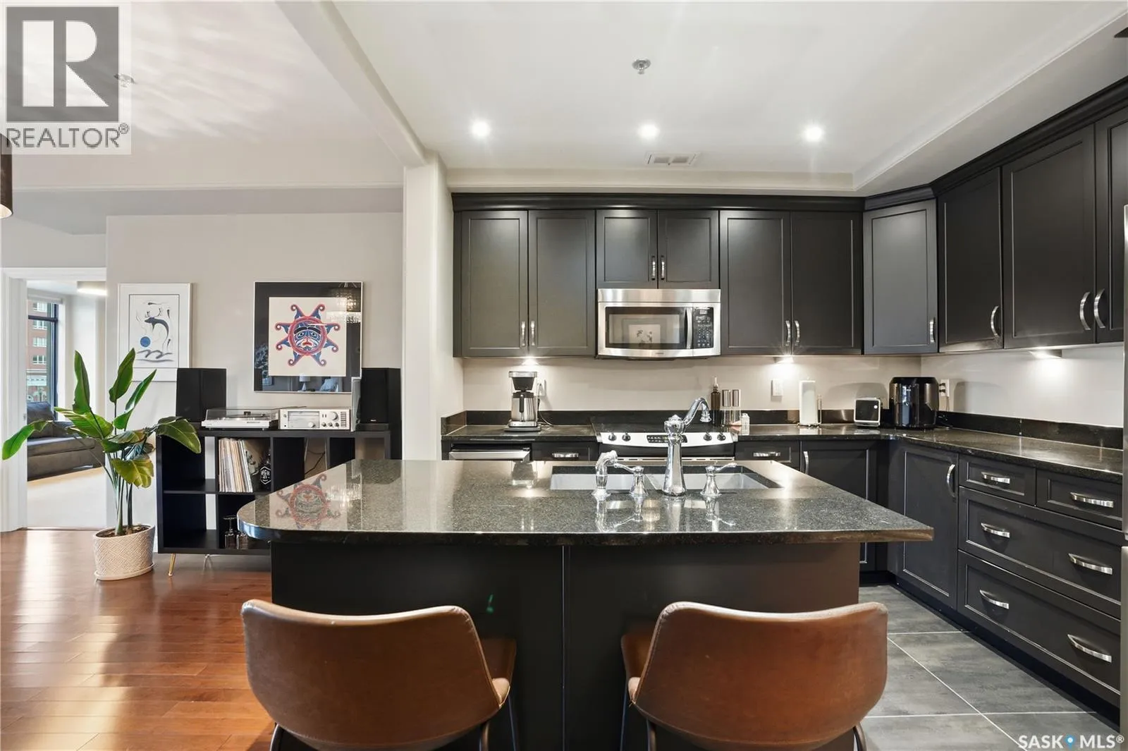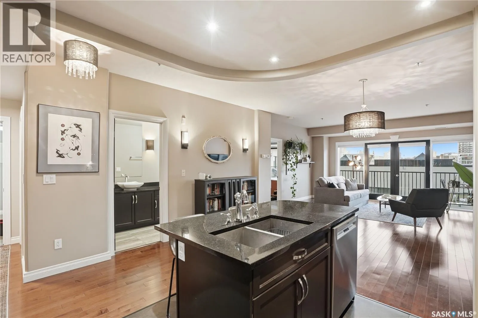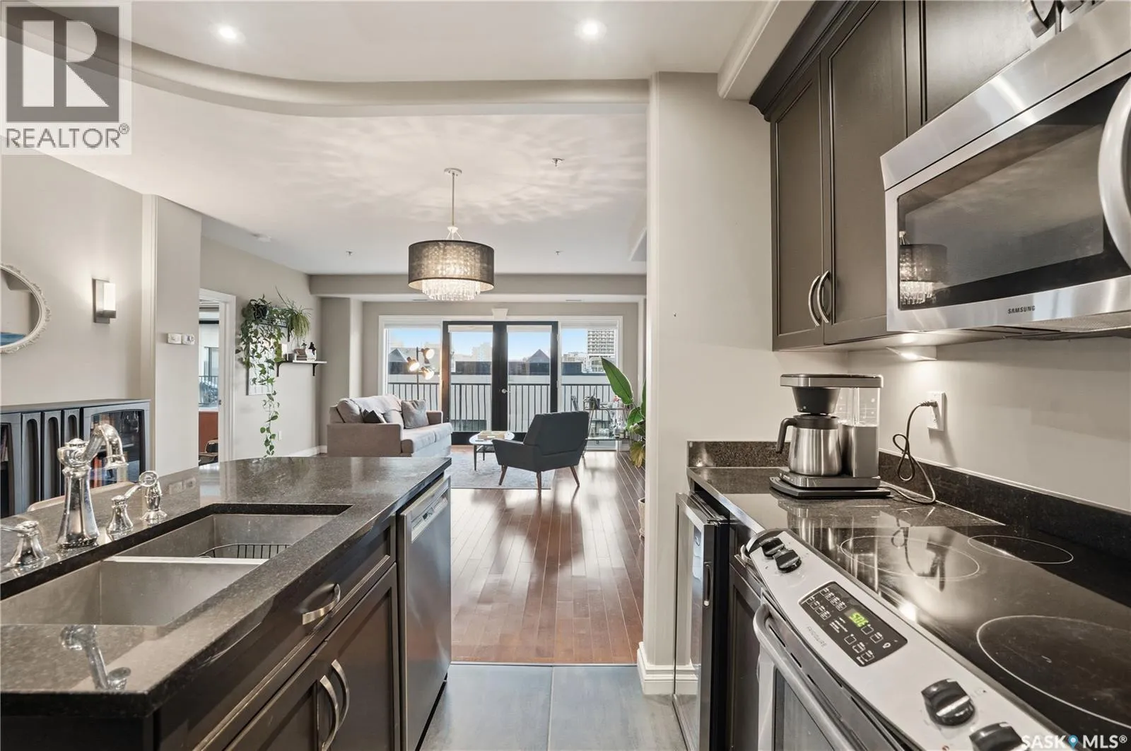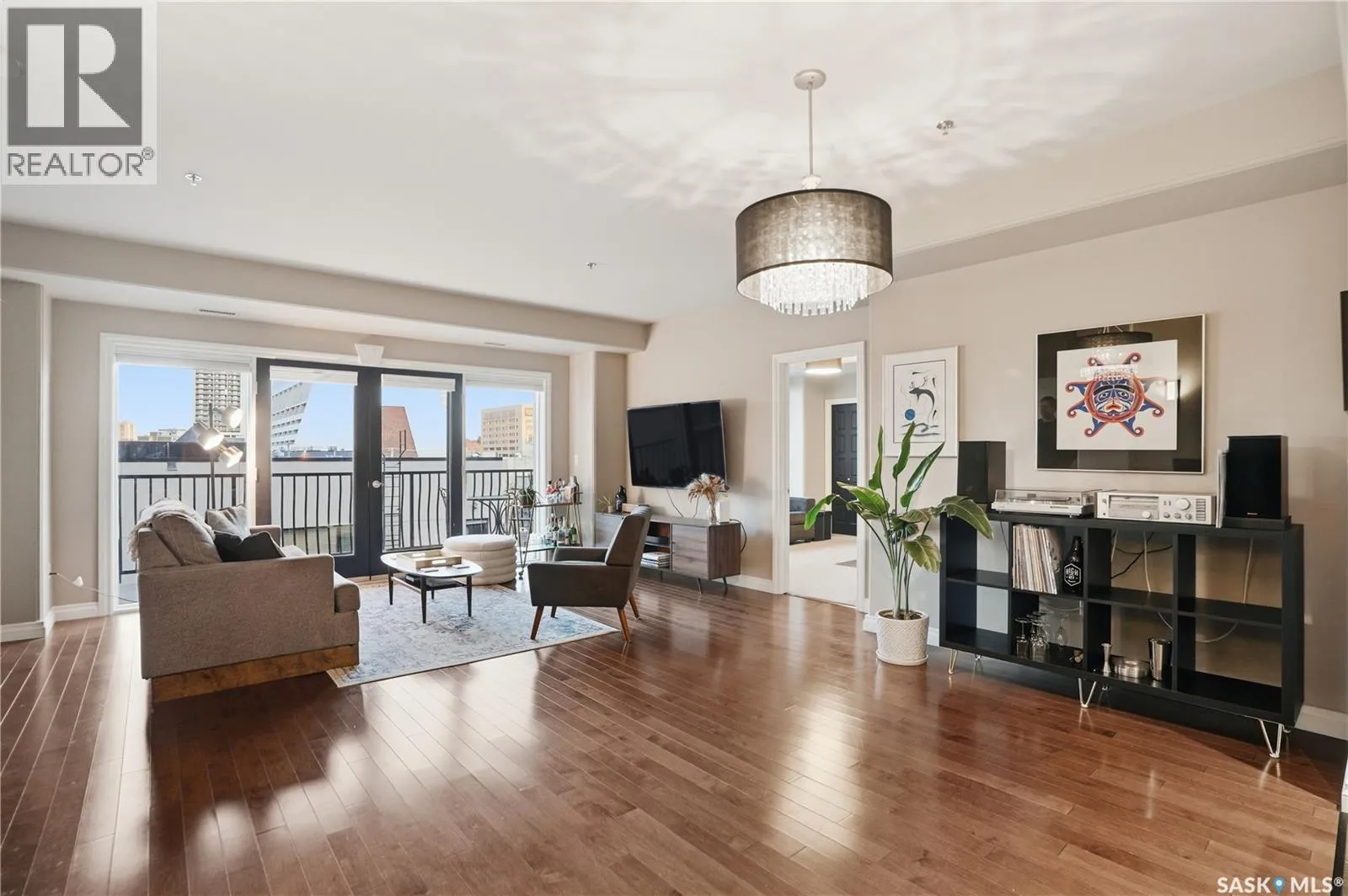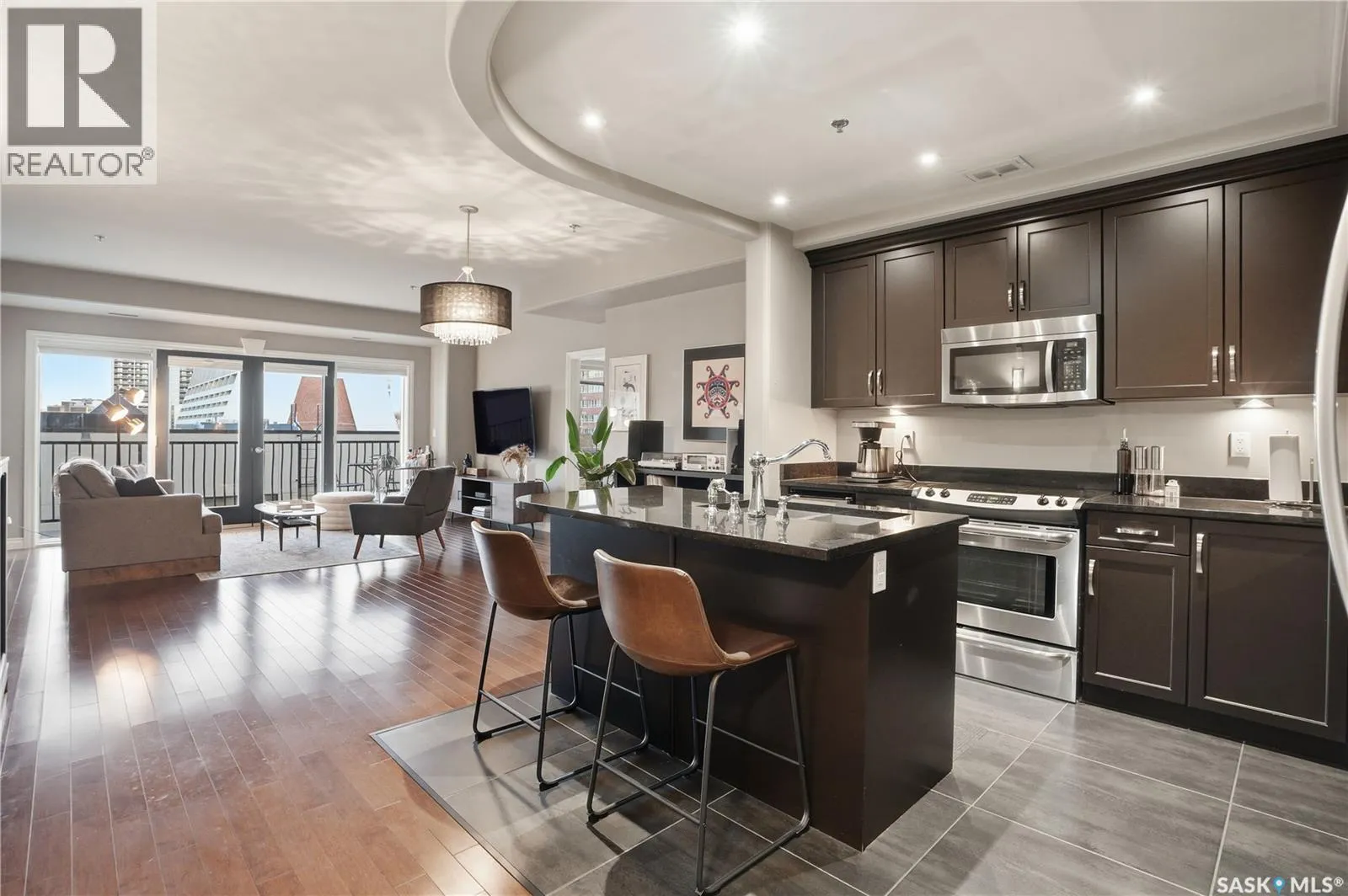 Enjoy luxury living in one of Saskatoon's most prestigious and icon developments; The Residences at the King George. Experience city living at its finest in this 1216 sq ft., 2 bedroom, 2 bathroom condo. The spacious open concept floor plan features executive level finishes designed for both elegant entertaining and everyday comfort. The fully equipped kitchen comes with stainless steel appliances, granite countertops and ample cabinetry throughout. Garden doors off the living room lead to a balcony to enjoy the downtown surroundings. The primary bedroom includes a walk-in closet and a 3-piece ensuite. The spacious second bedroom overlooks the terrace below and would also make for a great home office. Floor to ceiling windows flood the unit with natural light and offer beautiful cityscape views, both day and night. A rooftop patio is available for the residence; complete with a built in BBQ and outdoor kitchen. This unit also features 2 heated underground tandem parking spots, heated storage and a secured entry system. This exceptional home offers the perfect blend of modern urban living and historic charm and is an ideal opportunity to own a piece of Saskatoon history in the heart of the city. (id:27476)
