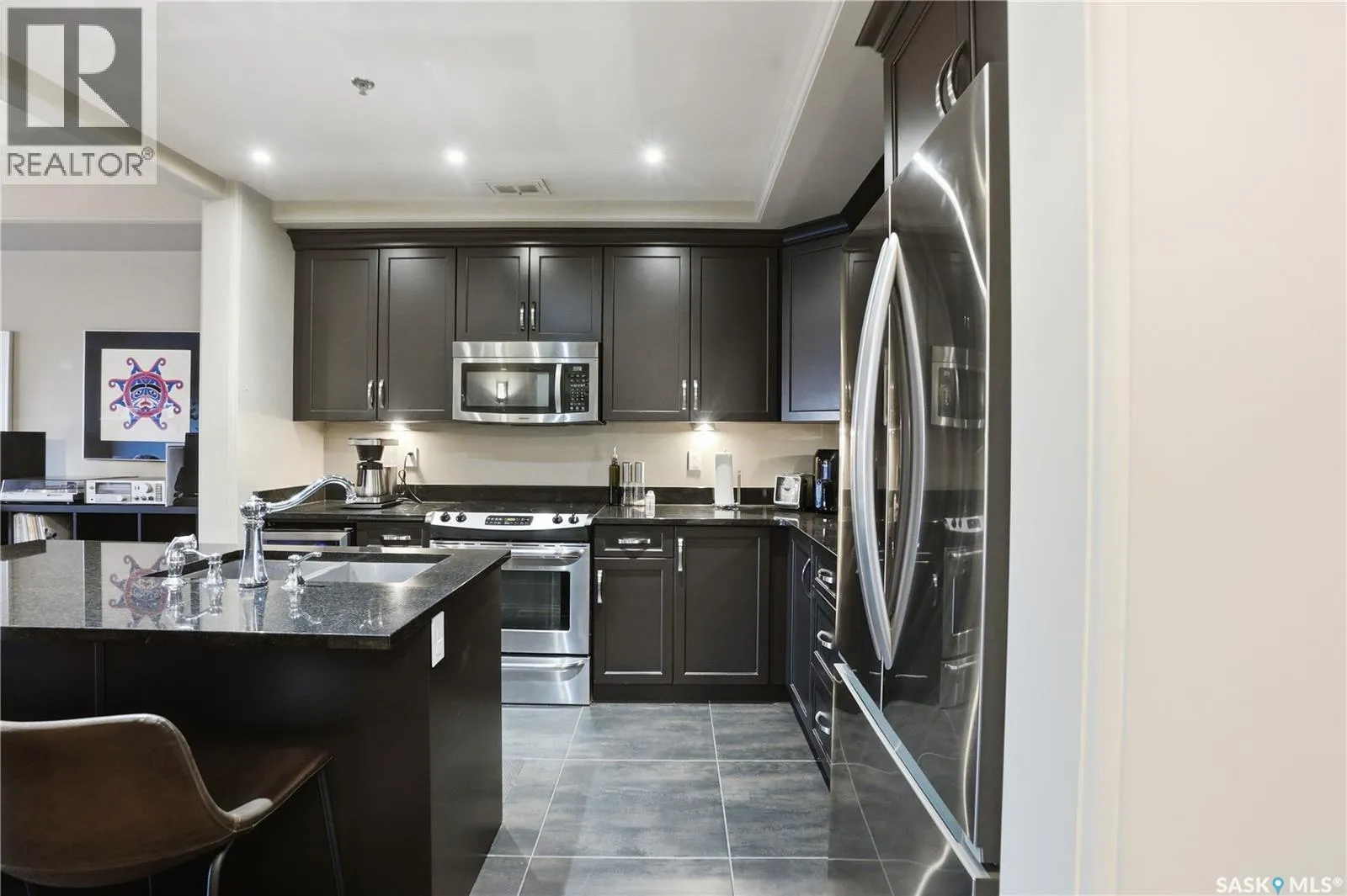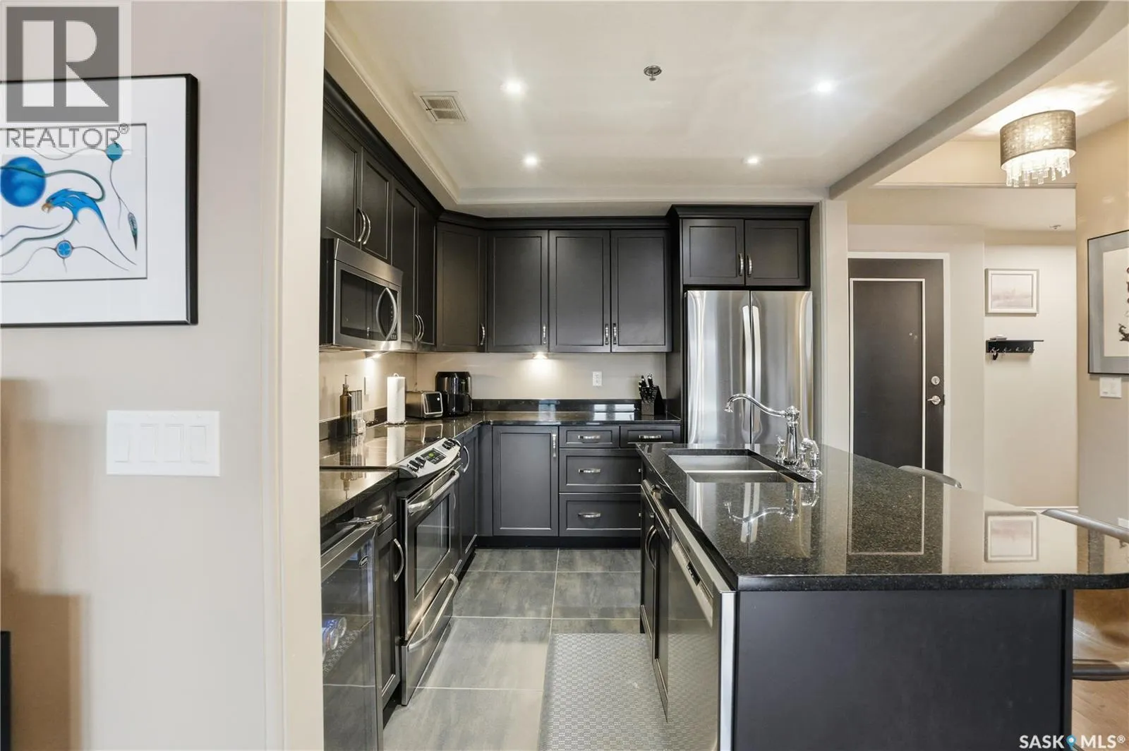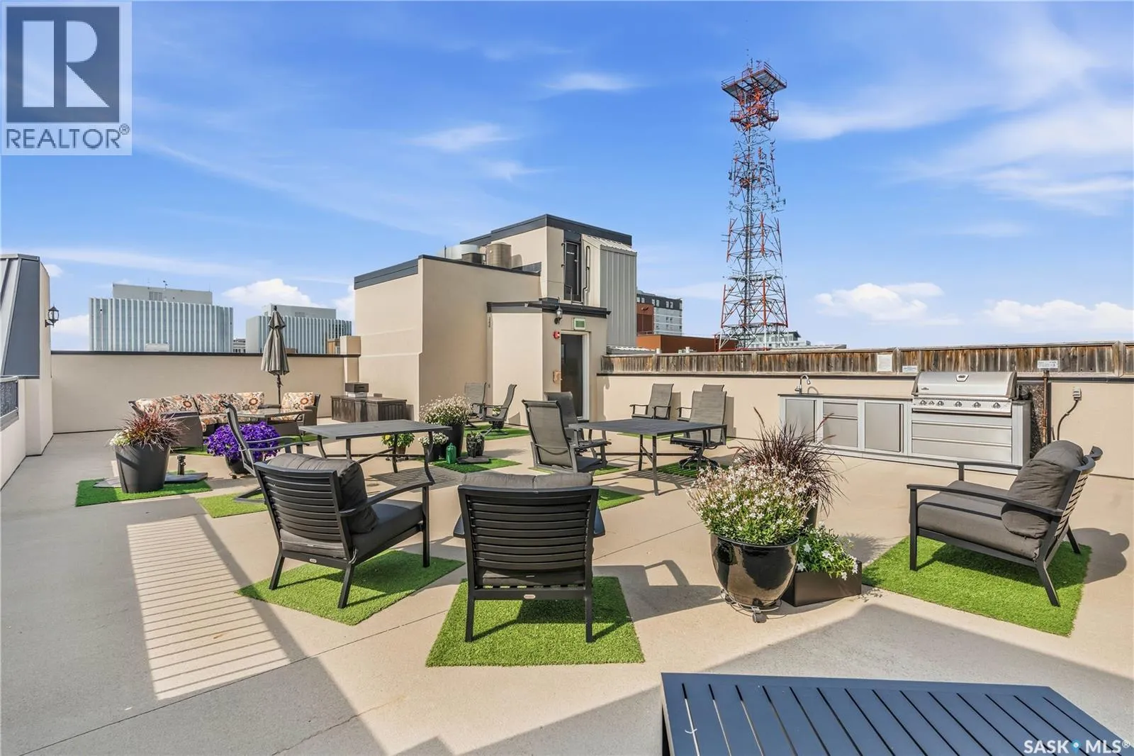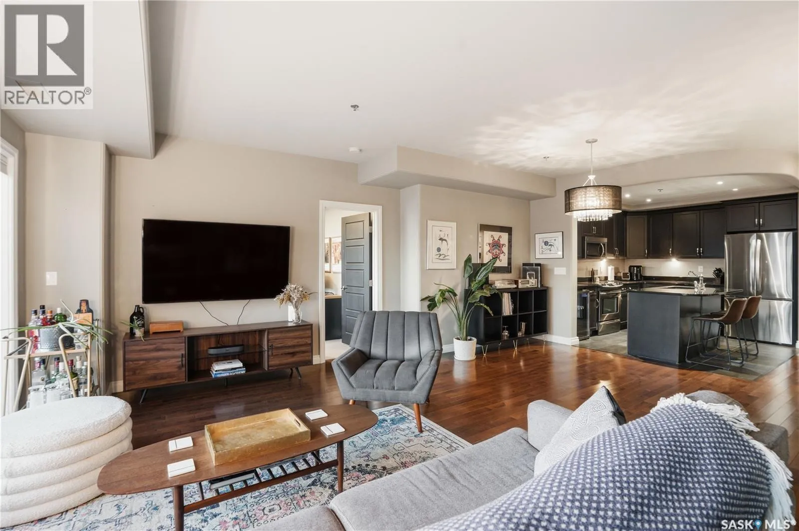 Enjoy luxury living in one of Saskatoon's most prestigious and icon developments; The Residences at the King George. Experience city living at its finest in this 1216 sq ft., 2 bedroom, 2 bathroom condo. The spacious open concept floor plan features executive level finishes designed for both elegant entertaining and everyday comfort. The fully equipped kitchen comes with stainless steel appliances, granite countertops and ample cabinetry throughout. Garden doors off the living room lead to a balcony to enjoy the downtown surroundings. The primary bedroom includes a walk-in closet and a 3-piece ensuite. The spacious second bedroom overlooks the terrace below and would also make for a great home office. Floor to ceiling windows flood the unit with natural light and offer beautiful cityscape views, both day and night. A rooftop patio is available for the residence; complete with a built in BBQ and outdoor kitchen. This unit also features 2 heated underground tandem parking spots, heated storage and a secured entry system. This exceptional home offers the perfect blend of modern urban living and historic charm and is an ideal opportunity to own a piece of Saskatoon history in the heart of the city. (id:27476)