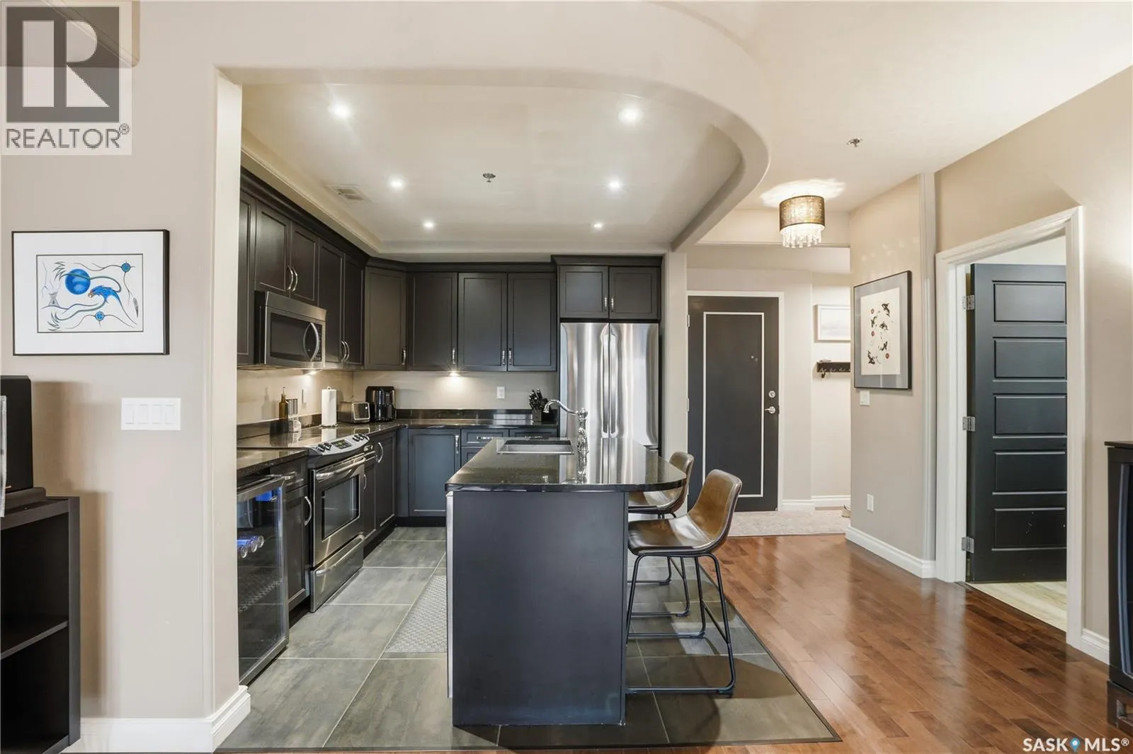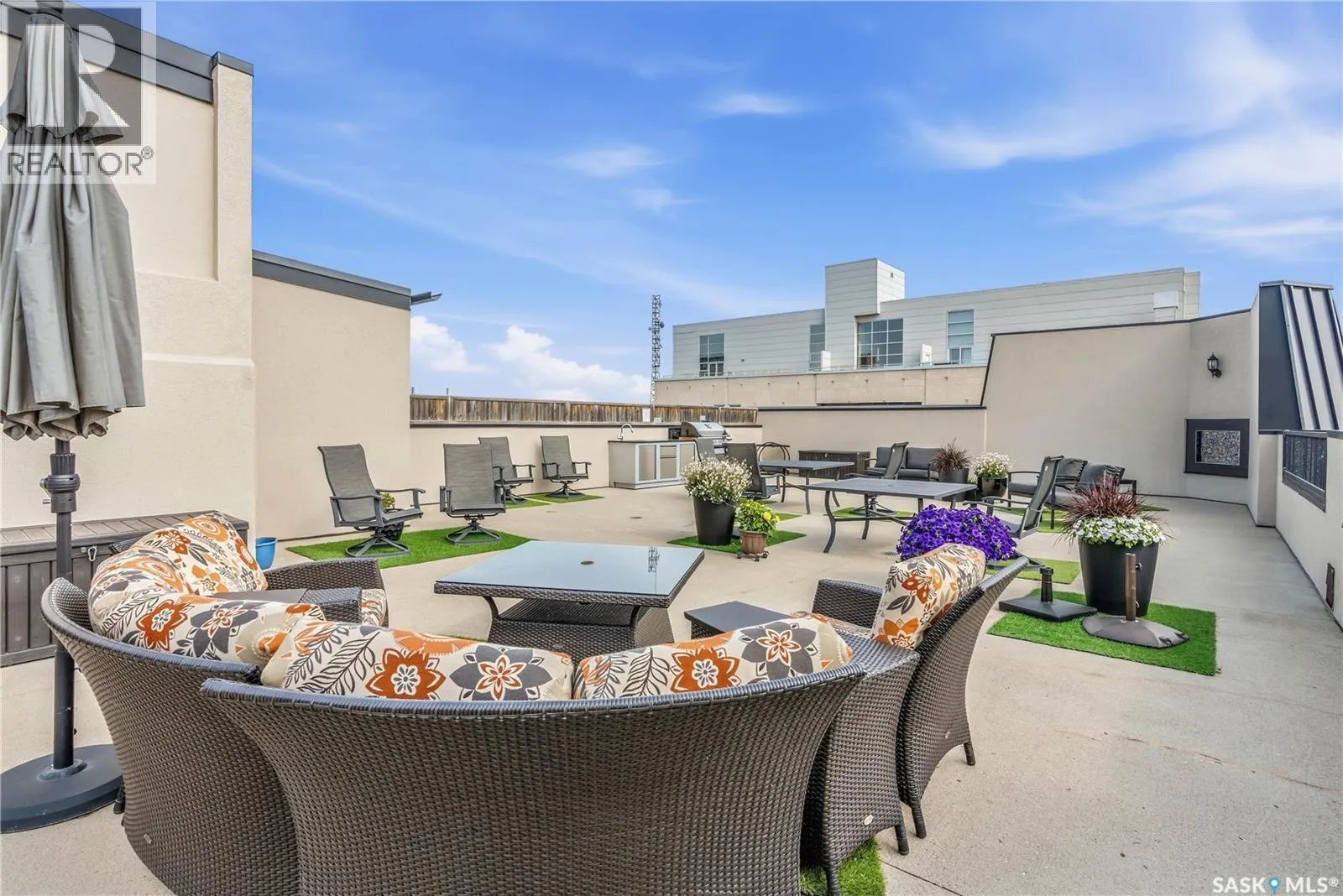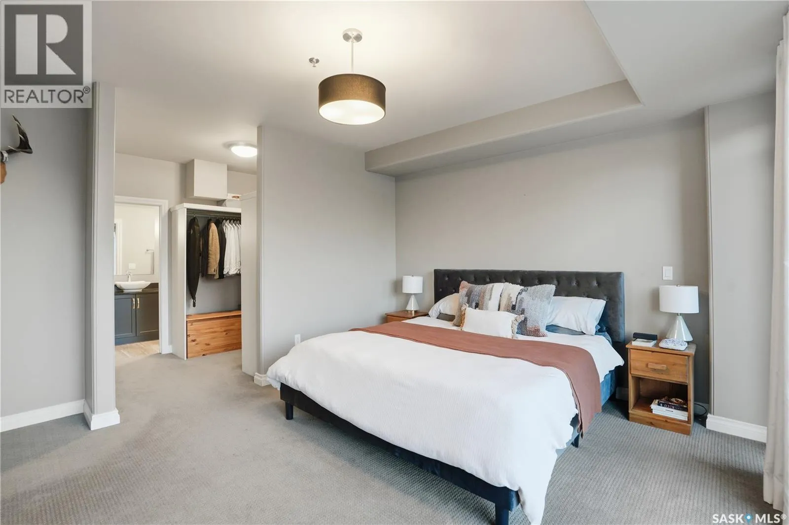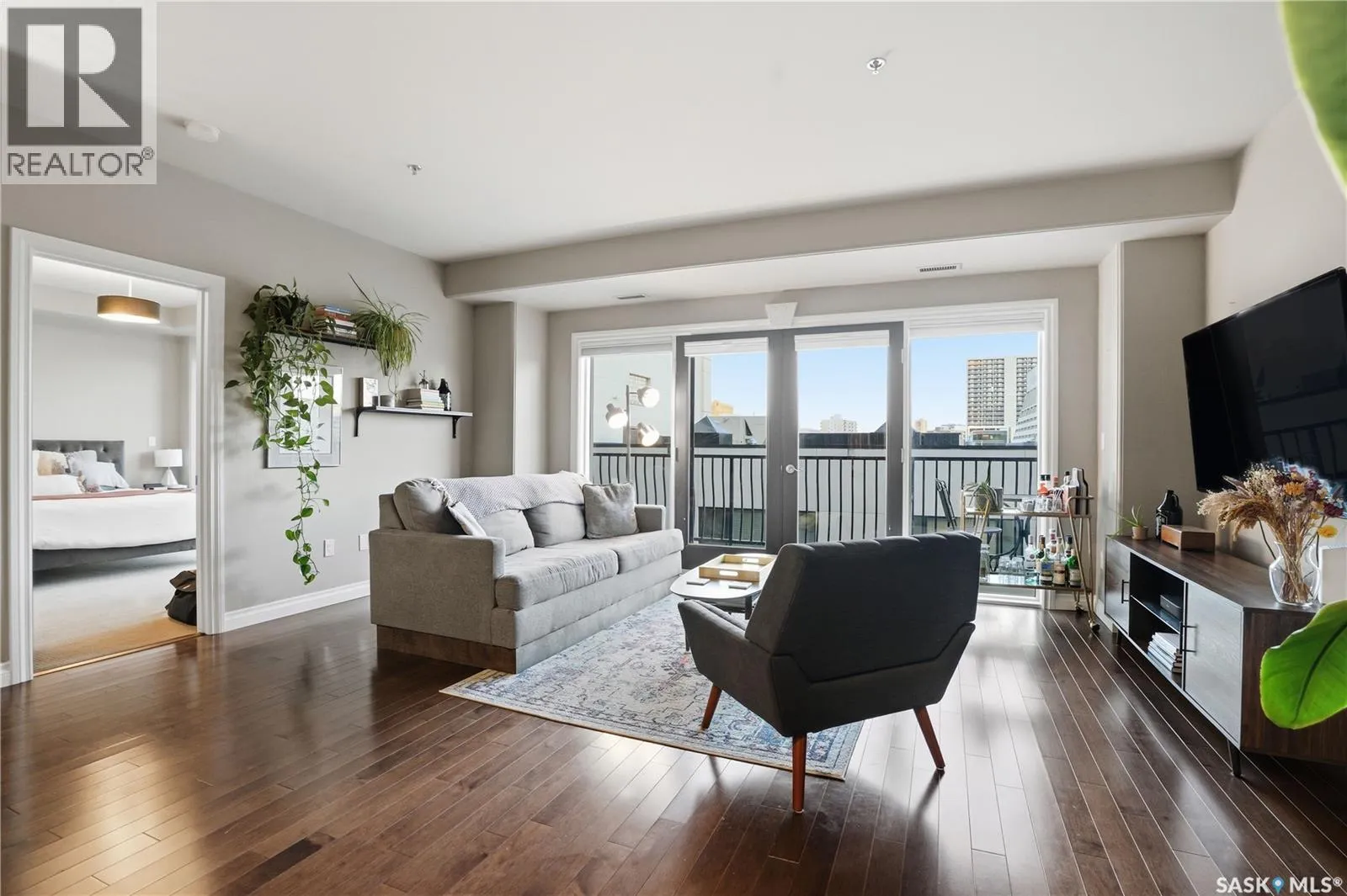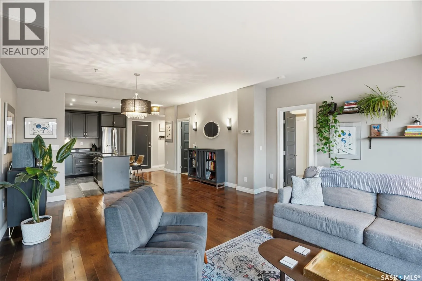 Enjoy luxury living in one of Saskatoon's most prestigious and icon developments; The Residences at the King George. Experience city living at its finest in this 1216 sq ft., 2 bedroom, 2 bathroom condo. The spacious open concept floor plan features executive level finishes designed for both elegant entertaining and everyday comfort. The fully equipped kitchen comes with stainless steel appliances, granite countertops and ample cabinetry throughout. Garden doors off the living room lead to a balcony to enjoy the downtown surroundings. The primary bedroom includes a walk-in closet and a 3-piece ensuite. The spacious second bedroom overlooks the terrace below and would also make for a great home office. Floor to ceiling windows flood the unit with natural light and offer beautiful cityscape views, both day and night. A rooftop patio is available for the residence; complete with a built in BBQ and outdoor kitchen. This unit also features 2 heated underground tandem parking spots, heated storage and a secured entry system. This exceptional home offers the perfect blend of modern urban living and historic charm and is an ideal opportunity to own a piece of Saskatoon history in the heart of the city. (id:27476)