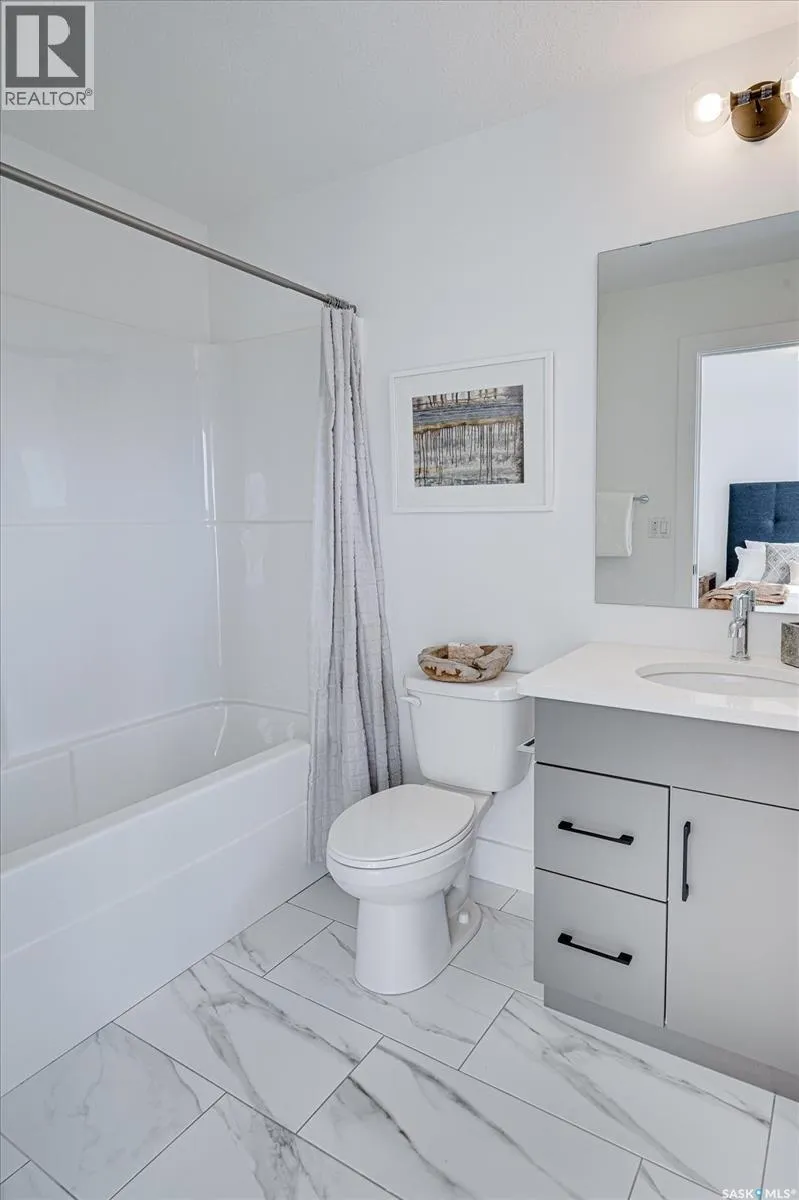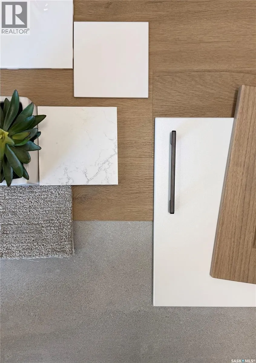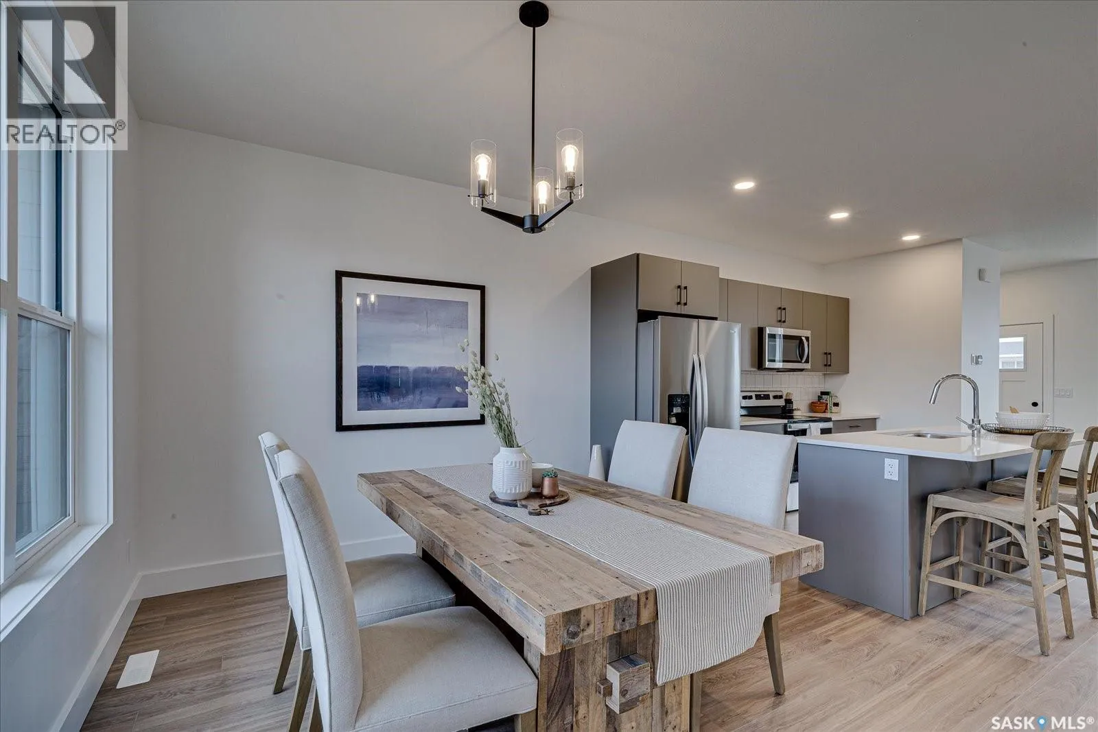 Welcome to Hudson Row 3, Saskatoonâs newest townhome project located in The Meadows at Rosewood. This Scandinavian inspired streetscape will create an unmatched timeless curb appeal that is sure to catch peopleâs eye. The 1461 SF open concept interior includes all the premium designer finishes people have come to expect with Arbutus Properties. The main floor includes an efficient layout with large front and back windows that flood the space with natural light and is covered by premium flooring. The centrally located chefâs kitchen includes trendy flat panel cabinetry highlighted with matt black hardware, quartz counters, stylish backsplash and a full stainless appliance package. The upper floor includes 3 generously sized bedrooms, 4pc bathroom, a convenient flex space that was designed to cater to a variety of uses and an easy to access laundry closet. Also on the upper floor is the master bedroom that includes a walk-in closet and a private ensuite. The exterior of the home is covered in durable James Hardie composite siding and comes inclusive with private fenced landscaped yards, a rear deck & a double detached garage at the rear. Located near multiple parks, commercial amenities, Costco and within a block from 2 new community schools makes this a must see! "Disclaimer, all cabinets in these units will be flat white , floor tiles will be grey, backsplash is white, AI generated kitchen showing example with Island, but cabinets will be flat panel, picture in listing showing colour patterns! Contact Agent for more information. Garages can not be done until June when frost is all out. Pictures are from our last showhome. (id:27476)