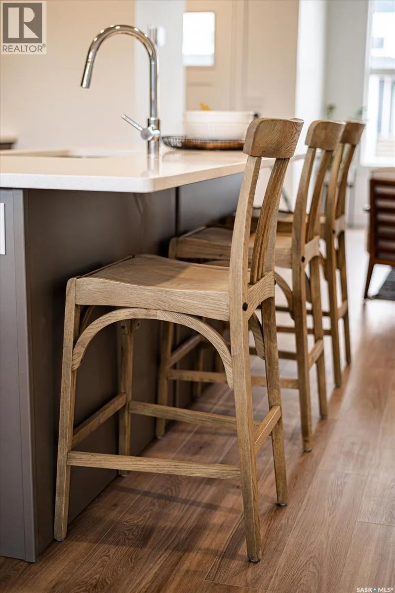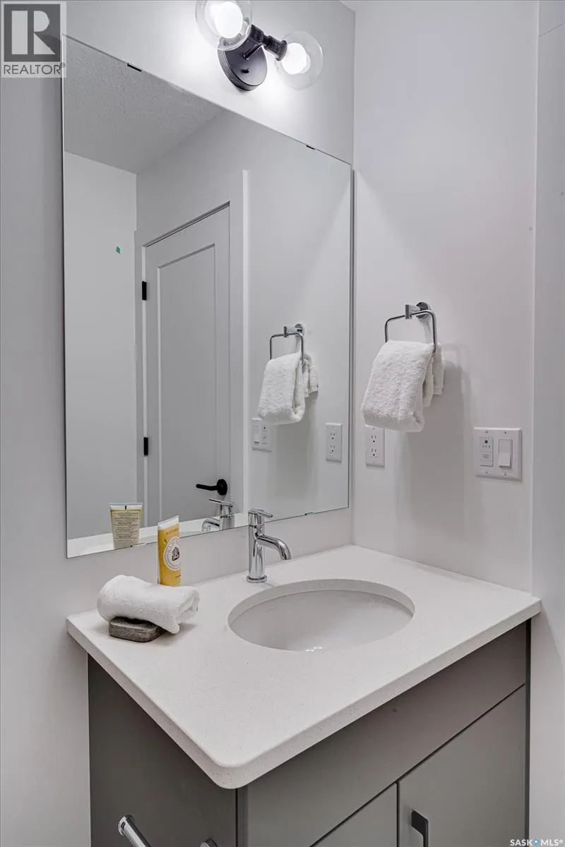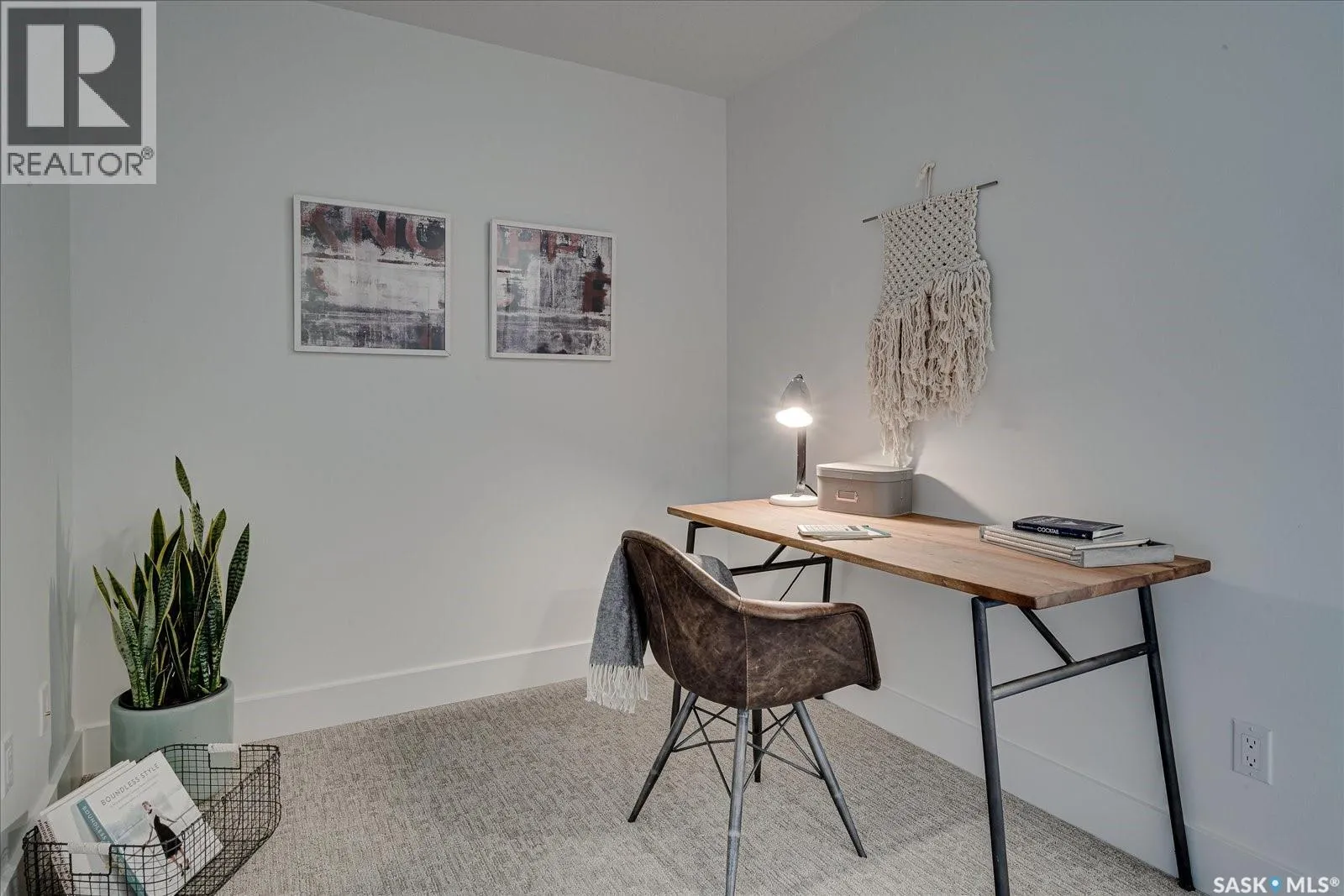 Welcome to Hudson Row 3, Saskatoonâs newest townhome project located in The Meadows at Rosewood. This Scandinavian inspired streetscape will create an unmatched timeless curb appeal that is sure to catch peopleâs eye. The 1461 SF open concept interior includes all the premium designer finishes people have come to expect with Arbutus Properties. The main floor includes an efficient layout with large front and back windows that flood the space with natural light and is covered by premium flooring. The centrally located chefâs kitchen includes trendy flat panel cabinetry highlighted with matt black hardware, quartz counters, stylish backsplash and a full stainless appliance package. The upper floor includes 3 generously sized bedrooms, 4pc bathroom, a convenient flex space that was designed to cater to a variety of uses and an easy to access laundry closet. Also on the upper floor is the master bedroom that includes a walk-in closet and a private ensuite. The exterior of the home is covered in durable James Hardie composite siding and comes inclusive with private fenced landscaped yards, a rear deck & a double detached garage at the rear. Located near multiple parks, commercial amenities, Costco and within a block from 2 new community schools makes this a must see! "Disclaimer, all cabinets in these units will be flat white , floor tiles will be grey, backsplash is white, AI generated kitchen showing example with Island, but cabinets will be flat panel, picture in listing showing colour patterns! Contact Agent for more information. Garages can not be done until June when frost is all out. Pictures are from our last showhome. (id:27476)