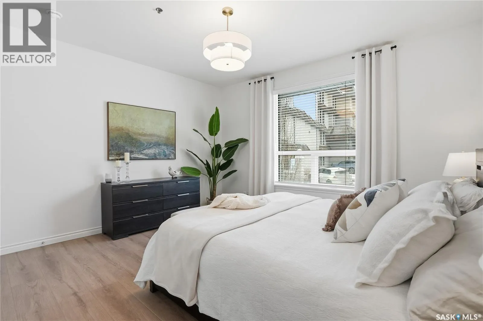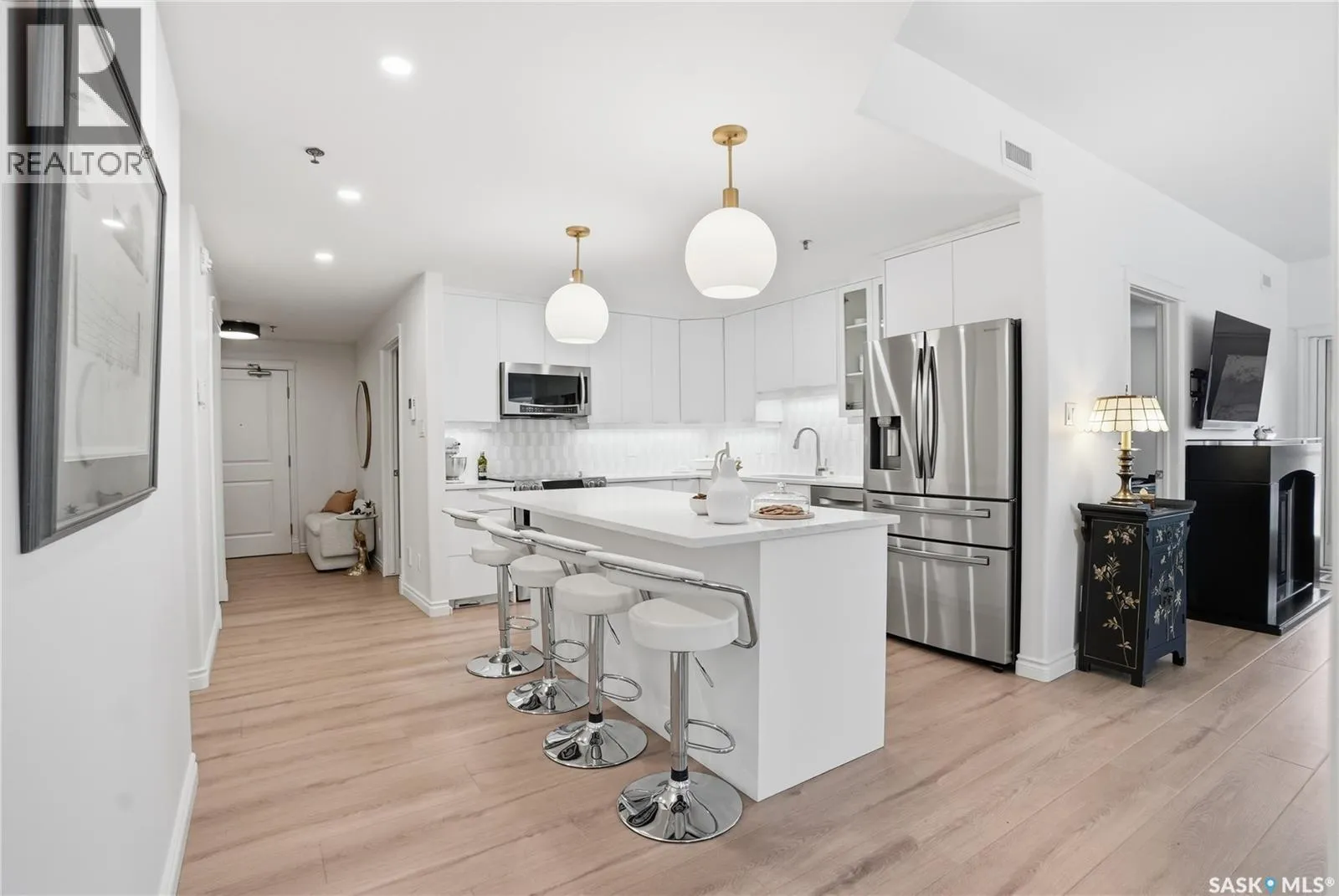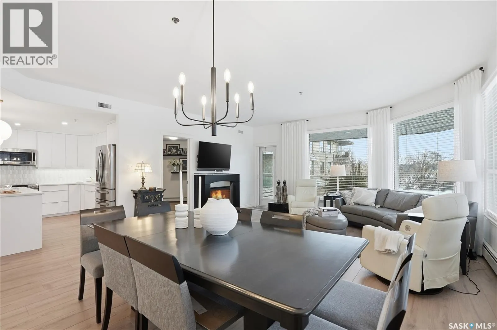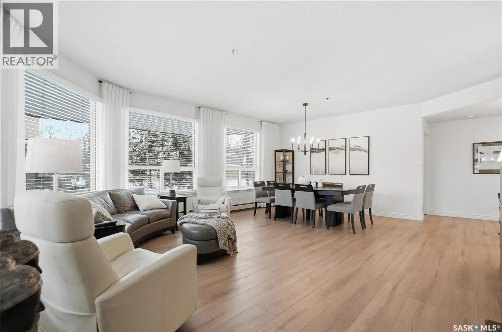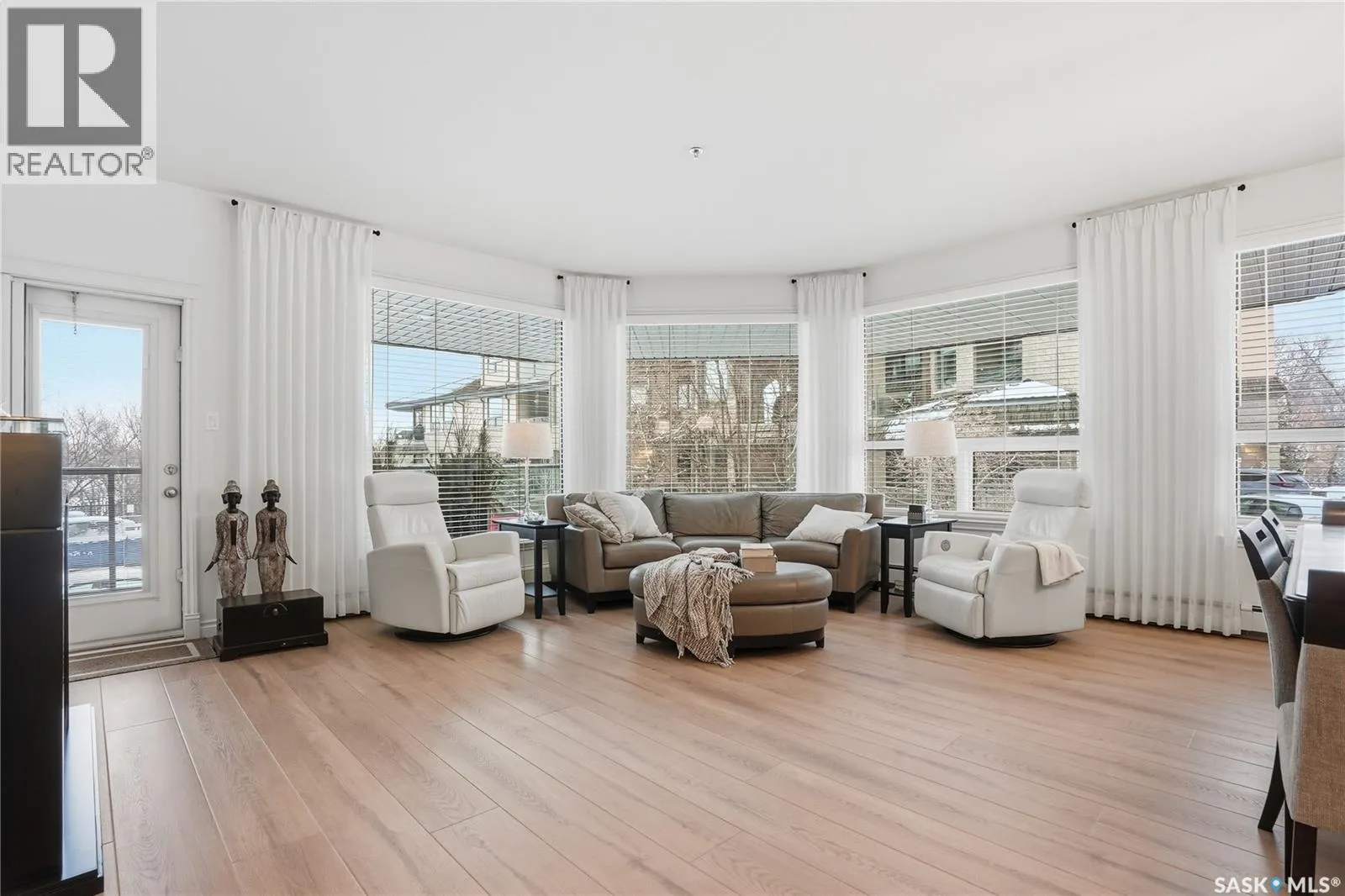 Wow!With so many upgrades, this unit shows almost like new! This Very quiet and well managed condo is Truly a rare find on prestigious Sask Crescent. Stunning 1,418 sq ft, 3-bedroom main floor corner unit and a former show suite located in a quiet, well-managed complex. Enjoy beautiful river views in the fall and winter, impressive 9â ceilings, and large panoramic windows that fill the home with natural light. This home has undergone extensive renovations, creating a refreshed interior that feels almost brand new. Major Interior Renovations (2025): Approximately 90% of the drywall replaced New electrical wiring and upgraded panel Redone ceilings and updated insulation 9-inch luxury vinyl plank flooring throughout (no off-gassing) Stunning Kitchen Renovation (2025): The beautifully upgraded kitchen features quartz countertops, modern backsplash, high-end appliances, soft-close cabinetry, and a sleek contemporary design, creating a bright and highly functional cooking space. Bathroom Upgrades(2025): Both bathrooms have been refreshed, including a fully renovated ensuite with a brand-new shower, vanity, mirrors, and modern finishes. Additional Interior Improvements Include(2025): Updated doors, trim, and baseboards. New lighting fixtures and backsplash. Upgraded vanity countertop, Custom laundry cabinetry ($6,000 upgrade). Premium Miele washer & dryer Window Coverings & Finishing Touches(2025): Hunter Douglas blinds ($4,300) Custom drapery in the living room and bedroom With extensive upgrades, this beautifully refreshed home offers the feel of a newly rebuilt interior in one of Saskatoonâs most desirable locations on Sask Crescent. (id:27476)