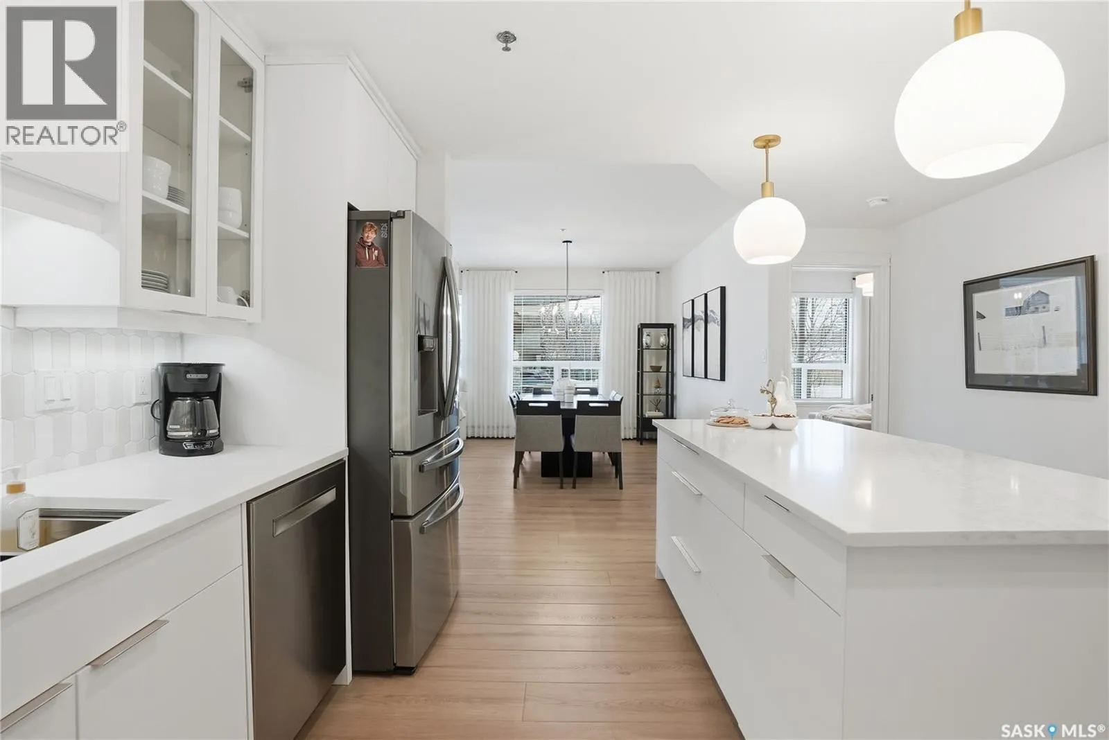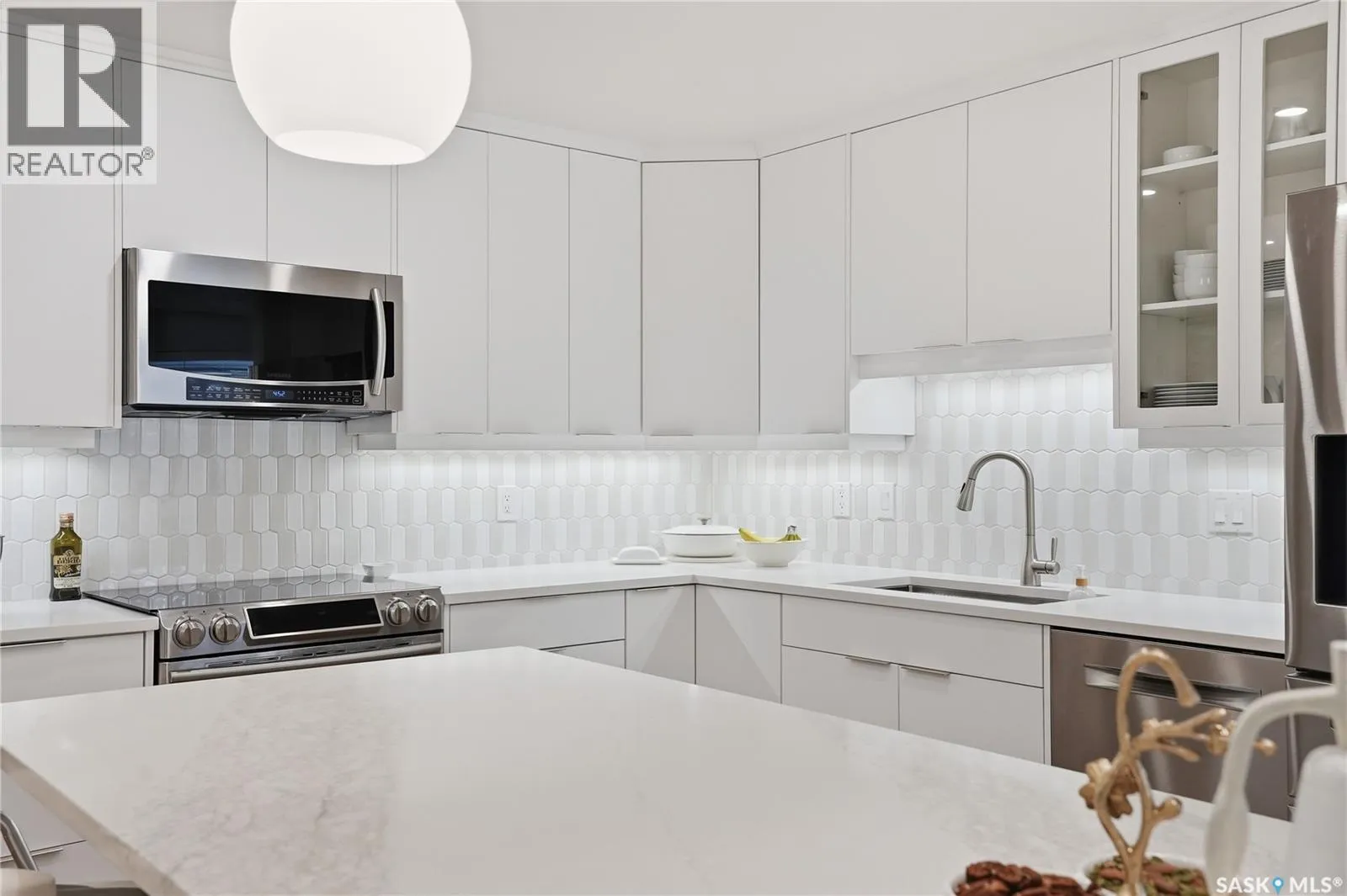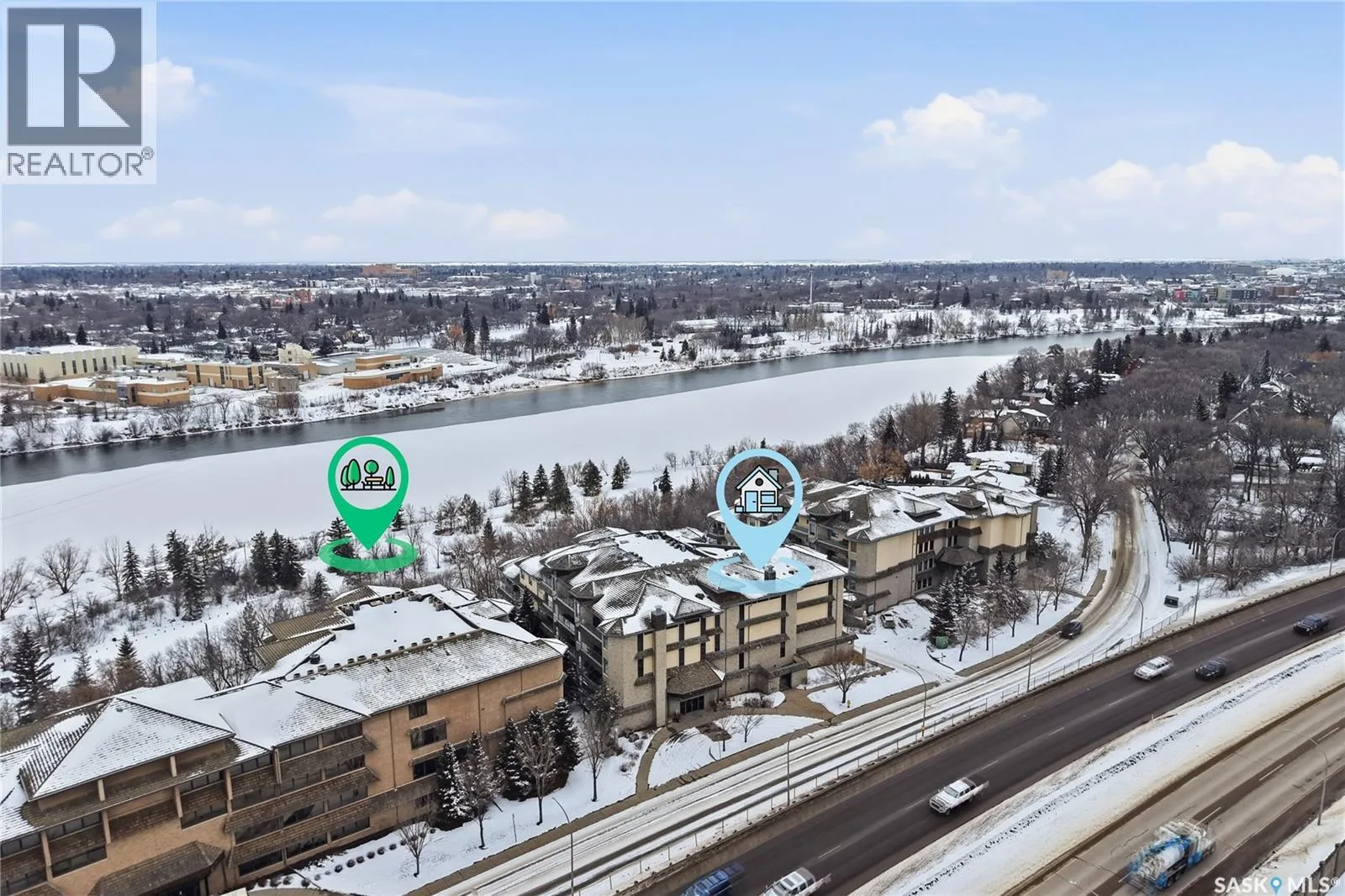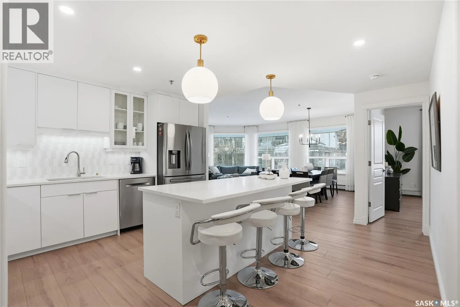 Wow!With so many upgrades, this unit shows almost like new! This Very quiet and well managed condo is Truly a rare find on prestigious Sask Crescent. Stunning 1,418 sq ft, 3-bedroom main floor corner unit and a former show suite located in a quiet, well-managed complex. Enjoy beautiful river views in the fall and winter, impressive 9â ceilings, and large panoramic windows that fill the home with natural light. This home has undergone extensive renovations, creating a refreshed interior that feels almost brand new. Major Interior Renovations (2025): Approximately 90% of the drywall replaced New electrical wiring and upgraded panel Redone ceilings and updated insulation 9-inch luxury vinyl plank flooring throughout (no off-gassing) Stunning Kitchen Renovation (2025): The beautifully upgraded kitchen features quartz countertops, modern backsplash, high-end appliances, soft-close cabinetry, and a sleek contemporary design, creating a bright and highly functional cooking space. Bathroom Upgrades(2025): Both bathrooms have been refreshed, including a fully renovated ensuite with a brand-new shower, vanity, mirrors, and modern finishes. Additional Interior Improvements Include(2025): Updated doors, trim, and baseboards. New lighting fixtures and backsplash. Upgraded vanity countertop, Custom laundry cabinetry ($6,000 upgrade). Premium Miele washer & dryer Window Coverings & Finishing Touches(2025): Hunter Douglas blinds ($4,300) Custom drapery in the living room and bedroom With extensive upgrades, this beautifully refreshed home offers the feel of a newly rebuilt interior in one of Saskatoonâs most desirable locations on Sask Crescent. (id:27476)