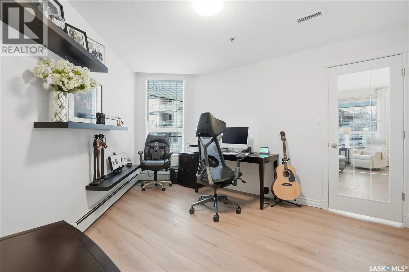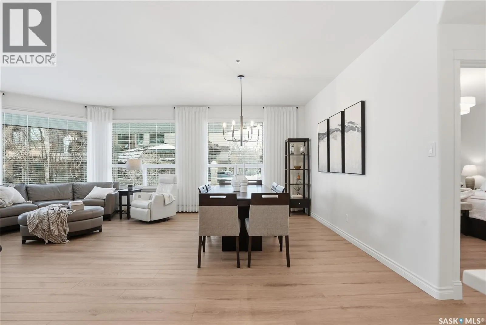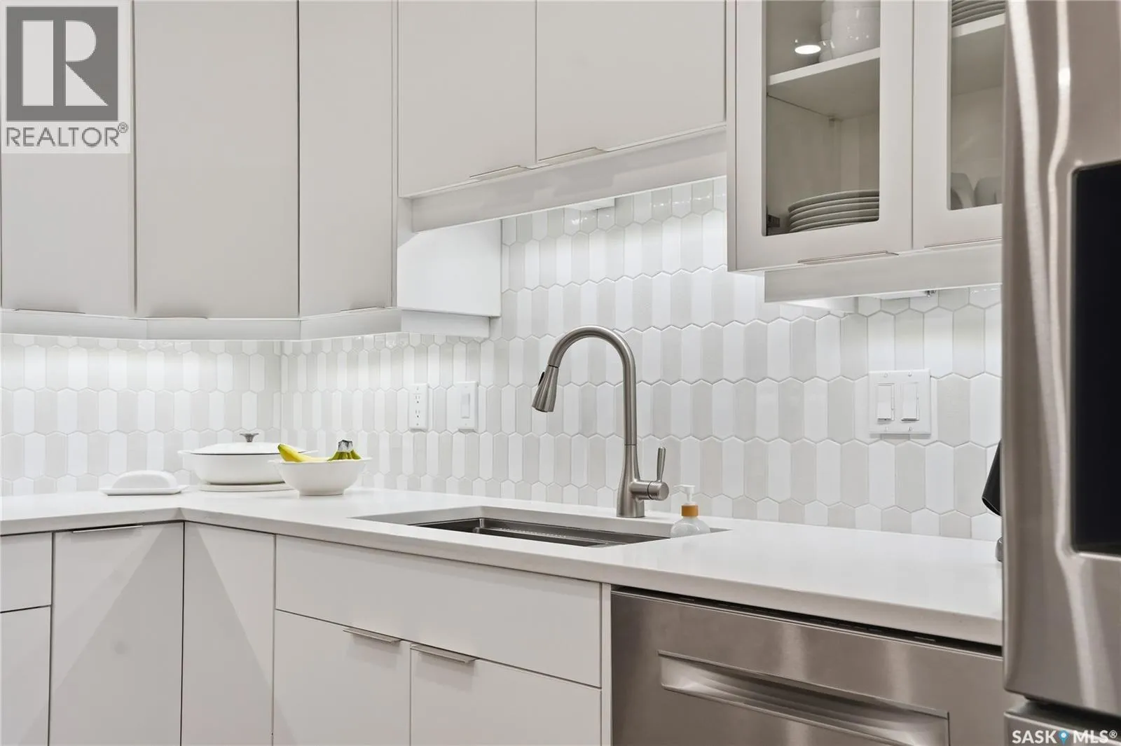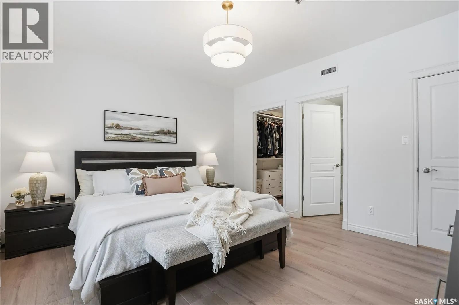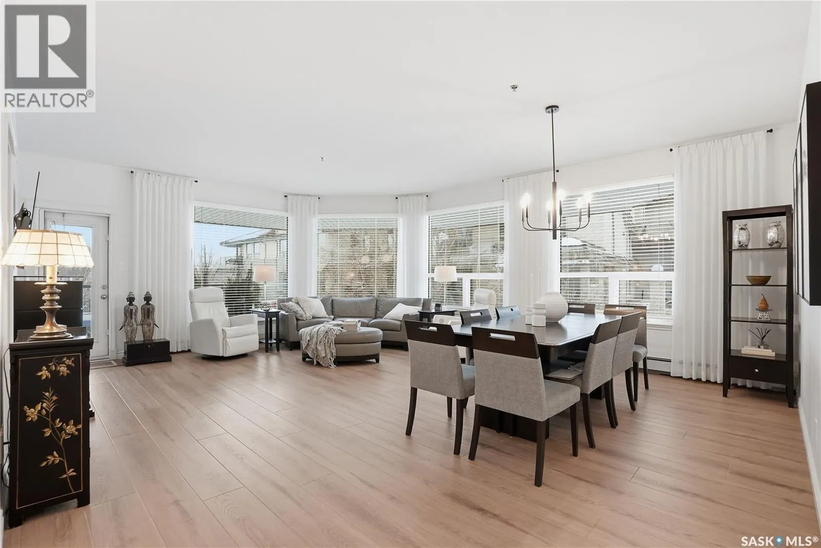 Wow!With so many upgrades, this unit shows almost like new! This Very quiet and well managed condo is Truly a rare find on prestigious Sask Crescent. Stunning 1,418 sq ft, 3-bedroom main floor corner unit and a former show suite located in a quiet, well-managed complex. Enjoy beautiful river views in the fall and winter, impressive 9â ceilings, and large panoramic windows that fill the home with natural light. This home has undergone extensive renovations, creating a refreshed interior that feels almost brand new. Major Interior Renovations (2025): Approximately 90% of the drywall replaced New electrical wiring and upgraded panel Redone ceilings and updated insulation 9-inch luxury vinyl plank flooring throughout (no off-gassing) Stunning Kitchen Renovation (2025): The beautifully upgraded kitchen features quartz countertops, modern backsplash, high-end appliances, soft-close cabinetry, and a sleek contemporary design, creating a bright and highly functional cooking space. Bathroom Upgrades(2025): Both bathrooms have been refreshed, including a fully renovated ensuite with a brand-new shower, vanity, mirrors, and modern finishes. Additional Interior Improvements Include(2025): Updated doors, trim, and baseboards. New lighting fixtures and backsplash. Upgraded vanity countertop, Custom laundry cabinetry ($6,000 upgrade). Premium Miele washer & dryer Window Coverings & Finishing Touches(2025): Hunter Douglas blinds ($4,300) Custom drapery in the living room and bedroom With extensive upgrades, this beautifully refreshed home offers the feel of a newly rebuilt interior in one of Saskatoonâs most desirable locations on Sask Crescent. (id:27476)