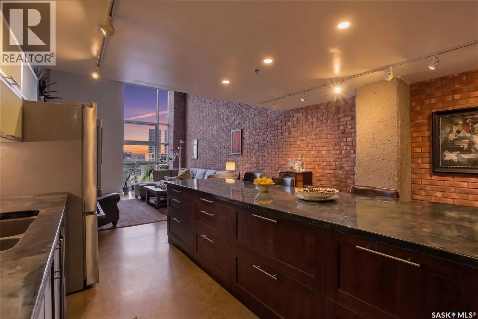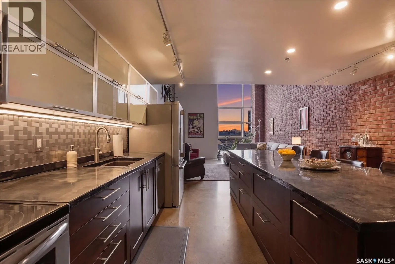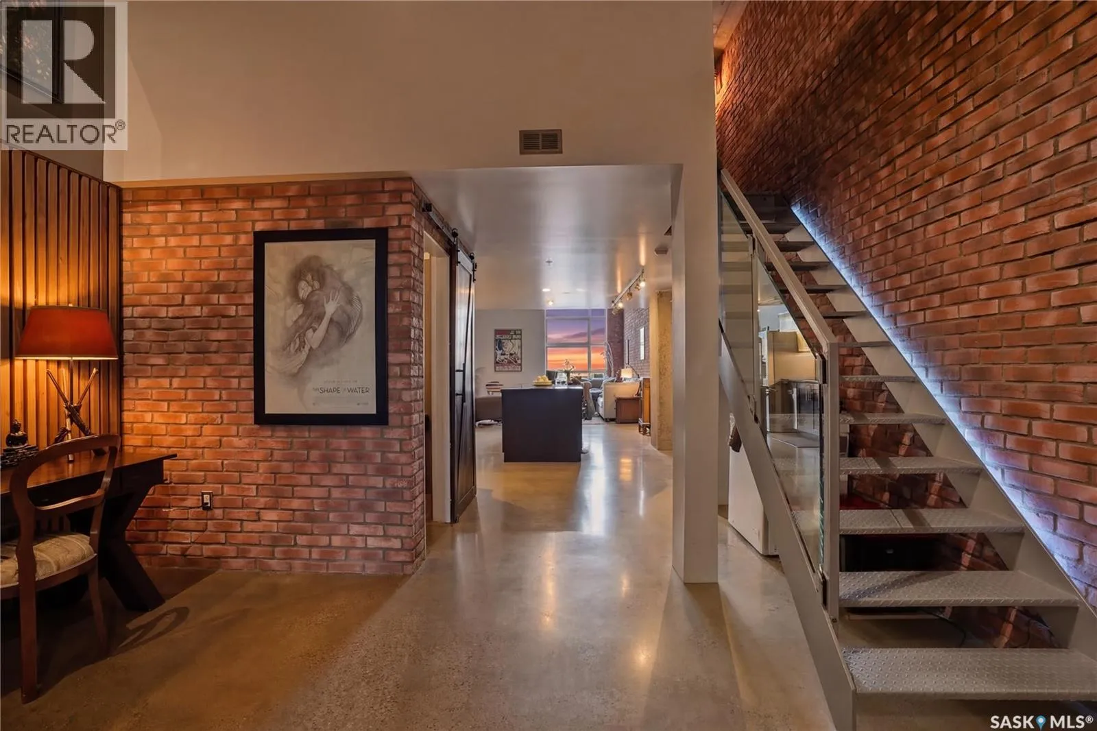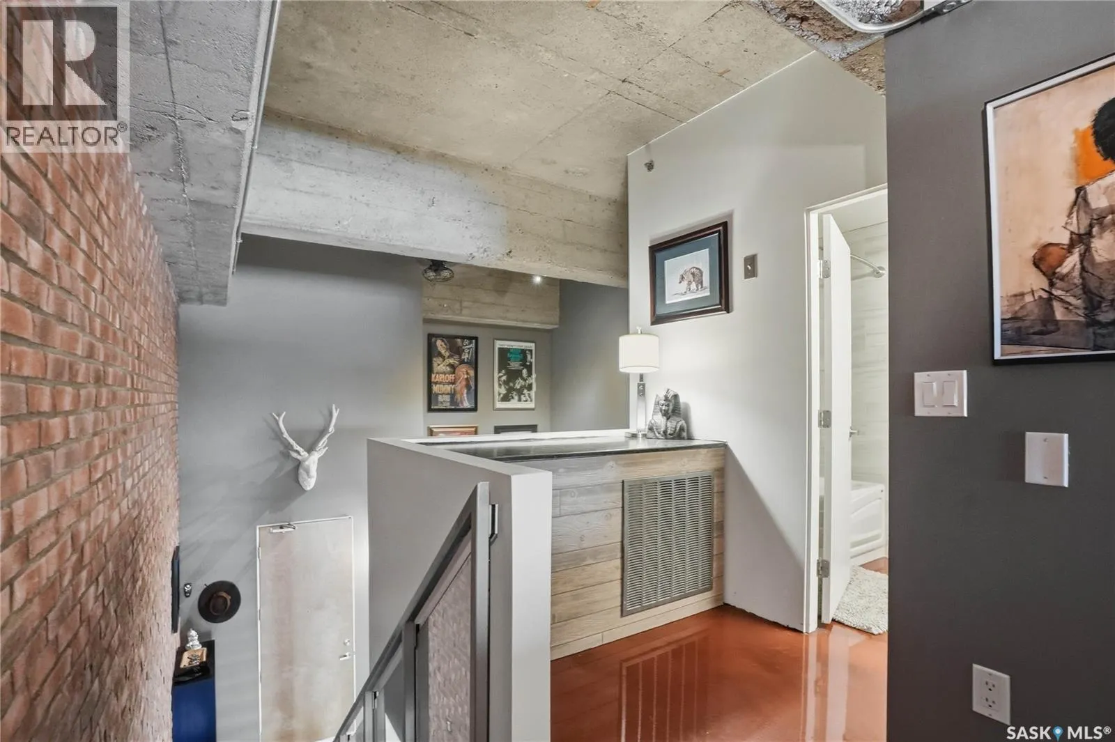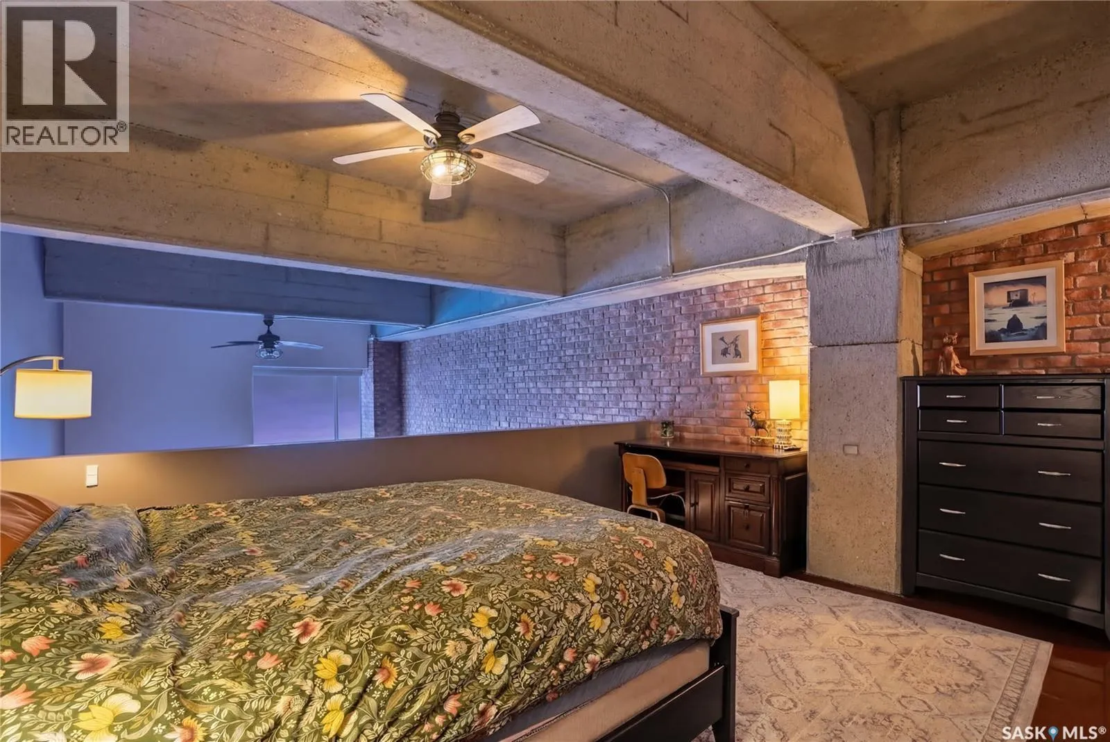 Welcome to this stunning loft-style condo in iconic 2nd Avenue Lofts, offering 1,093 sq. ft. of beautifully customized living space in the heart of downtown Saskatoon. This 2-storey unit blends authentic industrial character with thoughtful, high-end renovations, creating a home that is both dramatic and highly functional. Featuring 1 bedroom, 2 bathrooms, and soaring ceilings, this residence is defined by its striking exposed brick feature walls, polished concrete flooring on the main level, and massive windows that flood the space with natural light while showcasing incredible city views. The main floor offers an open-concept layout ideal for both everyday living and entertaining, with a custom kitchen that includes concrete countertops on the island, kitchen surfaces, coffee bar, and upper laundry area, along with a stainless steel tile backsplash and extensive lighting upgrades. Recessed lighting, under-cabinet lighting, ceiling fans, and dedicated outlets for blinds and portable A/C add both style and function. The living room is anchored by dramatic 16-foot windows fitted with custom motorized blackout blinds, adding comfort and convenience to the bold architectural design. Upstairs, the lofted primary bedroom overlooks the main living space and continues the condoâs modern industrial feel with metallic epoxy flooring in the landing area and a fully renovated bathroom. Both bathrooms have been extensively updated with upgraded tile, vanities, toilets, fixtures, recessed medicine cabinets, and modern lighting. In-suite laundry adds further convenience. This unit includes 1 underground stall and is located in a professionally managed building with elevator access and an exercise area. Condo fees include heat, water, sewer, power, common area maintenance, exterior building maintenance, garbage, snow, and reserve fund contributions. A rare opportunity to own a truly customized urban loft in one of Saskatoonâs most recognizable downtown buildings. (id:27476)