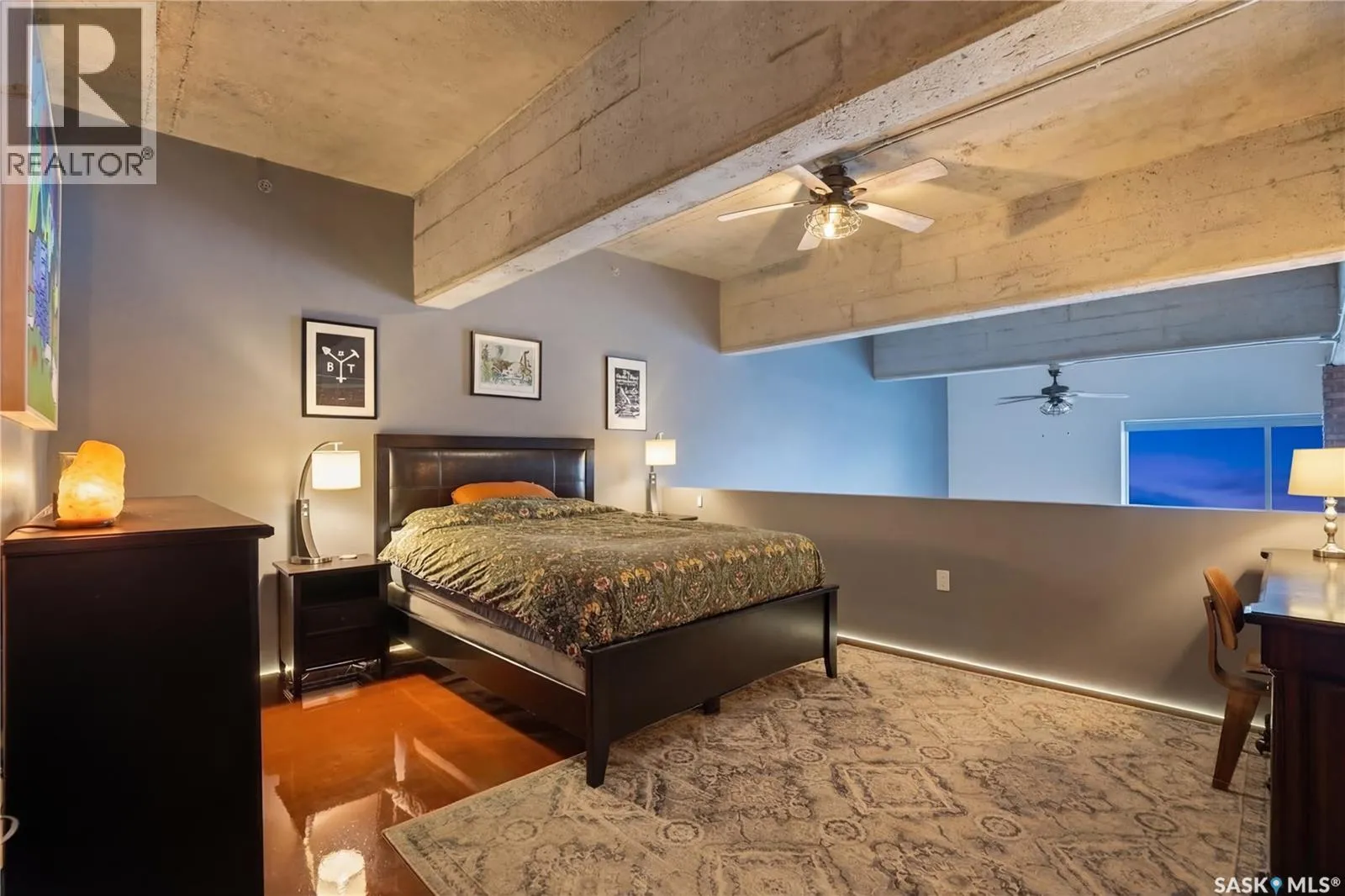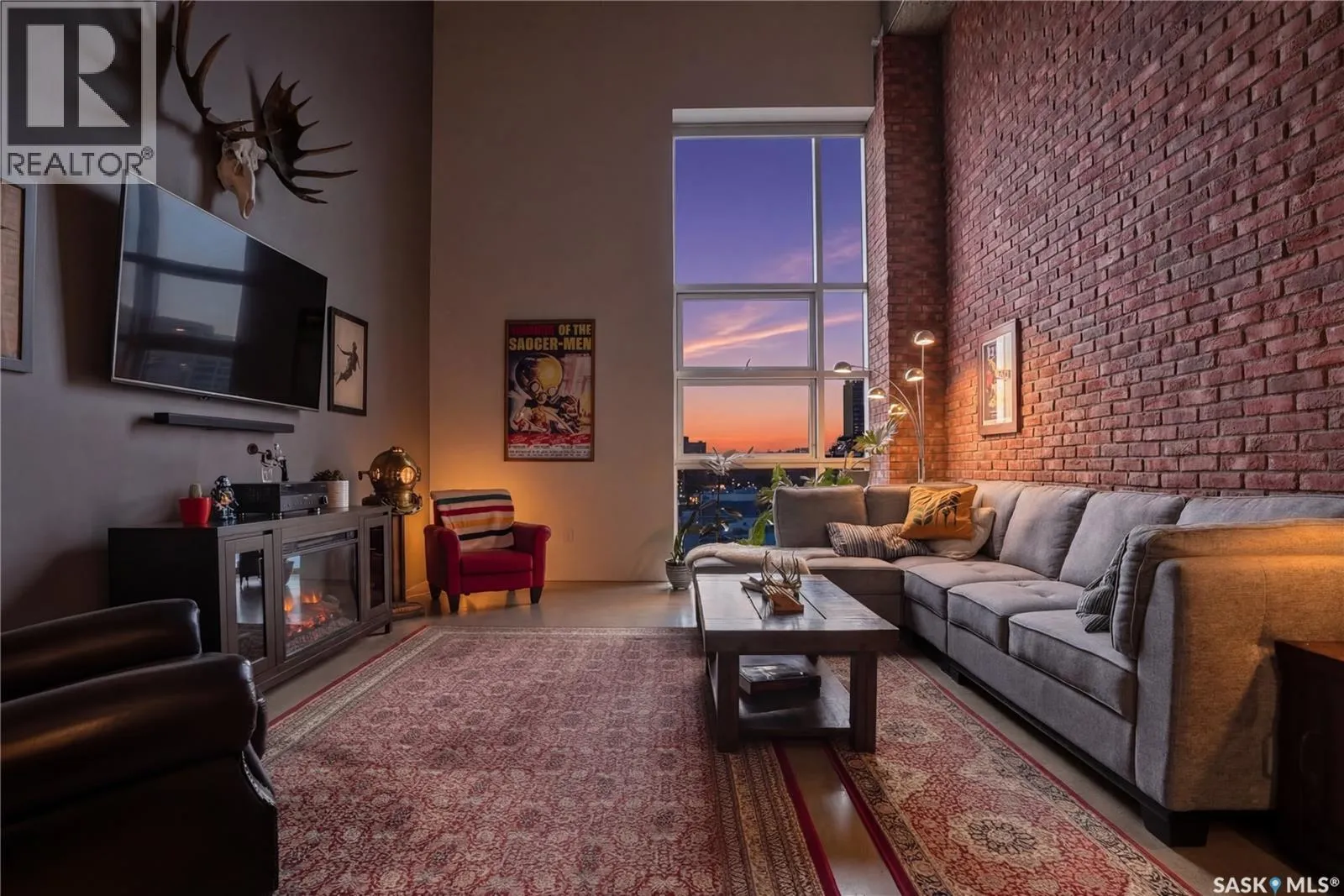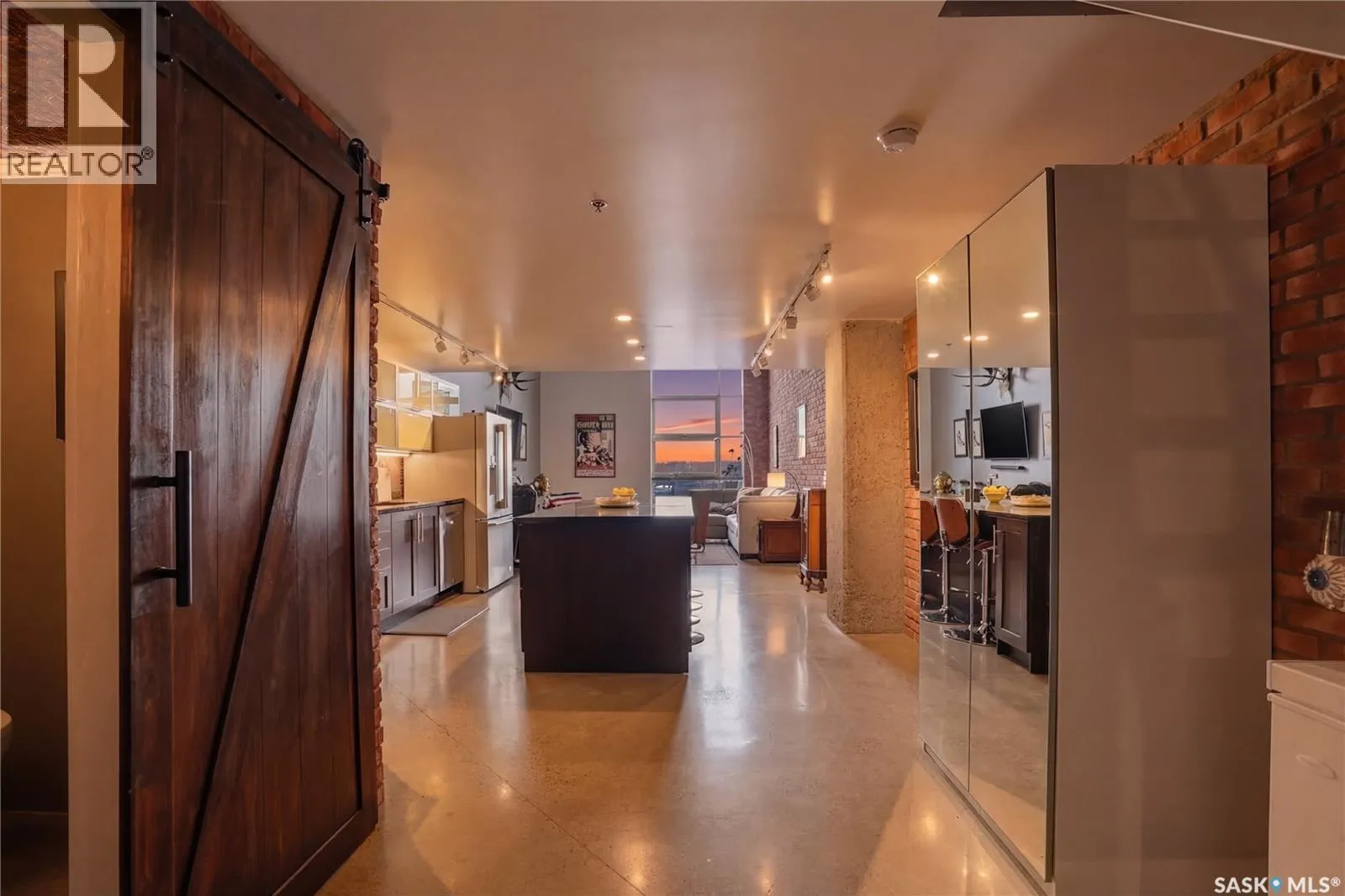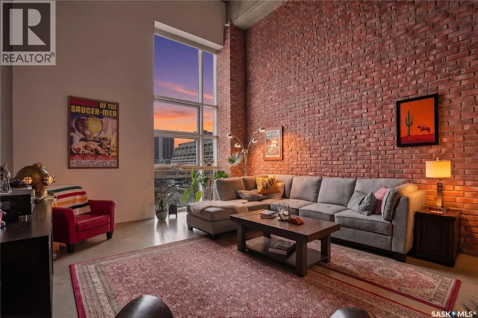 Welcome to this stunning loft-style condo in iconic 2nd Avenue Lofts, offering 1,093 sq. ft. of beautifully customized living space in the heart of downtown Saskatoon. This 2-storey unit blends authentic industrial character with thoughtful, high-end renovations, creating a home that is both dramatic and highly functional. Featuring 1 bedroom, 2 bathrooms, and soaring ceilings, this residence is defined by its striking exposed brick feature walls, polished concrete flooring on the main level, and massive windows that flood the space with natural light while showcasing incredible city views. The main floor offers an open-concept layout ideal for both everyday living and entertaining, with a custom kitchen that includes concrete countertops on the island, kitchen surfaces, coffee bar, and upper laundry area, along with a stainless steel tile backsplash and extensive lighting upgrades. Recessed lighting, under-cabinet lighting, ceiling fans, and dedicated outlets for blinds and portable A/C add both style and function. The living room is anchored by dramatic 16-foot windows fitted with custom motorized blackout blinds, adding comfort and convenience to the bold architectural design. Upstairs, the lofted primary bedroom overlooks the main living space and continues the condoâs modern industrial feel with metallic epoxy flooring in the landing area and a fully renovated bathroom. Both bathrooms have been extensively updated with upgraded tile, vanities, toilets, fixtures, recessed medicine cabinets, and modern lighting. In-suite laundry adds further convenience. This unit includes 1 underground stall and is located in a professionally managed building with elevator access and an exercise area. Condo fees include heat, water, sewer, power, common area maintenance, exterior building maintenance, garbage, snow, and reserve fund contributions. A rare opportunity to own a truly customized urban loft in one of Saskatoonâs most recognizable downtown buildings. (id:27476)