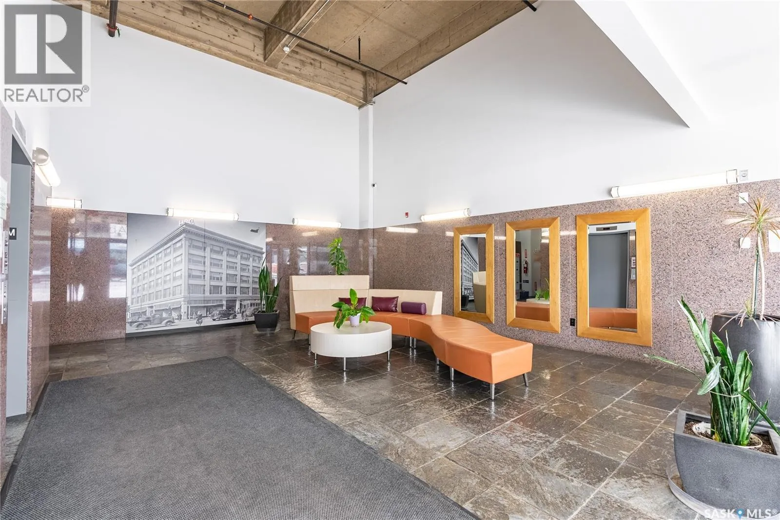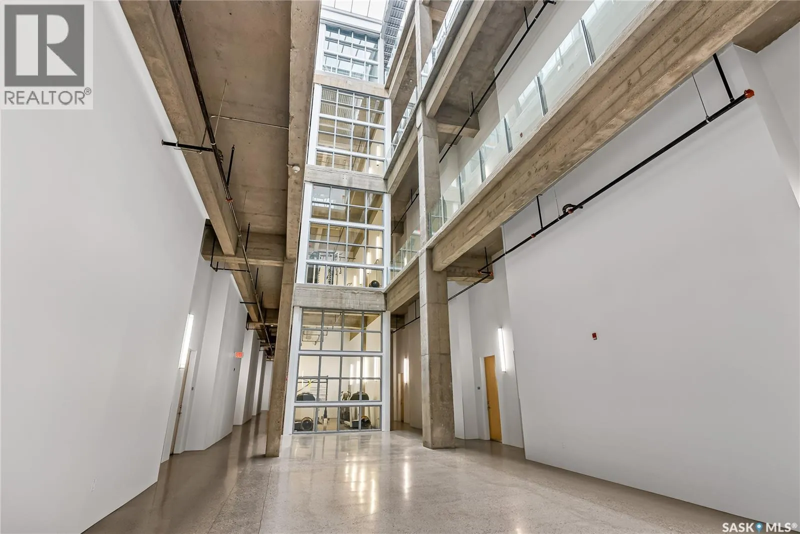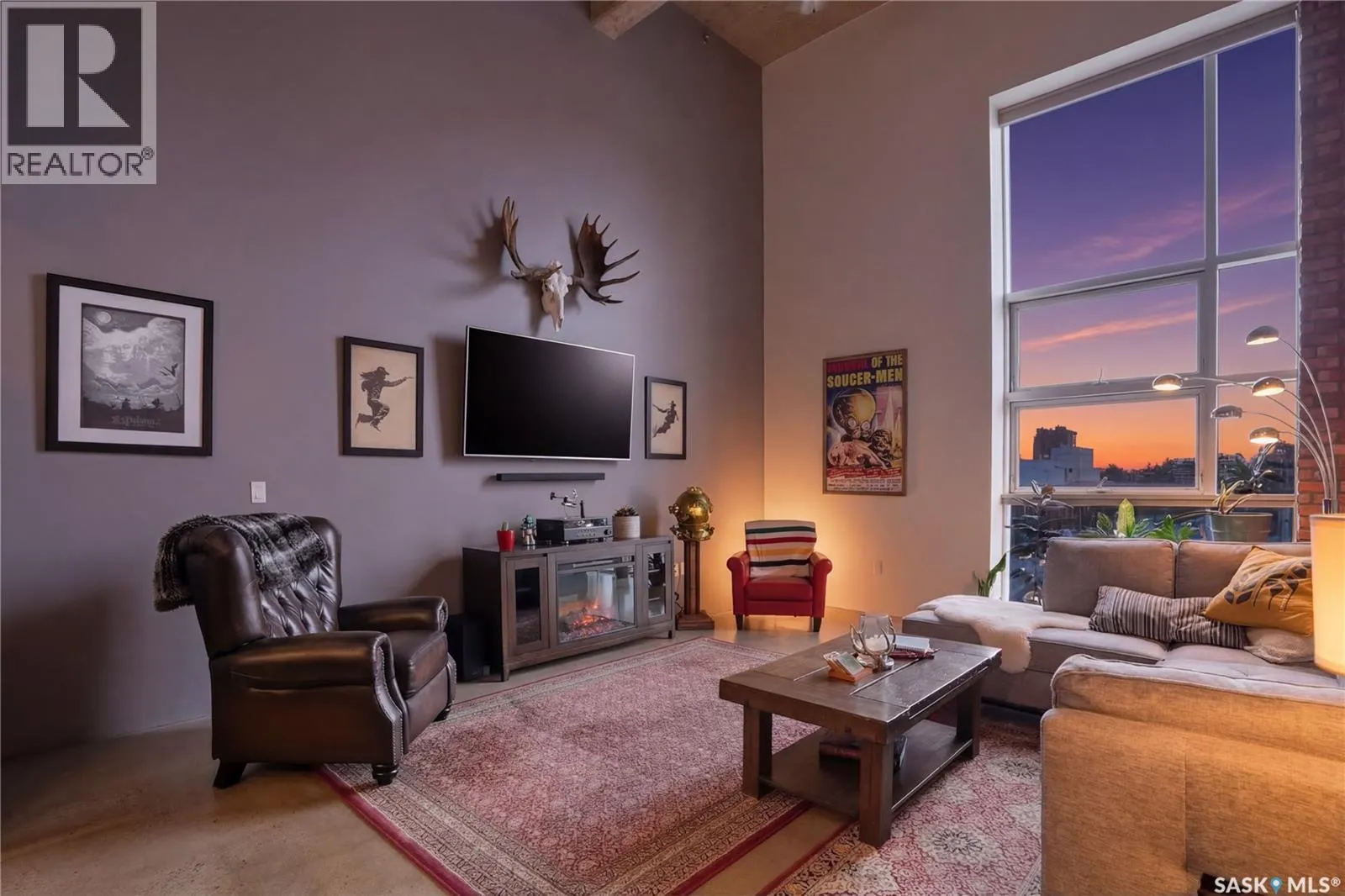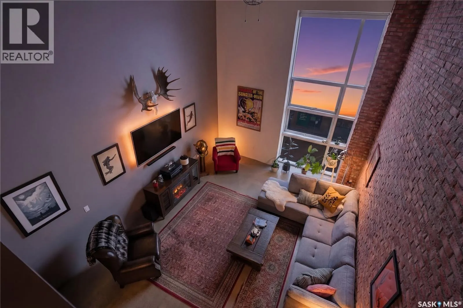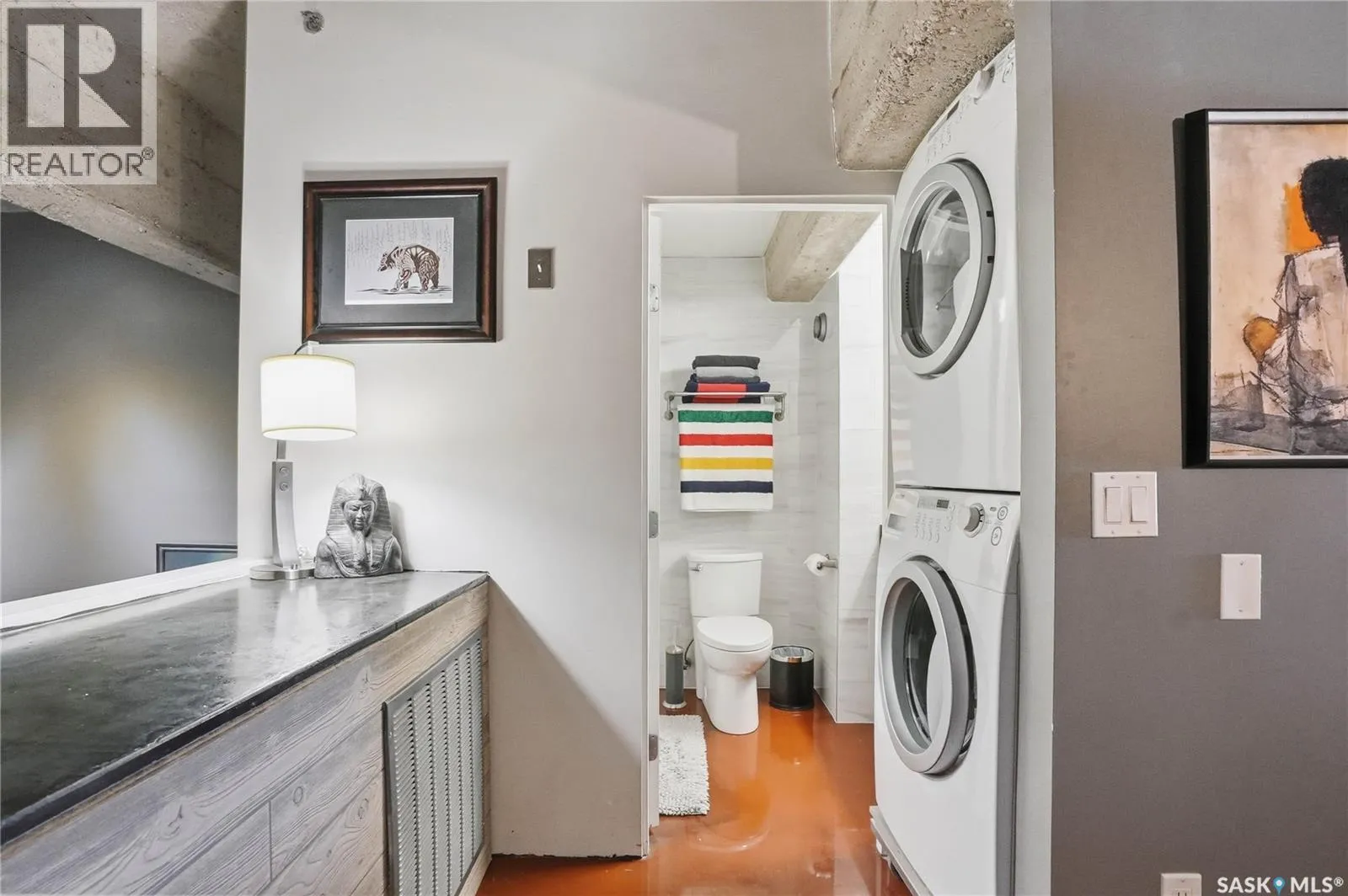 Welcome to this stunning loft-style condo in iconic 2nd Avenue Lofts, offering 1,093 sq. ft. of beautifully customized living space in the heart of downtown Saskatoon. This 2-storey unit blends authentic industrial character with thoughtful, high-end renovations, creating a home that is both dramatic and highly functional. Featuring 1 bedroom, 2 bathrooms, and soaring ceilings, this residence is defined by its striking exposed brick feature walls, polished concrete flooring on the main level, and massive windows that flood the space with natural light while showcasing incredible city views. The main floor offers an open-concept layout ideal for both everyday living and entertaining, with a custom kitchen that includes concrete countertops on the island, kitchen surfaces, coffee bar, and upper laundry area, along with a stainless steel tile backsplash and extensive lighting upgrades. Recessed lighting, under-cabinet lighting, ceiling fans, and dedicated outlets for blinds and portable A/C add both style and function. The living room is anchored by dramatic 16-foot windows fitted with custom motorized blackout blinds, adding comfort and convenience to the bold architectural design. Upstairs, the lofted primary bedroom overlooks the main living space and continues the condoâs modern industrial feel with metallic epoxy flooring in the landing area and a fully renovated bathroom. Both bathrooms have been extensively updated with upgraded tile, vanities, toilets, fixtures, recessed medicine cabinets, and modern lighting. In-suite laundry adds further convenience. This unit includes 1 underground stall and is located in a professionally managed building with elevator access and an exercise area. Condo fees include heat, water, sewer, power, common area maintenance, exterior building maintenance, garbage, snow, and reserve fund contributions. A rare opportunity to own a truly customized urban loft in one of Saskatoonâs most recognizable downtown buildings. (id:27476)