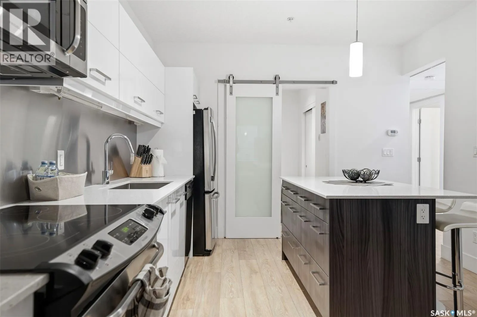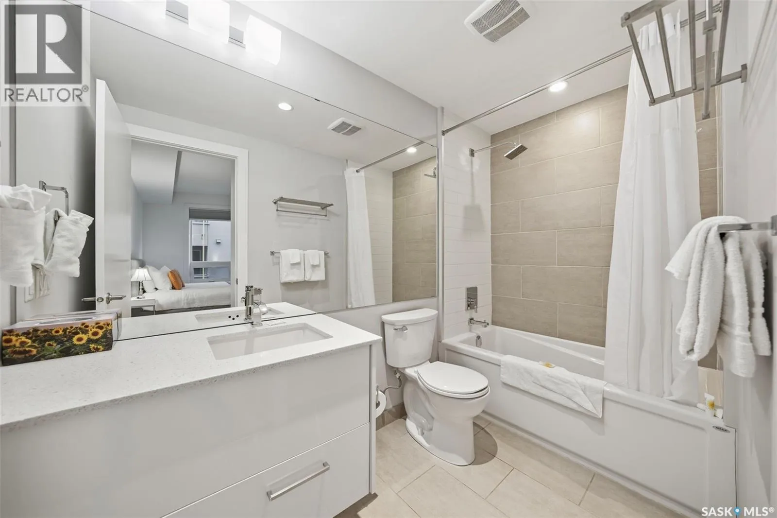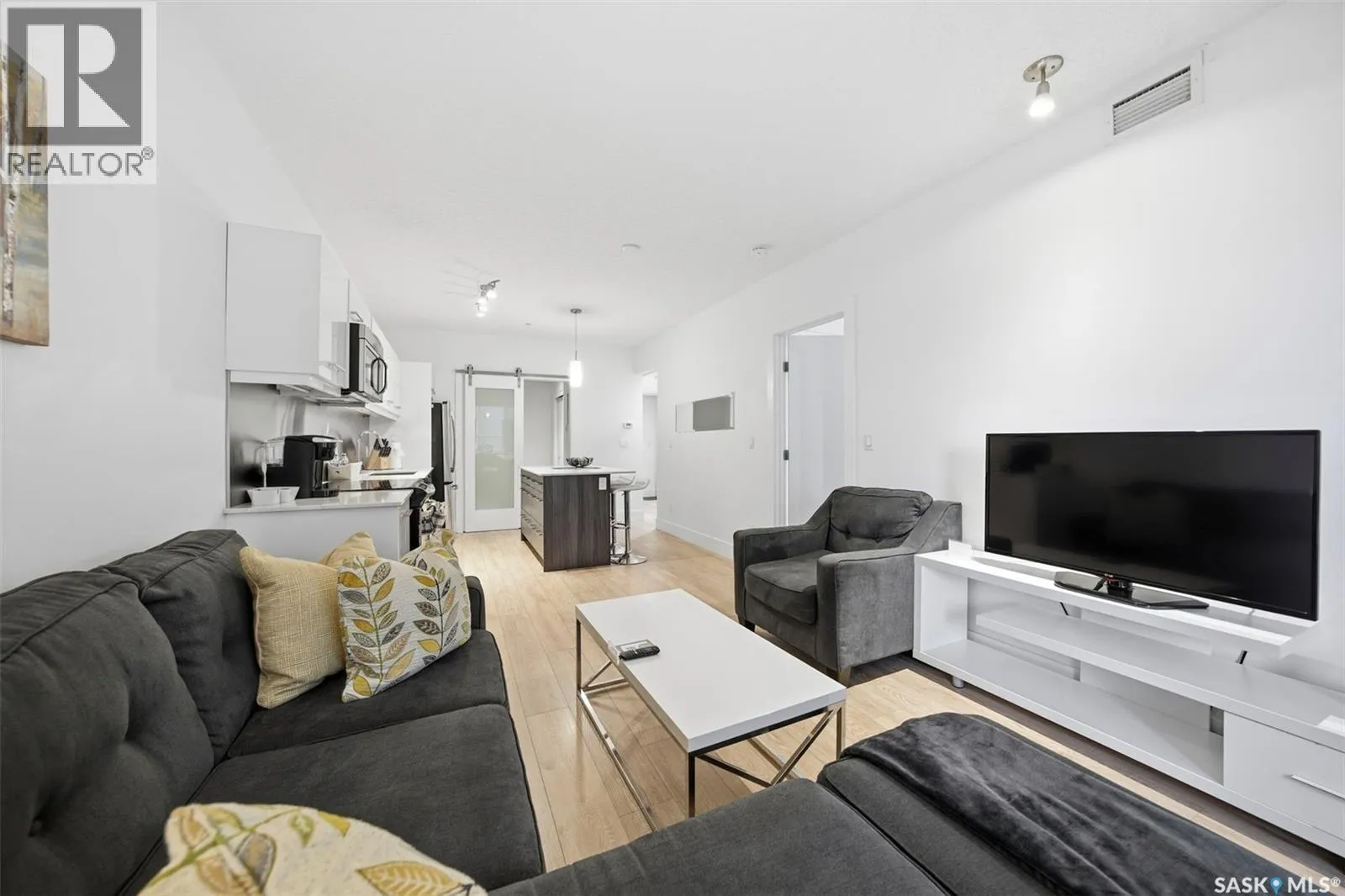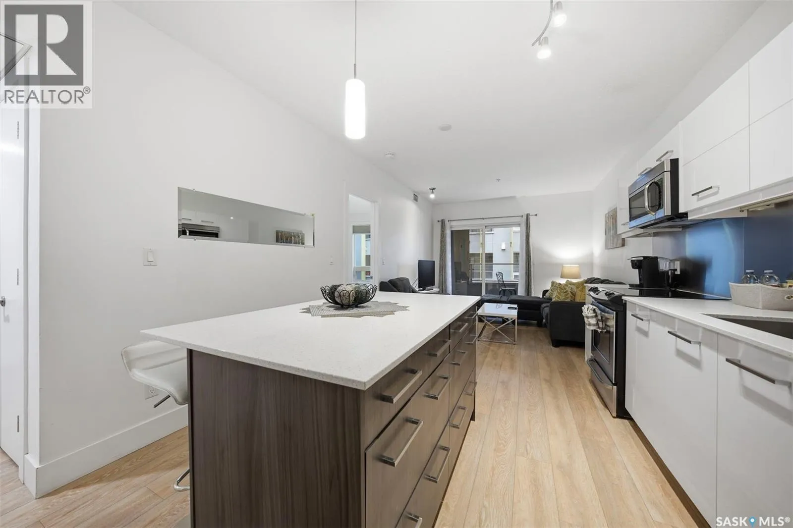 Welcome to Unit 228 at The Banks, offering modern condo living in one of Saskatoonâs most vibrant neighbourhoods, just steps from the river bank encompassed by many great businesses, shops, cafes, and local markets. This well-appointed unit features a spacious front foyer with a conveniently located 3-piece bathroom complete with walk-in shower, a versatile den/study area, and in-suite laundry for added functionality and convenience. The main living space showcases a sleek contemporary design with high-gloss cabinetry, quartz countertops throughout kitchen and bathrooms, a large kitchen island, stainless steel backsplash, and stainless steel appliances. The primary bedroom offers a comfortable retreat with a 4-piece ensuite featuring a tub/shower combination with tile surround. A second bedroom and recessed south facing balcony complete the package. Additional highlights include central air conditioning, one titled underground parking stall, and a storage unit. The Banks is home to a variety of popular local businesses and is situated in a highly walkable, amenity-rich area. Pet-friendly building for unit owners (subject to board approval) and ready for immediate possession. Just move in and enjoy this low maintenance lifestyle! (id:27476)