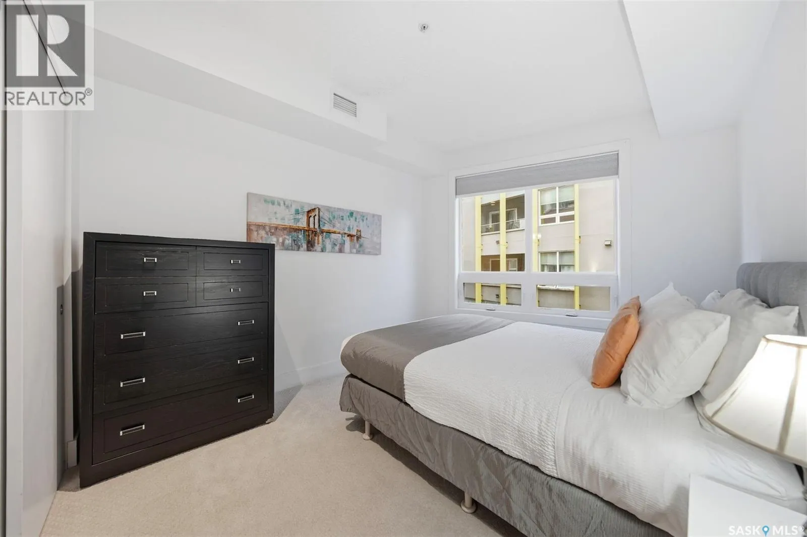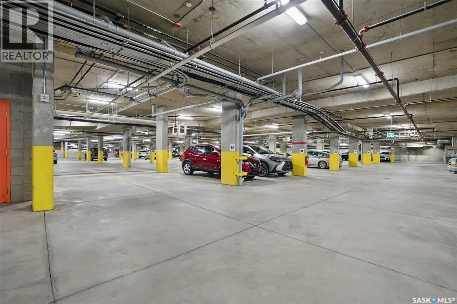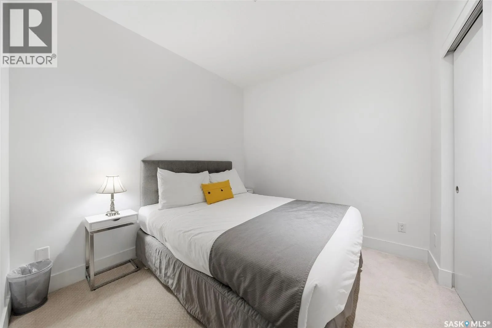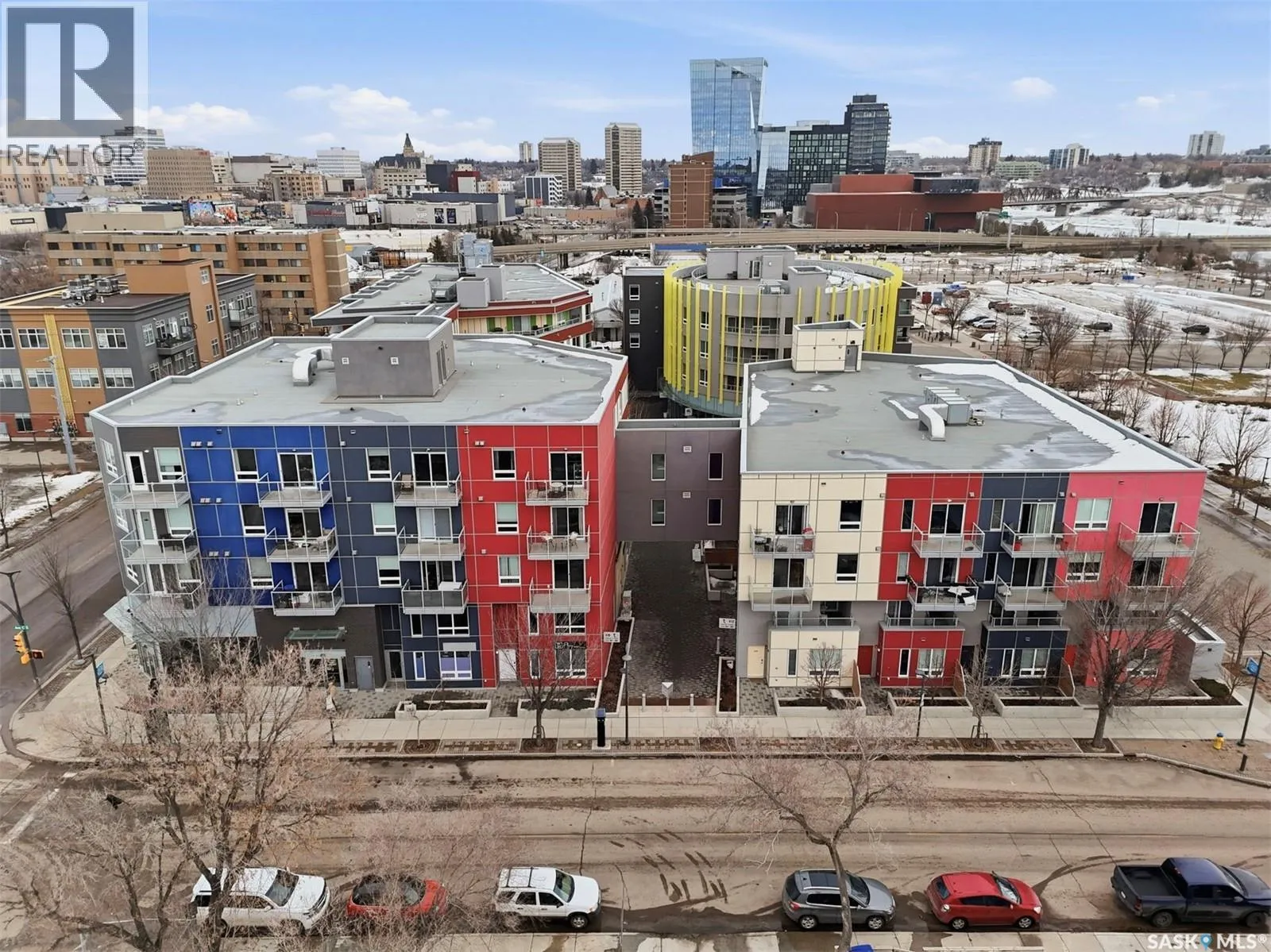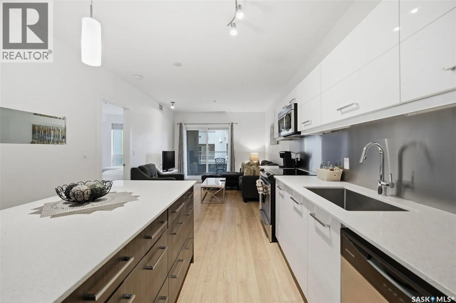 Welcome to Unit 228 at The Banks, offering modern condo living in one of Saskatoonâs most vibrant neighbourhoods, just steps from the river bank encompassed by many great businesses, shops, cafes, and local markets. This well-appointed unit features a spacious front foyer with a conveniently located 3-piece bathroom complete with walk-in shower, a versatile den/study area, and in-suite laundry for added functionality and convenience. The main living space showcases a sleek contemporary design with high-gloss cabinetry, quartz countertops throughout kitchen and bathrooms, a large kitchen island, stainless steel backsplash, and stainless steel appliances. The primary bedroom offers a comfortable retreat with a 4-piece ensuite featuring a tub/shower combination with tile surround. A second bedroom and recessed south facing balcony complete the package. Additional highlights include central air conditioning, one titled underground parking stall, and a storage unit. The Banks is home to a variety of popular local businesses and is situated in a highly walkable, amenity-rich area. Pet-friendly building for unit owners (subject to board approval) and ready for immediate possession. Just move in and enjoy this low maintenance lifestyle! (id:27476)