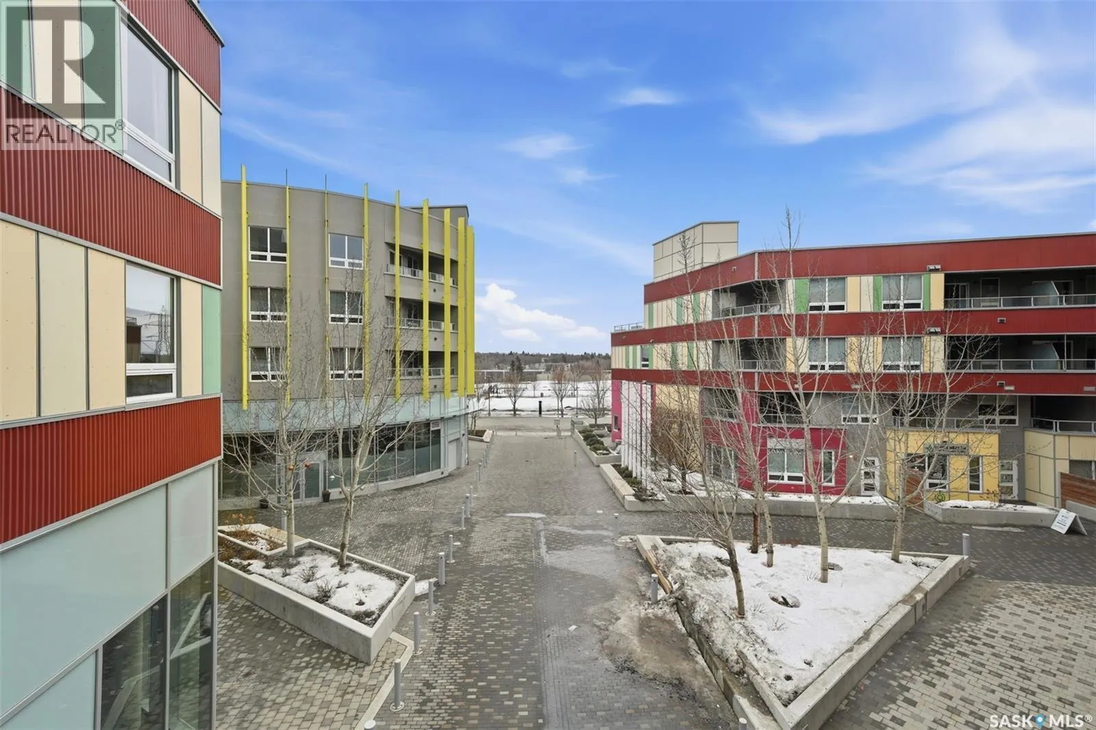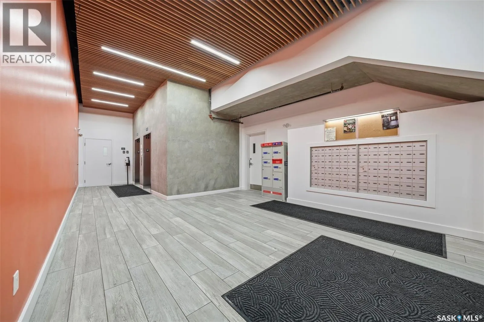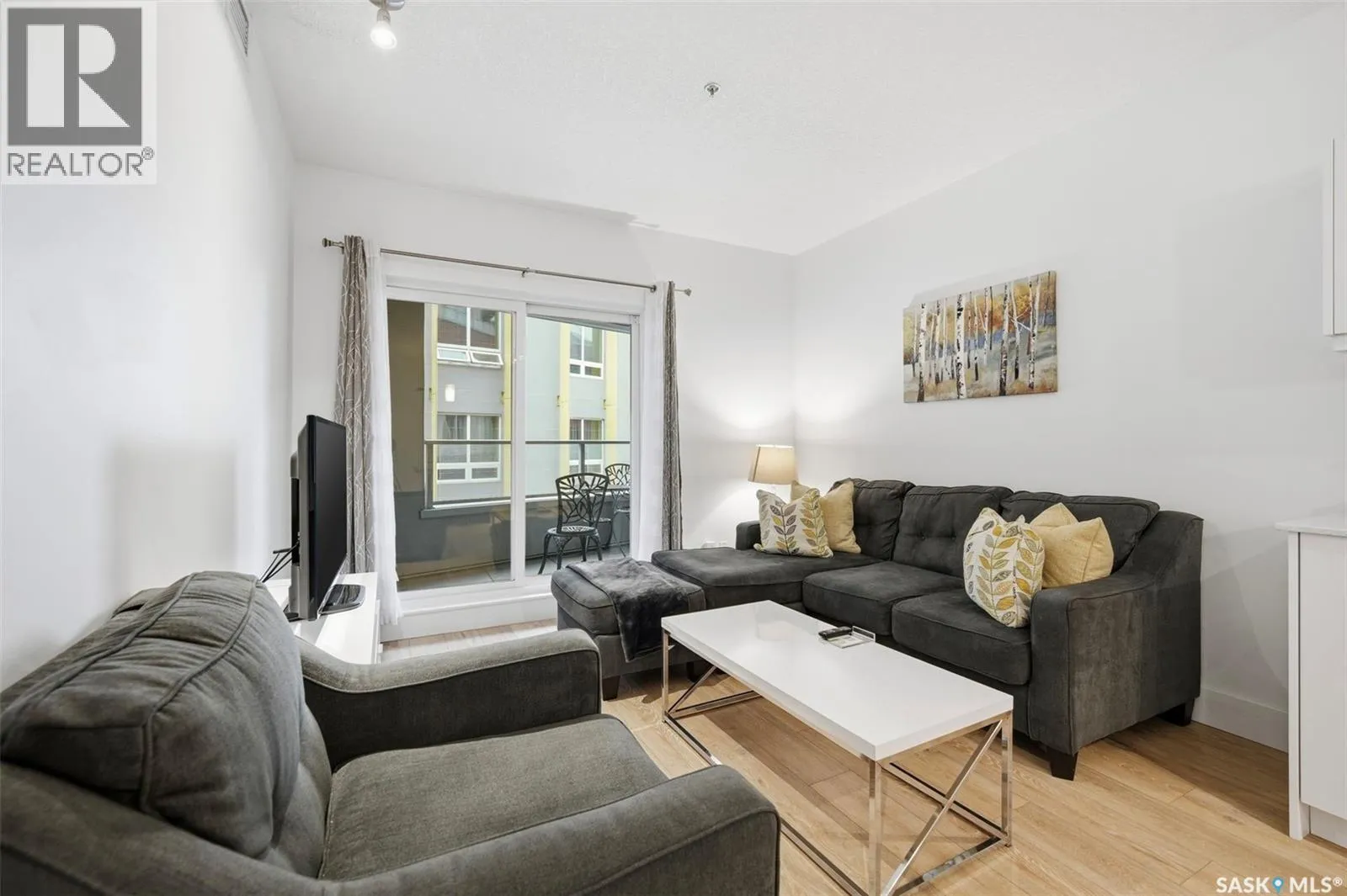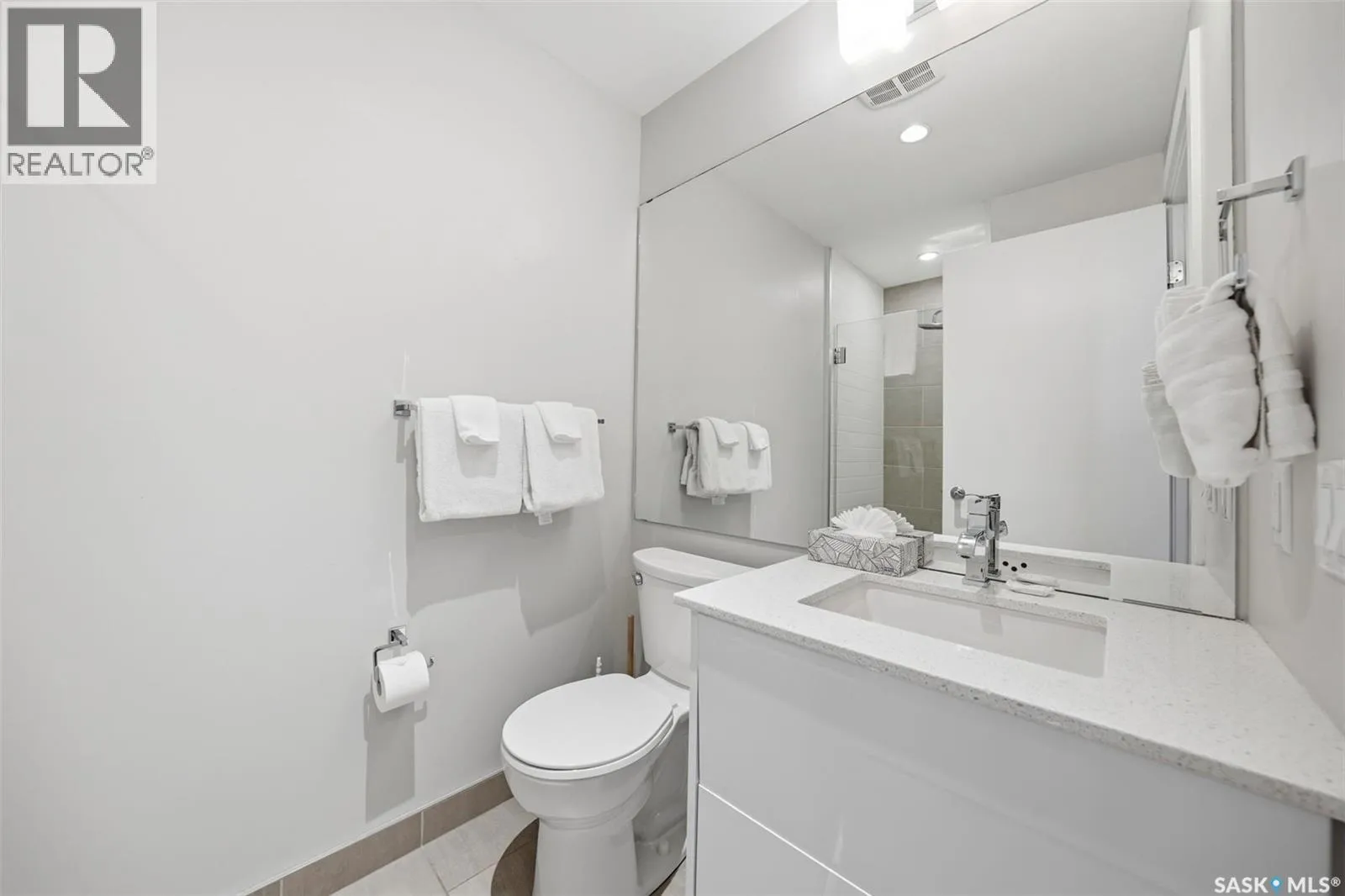Welcome to Unit 228 at The Banks, offering modern condo living in one of Saskatoonâs most vibrant neighbourhoods, just steps from the river bank encompassed by many great businesses, shops, cafes, and local markets. This well-appointed unit features a spacious front foyer with a conveniently located 3-piece bathroom complete with walk-in shower, a versatile den/study area, and in-suite laundry for added functionality and convenience. The main living space showcases a sleek contemporary design with high-gloss cabinetry, quartz countertops throughout kitchen and bathrooms, a large kitchen island, stainless steel backsplash, and stainless steel appliances. The primary bedroom offers a comfortable retreat with a 4-piece ensuite featuring a tub/shower combination with tile surround. A second bedroom and recessed south facing balcony complete the package. Additional highlights include central air conditioning, one titled underground parking stall, and a storage unit. The Banks is home to a variety of popular local businesses and is situated in a highly walkable, amenity-rich area. Pet-friendly building for unit owners (subject to board approval) and ready for immediate possession. Just move in and enjoy this low maintenance lifestyle! (id:27476)