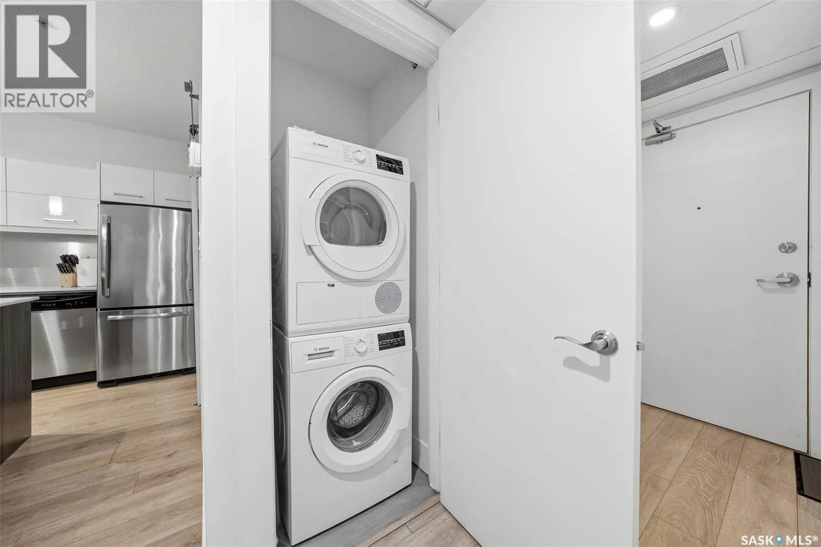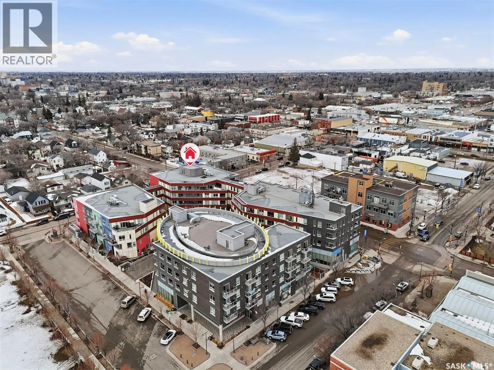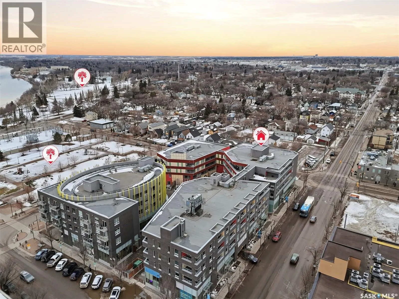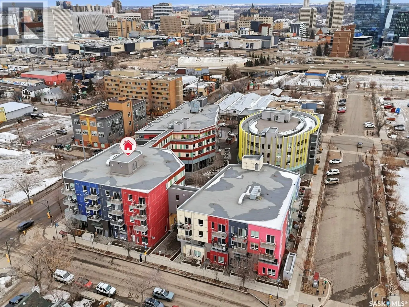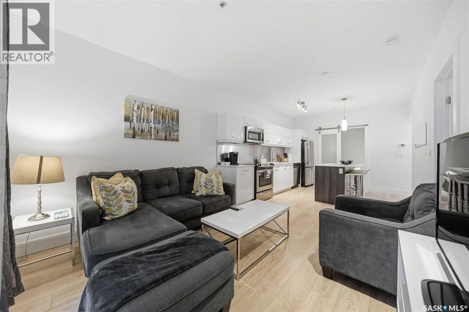 Welcome to Unit 228 at The Banks, offering modern condo living in one of Saskatoonâs most vibrant neighbourhoods, just steps from the river bank encompassed by many great businesses, shops, cafes, and local markets. This well-appointed unit features a spacious front foyer with a conveniently located 3-piece bathroom complete with walk-in shower, a versatile den/study area, and in-suite laundry for added functionality and convenience. The main living space showcases a sleek contemporary design with high-gloss cabinetry, quartz countertops throughout kitchen and bathrooms, a large kitchen island, stainless steel backsplash, and stainless steel appliances. The primary bedroom offers a comfortable retreat with a 4-piece ensuite featuring a tub/shower combination with tile surround. A second bedroom and recessed south facing balcony complete the package. Additional highlights include central air conditioning, one titled underground parking stall, and a storage unit. The Banks is home to a variety of popular local businesses and is situated in a highly walkable, amenity-rich area. Pet-friendly building for unit owners (subject to board approval) and ready for immediate possession. Just move in and enjoy this low maintenance lifestyle! (id:27476)