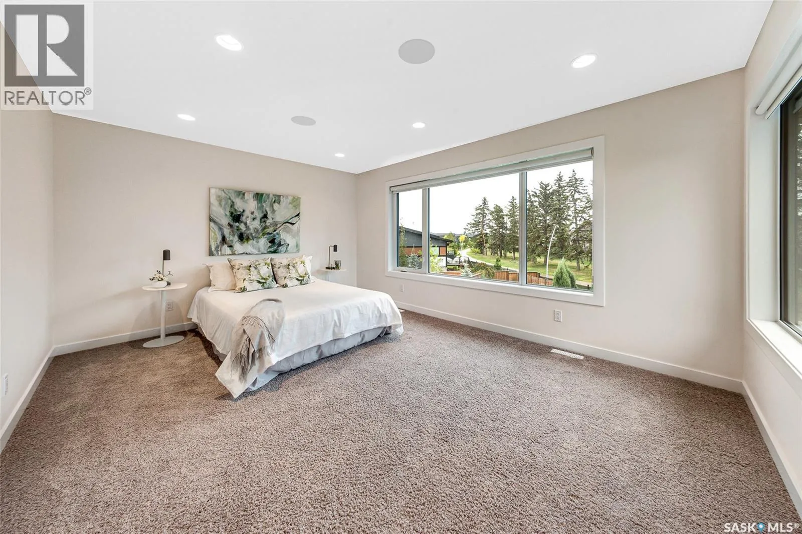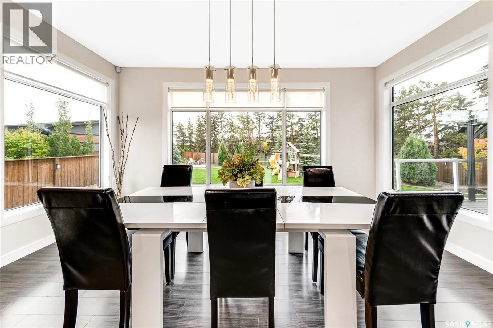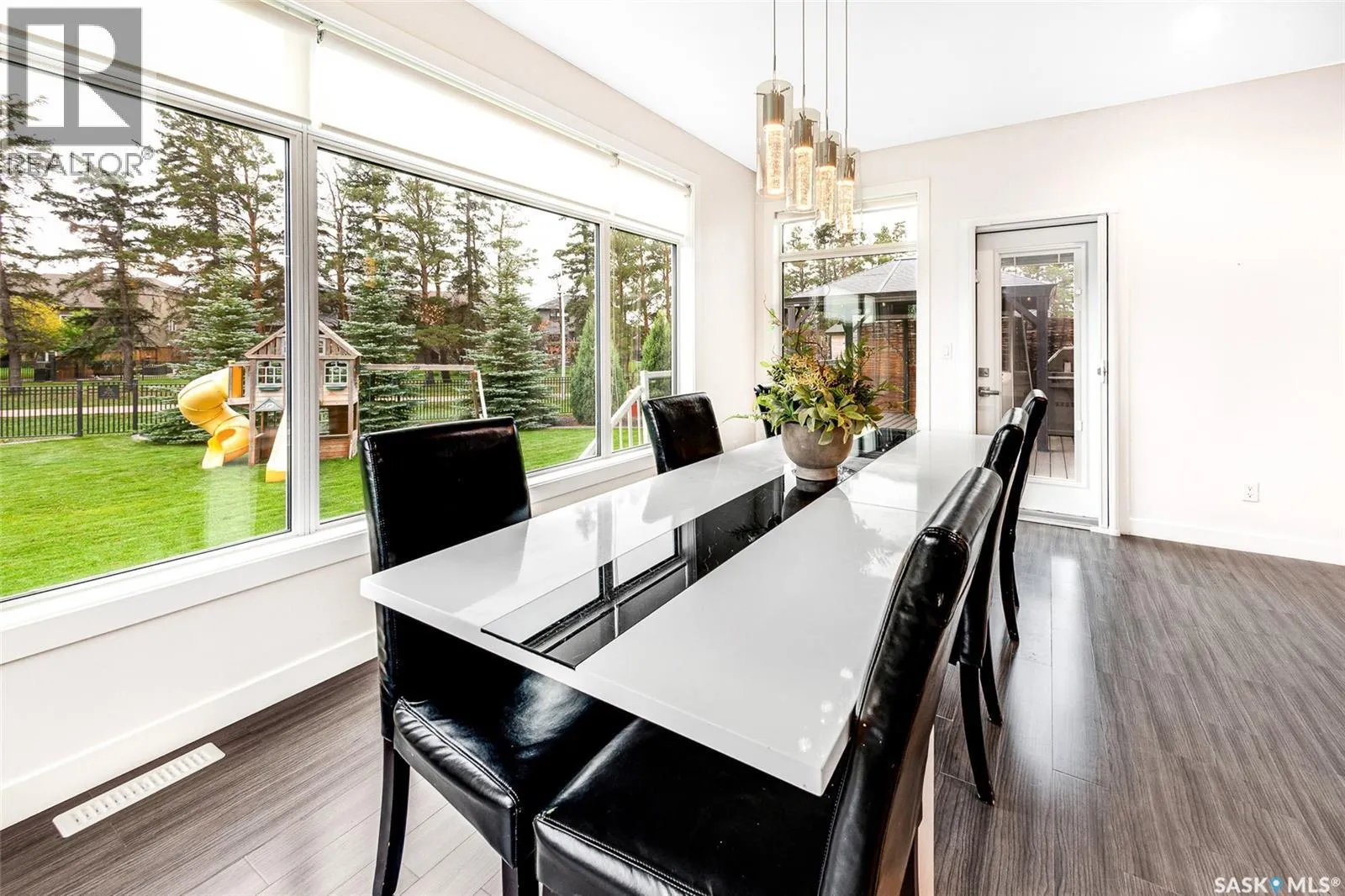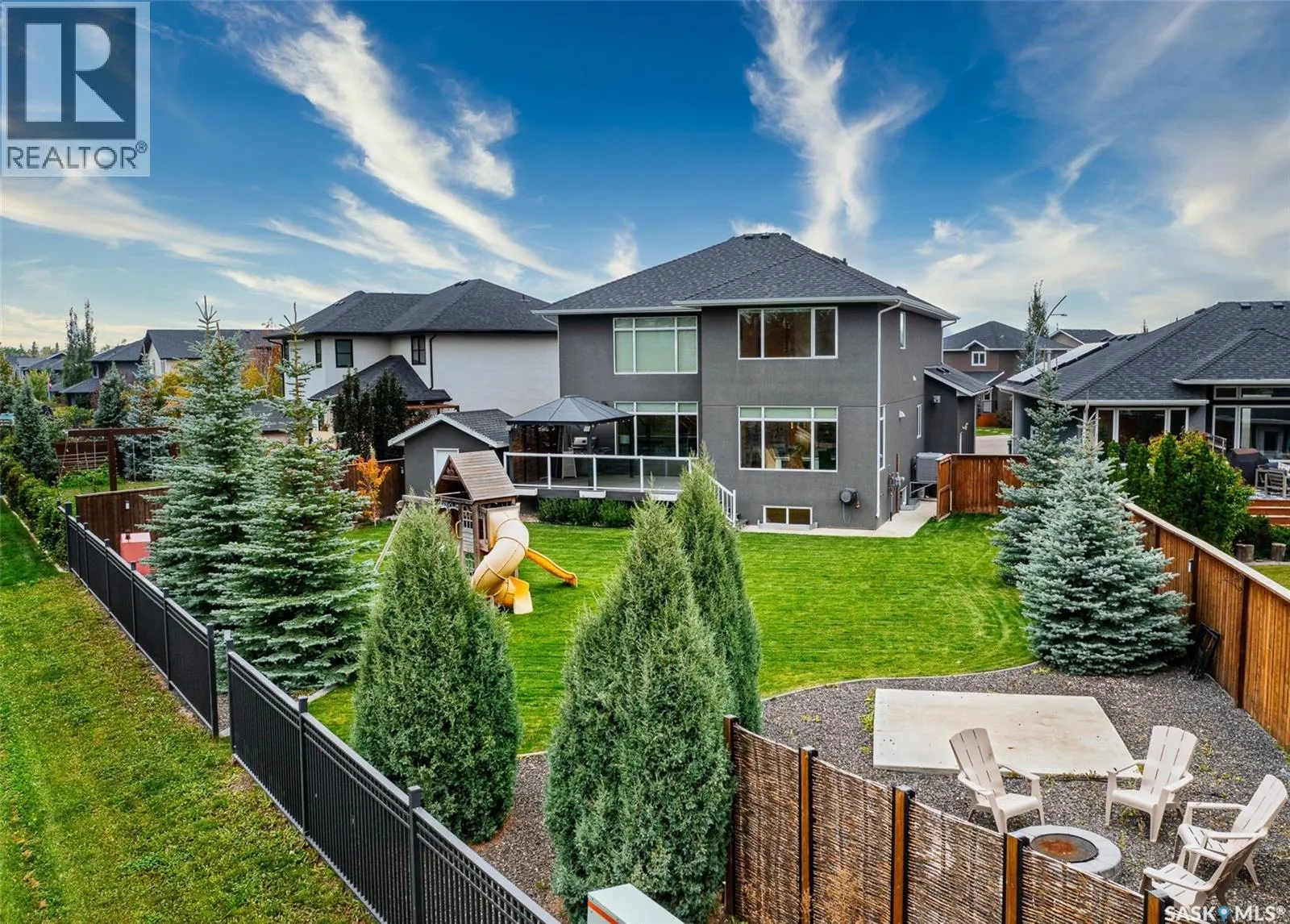 Tucked away on one of Evergreenâs most desirable crescents, this exceptional two-storey home blends luxury, function, and timeless elegance on a massive pie-shaped lot backing the walking trails lined with mature Scots pine trees. From the striking curb appeal to the timeless finishes and extensive list of custom upgrades, every detail has been thoughtfully designed. Inside, a grand foyer leads into a living room with soaring ceilings and expansive windows that fill the space with natural light. At the heart of the home, the gourmet kitchen showcases Redl custom cabinetry, built-in Miele dual ovens with induction cooktop, quartz countertops, tile backsplash, and a large island with additional seating, seamlessly connected to the dining area overlooking the private backyard. The main floor also offers a dedicated office, a 2-piece bath, and a mudroom with direct access to the oversized heated staggered bay garage ( 28â x 22â/26â) with 220v plug and hot/cold water taps. Upstairs, four spacious bedrooms await, including a luxurious primary suite with a custom walk-in closet and a spa-inspired ensuite featuring a jetted tub and steam showerâthe perfect retreat after a long day. A full bathroom and convenient second-floor laundry complete this level. The fully developed basement adds versatility with a large family room and games area, a fifth bedroom, 4-piece bath, storage, mechanical room, and a future wet bar nook. Notable extras include central AC, HRV, HEPA air filter, âhide-a-hoseâ central vac, Control4 audio with built-in speakers throughout, and more. Outside, the expansive backyard offers endless potential for entertaining, a future pool, or simply enjoying the serenity of your private outdoor escape. Ideally situated near the Forestry Farm and zoo, an array of amenities, school bus pick up, elementary and high schools, this rare property offers the perfect balance of comfort and lifestyle in one of Saskatoonâs most coveted neighbourhoods. (id:27476)