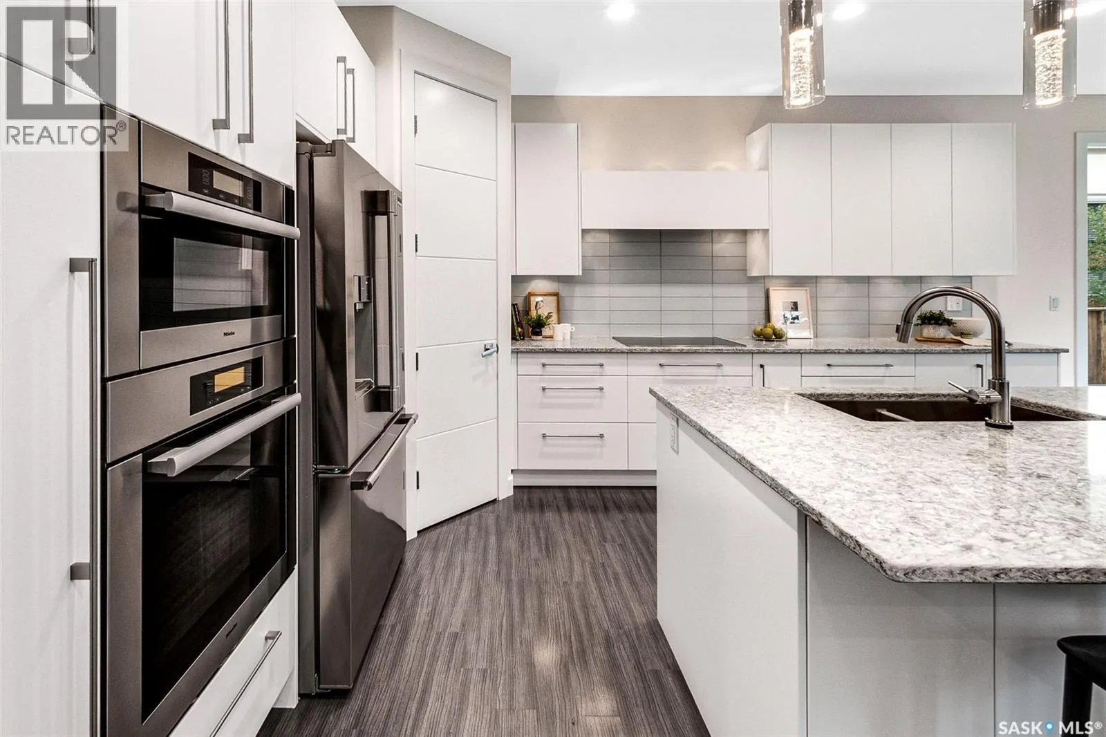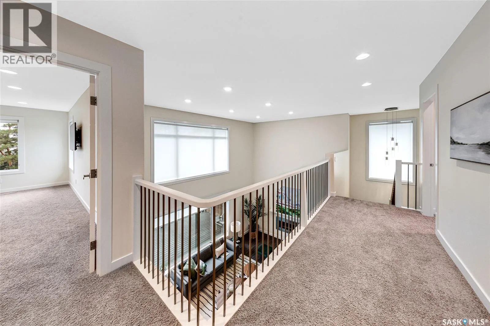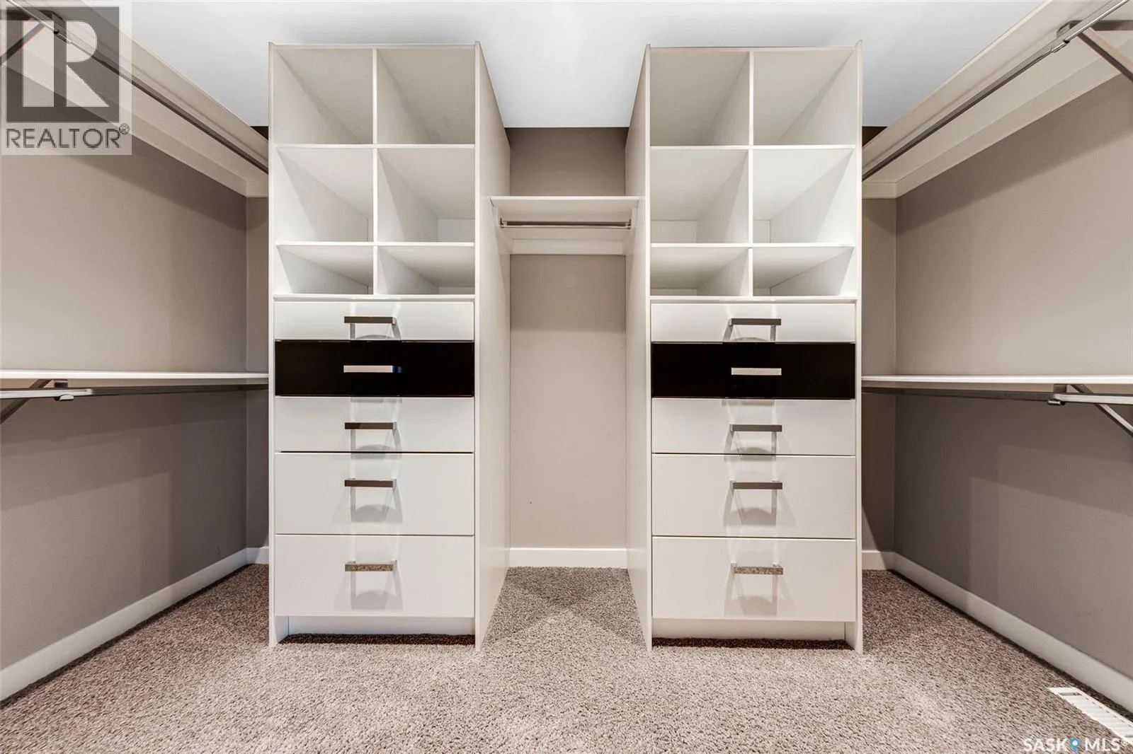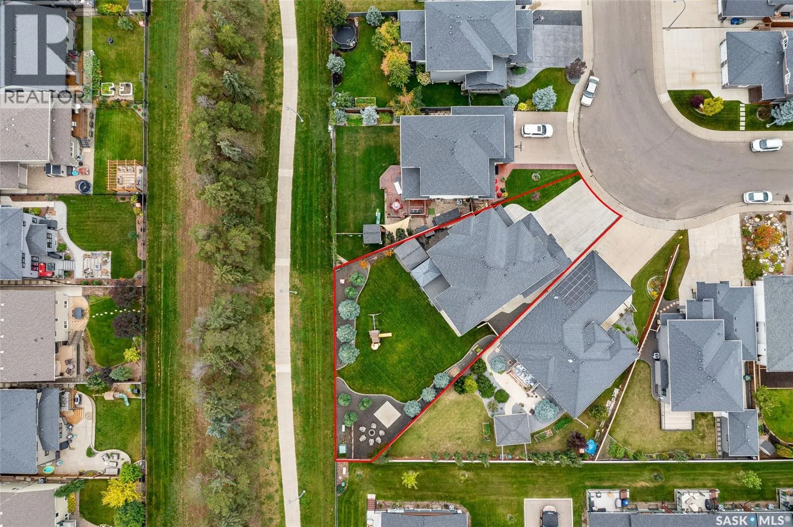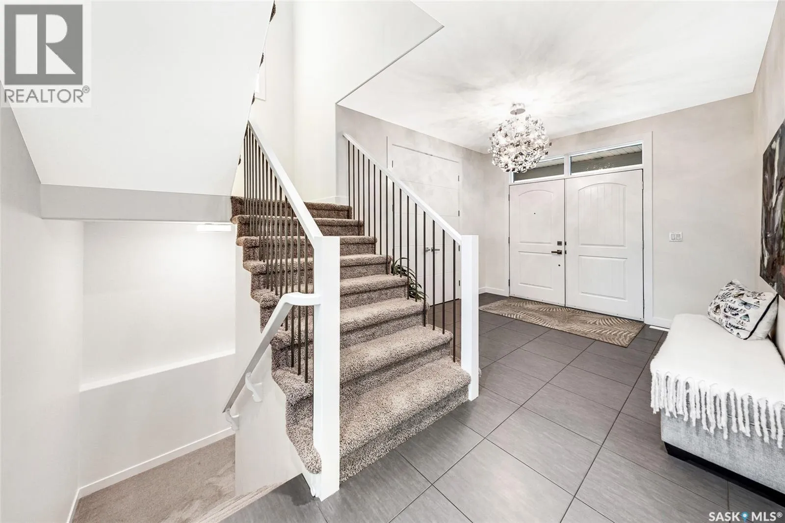 Tucked away on one of Evergreenâs most desirable crescents, this exceptional two-storey home blends luxury, function, and timeless elegance on a massive pie-shaped lot backing the walking trails lined with mature Scots pine trees. From the striking curb appeal to the timeless finishes and extensive list of custom upgrades, every detail has been thoughtfully designed. Inside, a grand foyer leads into a living room with soaring ceilings and expansive windows that fill the space with natural light. At the heart of the home, the gourmet kitchen showcases Redl custom cabinetry, built-in Miele dual ovens with induction cooktop, quartz countertops, tile backsplash, and a large island with additional seating, seamlessly connected to the dining area overlooking the private backyard. The main floor also offers a dedicated office, a 2-piece bath, and a mudroom with direct access to the oversized heated staggered bay garage ( 28â x 22â/26â) with 220v plug and hot/cold water taps. Upstairs, four spacious bedrooms await, including a luxurious primary suite with a custom walk-in closet and a spa-inspired ensuite featuring a jetted tub and steam showerâthe perfect retreat after a long day. A full bathroom and convenient second-floor laundry complete this level. The fully developed basement adds versatility with a large family room and games area, a fifth bedroom, 4-piece bath, storage, mechanical room, and a future wet bar nook. Notable extras include central AC, HRV, HEPA air filter, âhide-a-hoseâ central vac, Control4 audio with built-in speakers throughout, and more. Outside, the expansive backyard offers endless potential for entertaining, a future pool, or simply enjoying the serenity of your private outdoor escape. Ideally situated near the Forestry Farm and zoo, an array of amenities, school bus pick up, elementary and high schools, this rare property offers the perfect balance of comfort and lifestyle in one of Saskatoonâs most coveted neighbourhoods. (id:27476)