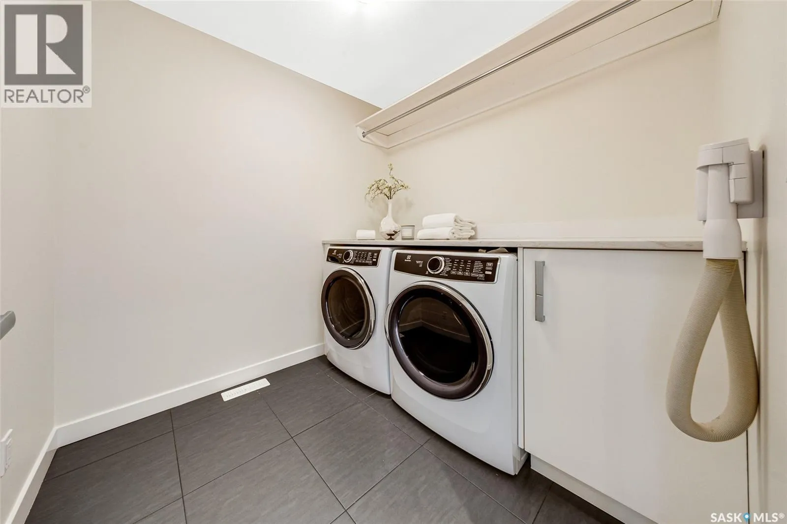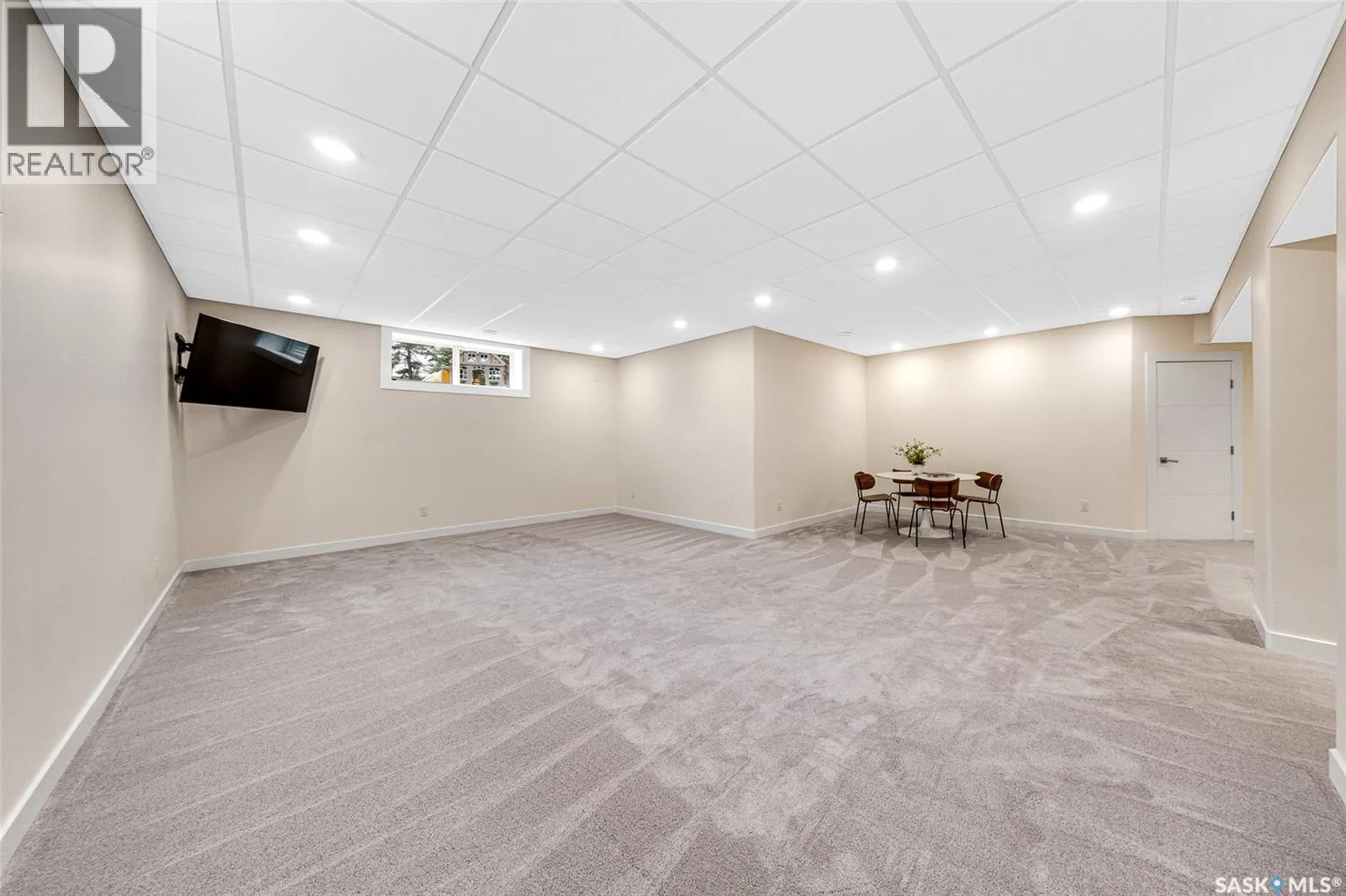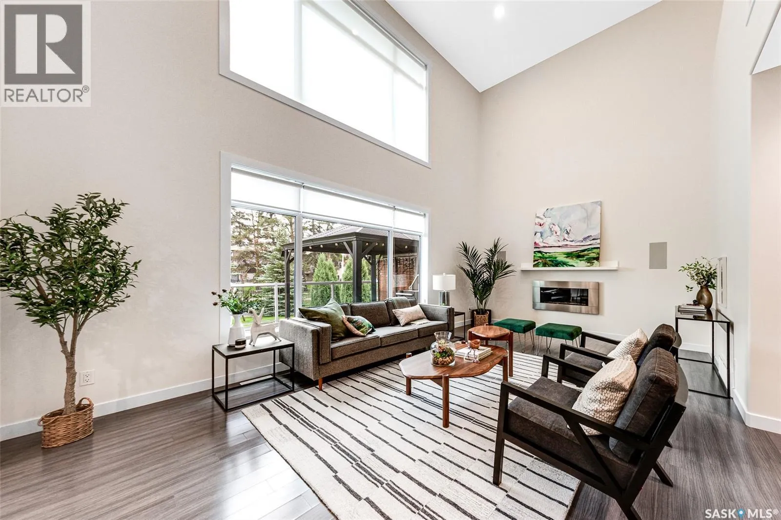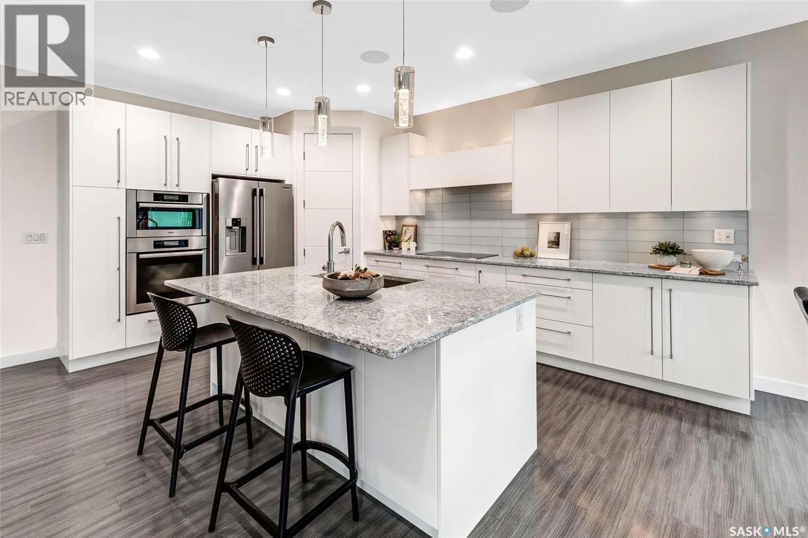 Tucked away on one of Evergreenâs most desirable crescents, this exceptional two-storey home blends luxury, function, and timeless elegance on a massive pie-shaped lot backing the walking trails lined with mature Scots pine trees. From the striking curb appeal to the timeless finishes and extensive list of custom upgrades, every detail has been thoughtfully designed. Inside, a grand foyer leads into a living room with soaring ceilings and expansive windows that fill the space with natural light. At the heart of the home, the gourmet kitchen showcases Redl custom cabinetry, built-in Miele dual ovens with induction cooktop, quartz countertops, tile backsplash, and a large island with additional seating, seamlessly connected to the dining area overlooking the private backyard. The main floor also offers a dedicated office, a 2-piece bath, and a mudroom with direct access to the oversized heated staggered bay garage ( 28â x 22â/26â) with 220v plug and hot/cold water taps. Upstairs, four spacious bedrooms await, including a luxurious primary suite with a custom walk-in closet and a spa-inspired ensuite featuring a jetted tub and steam showerâthe perfect retreat after a long day. A full bathroom and convenient second-floor laundry complete this level. The fully developed basement adds versatility with a large family room and games area, a fifth bedroom, 4-piece bath, storage, mechanical room, and a future wet bar nook. Notable extras include central AC, HRV, HEPA air filter, âhide-a-hoseâ central vac, Control4 audio with built-in speakers throughout, and more. Outside, the expansive backyard offers endless potential for entertaining, a future pool, or simply enjoying the serenity of your private outdoor escape. Ideally situated near the Forestry Farm and zoo, an array of amenities, school bus pick up, elementary and high schools, this rare property offers the perfect balance of comfort and lifestyle in one of Saskatoonâs most coveted neighbourhoods. (id:27476)