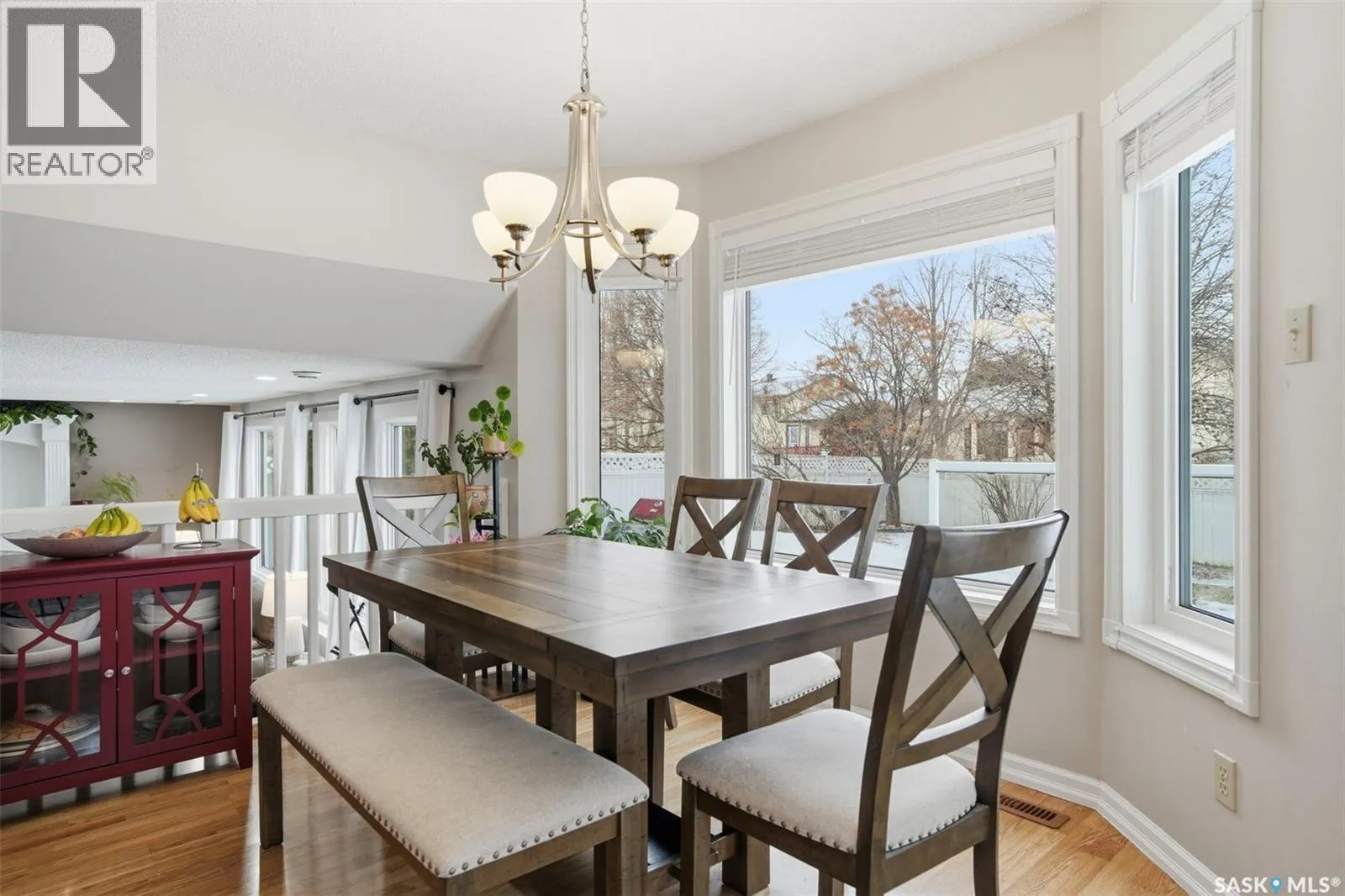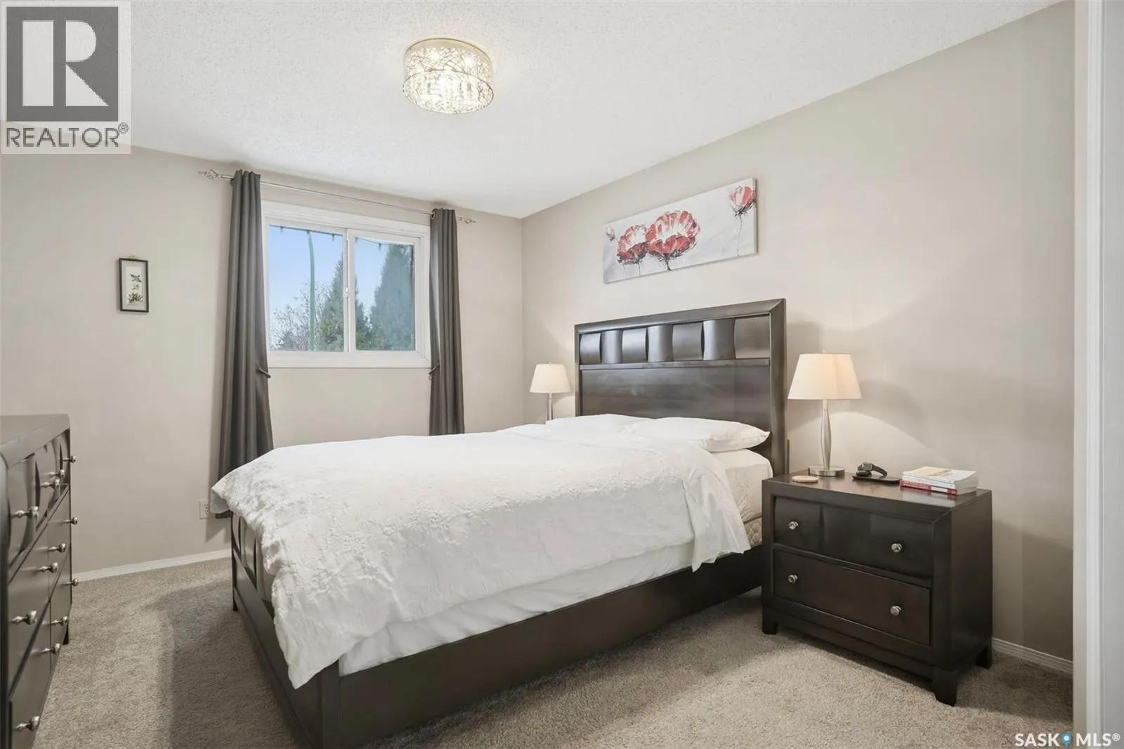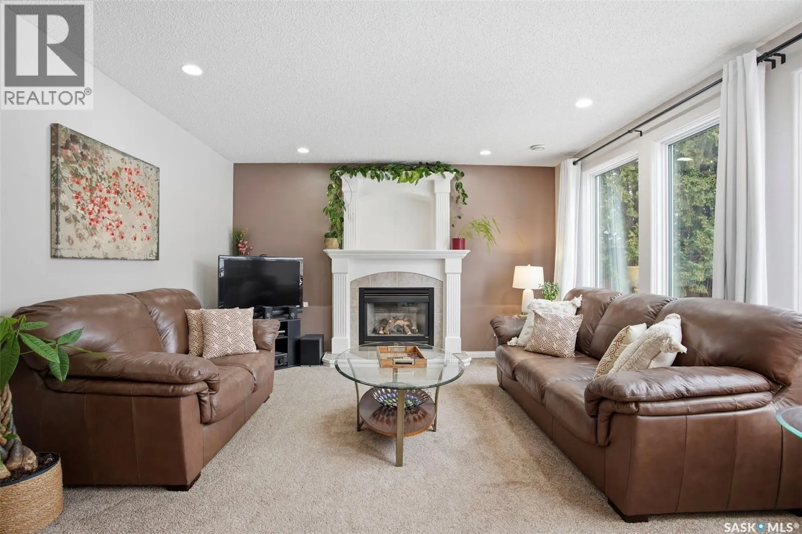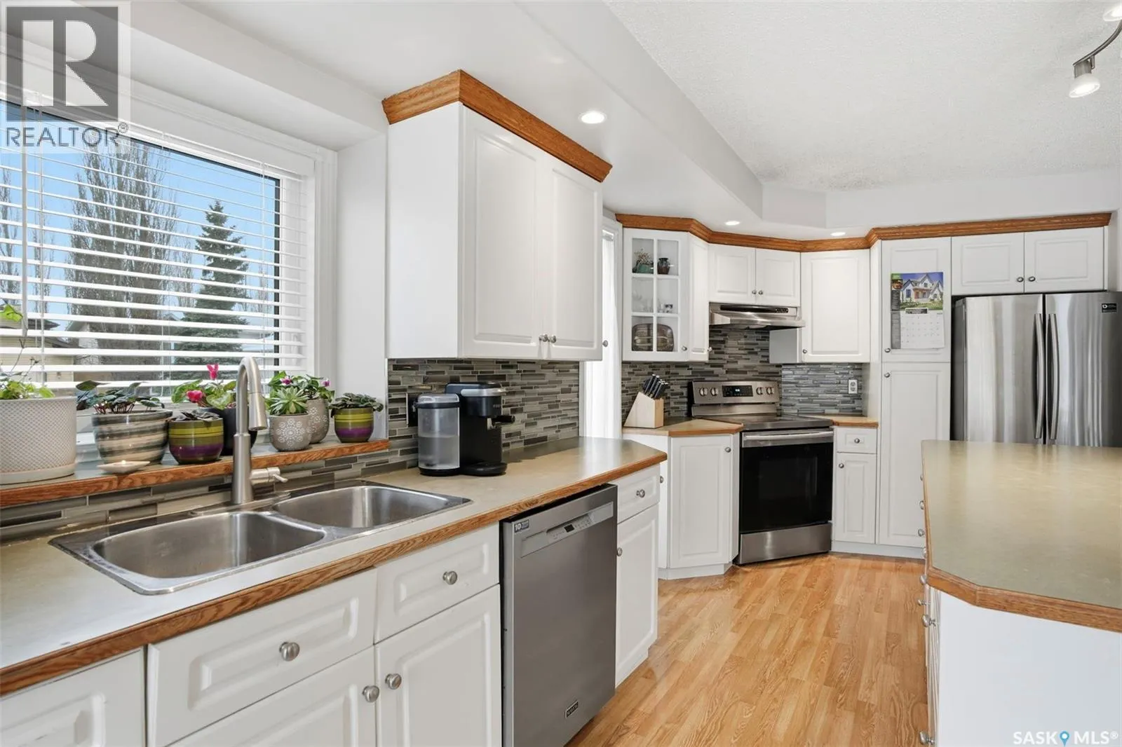 Welcome to 438 Cowley Place, a fantastic family home in a beautiful inner cul-de-sac setting within Erindale. This picturesque and family-friendly location is just a 5min walk of neighbourhood schools, parks and the lake - amenities that make the neighbourhood so deeply sought after. The 4-bedroom/2-bathroom home is filled with natural light and offers a spacious floor plan over 4 levels. Comfortable living spaces, a generous kitchen with large peninsula, open lines throughout the home for entertaining, and phenomenal window wall designs on the main and 3rd levels are each highlighting features of the property. Stunning 5ft windows offer east views of the rear yard and make for especially enjoyable spaces in the formal dining area and lower family room to gather, relax or unwind any time of day. 3 bedrooms on the 2nd level feature updated carpet floor coverings, windows, lighting and walk-in closet amenities in the primary bedroom. The 3rd level features a gorgeous âstep-downâ family room with pot lighting, upgraded floor coverings & picture windows, and a natural gas fireplace, a 4th bedroom, 3-pc bathroom, and direct entry to the double (insulated) garage. The 4th level offers good home storage and laundry area, and the opportunity to shape a 5th bedroom, den/studio space, and/or a 3rd family area to suit. Take pleasure in the professionally landscaped yard, with a timber deck, lower patio, fire pit area, gardens, and a gorgeous array of shade and ornamental tree varieties that provide a lovely greenery and sense of privacy to the yard-scape. Equipped with central A/C, other notable home features and updates include those to shingles, underground sprinklers, overhead garage door, and window coverings throughout. Located within a 15min bicycle ride of Cliff Wright Public Library, the Sasktel Soccer Center, St Joseph & Centennial high schools, University Heights eateries, coffee shops and shopping, and Forest Park soccer pitches, tennis courts, and playground. (id:27476)