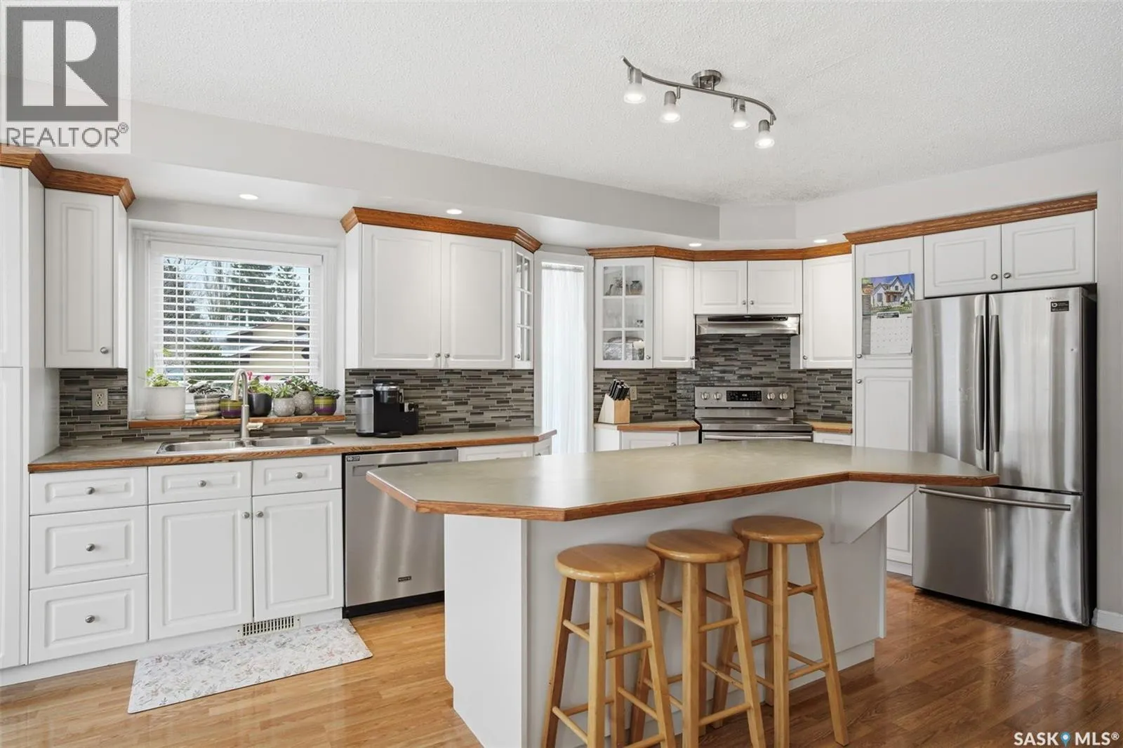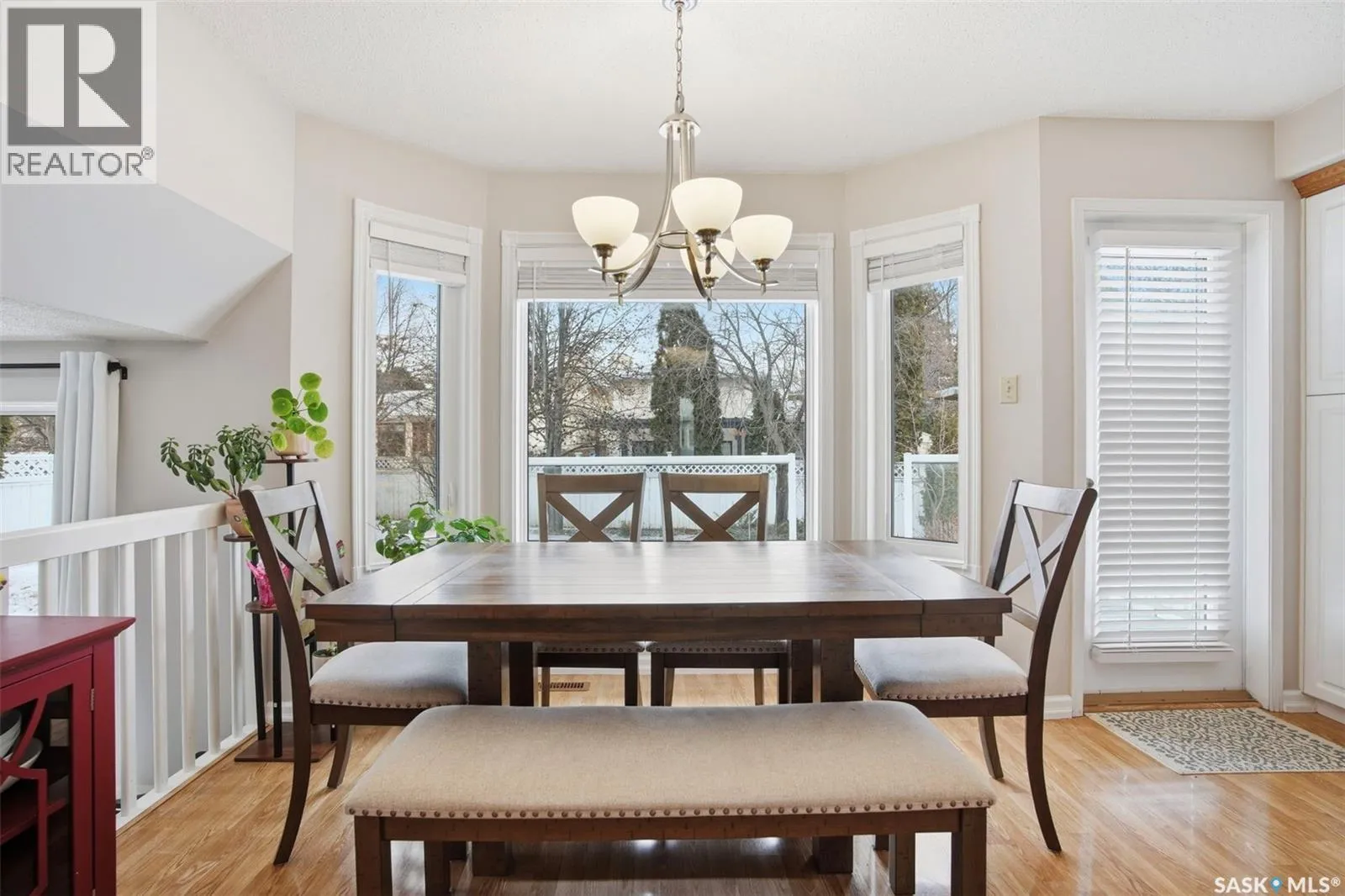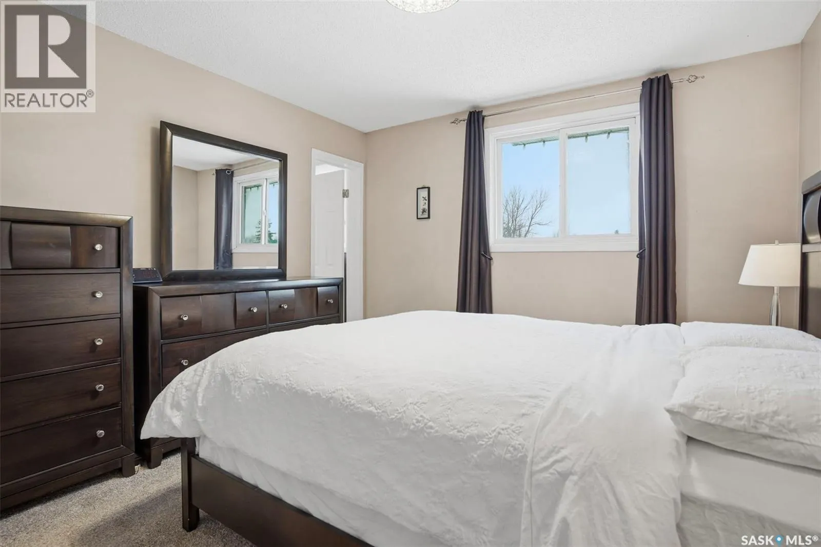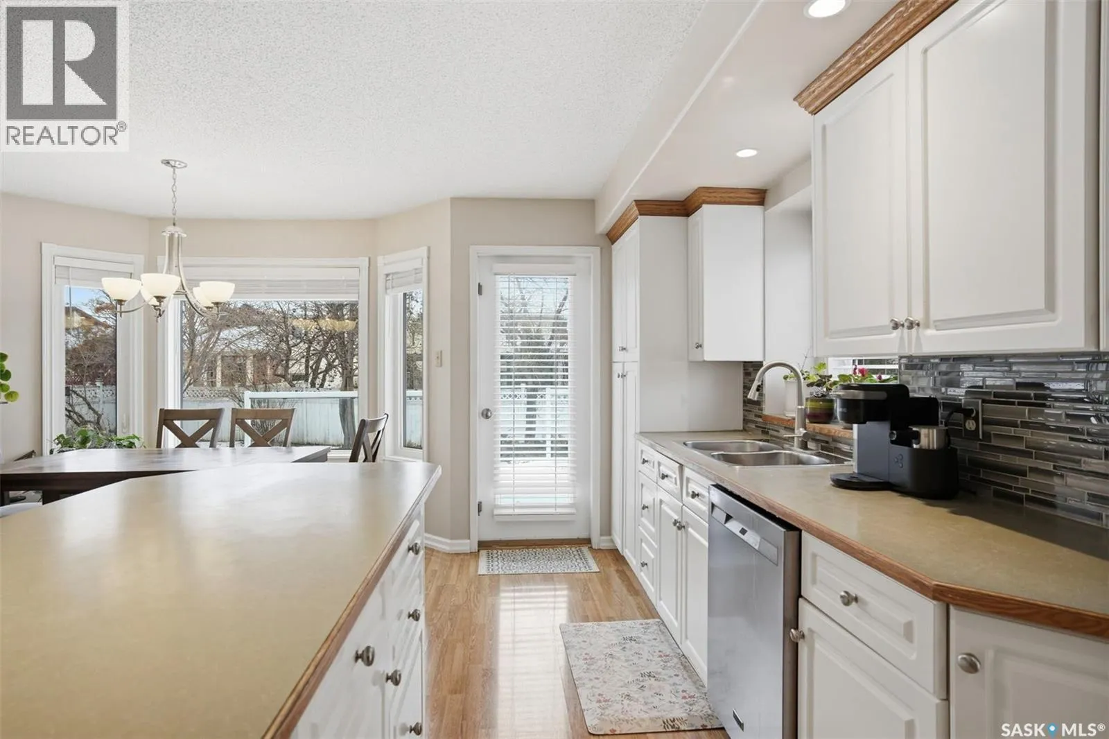 Welcome to 438 Cowley Place, a fantastic family home in a beautiful inner cul-de-sac setting within Erindale. This picturesque and family-friendly location is just a 5min walk of neighbourhood schools, parks and the lake - amenities that make the neighbourhood so deeply sought after. The 4-bedroom/2-bathroom home is filled with natural light and offers a spacious floor plan over 4 levels. Comfortable living spaces, a generous kitchen with large peninsula, open lines throughout the home for entertaining, and phenomenal window wall designs on the main and 3rd levels are each highlighting features of the property. Stunning 5ft windows offer east views of the rear yard and make for especially enjoyable spaces in the formal dining area and lower family room to gather, relax or unwind any time of day. 3 bedrooms on the 2nd level feature updated carpet floor coverings, windows, lighting and walk-in closet amenities in the primary bedroom. The 3rd level features a gorgeous âstep-downâ family room with pot lighting, upgraded floor coverings & picture windows, and a natural gas fireplace, a 4th bedroom, 3-pc bathroom, and direct entry to the double (insulated) garage. The 4th level offers good home storage and laundry area, and the opportunity to shape a 5th bedroom, den/studio space, and/or a 3rd family area to suit. Take pleasure in the professionally landscaped yard, with a timber deck, lower patio, fire pit area, gardens, and a gorgeous array of shade and ornamental tree varieties that provide a lovely greenery and sense of privacy to the yard-scape. Equipped with central A/C, other notable home features and updates include those to shingles, underground sprinklers, overhead garage door, and window coverings throughout. Located within a 15min bicycle ride of Cliff Wright Public Library, the Sasktel Soccer Center, St Joseph & Centennial high schools, University Heights eateries, coffee shops and shopping, and Forest Park soccer pitches, tennis courts, and playground. (id:27476)