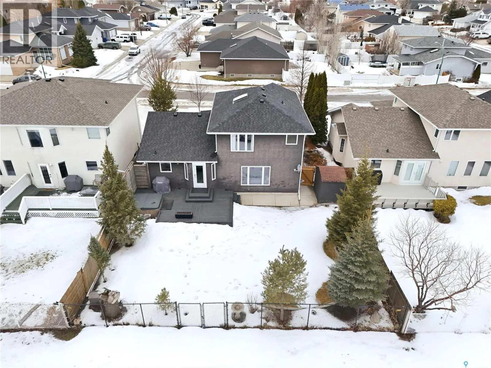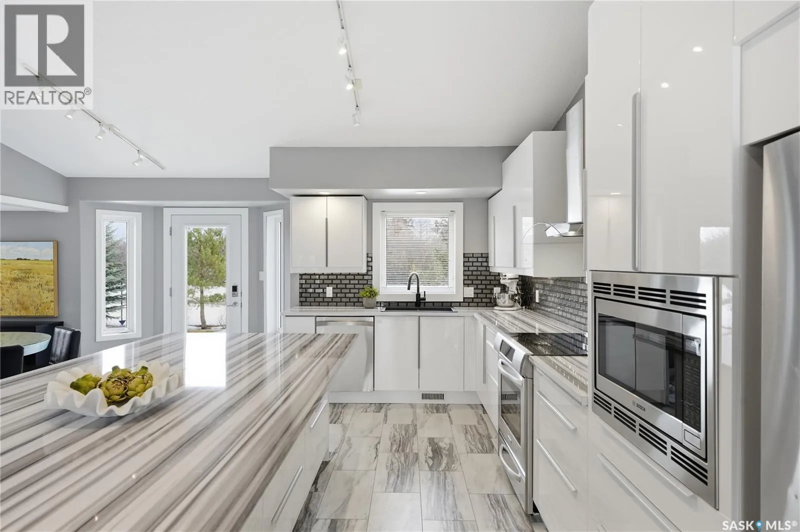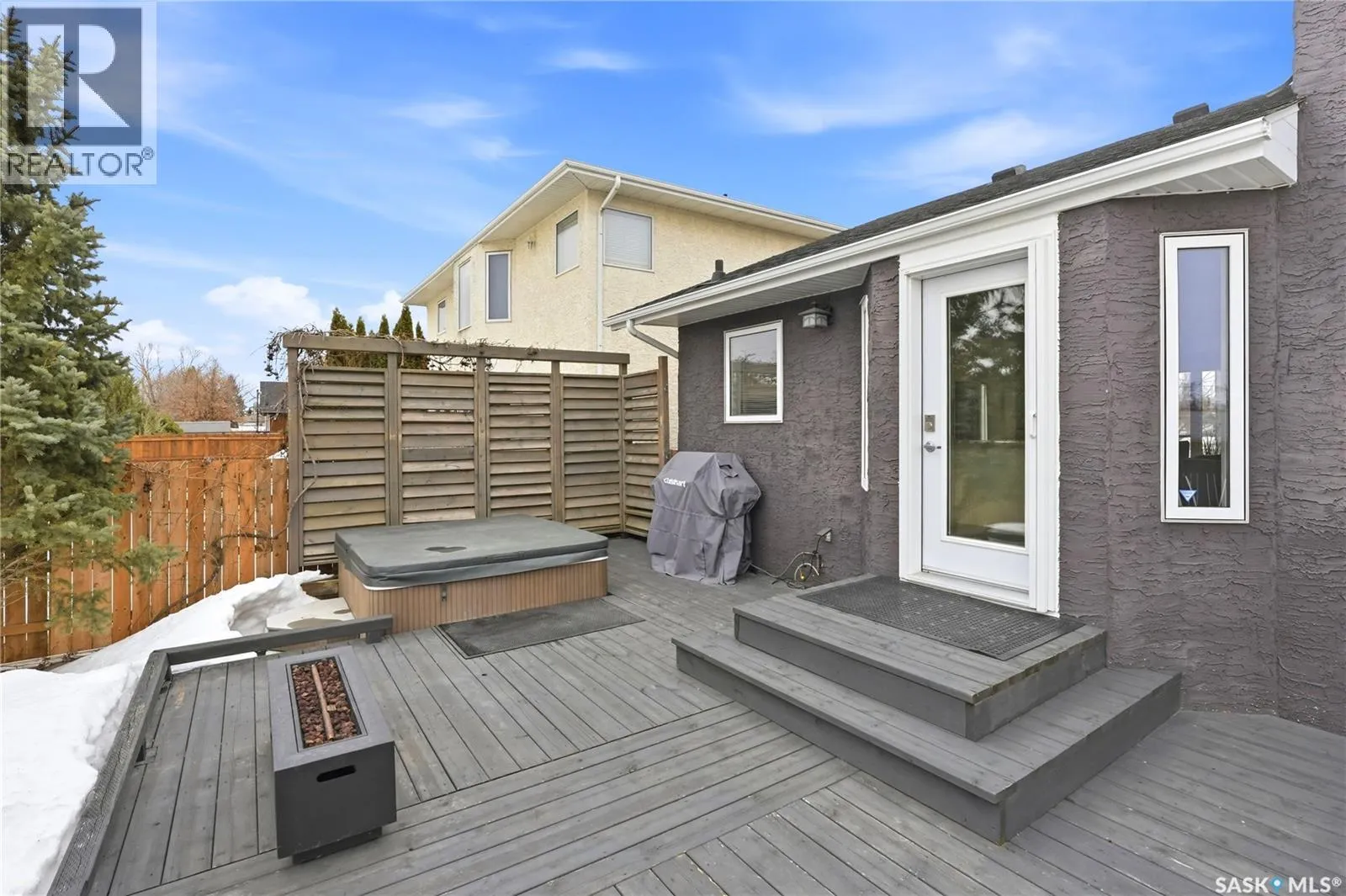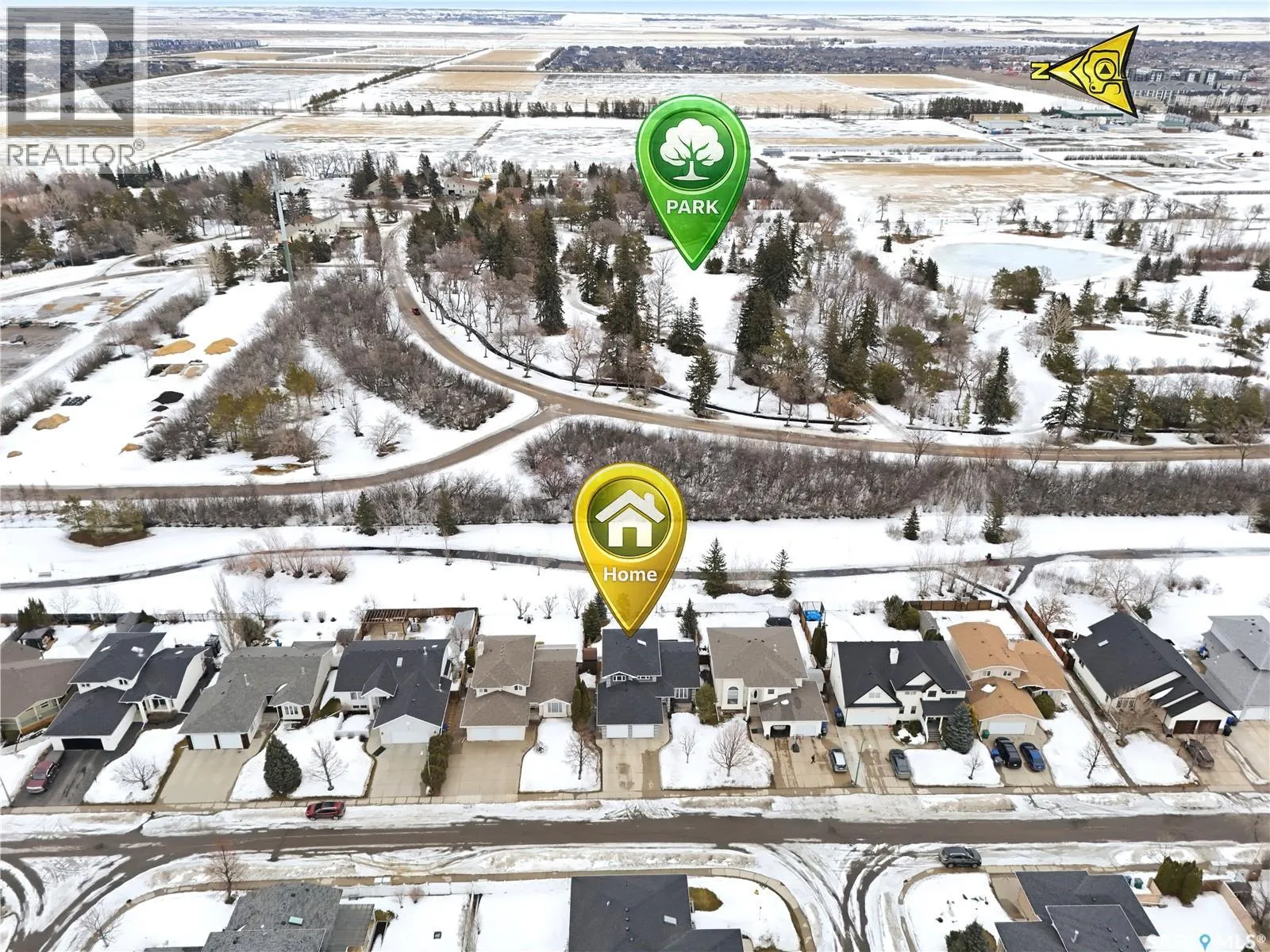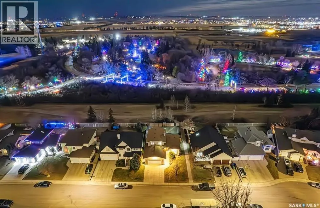 At dawn, the sky above Silverspring turns shades of pink and amber; say good morning to daily sunrises from your future home! (you might need a dedicated album in your photo folder). They say location is everything, and this one is the ultimate forever spot. An arboreal backdrop sits behind this two-storey home. Inside, wide open Euro-inspried living built with the chef and entertainer in mind. The kitchen has really earned its title as the heart of the home; with an over abundance of high-gloss white cabinetry, vaulted ceilings, a not-so-subtle island, tile backsplash, stainless appliances, and a dedicated beverage bar. The living room with decorative built-inâs, gas fireplace, and rear windows that frame the treeline in every season. Main floor laundry and one bedroom tucked away near the three-piece bathroom; perfect for that home office or aging parent. Upstairs, the primary bedroom brings infinite treetop views. The ensuite offers a jetted soaker tub, and a walk-in closet that feels like a boutique. Two more bedrooms and a full bathroom round out the second floor. The basement includes a spacious family room, tiled fitness/games area, an oversized guest bedroom, tranquil three-piece bathroom, and impressive storage. The panoramic yard with mature landscaping, large deck, hot tub and privacy screens; made for evenings with a glass in hand. Beyond the fence, the interconnected Forestry Farm trails wind through the treed landscape. Birdsong and fragrant blooms fill the air. In winter, when the trees go bare, the glow of the Enchanted Forest illuminates the snowy backdrop. 5 bedrooms, 4 bathrooms, heated double attached garage, 1,932 SF, A/C, central vacâ¦oh and did we mention the view? Endless options for walking, including the Meewasin Valley trails, South Saskatchewan River access, 5 minute walk to Silverspring Elementary School, 10 minute walk to the High School, a quick drive to grocery stores, restaurants, Preston Crossing and other amenities. As per the Sellerâs direction, all offers will be presented on 04/02/2026 4:00PM. (id:27476)