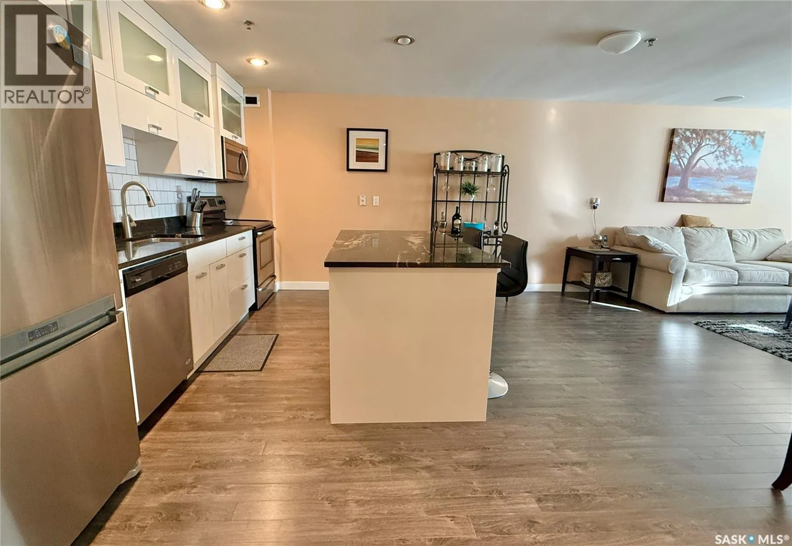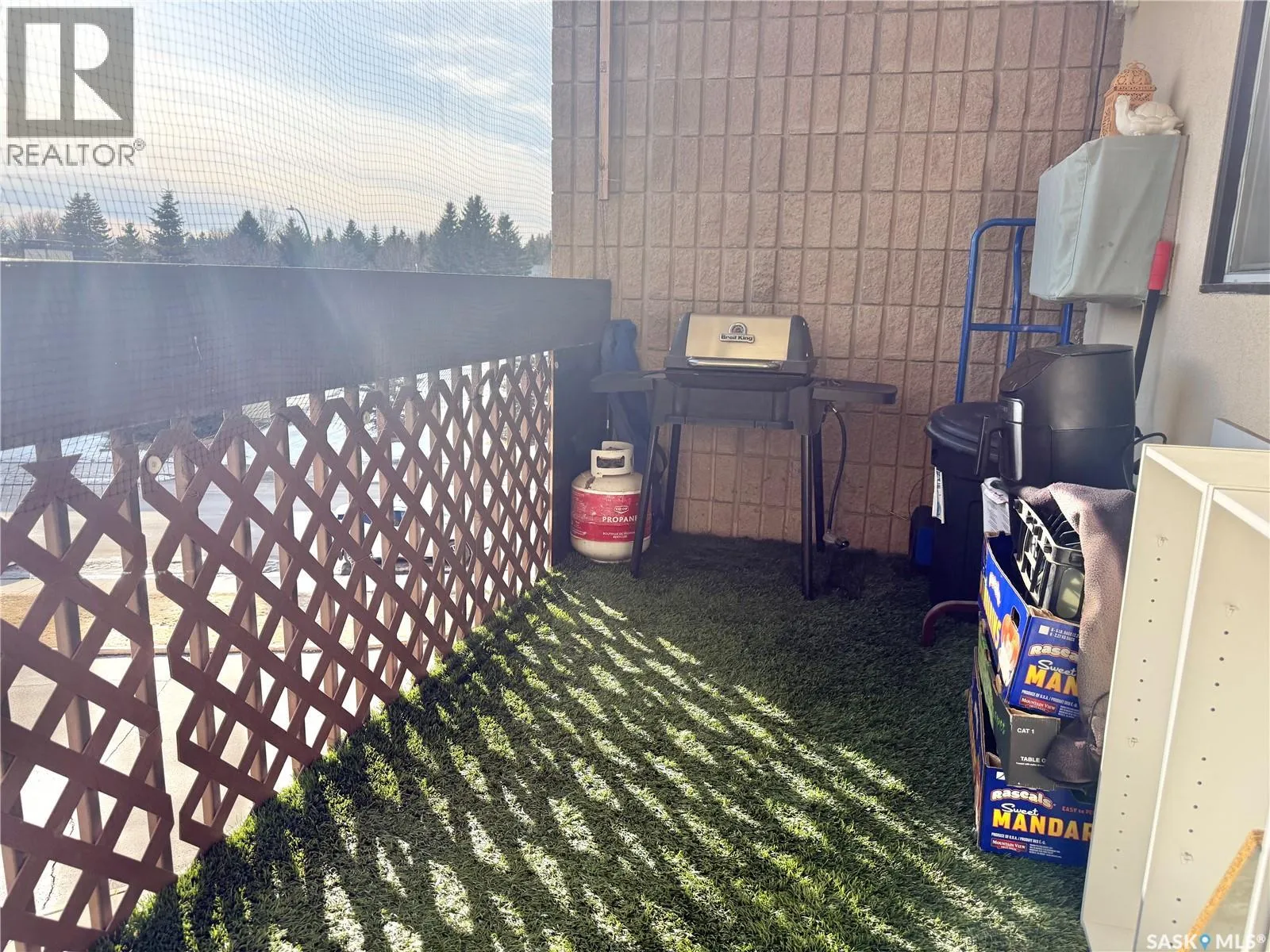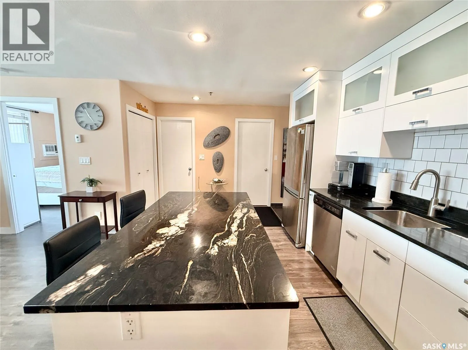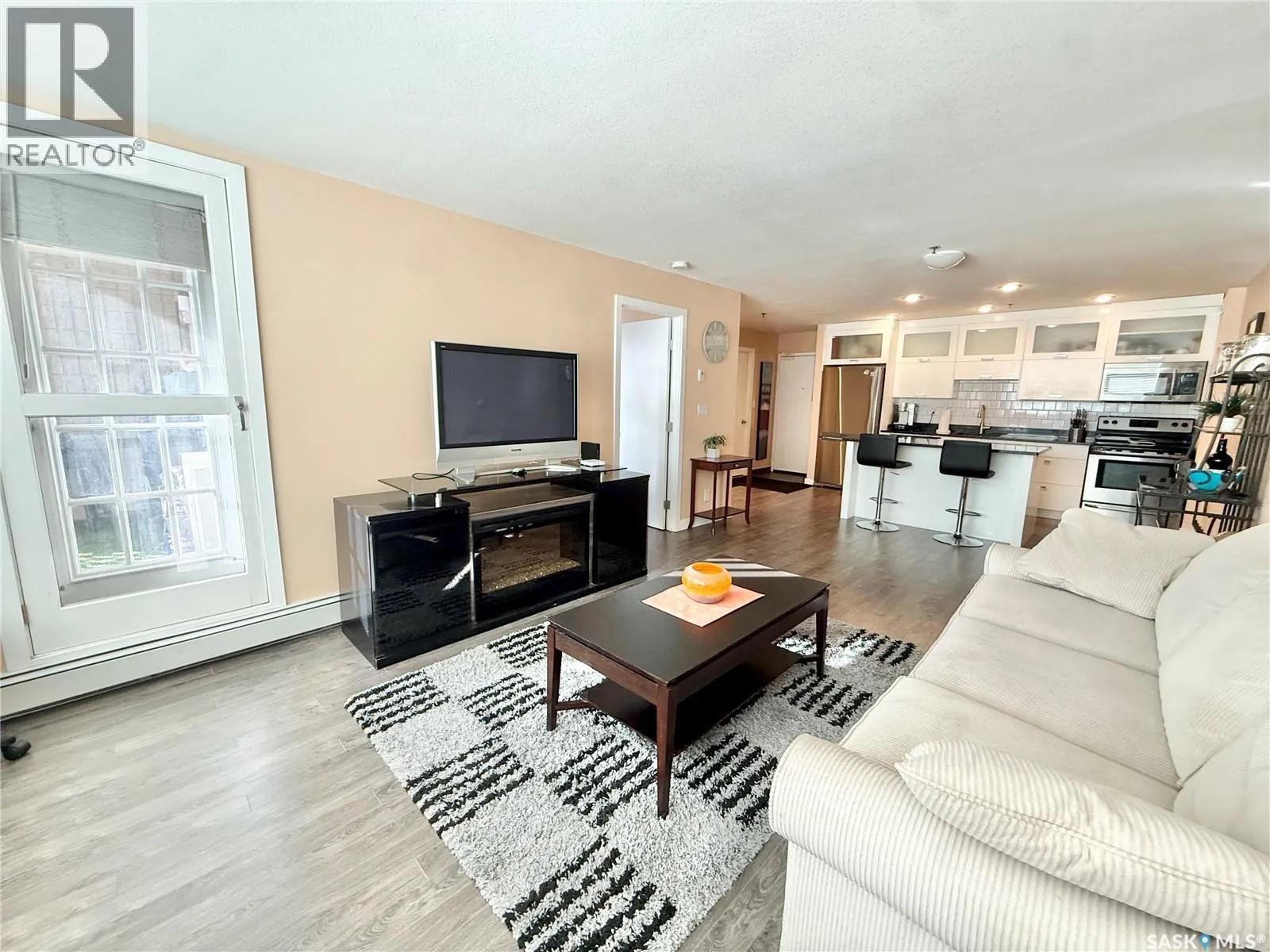 Welcome to this beautiful 1-bedroom, 1-bath condo in the highly desirable Genesee View building in Lawson Heights. Right on the edge of River Heights. Just a short walk to the river and all amenities, this updated unit features a modern white kitchen with sleek dark quartz countertops and a spacious island perfect for entertaining. Ample cupboard space and stainless steel appliances are included. The home boasts stylish laminate and tile flooring, while the bright, south-facing living room offers a cozy spot to enjoy the glass fireplace/TV stand that can stay. The bedroom comes with a queen bed, high-quality mattress, and modern white wardrobe, all of which can remain. At the entrance, youâll find a storage area with a stacking washer/dryer and a pantry cupboard for all the extras. The south-facing balcony is screened and covered with outdoor turfâkeeping birds out and friends in. This quiet building also offers an indoor pool, hot tub, and a large recreation & amenities room for gatherings. Donât miss the chance to see this charming unit. (id:27476)