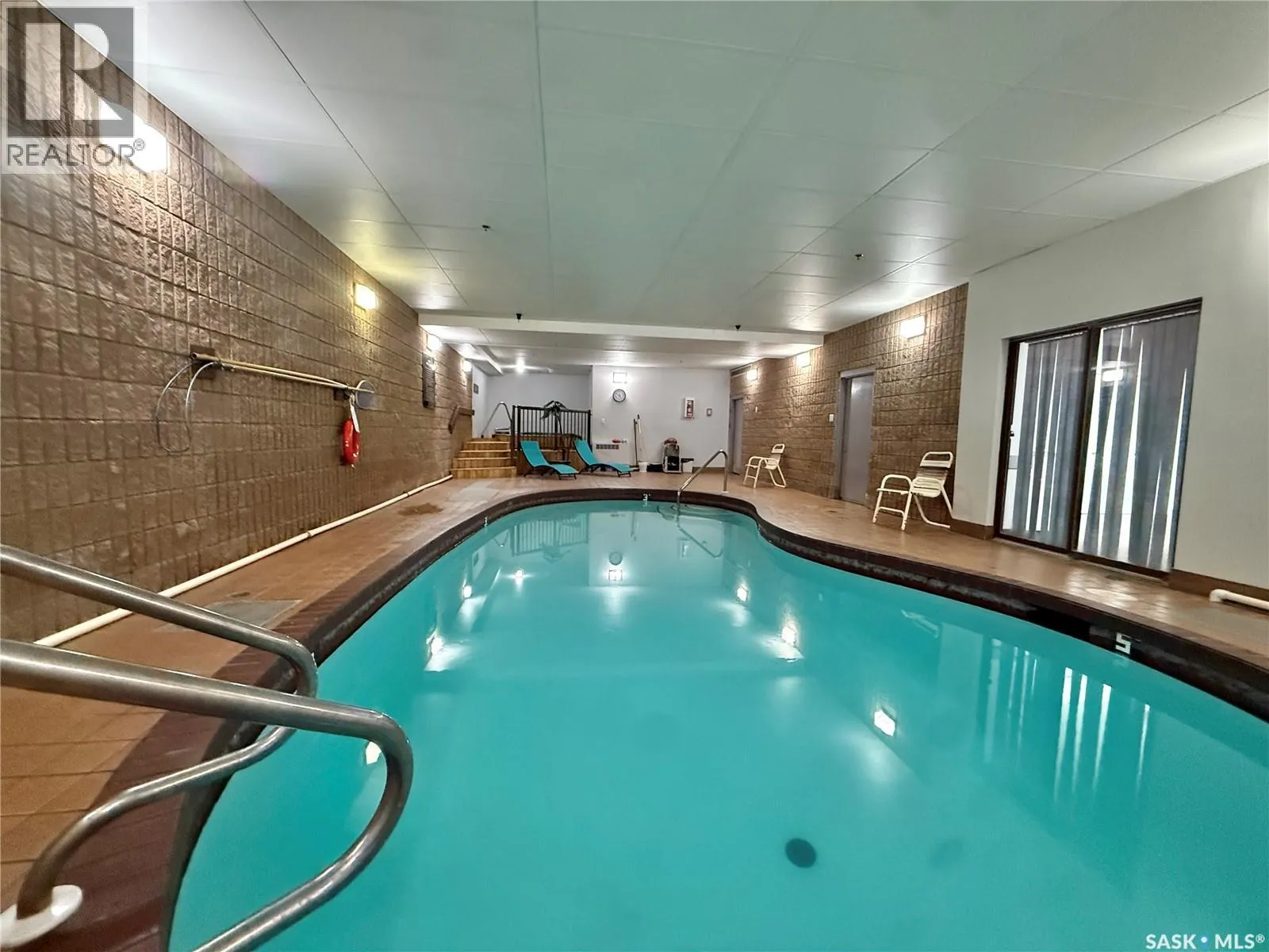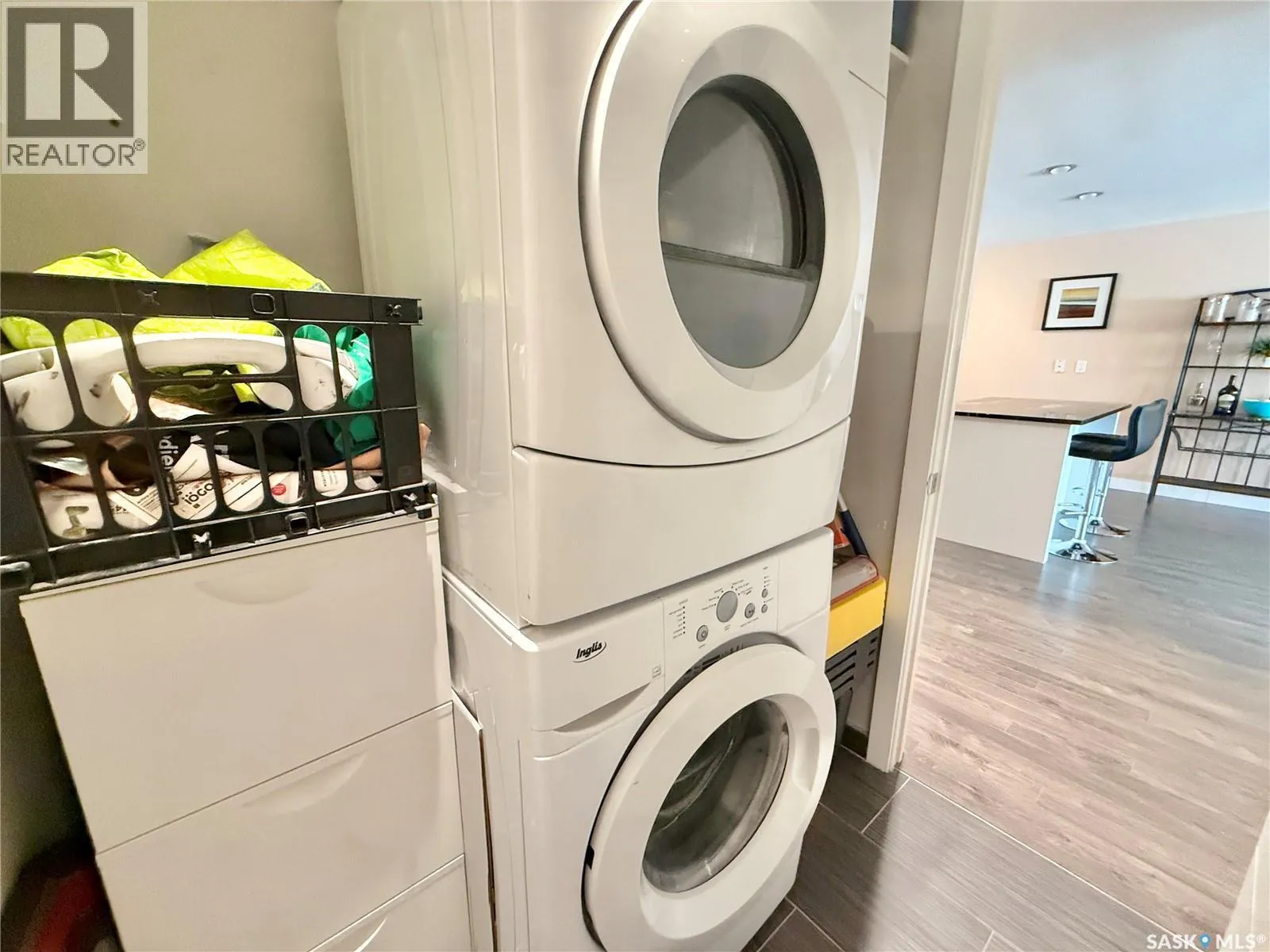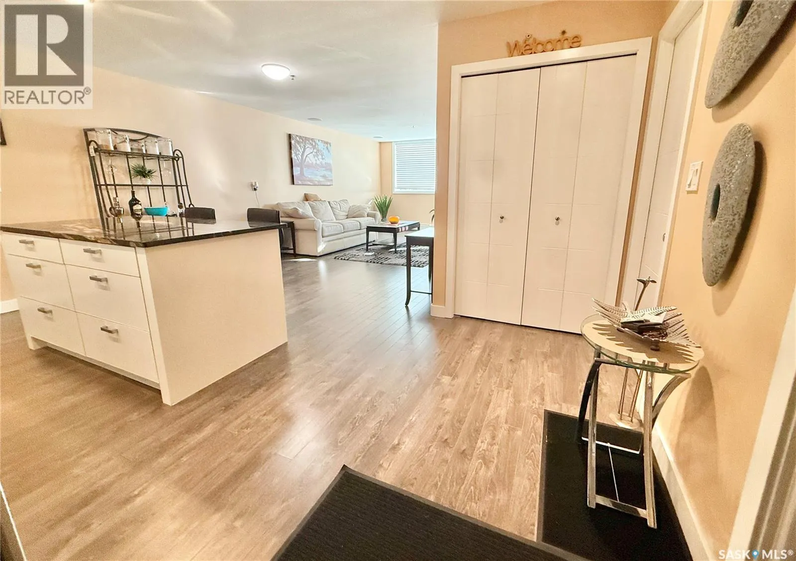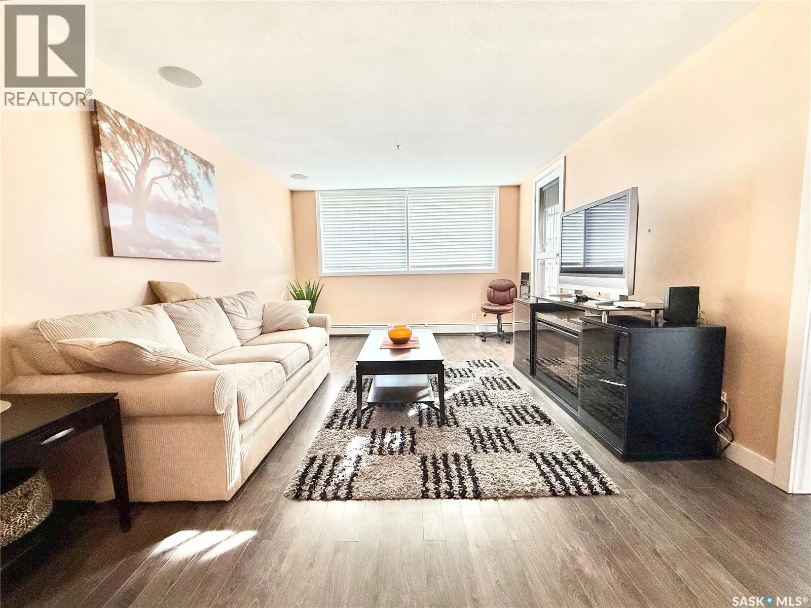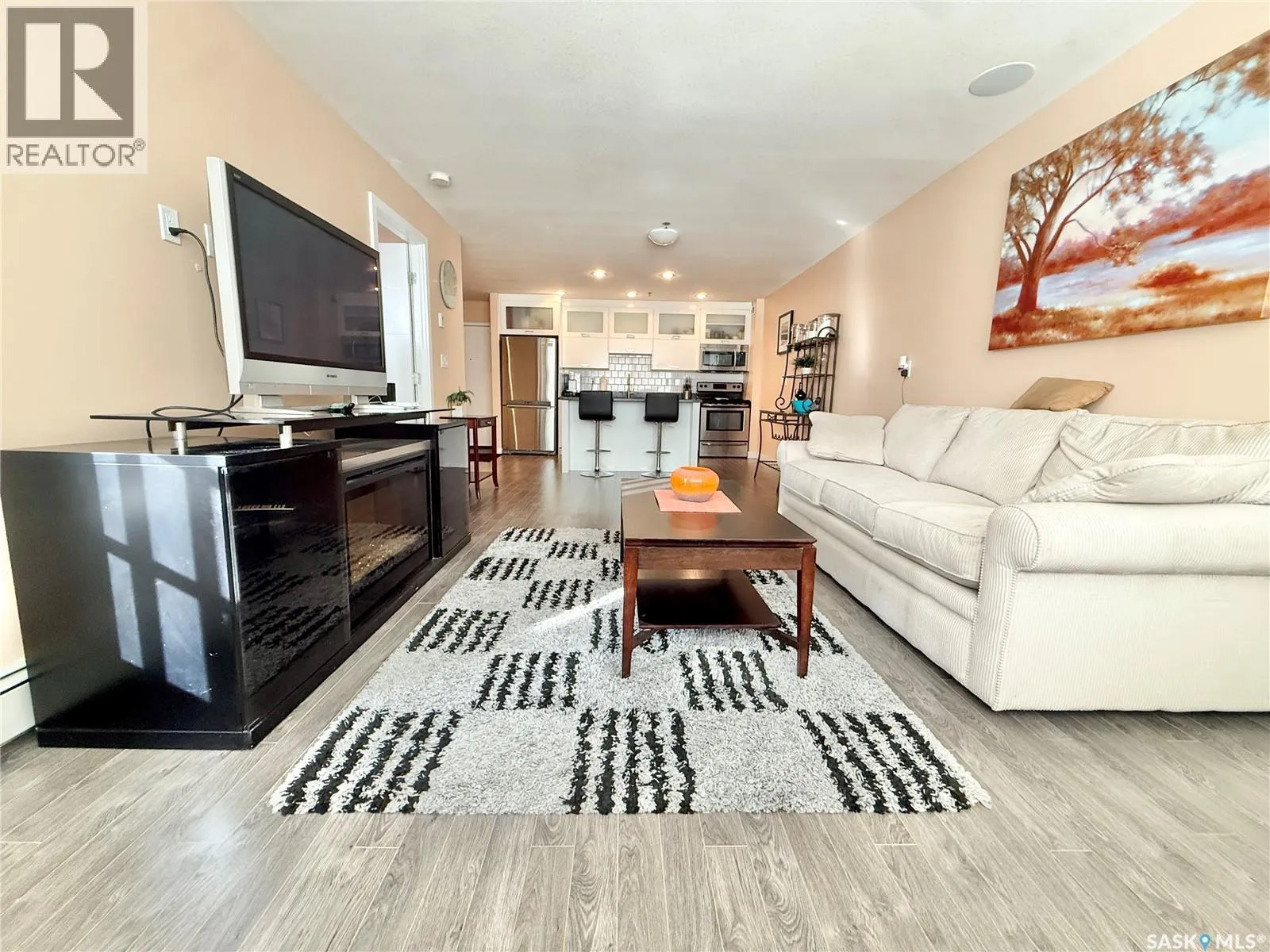 Welcome to this beautiful 1-bedroom, 1-bath condo in the highly desirable Genesee View building in Lawson Heights. Right on the edge of River Heights. Just a short walk to the river and all amenities, this updated unit features a modern white kitchen with sleek dark quartz countertops and a spacious island perfect for entertaining. Ample cupboard space and stainless steel appliances are included. The home boasts stylish laminate and tile flooring, while the bright, south-facing living room offers a cozy spot to enjoy the glass fireplace/TV stand that can stay. The bedroom comes with a queen bed, high-quality mattress, and modern white wardrobe, all of which can remain. At the entrance, youâll find a storage area with a stacking washer/dryer and a pantry cupboard for all the extras. The south-facing balcony is screened and covered with outdoor turfâkeeping birds out and friends in. This quiet building also offers an indoor pool, hot tub, and a large recreation & amenities room for gatherings. Donât miss the chance to see this charming unit. (id:27476)