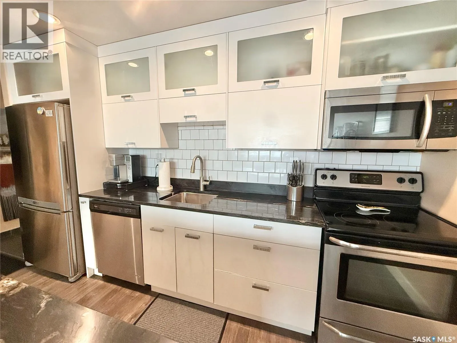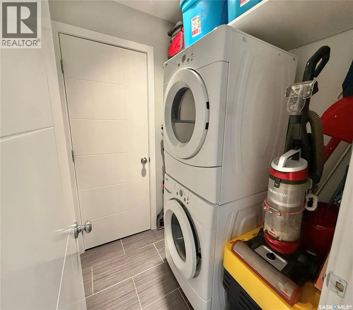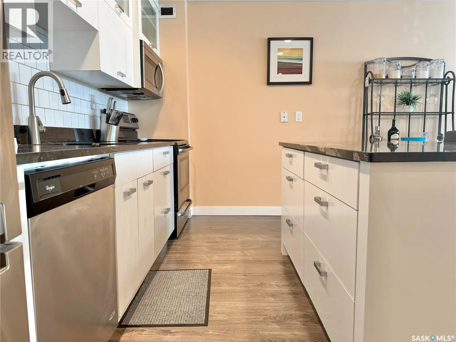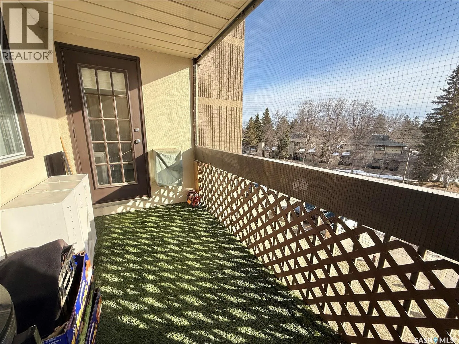 Welcome to this beautiful 1-bedroom, 1-bath condo in the highly desirable Genesee View building in Lawson Heights. Right on the edge of River Heights. Just a short walk to the river and all amenities, this updated unit features a modern white kitchen with sleek dark quartz countertops and a spacious island perfect for entertaining. Ample cupboard space and stainless steel appliances are included. The home boasts stylish laminate and tile flooring, while the bright, south-facing living room offers a cozy spot to enjoy the glass fireplace/TV stand that can stay. The bedroom comes with a queen bed, high-quality mattress, and modern white wardrobe, all of which can remain. At the entrance, youâll find a storage area with a stacking washer/dryer and a pantry cupboard for all the extras. The south-facing balcony is screened and covered with outdoor turfâkeeping birds out and friends in. This quiet building also offers an indoor pool, hot tub, and a large recreation & amenities room for gatherings. Donât miss the chance to see this charming unit. (id:27476)