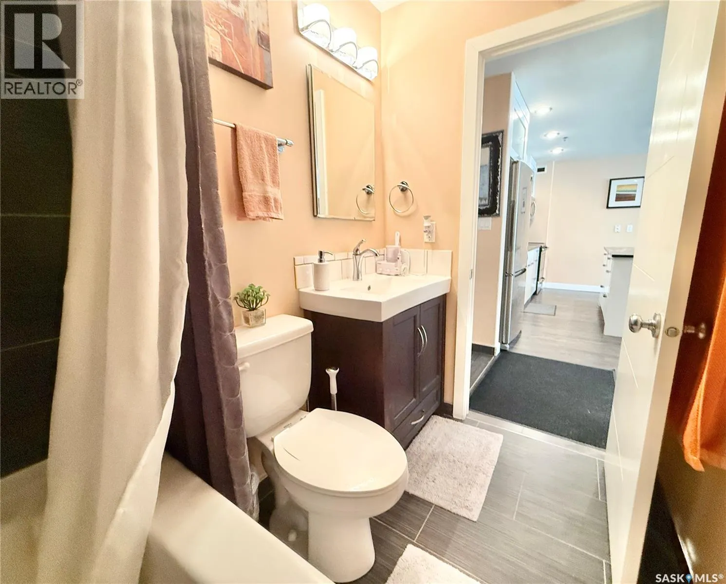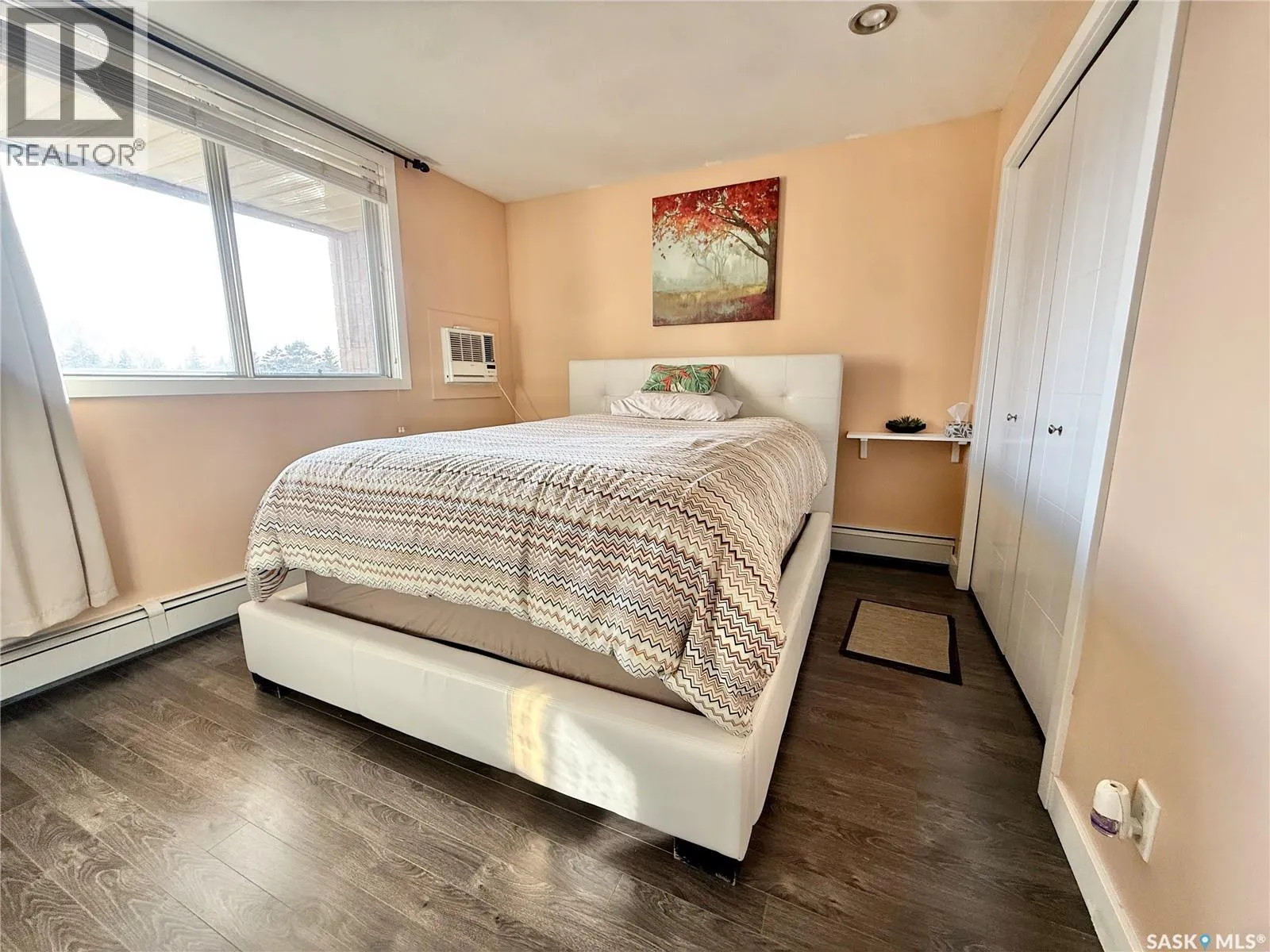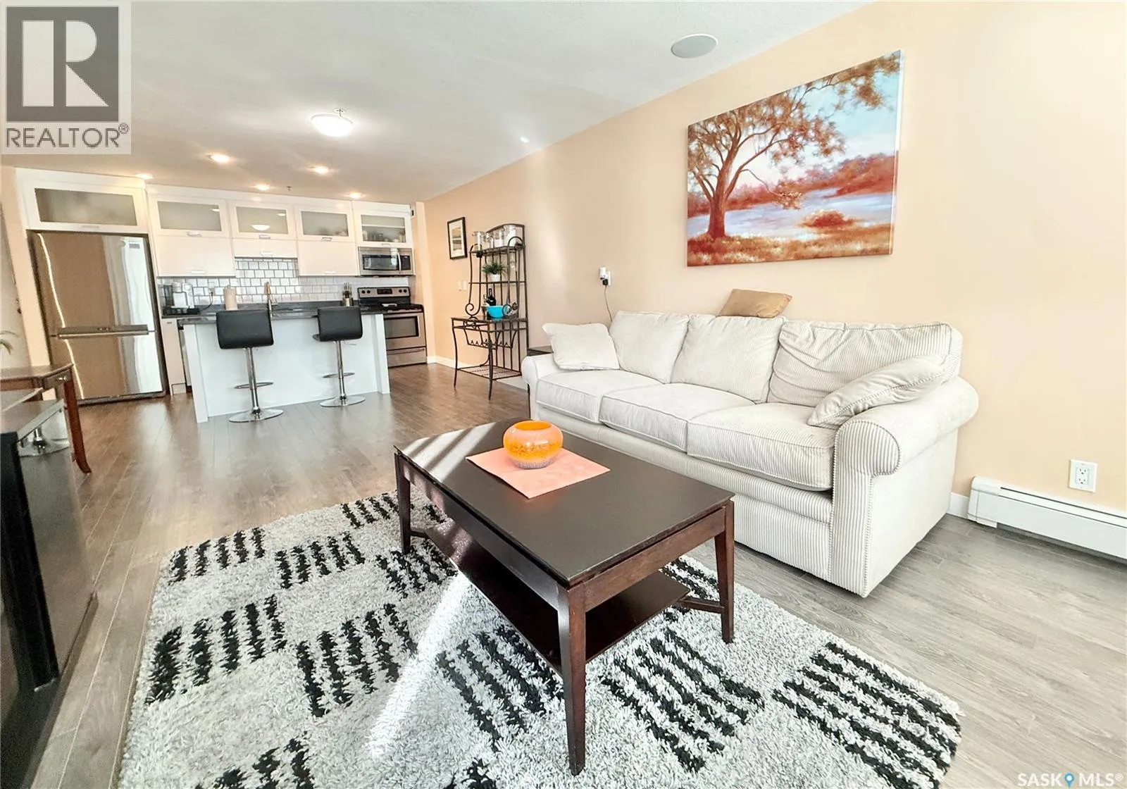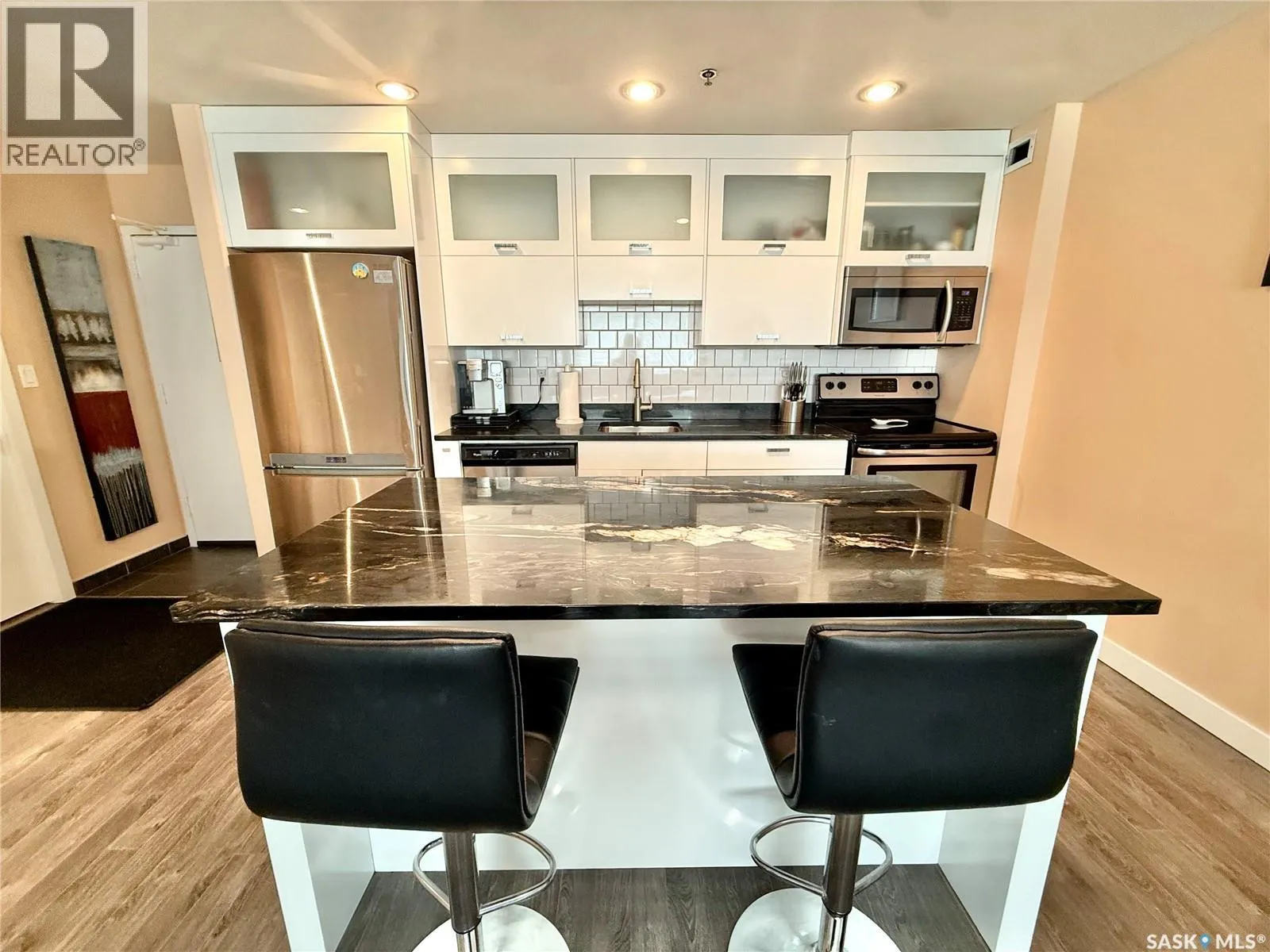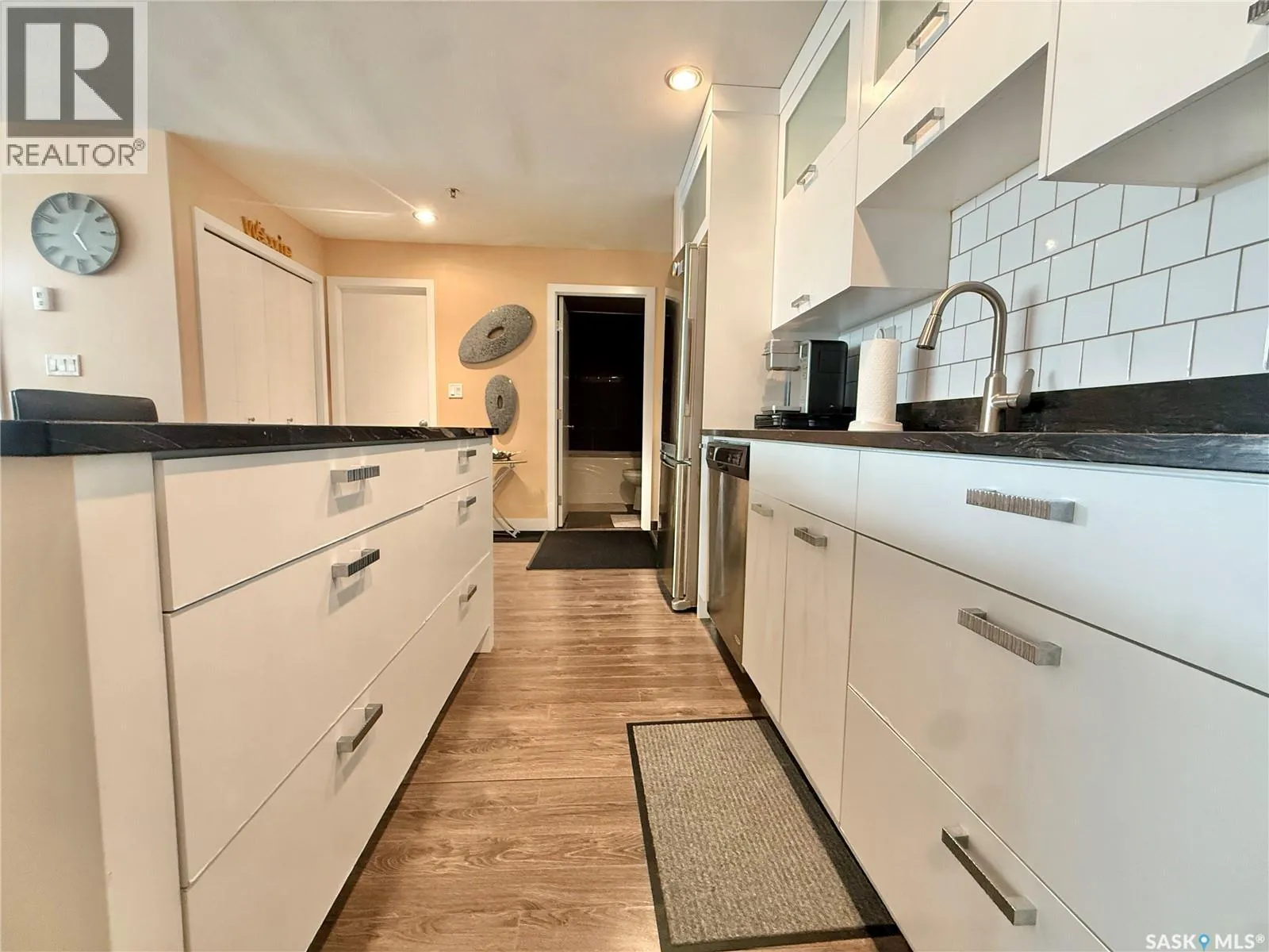 Welcome to this beautiful 1-bedroom, 1-bath condo in the highly desirable Genesee View building in Lawson Heights. Right on the edge of River Heights. Just a short walk to the river and all amenities, this updated unit features a modern white kitchen with sleek dark quartz countertops and a spacious island perfect for entertaining. Ample cupboard space and stainless steel appliances are included. The home boasts stylish laminate and tile flooring, while the bright, south-facing living room offers a cozy spot to enjoy the glass fireplace/TV stand that can stay. The bedroom comes with a queen bed, high-quality mattress, and modern white wardrobe, all of which can remain. At the entrance, youâll find a storage area with a stacking washer/dryer and a pantry cupboard for all the extras. The south-facing balcony is screened and covered with outdoor turfâkeeping birds out and friends in. This quiet building also offers an indoor pool, hot tub, and a large recreation & amenities room for gatherings. Donât miss the chance to see this charming unit. (id:27476)