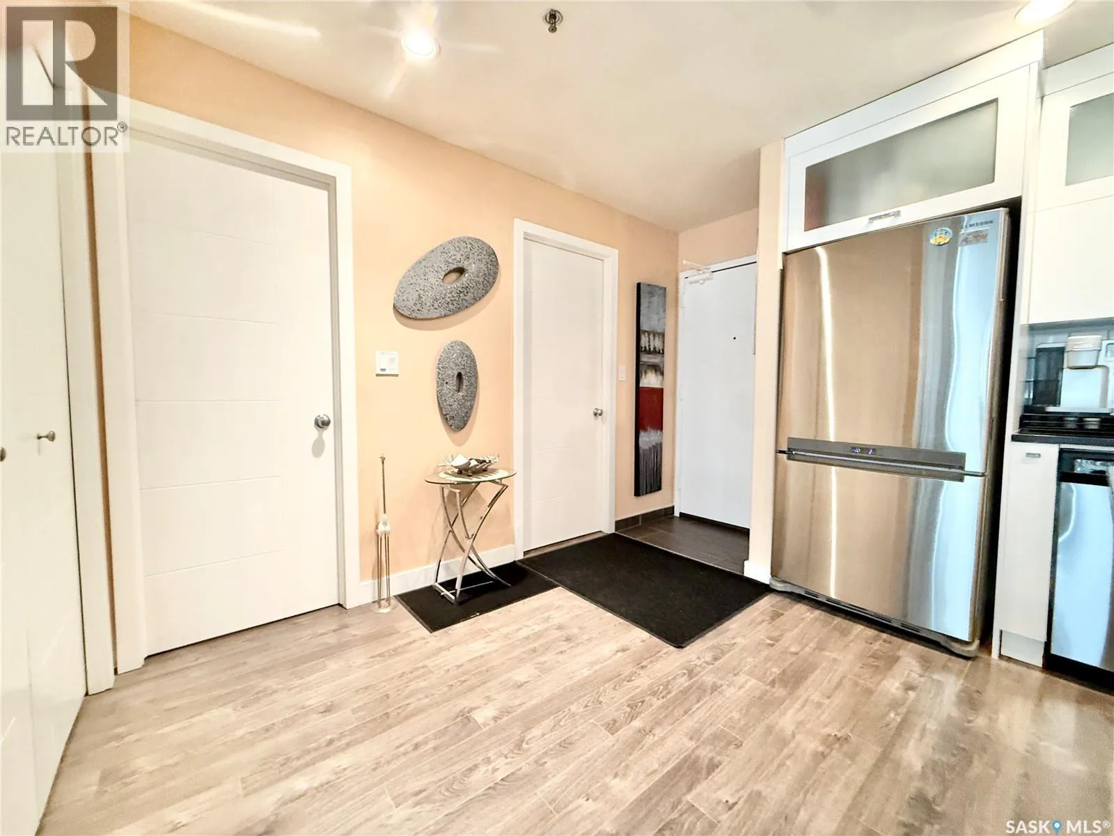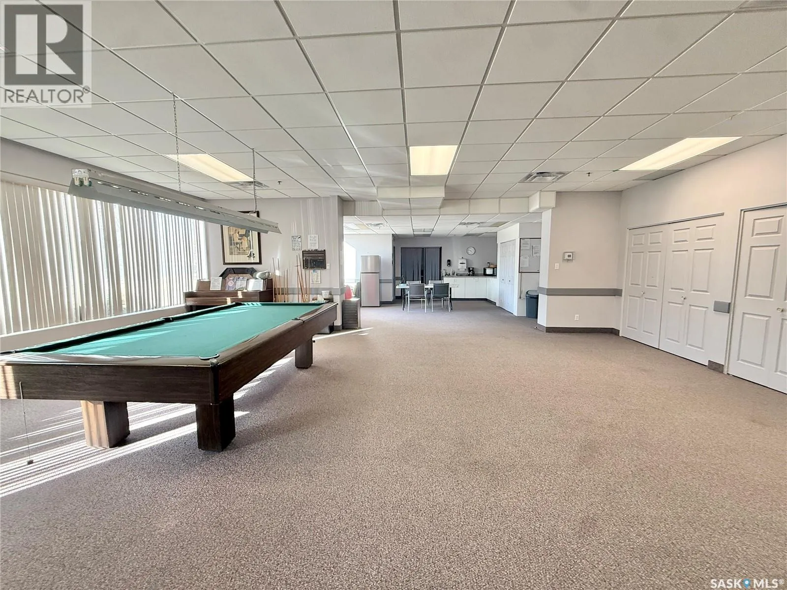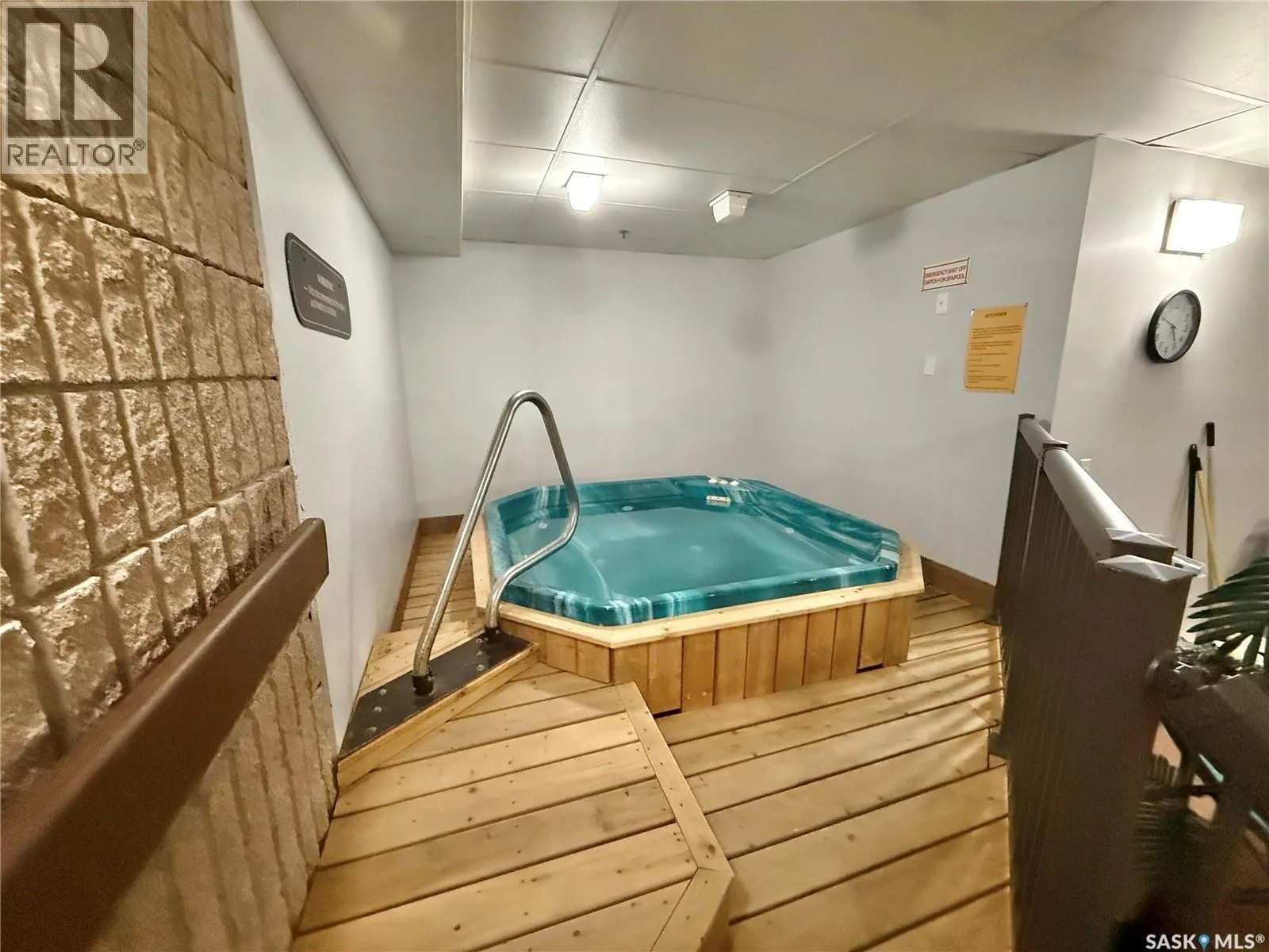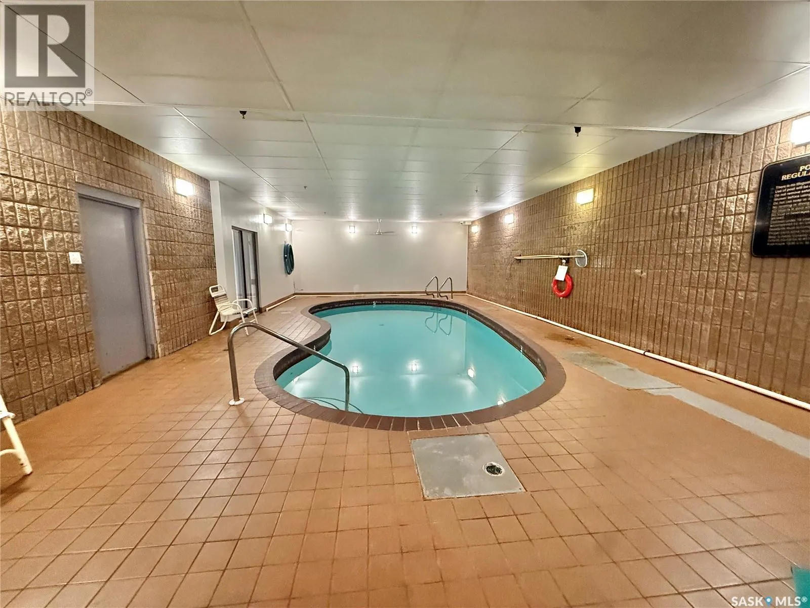 Welcome to this beautiful 1-bedroom, 1-bath condo in the highly desirable Genesee View building in Lawson Heights. Right on the edge of River Heights. Just a short walk to the river and all amenities, this updated unit features a modern white kitchen with sleek dark quartz countertops and a spacious island perfect for entertaining. Ample cupboard space and stainless steel appliances are included. The home boasts stylish laminate and tile flooring, while the bright, south-facing living room offers a cozy spot to enjoy the glass fireplace/TV stand that can stay. The bedroom comes with a queen bed, high-quality mattress, and modern white wardrobe, all of which can remain. At the entrance, youâll find a storage area with a stacking washer/dryer and a pantry cupboard for all the extras. The south-facing balcony is screened and covered with outdoor turfâkeeping birds out and friends in. This quiet building also offers an indoor pool, hot tub, and a large recreation & amenities room for gatherings. Donât miss the chance to see this charming unit. (id:27476)