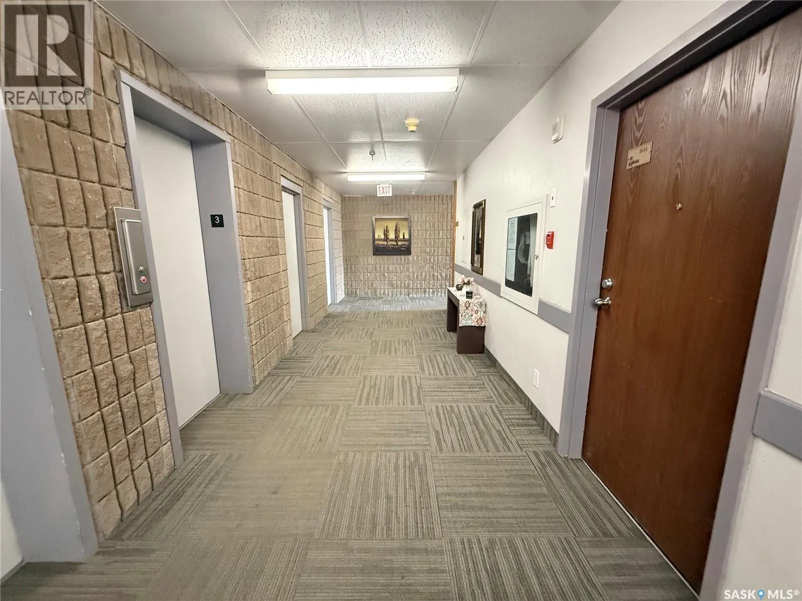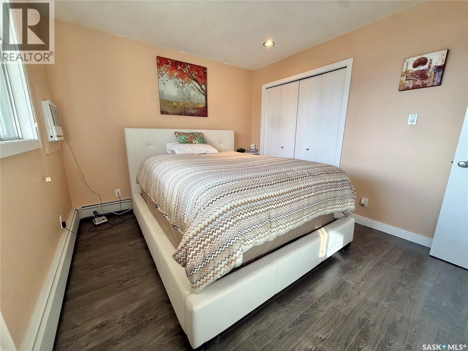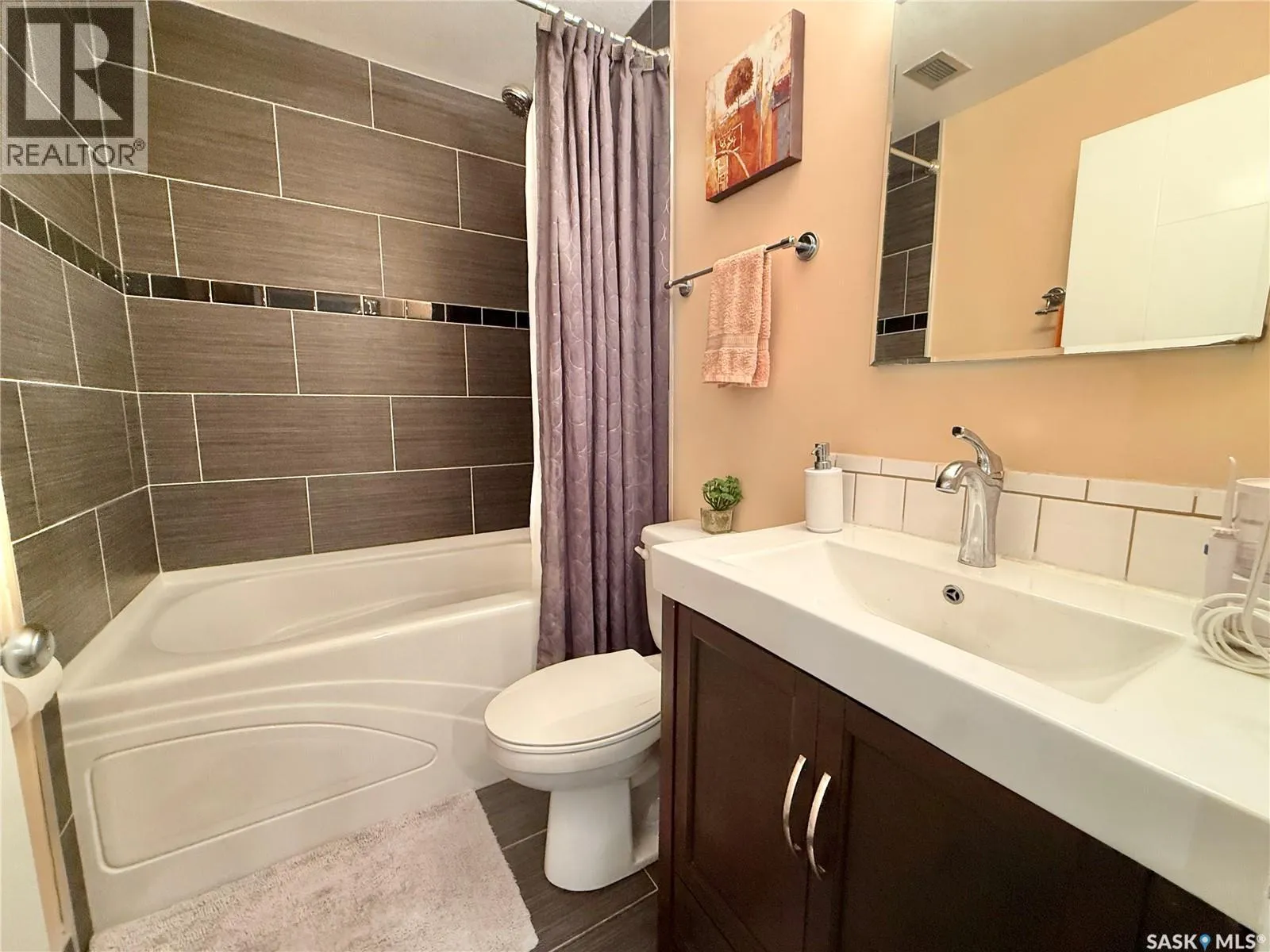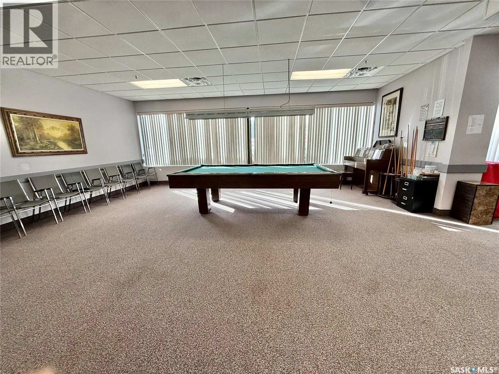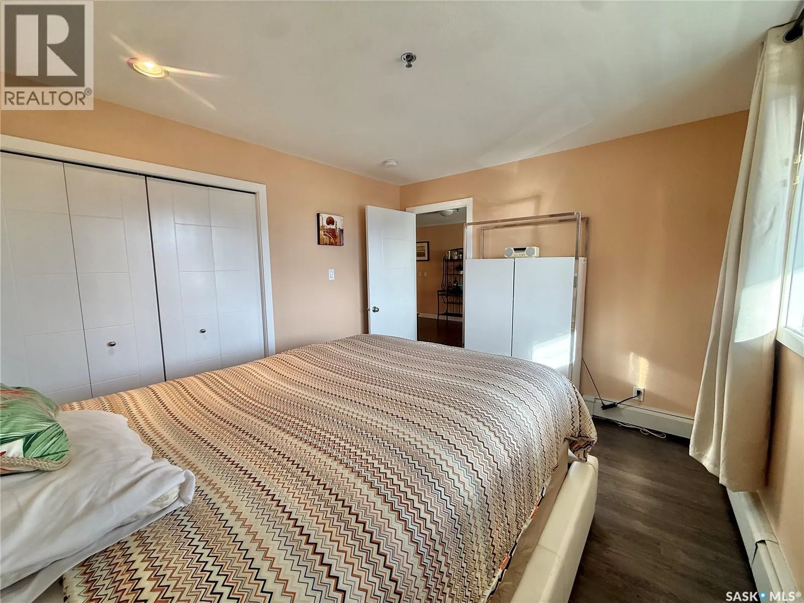 Welcome to this beautiful 1-bedroom, 1-bath condo in the highly desirable Genesee View building in Lawson Heights. Right on the edge of River Heights. Just a short walk to the river and all amenities, this updated unit features a modern white kitchen with sleek dark quartz countertops and a spacious island perfect for entertaining. Ample cupboard space and stainless steel appliances are included. The home boasts stylish laminate and tile flooring, while the bright, south-facing living room offers a cozy spot to enjoy the glass fireplace/TV stand that can stay. The bedroom comes with a queen bed, high-quality mattress, and modern white wardrobe, all of which can remain. At the entrance, youâll find a storage area with a stacking washer/dryer and a pantry cupboard for all the extras. The south-facing balcony is screened and covered with outdoor turfâkeeping birds out and friends in. This quiet building also offers an indoor pool, hot tub, and a large recreation & amenities room for gatherings. Donât miss the chance to see this charming unit. (id:27476)