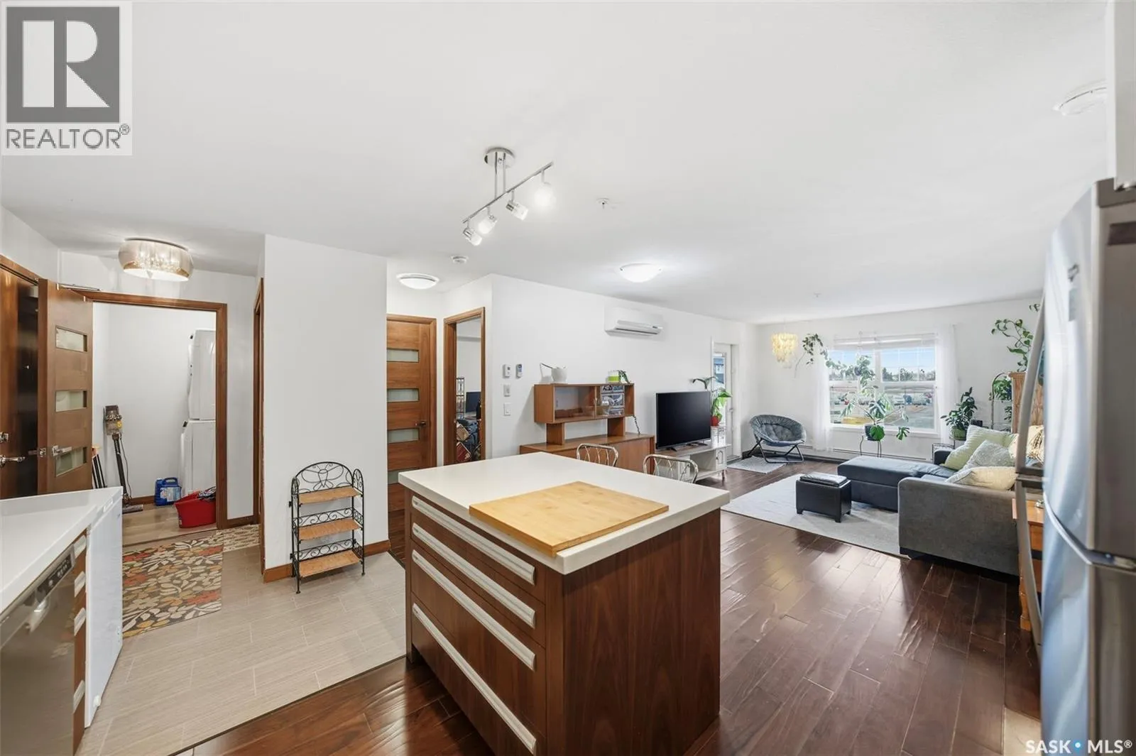Welcome to this bright and well-maintained 2-bedroom, 1-bathroom condo in the desirable Rosewood community. Offering 936 sq ft of thoughtfully designed living space, this newer unit features a spacious open-concept layout filled with natural light, perfect for both relaxing and entertaining. The modern kitchen is equipped with quartz countertops and stainless steel appliances, providing both style and functionality. Enjoy the convenience of in-suite laundry, air conditioning, and baseboard heating for year-round comfort. Step outside onto your private balcony, ideal for summer BBQs, and take advantage of two electrified parking stalls. This pet-friendly building also offers access to an exceptional clubhouse complete with a gym, pool, and common room, adding incredible lifestyle value. Located close to parks, walking paths, shopping, and all amenities, this home is perfect for first-time buyers, downsizers, or investors. Donât miss your opportunity to own in one of Saskatoonâs most sought-after neighborhoods. Schedule your viewing today! (id:27476)