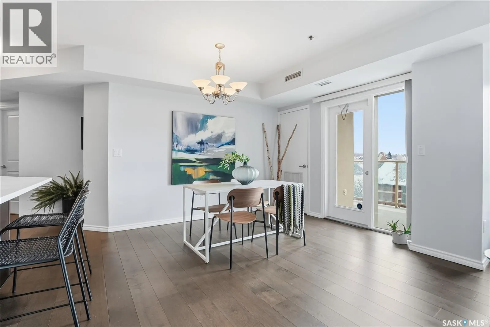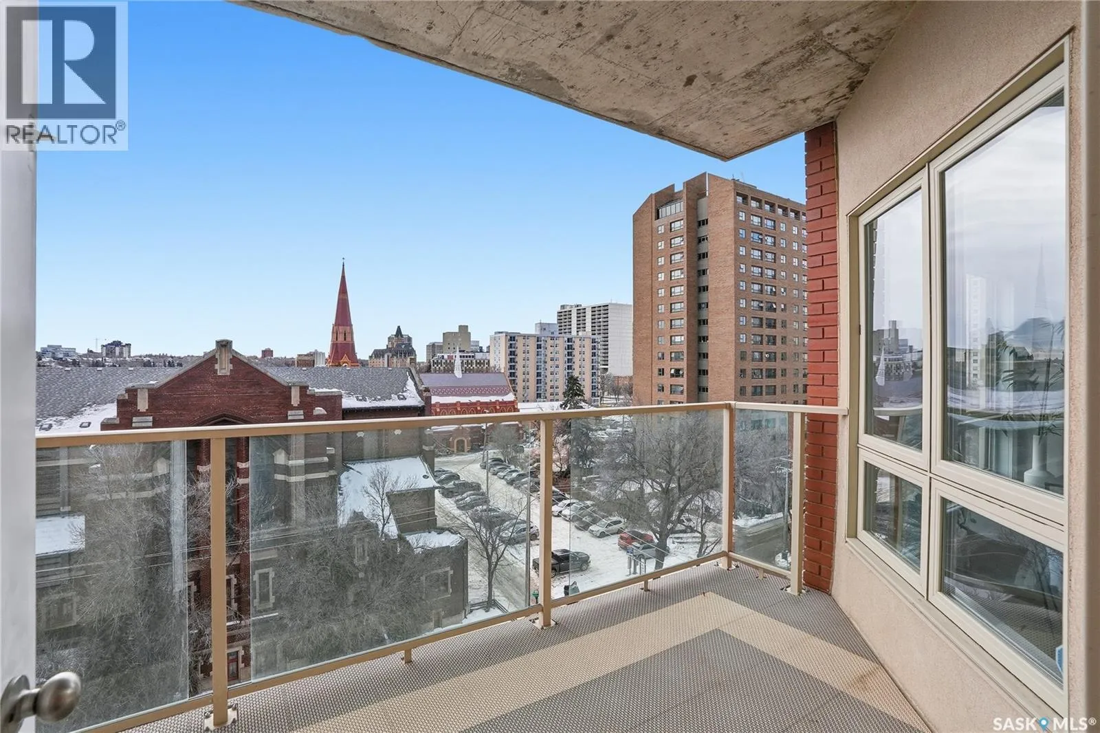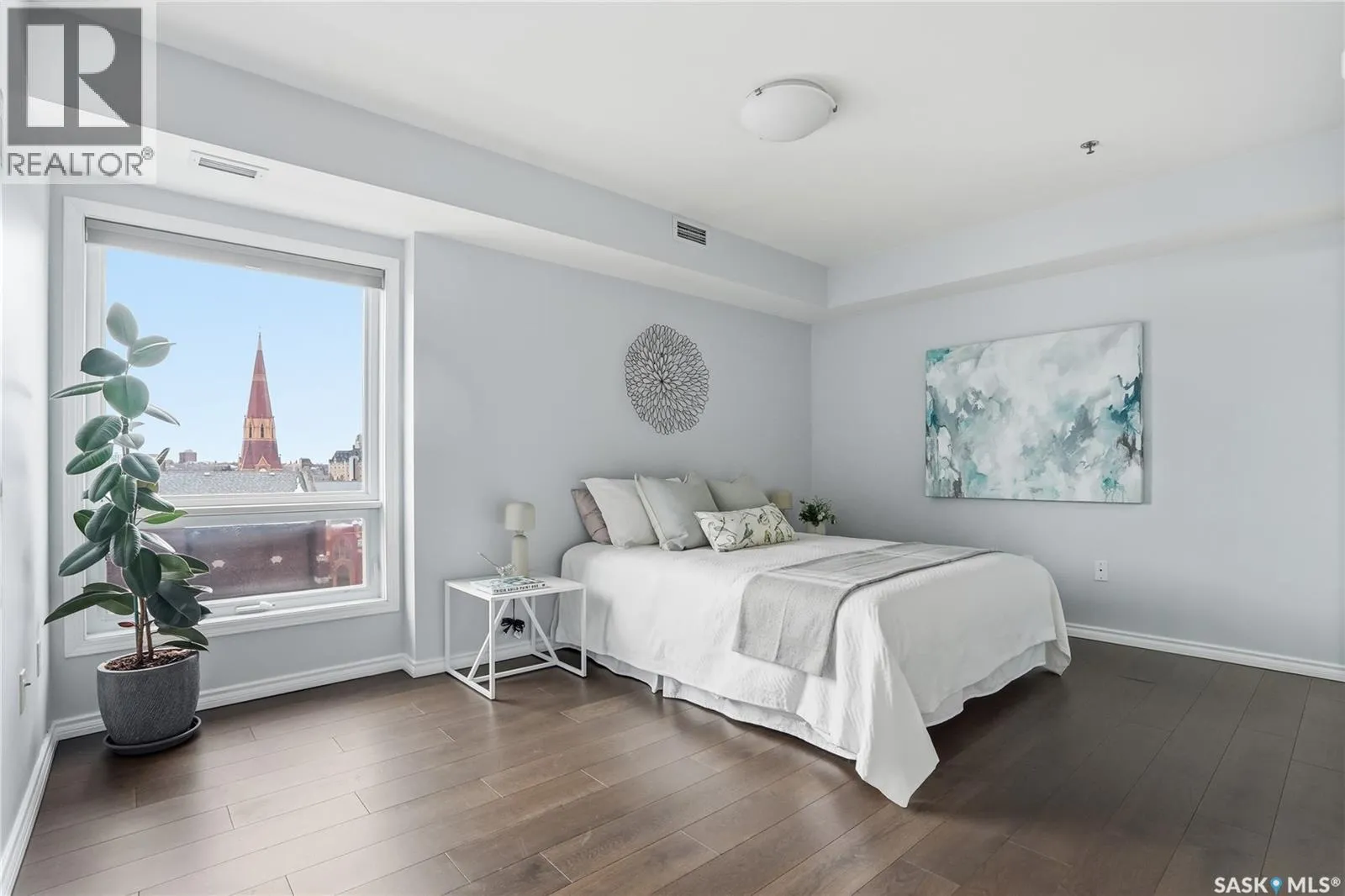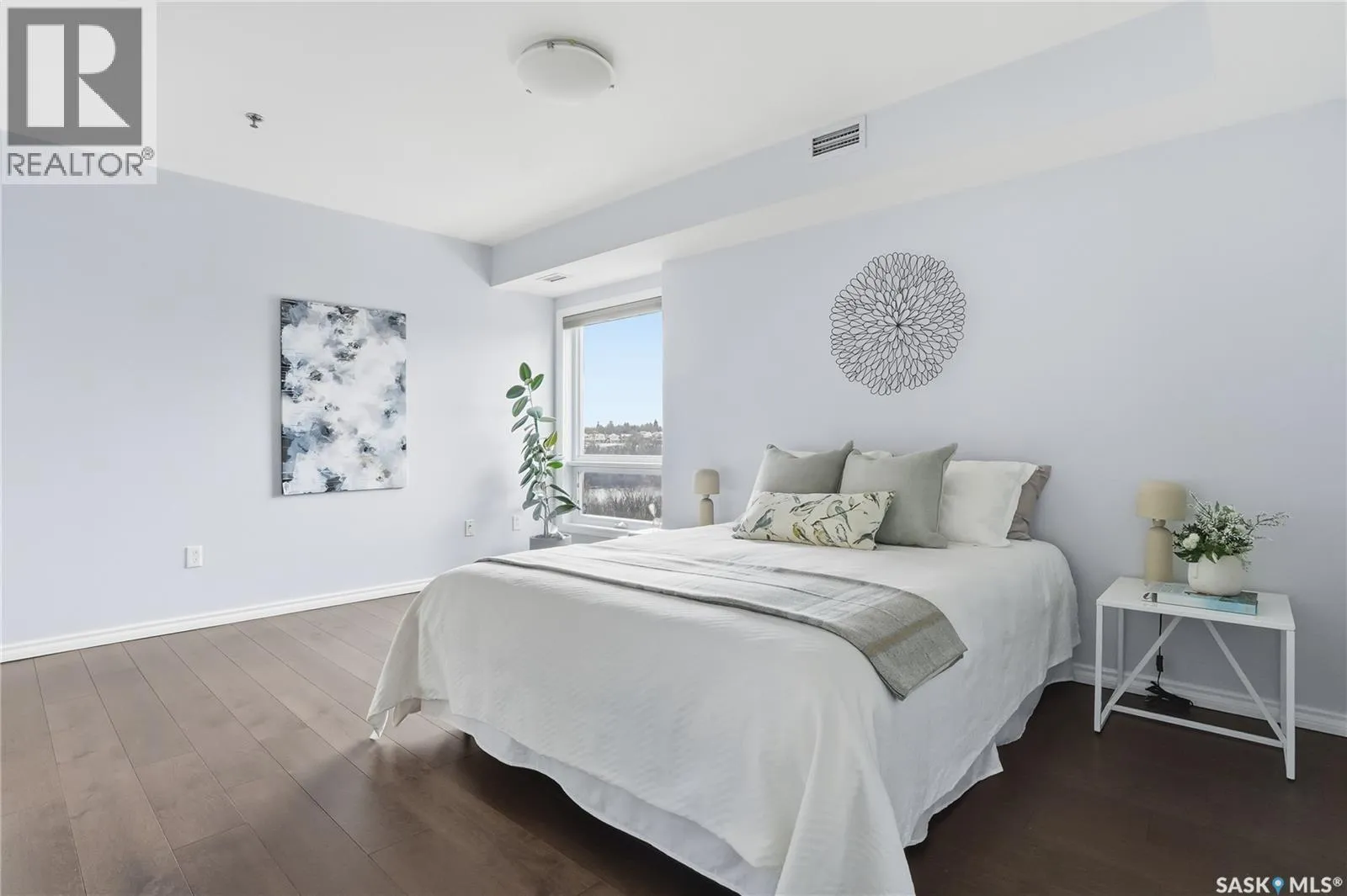 Experience riverfront living in this IMPECCABLE southeast-facing LUX condo in the heart of downtown Saskatoon. Offering 1,155 sq ft, this 2-bedroom, 2-bath unit features an UPDATED bright, open floor plan designed to take full advantage of the natural light and breathtaking river views. The kitchen is beautifully finished and underwent recent updates with modern cabinetry, newer gleaming quartz countertops, tile backsplash, and stainless steel appliances, and a peninsula opening to a spacious open concept living and dining area with oversize windows spanning the entire space, plus a large balcony that captures river and city views including the Meewasin park and the Cathedralâs tower! The entire space boasts newer (high end, recently installed) engineered hardwood flooring. Two spacious bedrooms, 2 full baths, and a primary walk-in closet, plus an in-suite storage/laundry room complete this lovely floor plan. Enjoy relaxing or entertaining on the private balcony with a natural gas BBQ hookup, overlooking not only the river, but also The Bessborough and Broadway Bridge. This unit includes 1 heated underground parking stall and a heated storage unit for added convenience. The building offers fantastic amenities, including a fitness room, a meeting room, and two guest suites. Ideally located along the Meewasin River Trail and park and steps from downtown restaurants, shops, and entertainment- the best of what our city offers!! (id:27476)