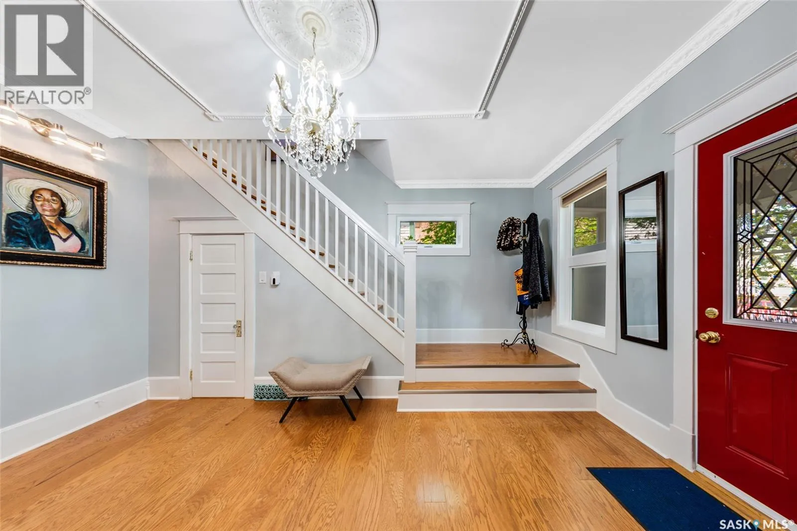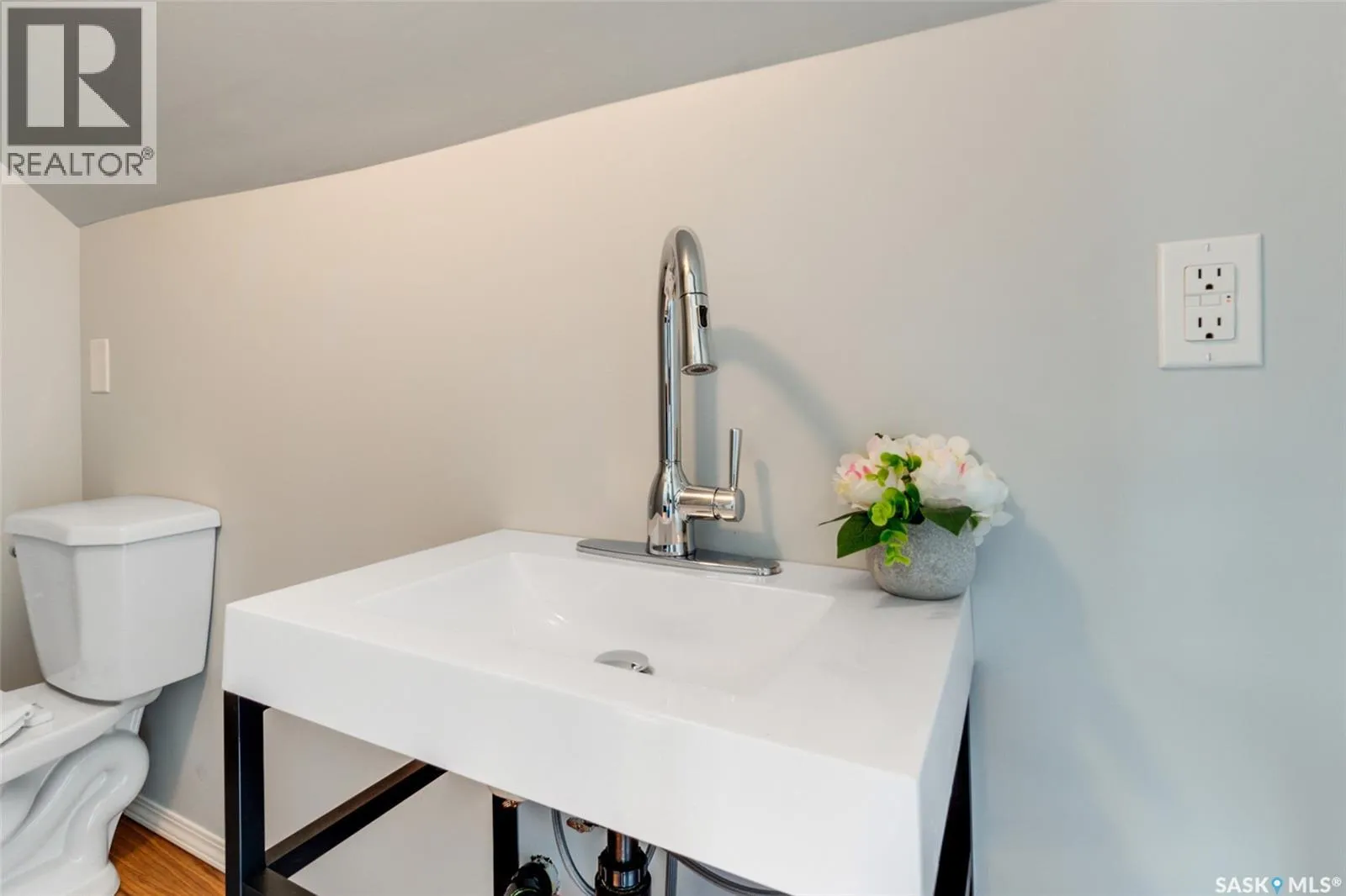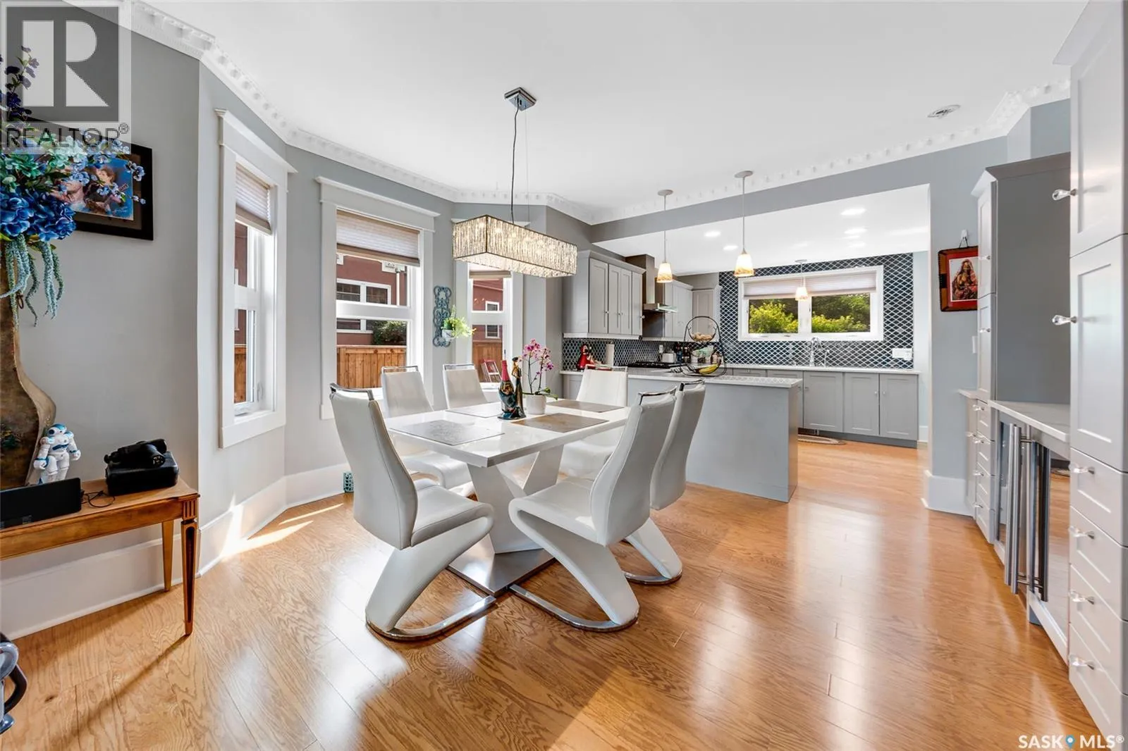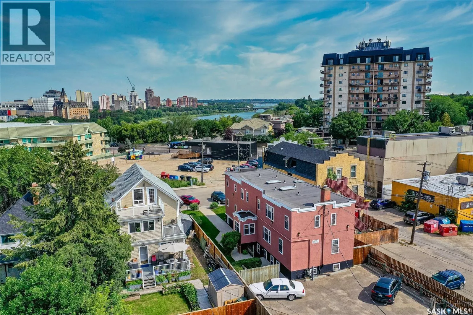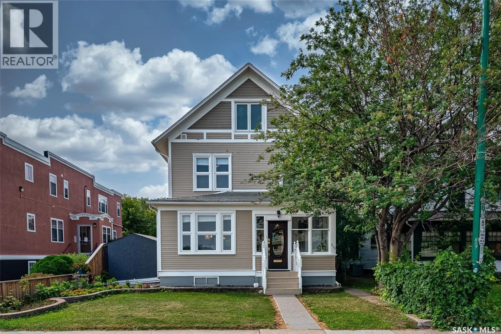 Just steps from the Saskatchewan River, tucked into the historic Nutana Neighbourhood, this Character 1911 home has been lovingly restored for clients who appreciate the history and location of this property. This spacious home has a completely renovated kitchen with quartz countertops, new cupboards and backsplash, under counter lighting, all new appliances, including a newer large wine and beer fridge and a nice open floorplan flowing through to the dining room and living room. An office space and main floor laundry are a great convenience on the main floor. Four- piece bathrooms on each of first two floors and half bath on third floor are convenient. Three large bedrooms on the second floor, one with a very large walk-in closet with window. (Could be used as a nursery.) One of the bedrooms on the second floor can also be used as a Sunroom. A new staircase leads to the third floor where the primary bedroom could be located. This room could also be used as a bonus room or very large office. Owner has replaced much of the crown molding to return this property to its original glory. There are South facing decks off the second and third floor as well as a back deck off the kitchen, also South facing. Most windows are new. Furnace, water heater and reverse osmosis recently changed. New paint everywhere and new engineered hardwood flooring make this is a turnkey property (Vinyl planking on the 3rd floor). Arches, tall baseboards, bay windows and glass doors complete the historic look of this home. This property has a completely fenced in backyard with board sidewalk leading to parking off the back alley. There is room for a garage. The owner has also created a small oasis of gardening boxes tucked around the back yard which is drenched in sunshine most of the day. Come and visit this beautifully renovated historic home, youâll be glad you did. (id:27476)
