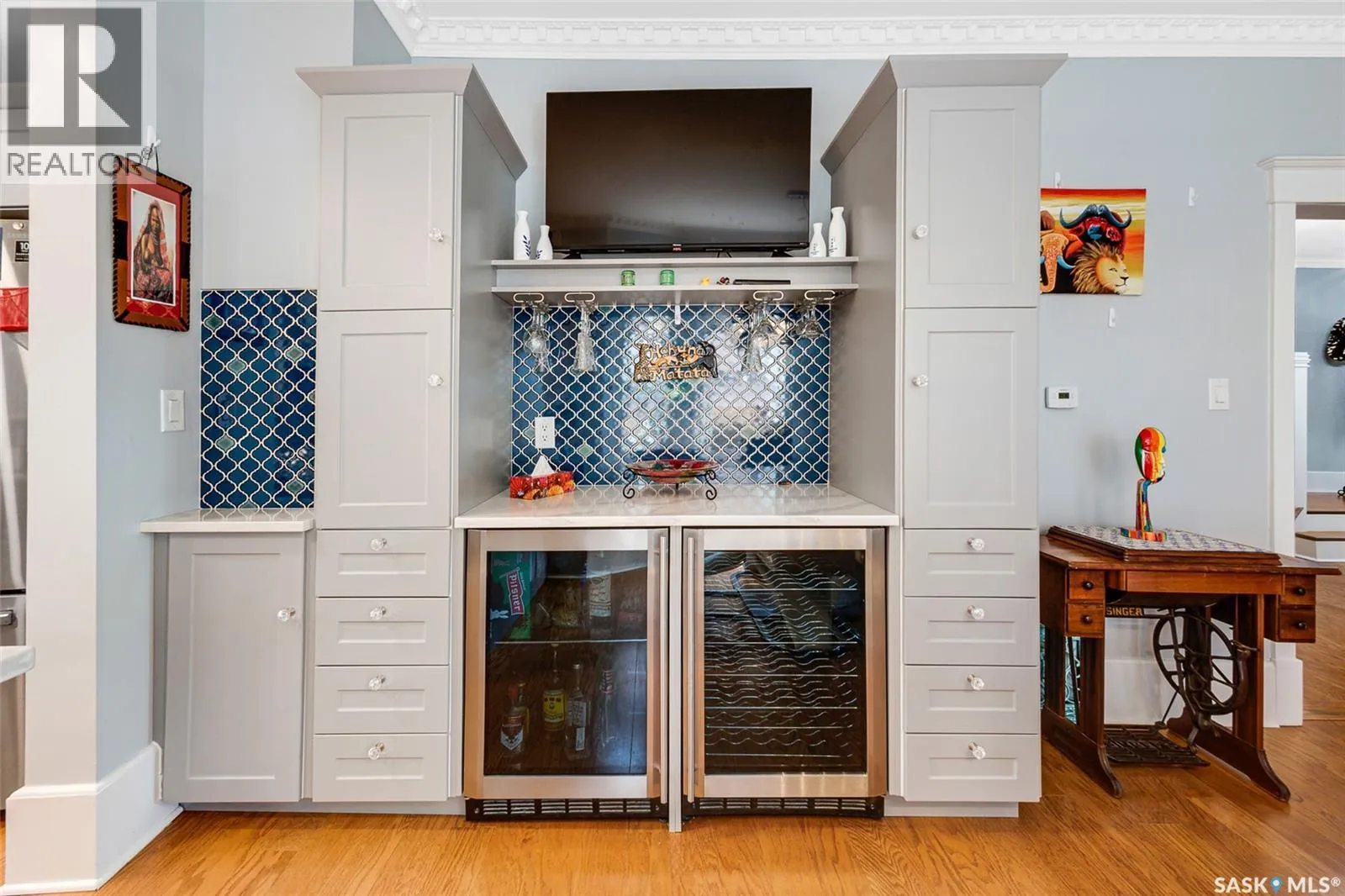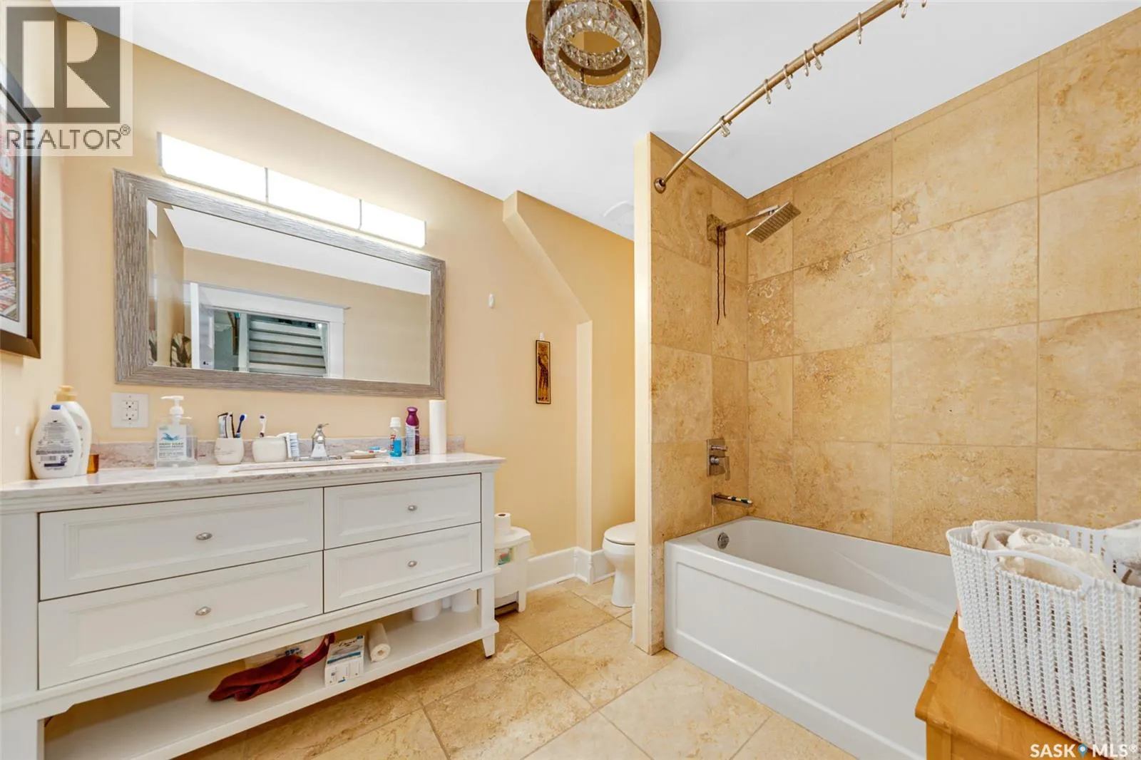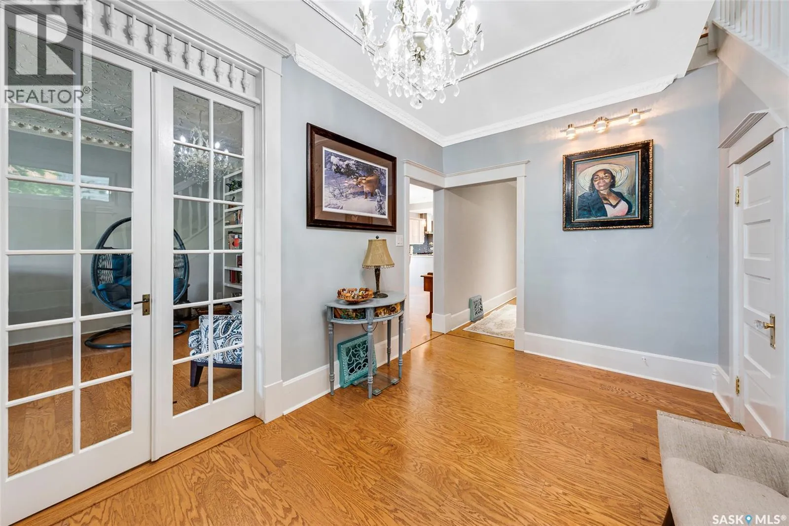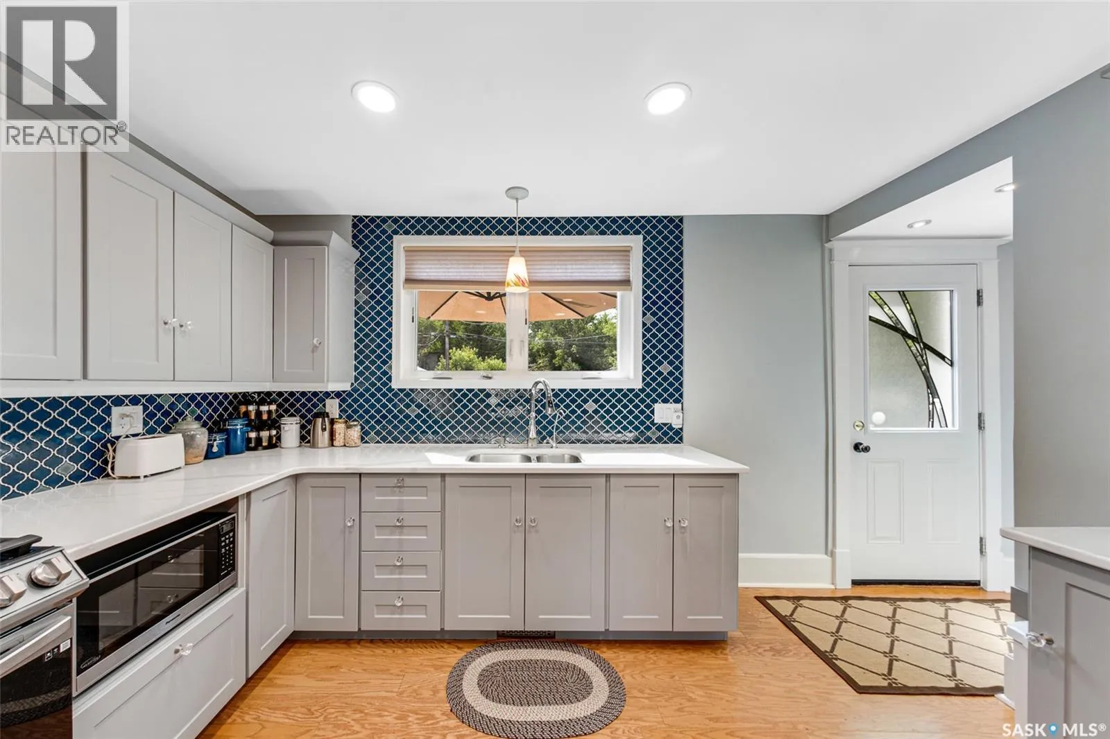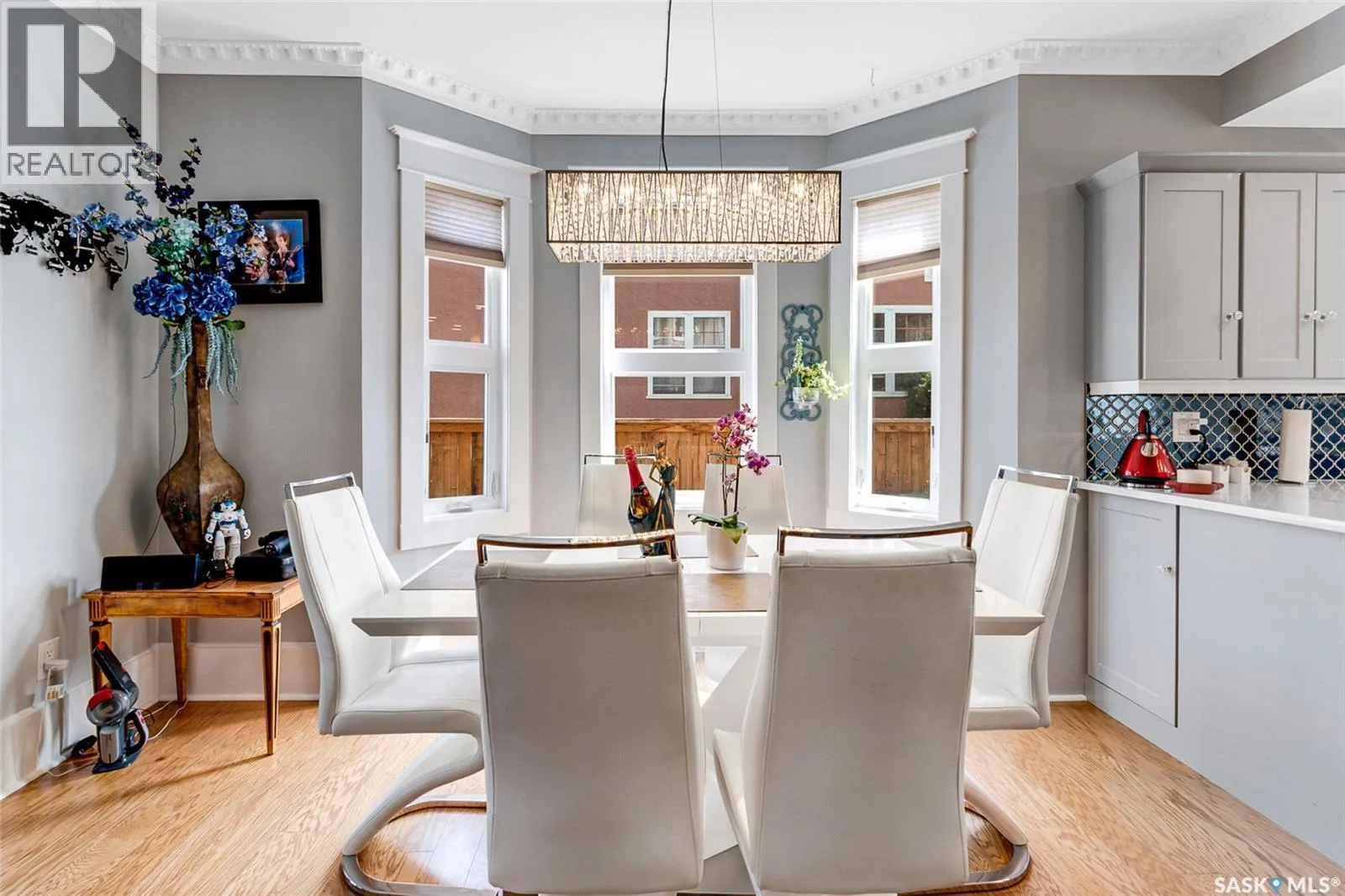 Just steps from the Saskatchewan River, tucked into the historic Nutana Neighbourhood, this Character 1911 home has been lovingly restored for clients who appreciate the history and location of this property. This spacious home has a completely renovated kitchen with quartz countertops, new cupboards and backsplash, under counter lighting, all new appliances, including a newer large wine and beer fridge and a nice open floorplan flowing through to the dining room and living room. An office space and main floor laundry are a great convenience on the main floor. Four- piece bathrooms on each of first two floors and half bath on third floor are convenient. Three large bedrooms on the second floor, one with a very large walk-in closet with window. (Could be used as a nursery.) One of the bedrooms on the second floor can also be used as a Sunroom. A new staircase leads to the third floor where the primary bedroom could be located. This room could also be used as a bonus room or very large office. Owner has replaced much of the crown molding to return this property to its original glory. There are South facing decks off the second and third floor as well as a back deck off the kitchen, also South facing. Most windows are new. Furnace, water heater and reverse osmosis recently changed. New paint everywhere and new engineered hardwood flooring make this is a turnkey property (Vinyl planking on the 3rd floor). Arches, tall baseboards, bay windows and glass doors complete the historic look of this home. This property has a completely fenced in backyard with board sidewalk leading to parking off the back alley. There is room for a garage. The owner has also created a small oasis of gardening boxes tucked around the back yard which is drenched in sunshine most of the day. Come and visit this beautifully renovated historic home, youâll be glad you did. (id:27476)