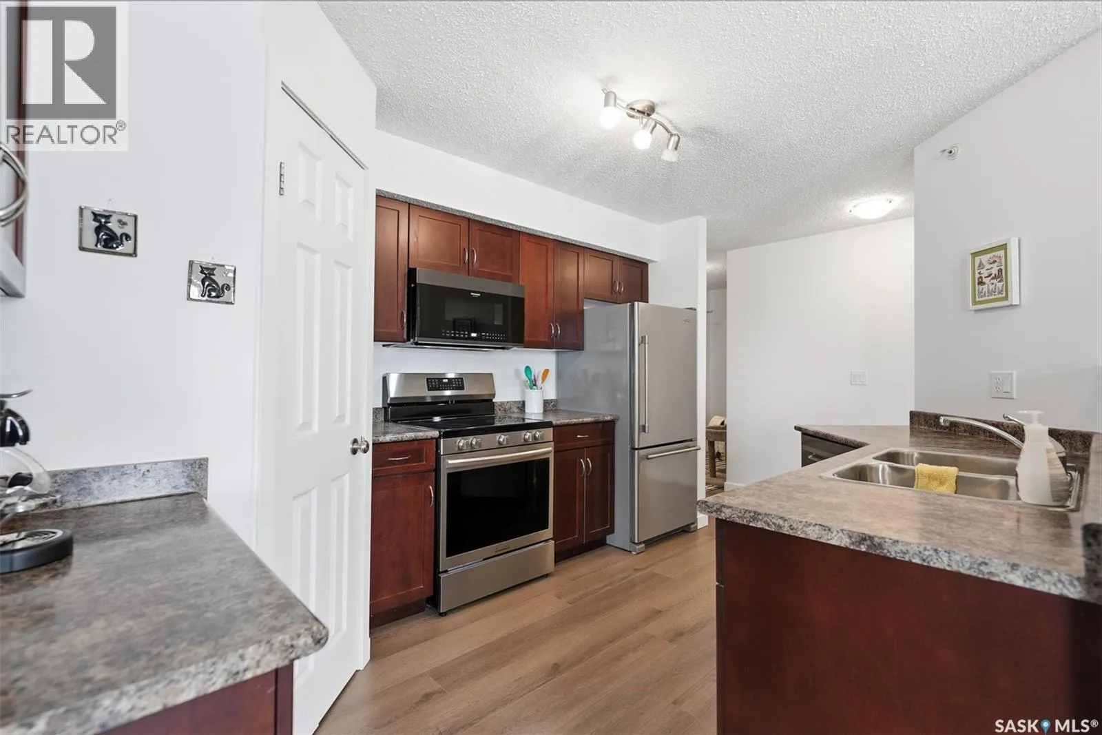 Welcome to this beautifully maintained top-floor corner unit in the desirable University Heights neighbourhood! Offering over 1,000 sq. ft. of comfortable living space, this bright and spacious 2-bedroom, 2-bathroom condo combines convenience, functionality, and an unbeatable location. Enjoy the added privacy and natural light of a corner unit, along with peaceful views from your elevated top-floor position. The open-concept and distinctive layout features a well-appointed kitchen with a corner pantry, generous living and dining areas, and a private balcony with a grand view of Forest Park. A standout feature of this home is the rare inclusion of TWO underground parking stalls, providing both security and convenience year-round. The building also offers excellent amenities, including elevator access, an exercise area, and visitor parking. Pet lovers will appreciate that pets are allowed with restrictions, making this a welcoming option for a variety of lifestyles. Located just minutes from everything you need, this property is ideally situated near schools, shopping, restaurants, parks, and public transit, making daily life effortless and convenient. Donât miss your opportunity to own this exceptional unit in a prime location! (id:27476)