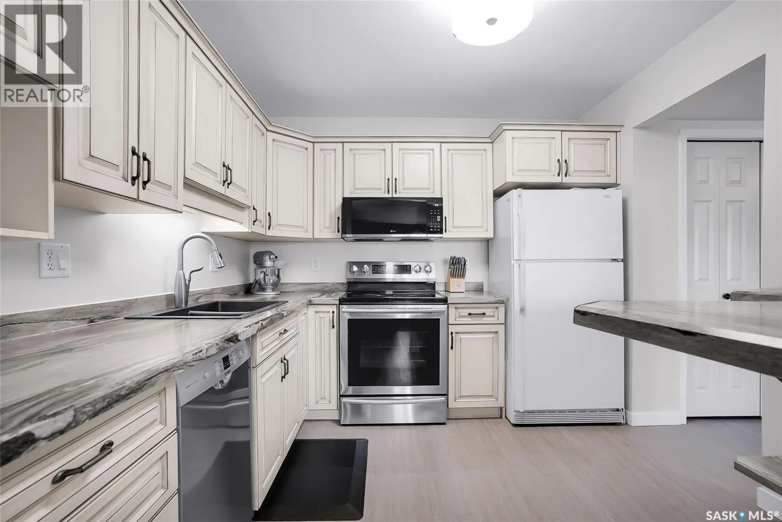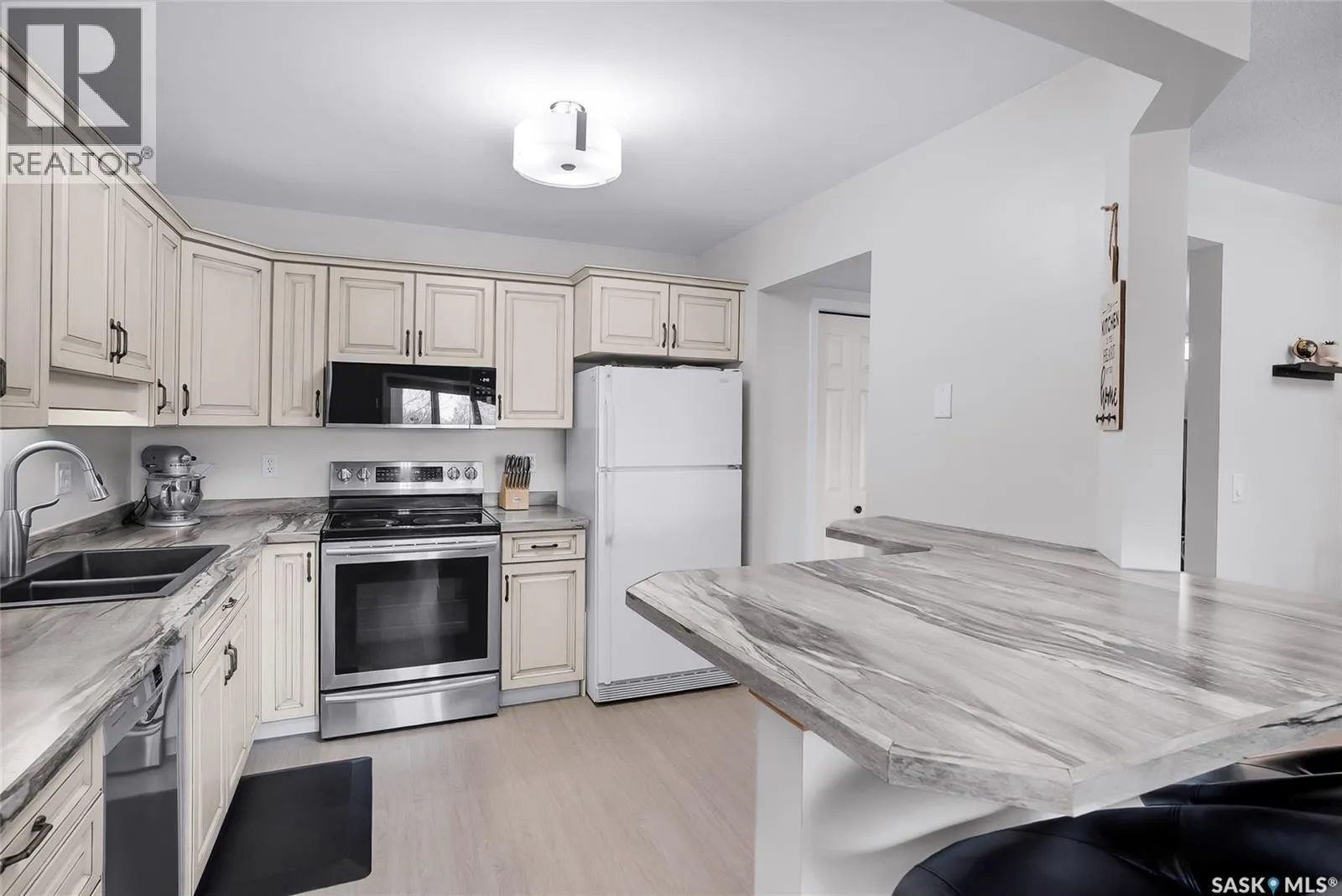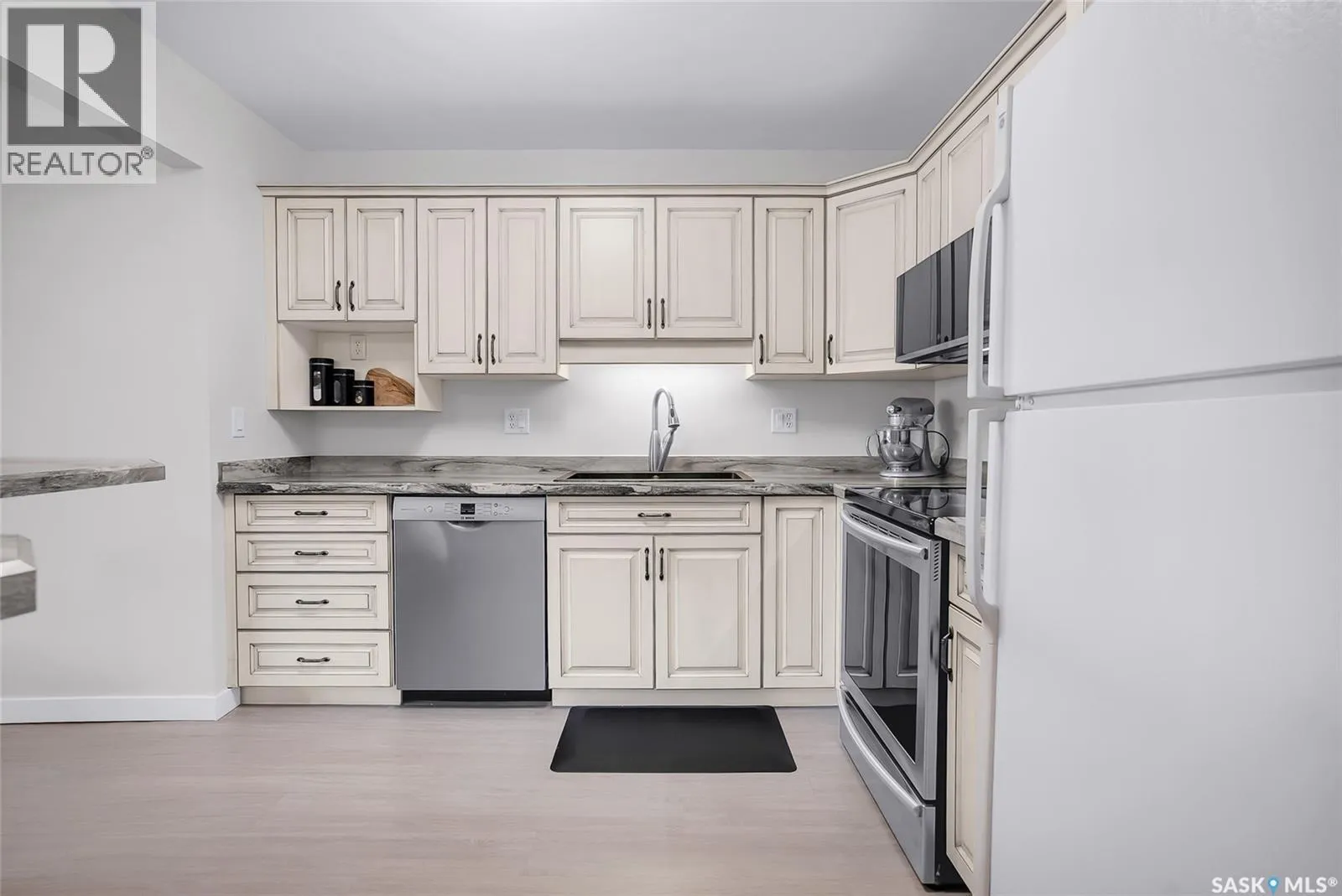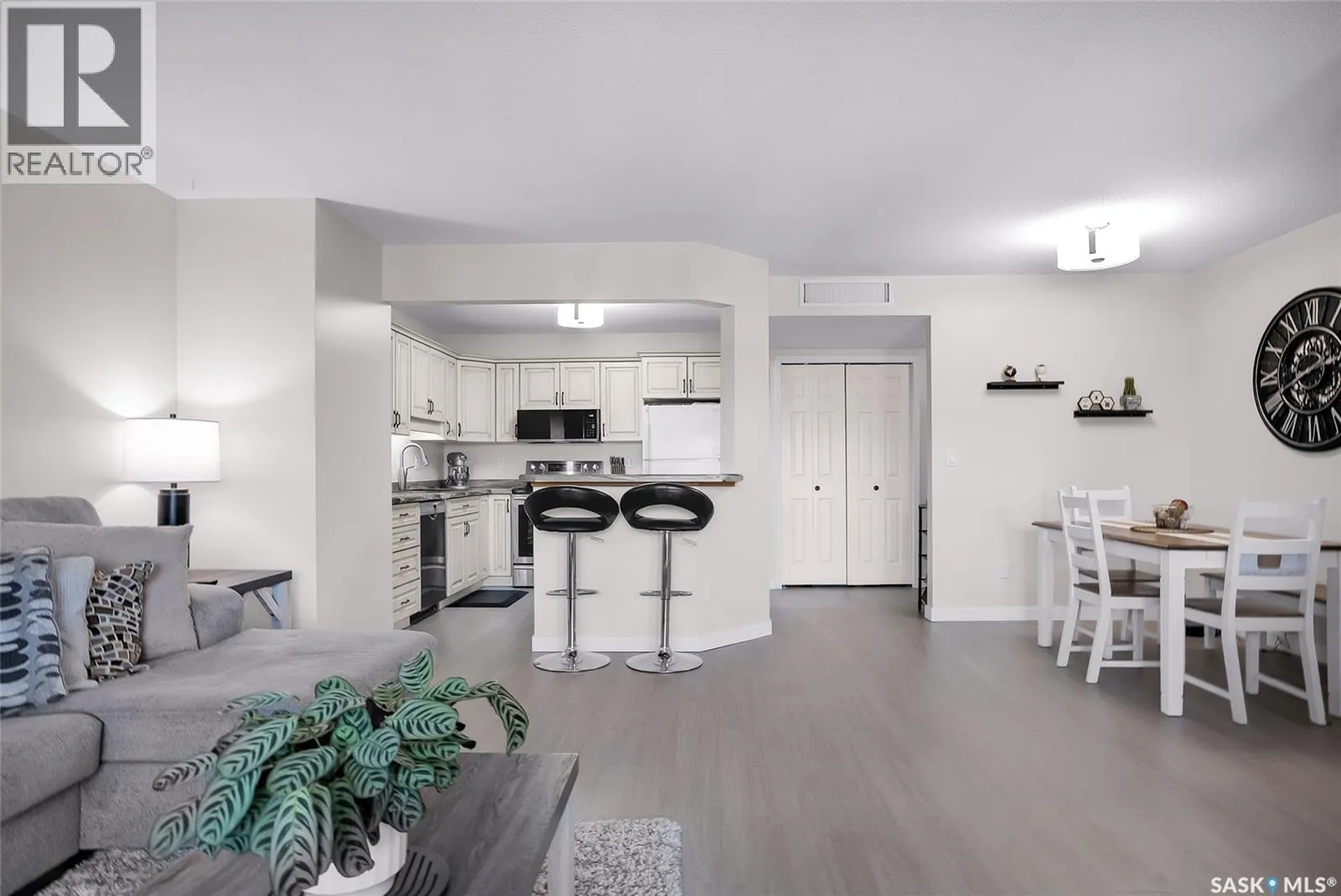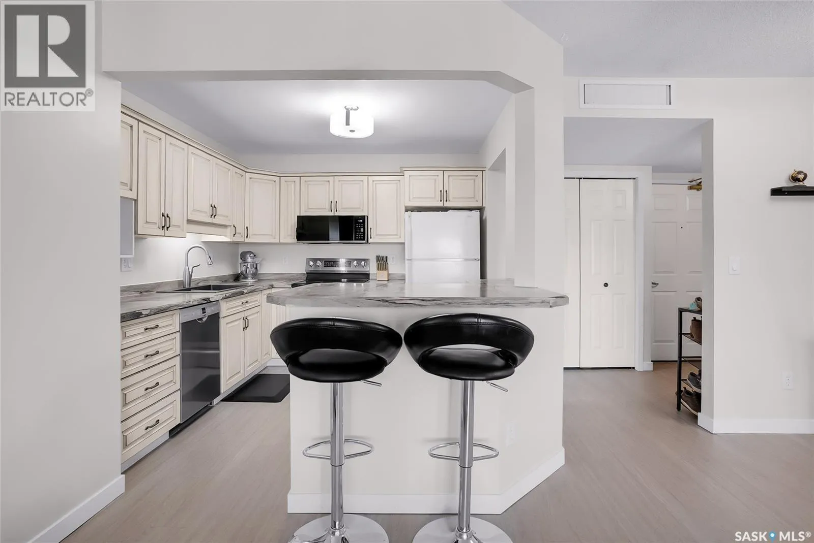 Welcome to this beautifully updated 2-bedroom, 2-bathroom top-floor condo offering comfort, privacy, and exceptional value. Situated on the quiet, north side of the building, this unit provides a peaceful setting with added privacy and minimal noiseâenhanced further by solid construction between floors. Step inside to discover brand new vinyl plank flooring with in-floor heat, complemented by fresh paint throughout for a modern, move-in-ready feel. The kitchen features updated appliances, including a new s/s stove, s/s microwave and s/s dishwasher along with new taps and a stylish new shower system in the bathrooms. With over $10,000 in recent upgrades, this home is true Jem. Enjoy year-round comfort with central air conditioning and the convenience of central vacuum. Condo fees include both heat and water, offering excellent value and predictable monthly costs. Additional highlights include: 1 exclusive underground parking stall #18, Plus Sellers Rent a 2nd underground parking stall for $50/mo . 1 Spacious private storage directly in front of your parking space #18. Covered balcony for extended outdoor enjoyment. Ideally located near the University of Saskatchewan and the future Saskatchewan Polytechnic campus, this home offers excellent access to education, transit (bus stop right outside), Preston Crossing shopping, parks, and schools including Sutherland School. A fantastic opportunity for students, professionals, or investors seeking a quiet, upgraded unit in a highly accessible location. (id:27476)