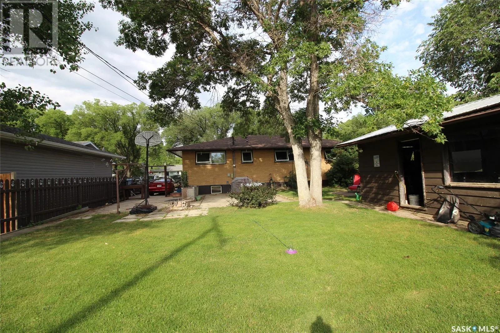 This home is just pretty as a picture! The curb appeal with the sturdy brick exterior, cottage style roof and bright blue doors makes heads turn on this block. The home is located close to the hospital and school and backs on to open prairie, the dog park and the walking trail in Shaunavon. Through the front door, you enter into a huge living space with floor to ceiling windows for brilliant natural light. The kitchen and dining room are just to the right and allows your guests to flow from one room to the next. The kitchen is designed with ample cabinetry, an island for prep or buffet, and room for at least two cooks! The home has three bedrooms on the main and a large updated 4pc bath with a luxurious soaker tub. The lower level is fully developed with a massive family room that features built in cabinets, and a wet bar. Part of the family room is carpeted and set up with a space for an electric fireplace. A fourth bedroom is located in the basement and has a large walk in closet. There is a separate laundry room, storage/work room and a full 3pc bath. The home has an EE furnace, central air and natural gas hot water heater. The back yard of the home is fully fenced with a large patio space, mature grass and even an apple tree. The single detached garage is accessed from the back lane and is extra long for storage and workspace. One of the best deals in Shaunavon today, in an amazing neighborhood. (id:27476)