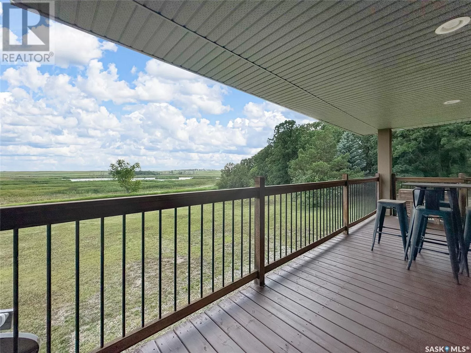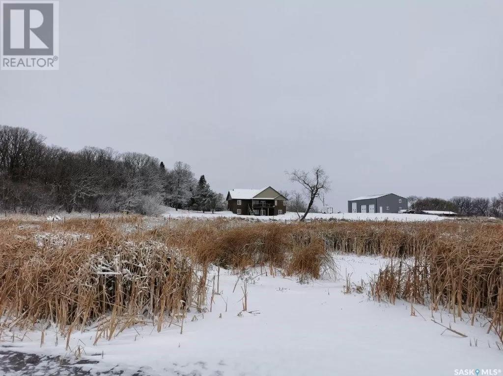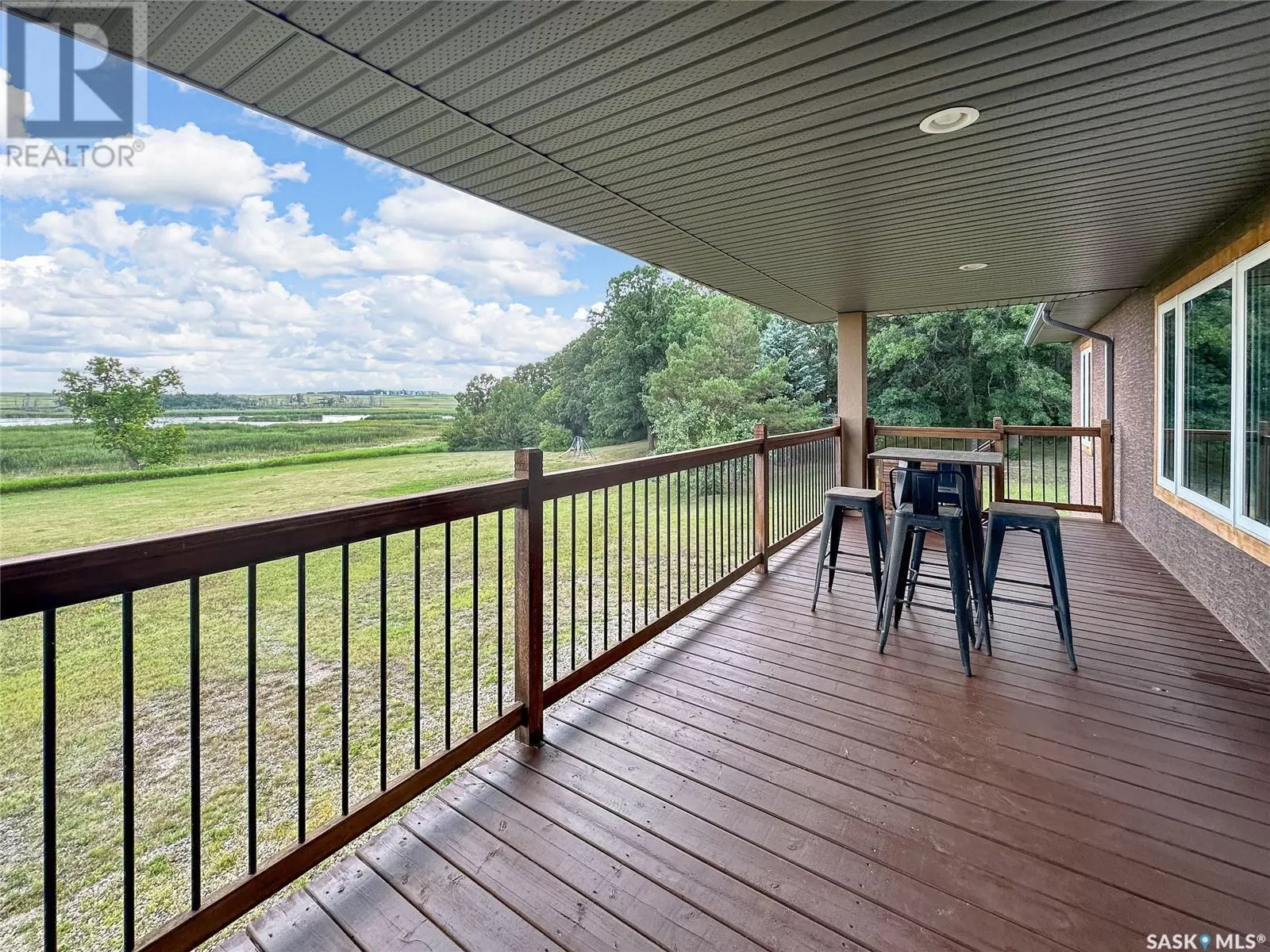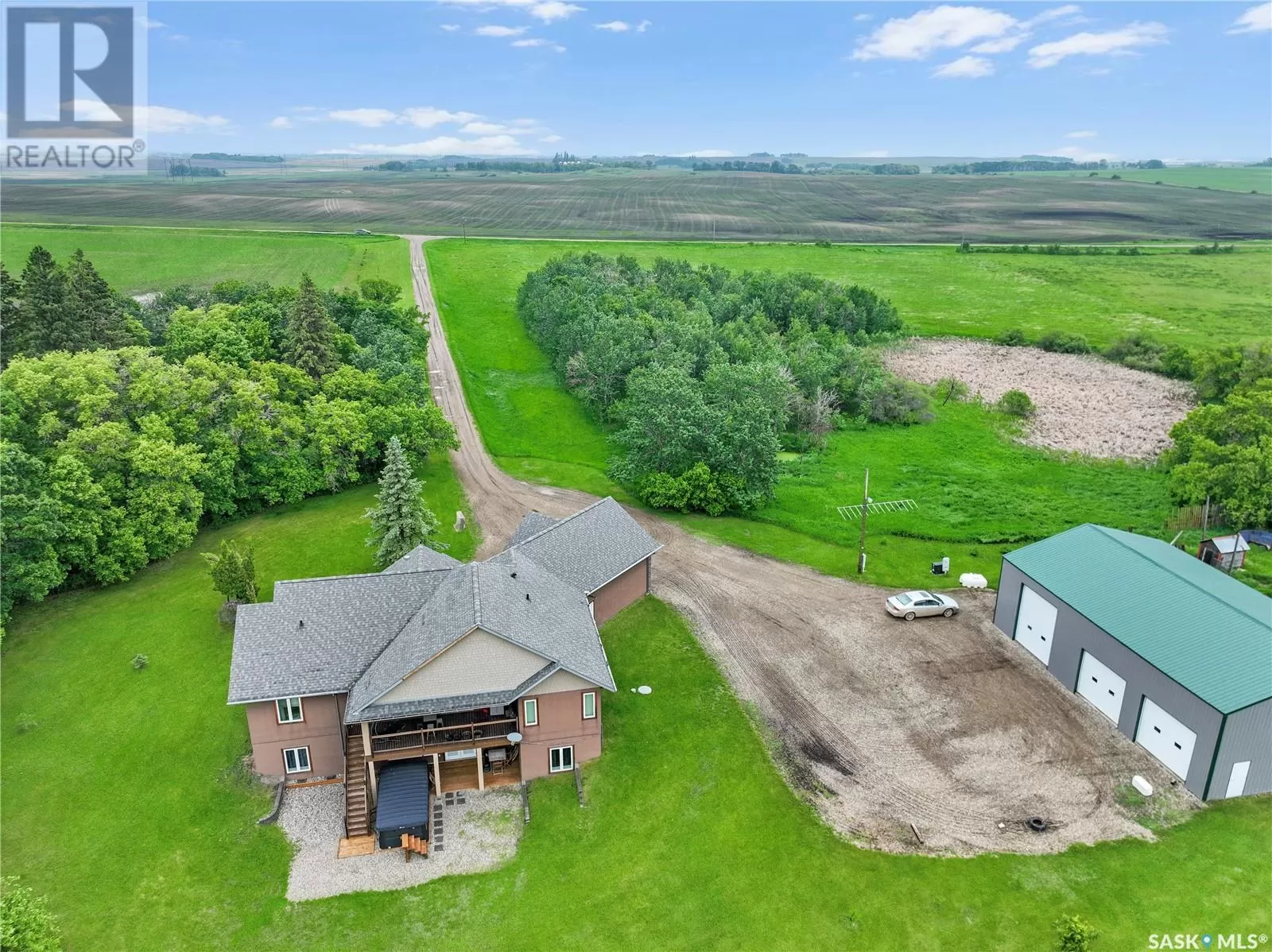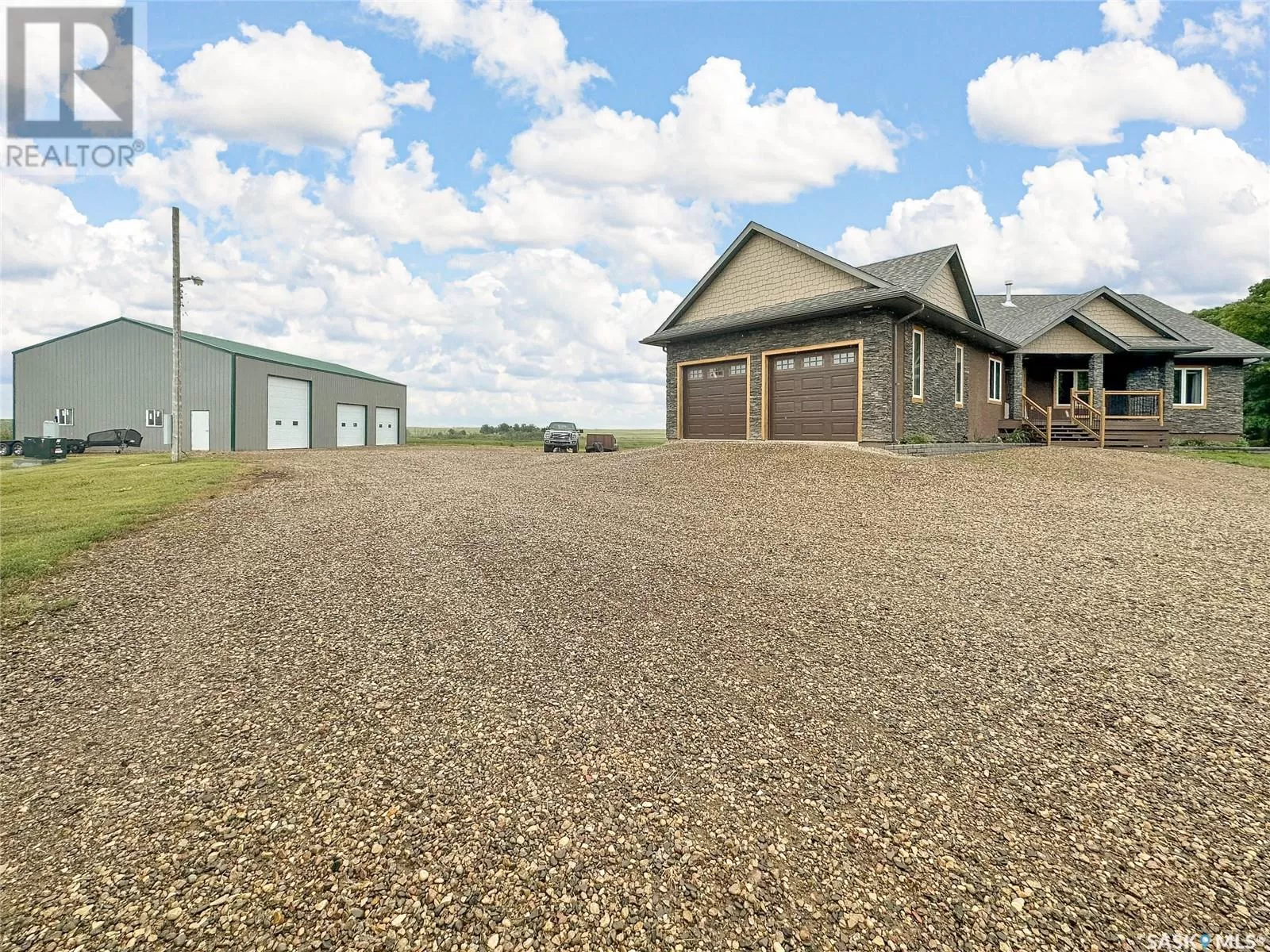 Kings & Queens, your castle is calling. Just off the beaten path of Holar Road you'll find a 15.09 walk out acreage & shop just west of HWY 8 with minimal gravel & maximum benefits. Covered decks, Vaulted ceilings, quartz countertops, a 2 way fireplace, stainless steel appliances and copious amounts of natural light set the stage for this show stopper from the front entrance to the top deck grilling station. Ceramic floor mudrooms are accented by a 2 pc bath of the double attached/insulated & heated garage so your snow gear or cow business isn't tracked through the house. A spacious office/gun room with a lane view keep business at the front and the party at the rear with all the bedrooms tucked in to their west and east facing areas of the home. A large kitchen with pull up bar stools, living room and formal dining room all flow with cohesive colorscheme and act as they should for the focus of the hub of this home. 2 bedrooms with large closets share a 4 pc bath on the west side of the home and separated by your homes hub on the eastern side is the colossal master, boasting a walk in closet & 5 pc ensuite including his & her sinks, soaker tub & custom shower with body jets. Below deck the walk out matches stride with the main floor in awesomeness with 2 extra guest beds, a massive home gym, laundry & 4 pc bath. The huge basement rec space have Sasks finest prairie views and with a handy wet bar & under stair wine room your set for some fantastic occasions at this location. Outside a mezzanine clad, 60 x 40 shop with 2/3s insulated & concrete floor with inflow heat lines ready to be hooked up await the next owners set up. The remaining area of the 60x40 runs as fantastic cold storage. Fire pits, huge mature trees, apple, Saskatoon and raspberry bushes add more value to the acres your about to acquire near the valley. Saskatchewan Potash Hot spot is calling you. Pull the trigger on your acreage owning dreams! (id:27476)