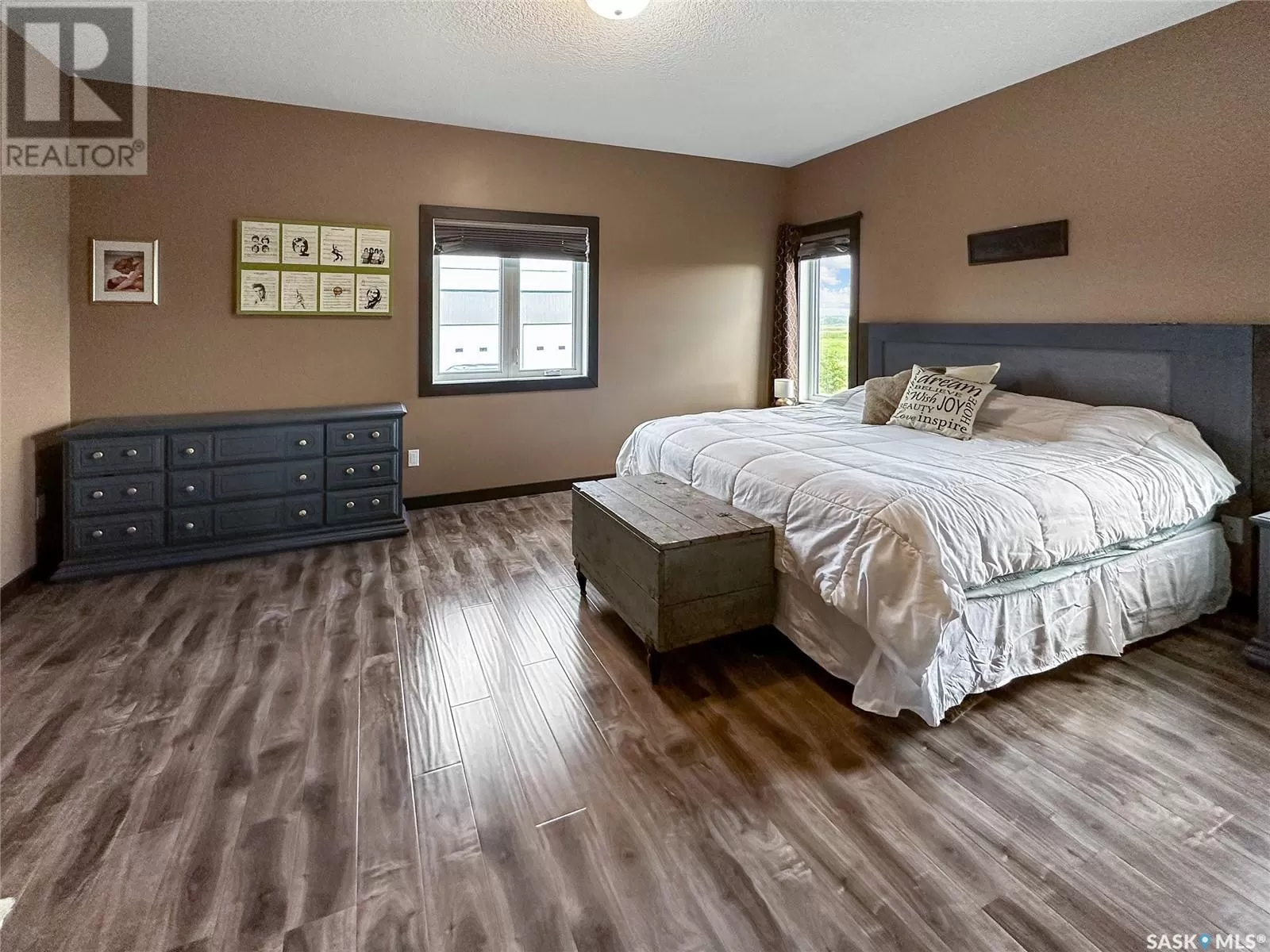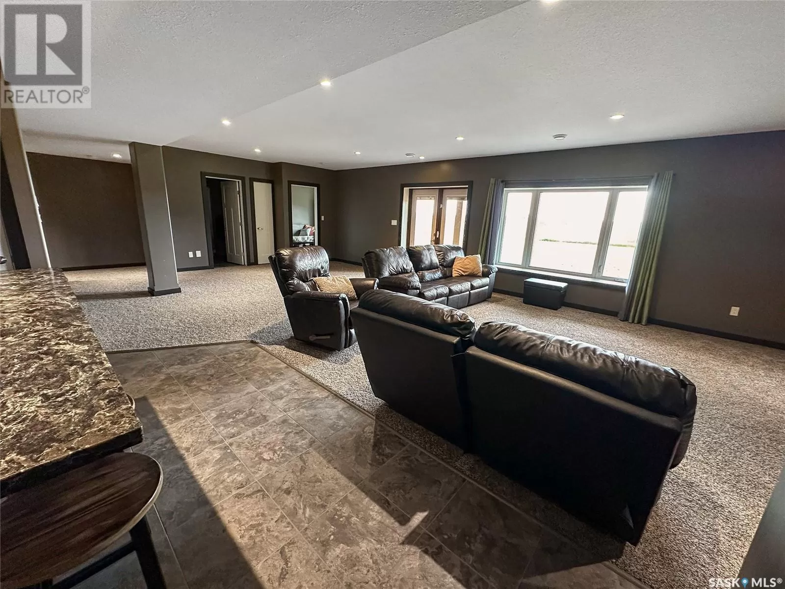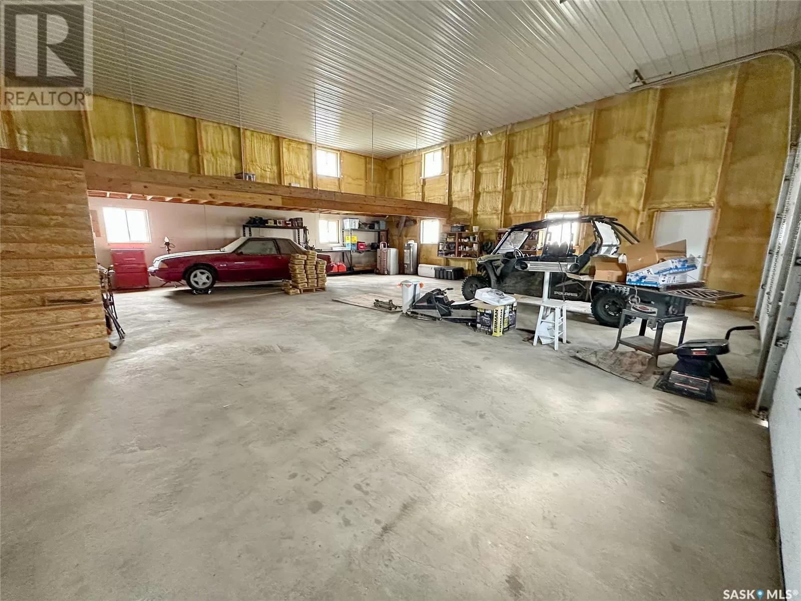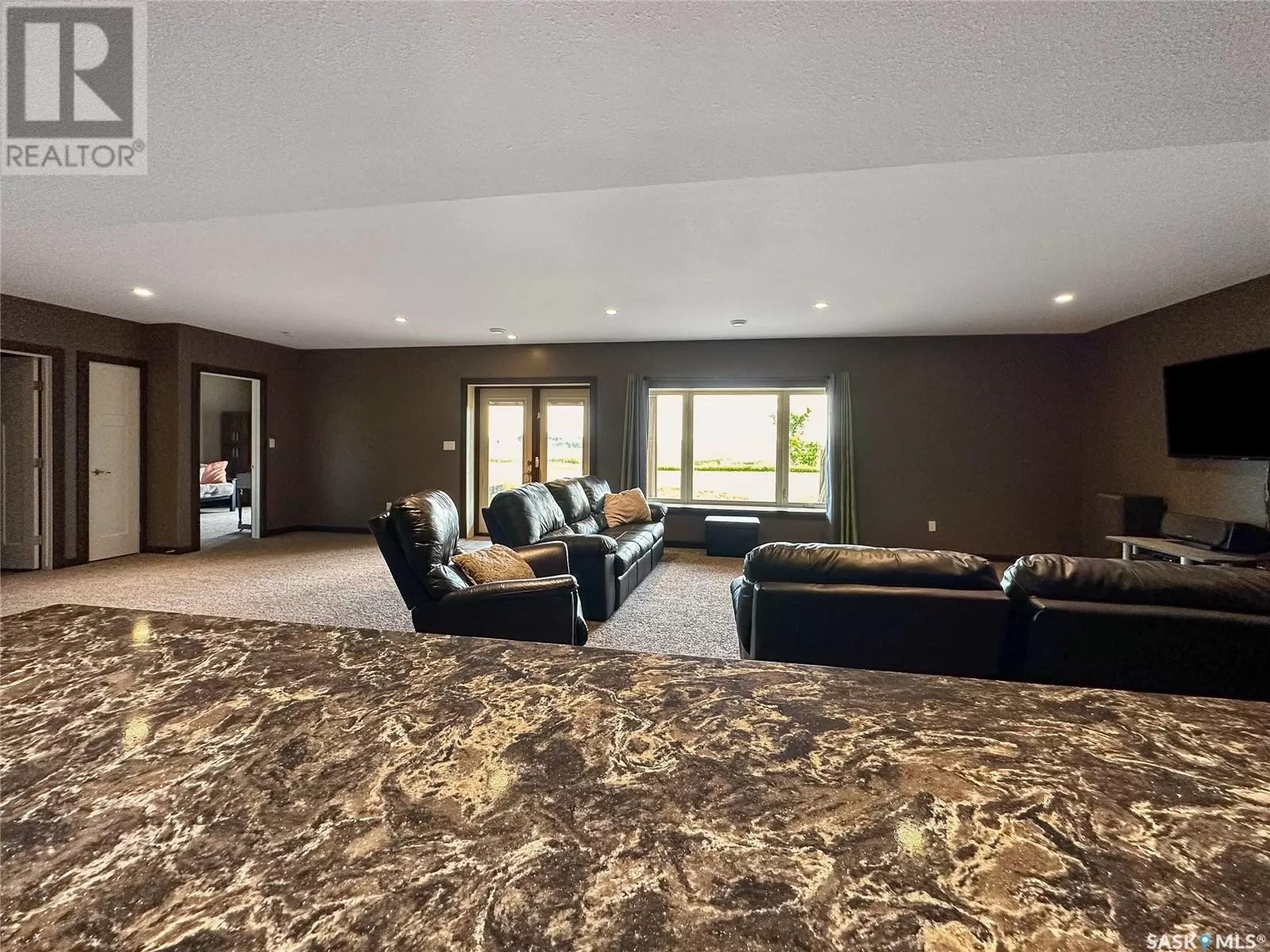 Kings & Queens, your castle is calling. Just off the beaten path of Holar Road you'll find a 15.09 walk out acreage & shop just west of HWY 8 with minimal gravel & maximum benefits. Covered decks, Vaulted ceilings, quartz countertops, a 2 way fireplace, stainless steel appliances and copious amounts of natural light set the stage for this show stopper from the front entrance to the top deck grilling station. Ceramic floor mudrooms are accented by a 2 pc bath of the double attached/insulated & heated garage so your snow gear or cow business isn't tracked through the house. A spacious office/gun room with a lane view keep business at the front and the party at the rear with all the bedrooms tucked in to their west and east facing areas of the home. A large kitchen with pull up bar stools, living room and formal dining room all flow with cohesive colorscheme and act as they should for the focus of the hub of this home. 2 bedrooms with large closets share a 4 pc bath on the west side of the home and separated by your homes hub on the eastern side is the colossal master, boasting a walk in closet & 5 pc ensuite including his & her sinks, soaker tub & custom shower with body jets. Below deck the walk out matches stride with the main floor in awesomeness with 2 extra guest beds, a massive home gym, laundry & 4 pc bath. The huge basement rec space have Sasks finest prairie views and with a handy wet bar & under stair wine room your set for some fantastic occasions at this location. Outside a mezzanine clad, 60 x 40 shop with 2/3s insulated & concrete floor with inflow heat lines ready to be hooked up await the next owners set up. The remaining area of the 60x40 runs as fantastic cold storage. Fire pits, huge mature trees, apple, Saskatoon and raspberry bushes add more value to the acres your about to acquire near the valley. Saskatchewan Potash Hot spot is calling you. Pull the trigger on your acreage owning dreams! (id:27476)