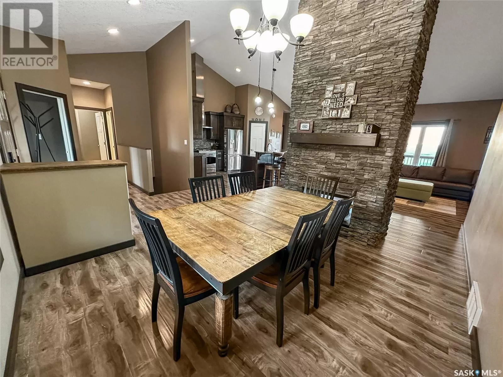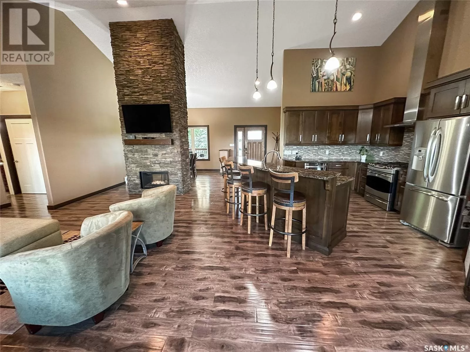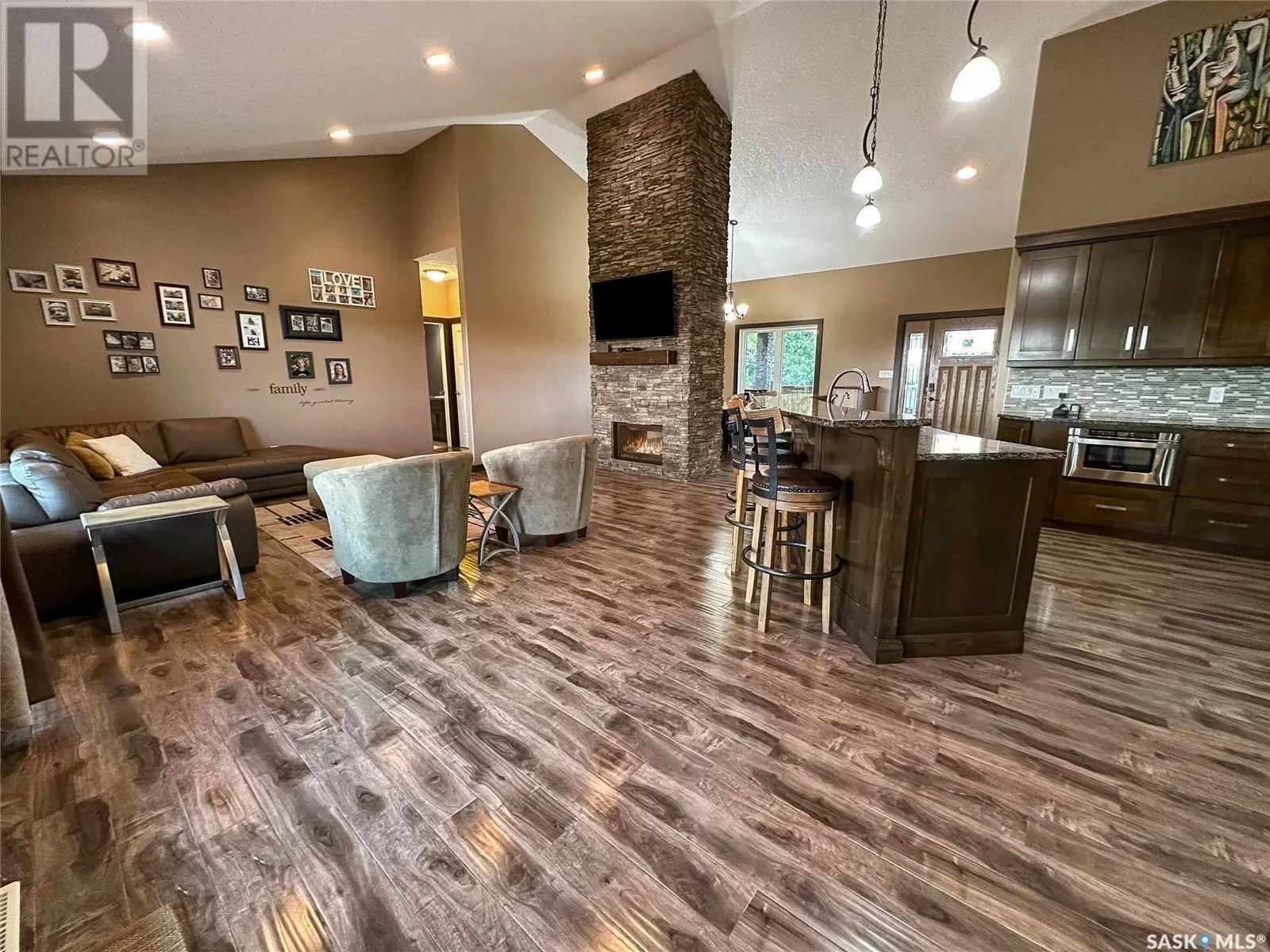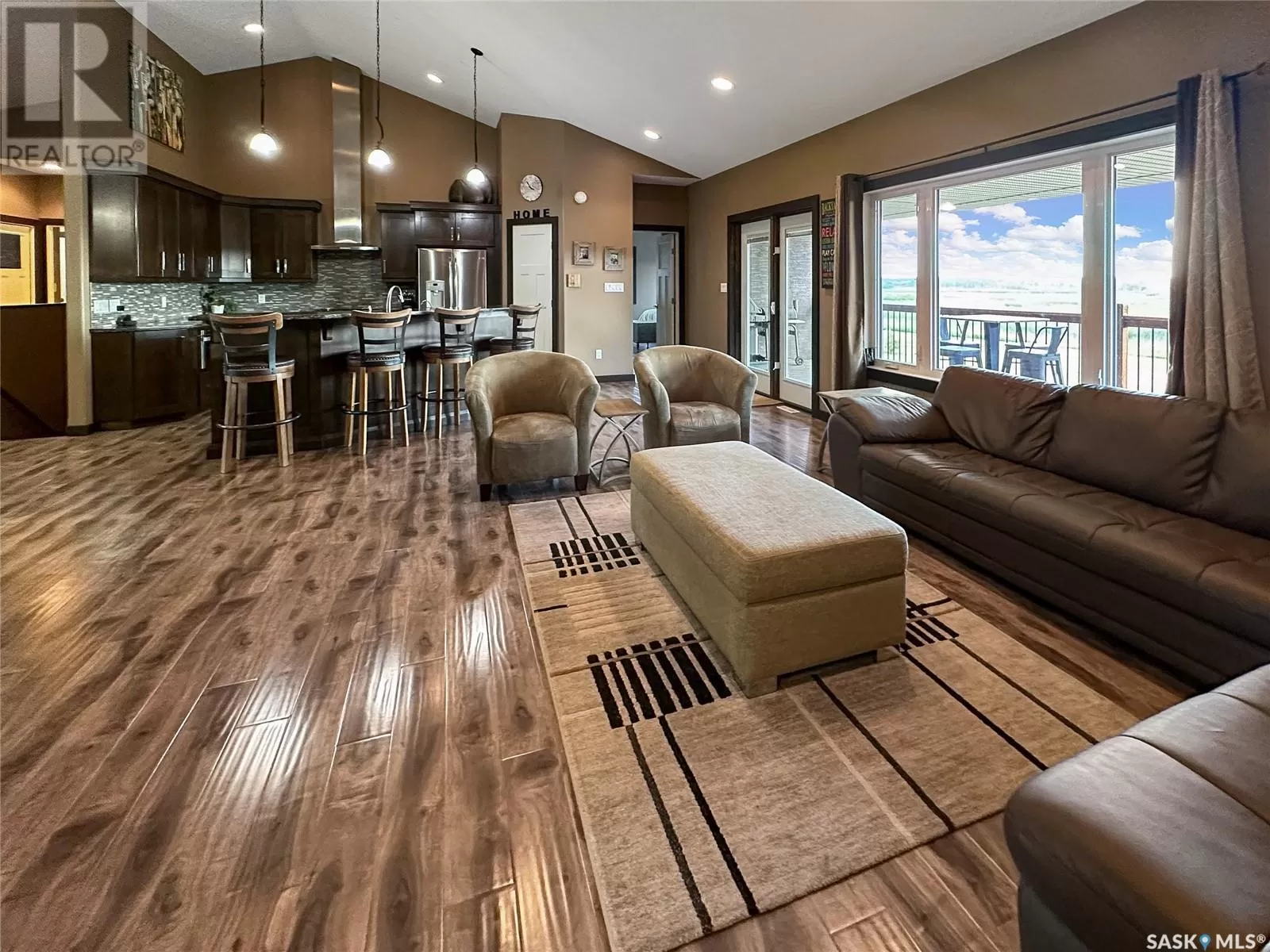 Kings & Queens, your castle is calling. Just off the beaten path of Holar Road you'll find a 15.09 walk out acreage & shop just west of HWY 8 with minimal gravel & maximum benefits. Covered decks, Vaulted ceilings, quartz countertops, a 2 way fireplace, stainless steel appliances and copious amounts of natural light set the stage for this show stopper from the front entrance to the top deck grilling station. Ceramic floor mudrooms are accented by a 2 pc bath of the double attached/insulated & heated garage so your snow gear or cow business isn't tracked through the house. A spacious office/gun room with a lane view keep business at the front and the party at the rear with all the bedrooms tucked in to their west and east facing areas of the home. A large kitchen with pull up bar stools, living room and formal dining room all flow with cohesive colorscheme and act as they should for the focus of the hub of this home. 2 bedrooms with large closets share a 4 pc bath on the west side of the home and separated by your homes hub on the eastern side is the colossal master, boasting a walk in closet & 5 pc ensuite including his & her sinks, soaker tub & custom shower with body jets. Below deck the walk out matches stride with the main floor in awesomeness with 2 extra guest beds, a massive home gym, laundry & 4 pc bath. The huge basement rec space have Sasks finest prairie views and with a handy wet bar & under stair wine room your set for some fantastic occasions at this location. Outside a mezzanine clad, 60 x 40 shop with 2/3s insulated & concrete floor with inflow heat lines ready to be hooked up await the next owners set up. The remaining area of the 60x40 runs as fantastic cold storage. Fire pits, huge mature trees, apple, Saskatoon and raspberry bushes add more value to the acres your about to acquire near the valley. Saskatchewan Potash Hot spot is calling you. Pull the trigger on your acreage owning dreams! (id:27476)