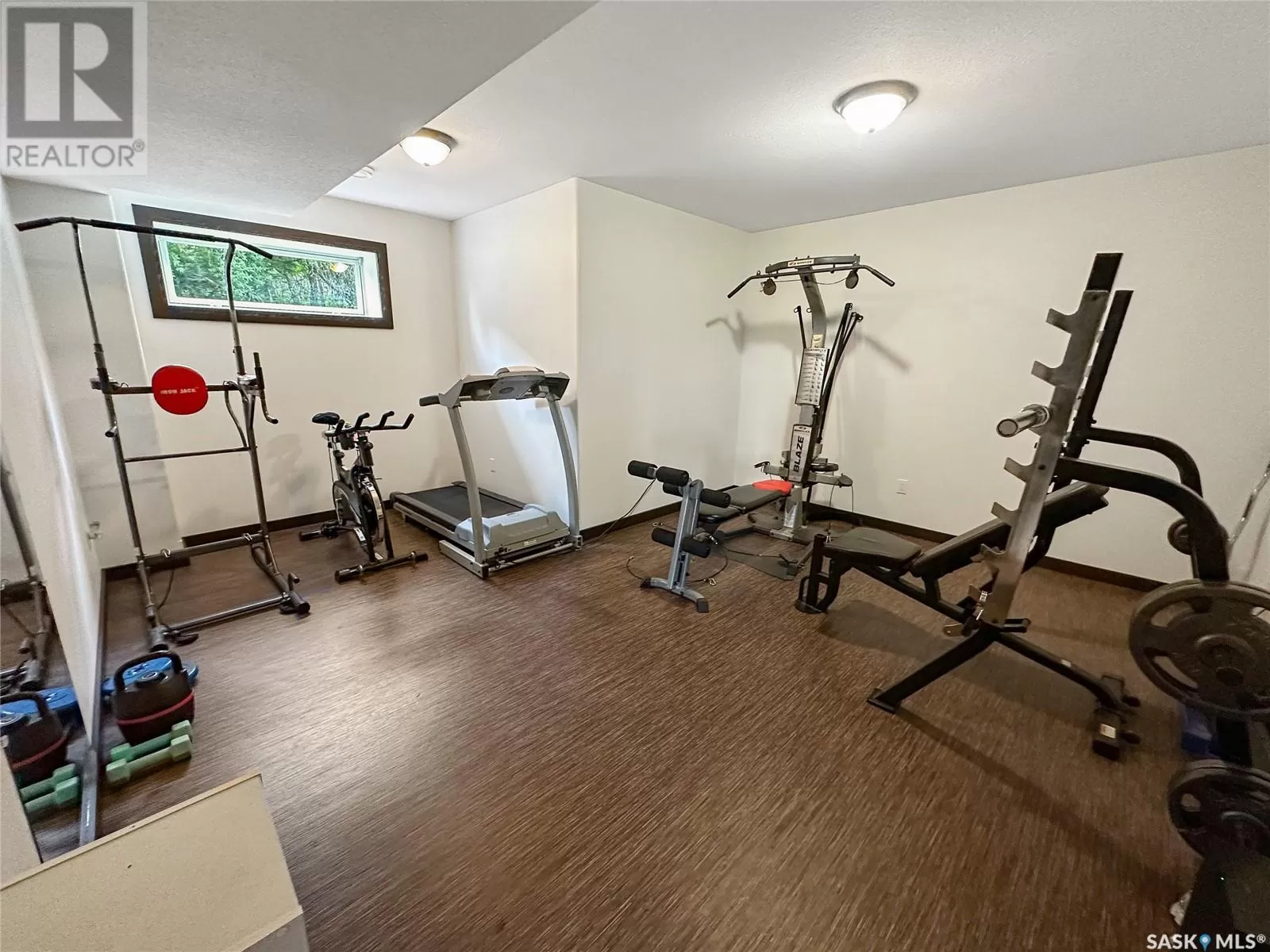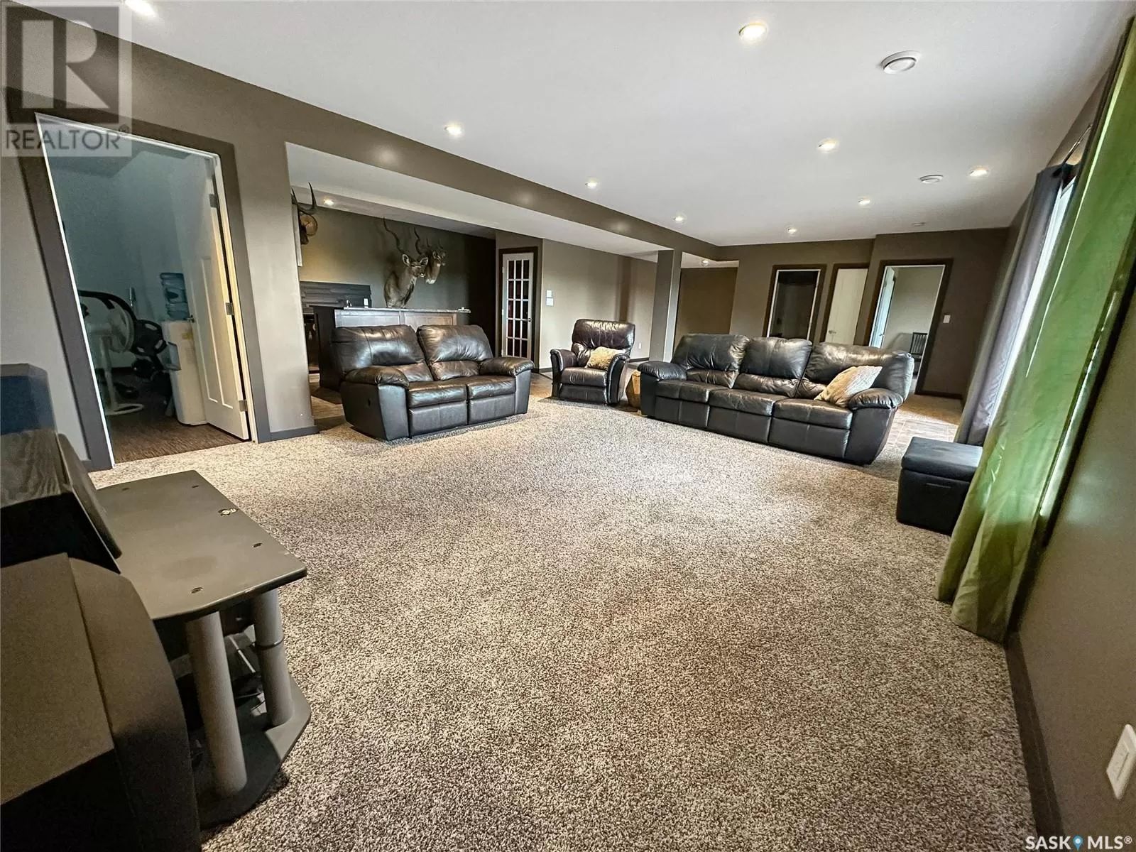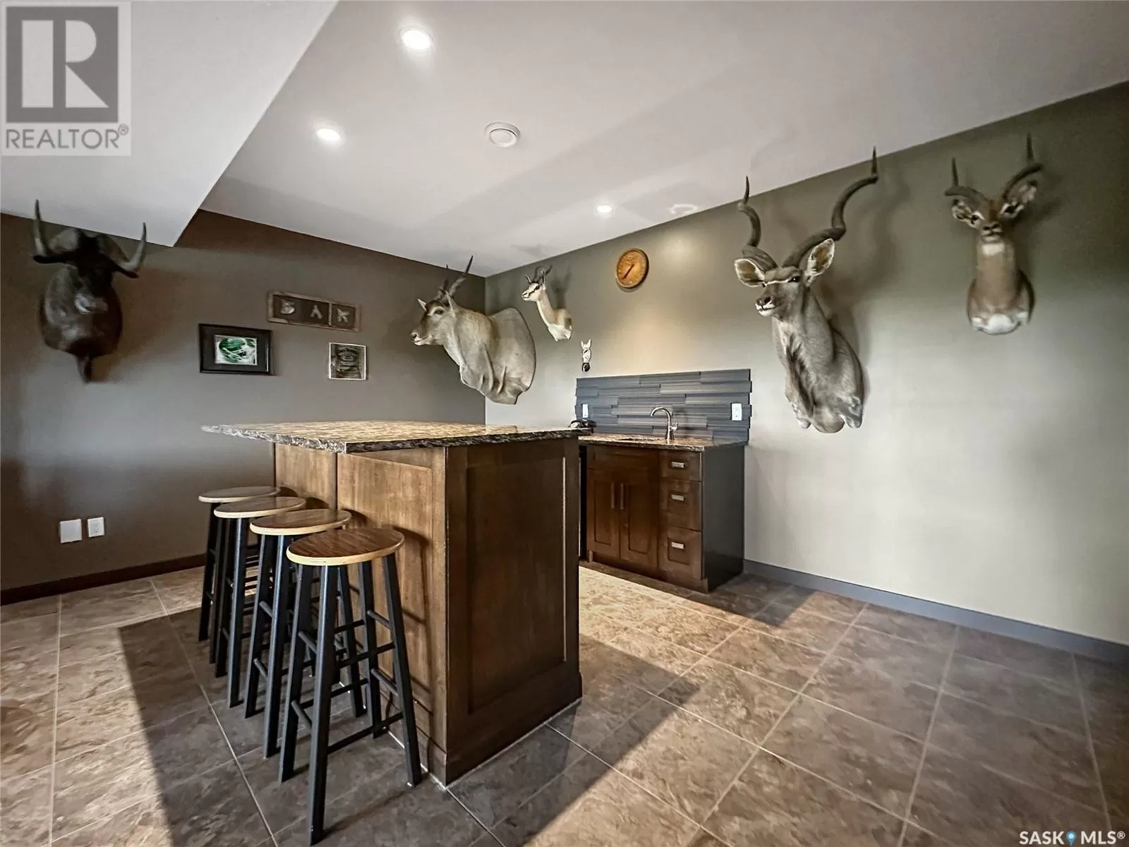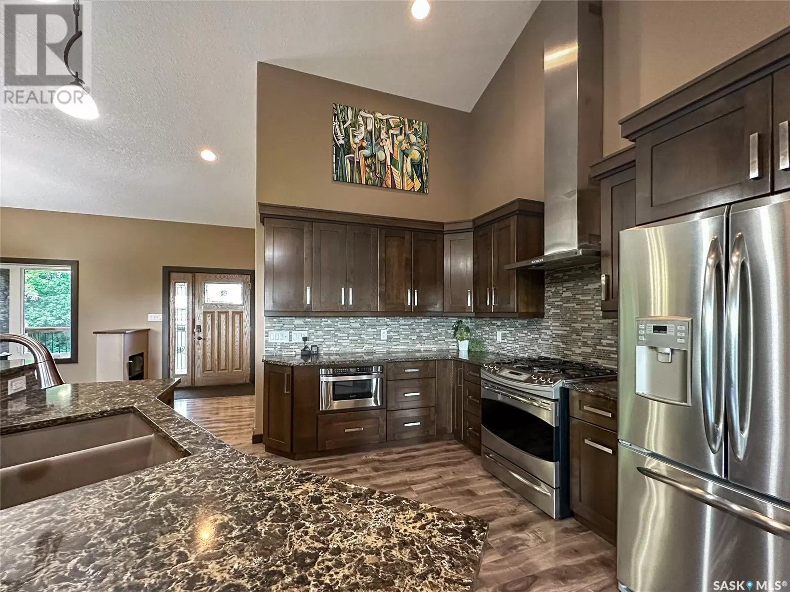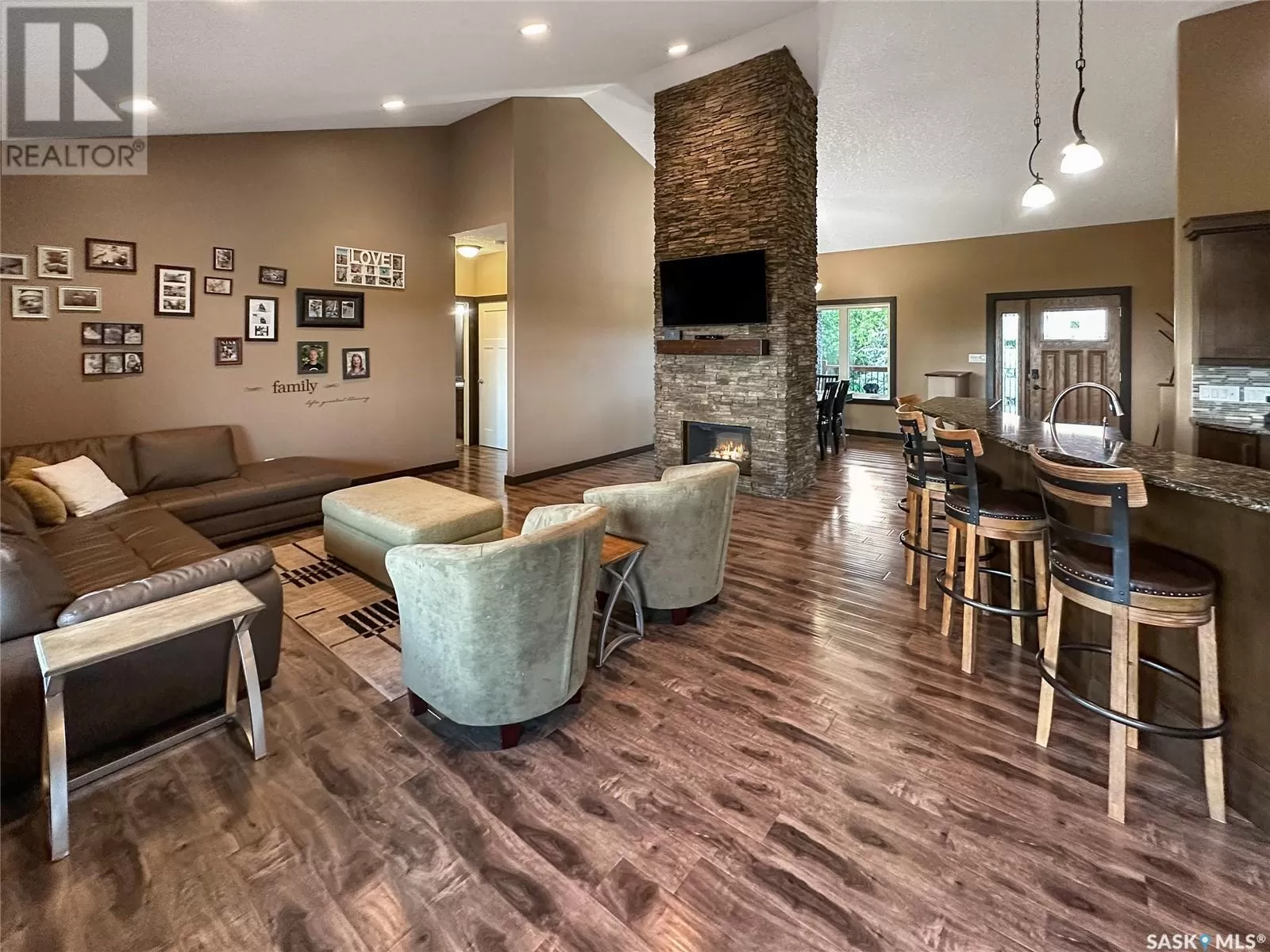 Kings & Queens, your castle is calling. Just off the beaten path of Holar Road you'll find a 15.09 walk out acreage & shop just west of HWY 8 with minimal gravel & maximum benefits. Covered decks, Vaulted ceilings, quartz countertops, a 2 way fireplace, stainless steel appliances and copious amounts of natural light set the stage for this show stopper from the front entrance to the top deck grilling station. Ceramic floor mudrooms are accented by a 2 pc bath of the double attached/insulated & heated garage so your snow gear or cow business isn't tracked through the house. A spacious office/gun room with a lane view keep business at the front and the party at the rear with all the bedrooms tucked in to their west and east facing areas of the home. A large kitchen with pull up bar stools, living room and formal dining room all flow with cohesive colorscheme and act as they should for the focus of the hub of this home. 2 bedrooms with large closets share a 4 pc bath on the west side of the home and separated by your homes hub on the eastern side is the colossal master, boasting a walk in closet & 5 pc ensuite including his & her sinks, soaker tub & custom shower with body jets. Below deck the walk out matches stride with the main floor in awesomeness with 2 extra guest beds, a massive home gym, laundry & 4 pc bath. The huge basement rec space have Sasks finest prairie views and with a handy wet bar & under stair wine room your set for some fantastic occasions at this location. Outside a mezzanine clad, 60 x 40 shop with 2/3s insulated & concrete floor with inflow heat lines ready to be hooked up await the next owners set up. The remaining area of the 60x40 runs as fantastic cold storage. Fire pits, huge mature trees, apple, Saskatoon and raspberry bushes add more value to the acres your about to acquire near the valley. Saskatchewan Potash Hot spot is calling you. Pull the trigger on your acreage owning dreams! (id:27476)