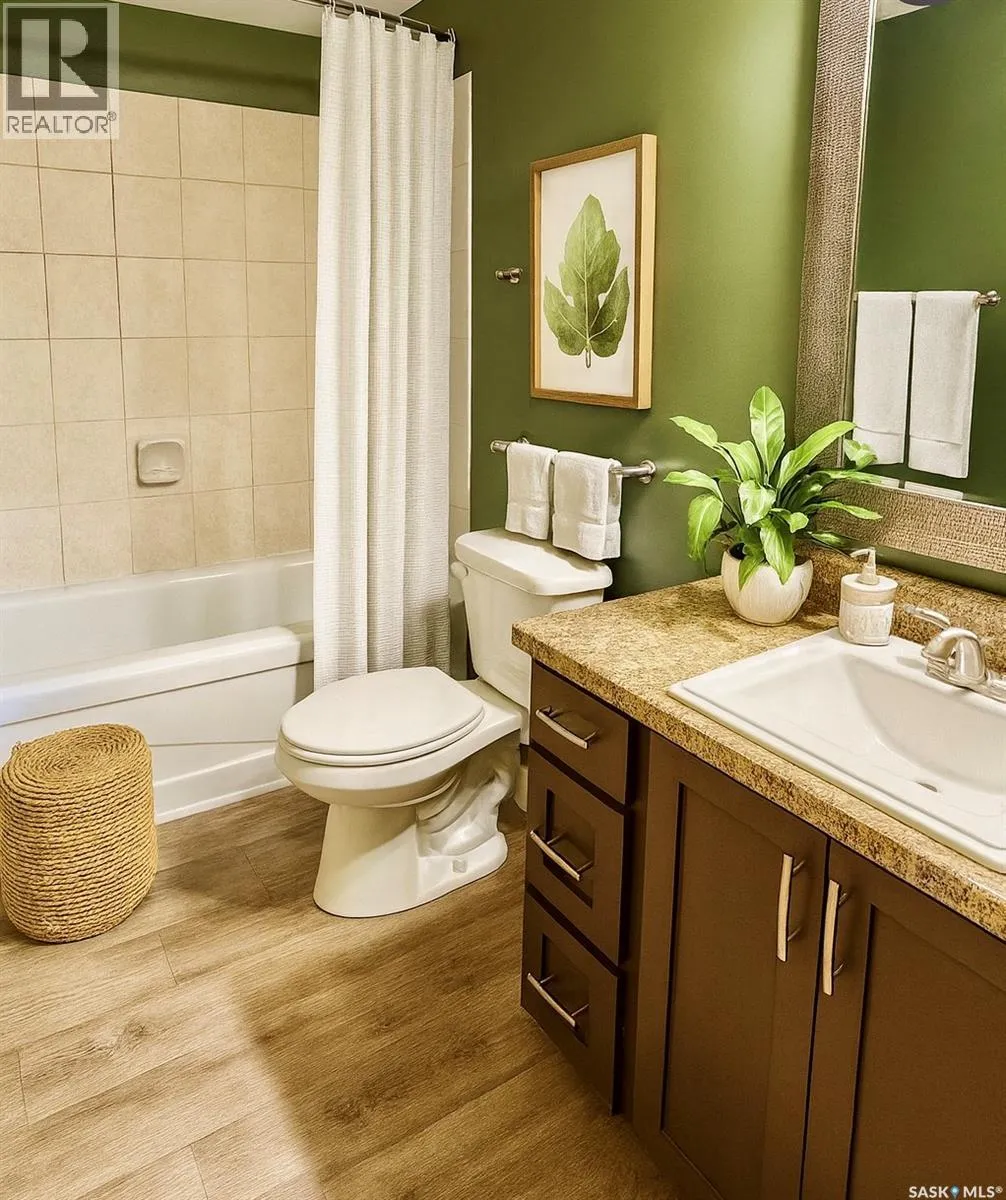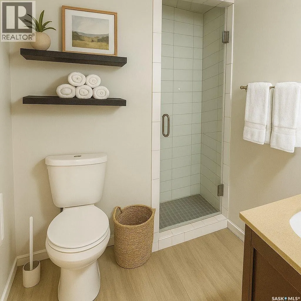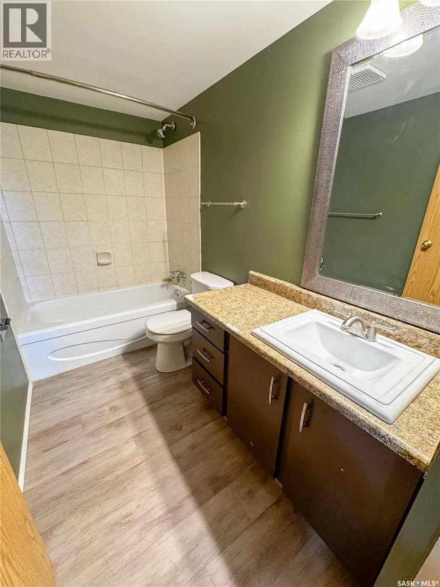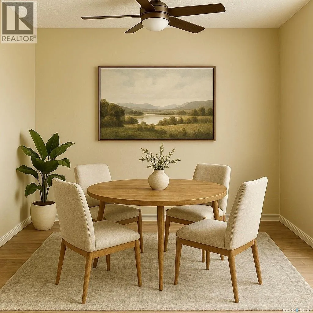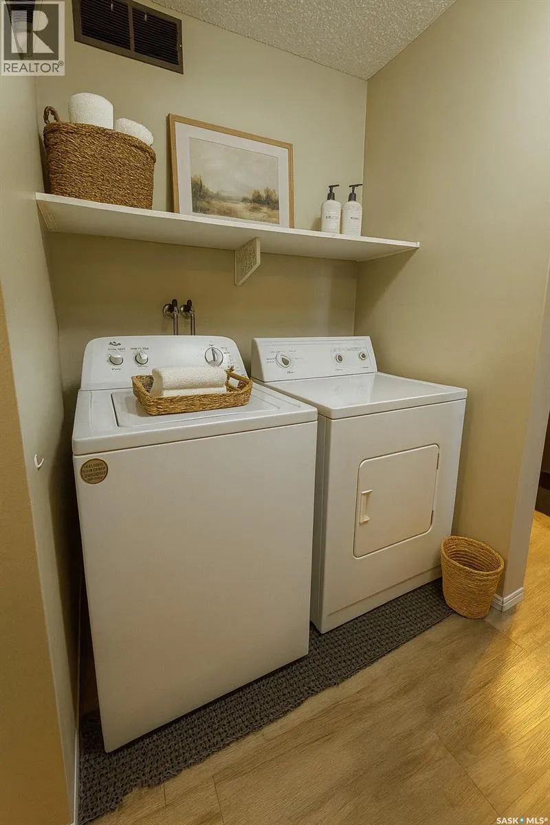 Welcome to this rarely available 2-bedroom, 2-bathroom condo boasting quiet south-facing views and 1,160 sq ft of comfortable living space. The spacious white kitchen offers ample cabinetry, generous counter space, and a full appliance package, seamlessly flowing into the oversized living and dining area. Step through the balcony doors onto your expansive 37-foot-long balcony, complete with convenient storage units at each end. Down the hall, you'll find a dedicated laundry space and two well-proportioned bedrooms. The sizable master suite is a true retreat, featuring its own 3-piece ensuite washroom, a wall air conditioner, and two large closets. This property presents an excellent opportunity for affordable living or a valuable addition to your revenue portfolio. Embrace the ease of condo living, where building maintenance, grass cutting, and snow removal are all taken care of for you. Conveniently located near the Aquatic Centre, various restaurants, Swift Current Comprehensive High School, and Irwin School. Call your REALTOR ® today and schedule your viewing! (id:27476)