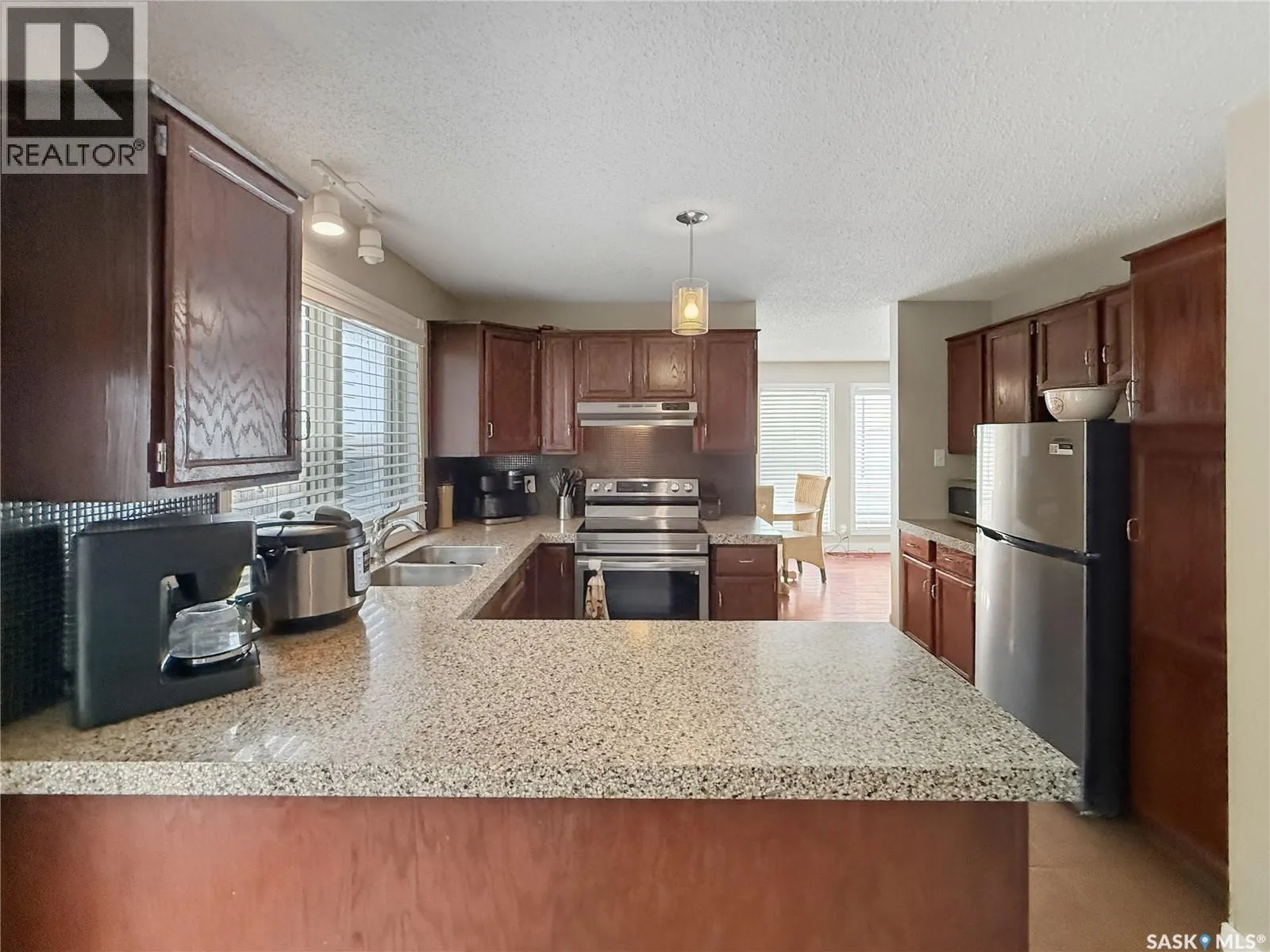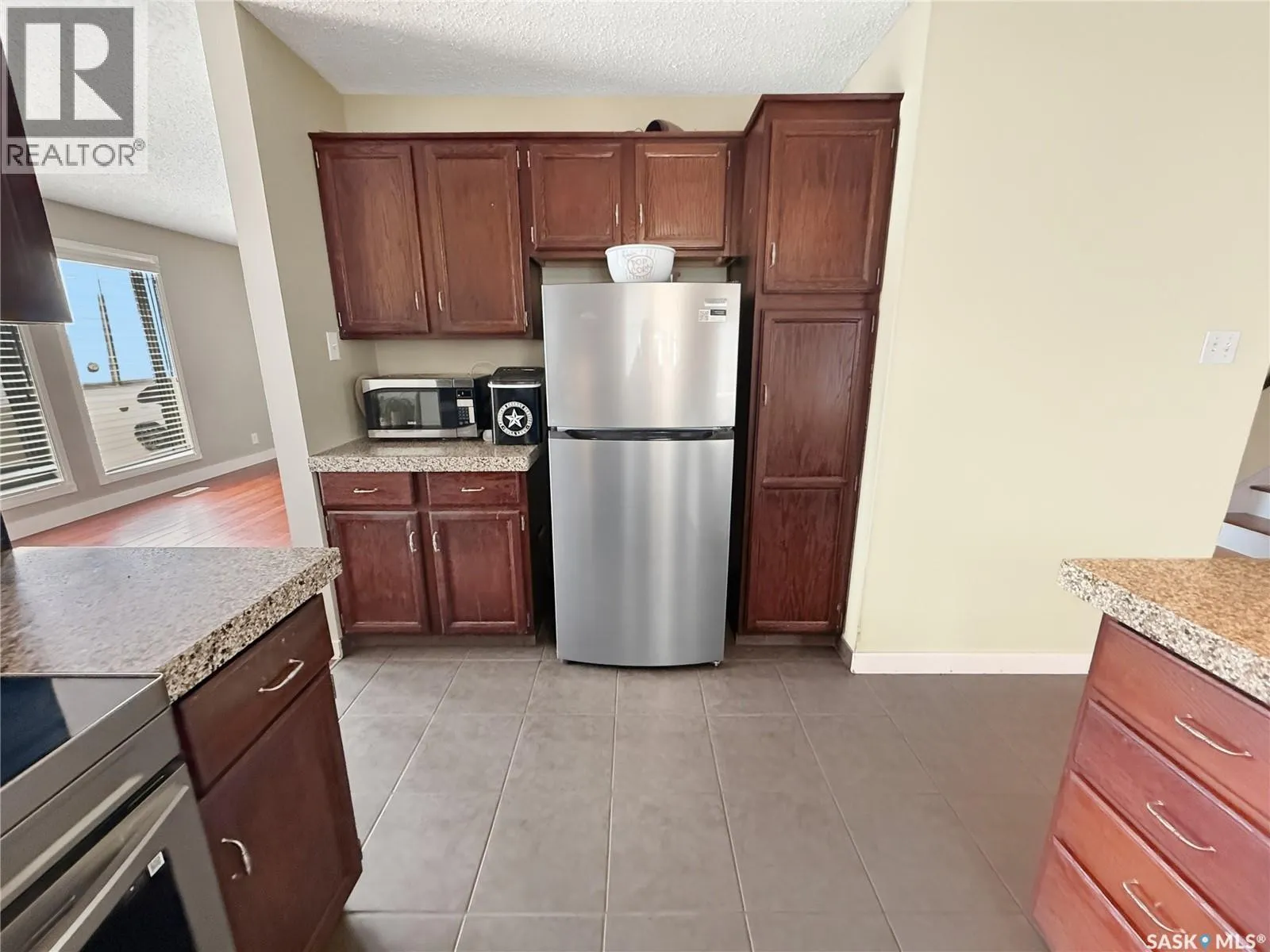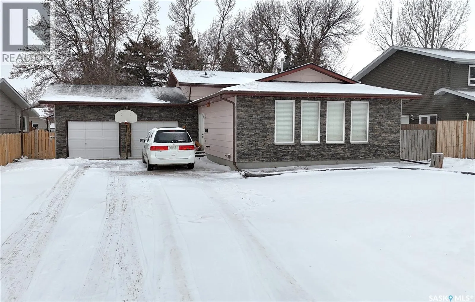 Set on an oversized lot in the Trail subdivision, with sweeping prairie views and those iconic Land of the Living Skies sunsets, this 4-level split offers tremendous potential and generous square footage for a growing family. The main floor features a spacious L-shaped living and dining room with original hardwood floors that add warmth and character. The U-shaped kitchen provides great workspace, stone countertops, and a newer fridge and stove (approx. 2 years old). A bright dining nook with garden doors leads to the backyard and overlooks the large family room on the lower level. Just a few steps down, the family room is anchored by a wood-burning fireplace, and this level also includes a bedroom, a 3-piece bathroom, laundry area, and direct access to the double attached garageâcomplete with radiant overhead heat. Upstairs, youâll find three bedrooms, including a generous primary suite with a walk-in closet and 2-piece ensuite, along with a 4-piece main bathroom. The basement level offers even more living space with a sizable rec room, a den, and a mechanical room featuring an energy-efficient furnace. Recent practical updates include new shingles in 2024, giving buyers peace of mind for years to come. Outdoors, the oversized backyard includes a storage shed and plenty of room to create your ideal outdoor setup. Parking is abundant, with space for an RV and all the extras. With its spacious layout, incredible lot, and desirable location in the Trail subdivision along Battleford Trail, this home is a wonderful opportunity for someone looking to personalize a space and make it their own. (id:27476)