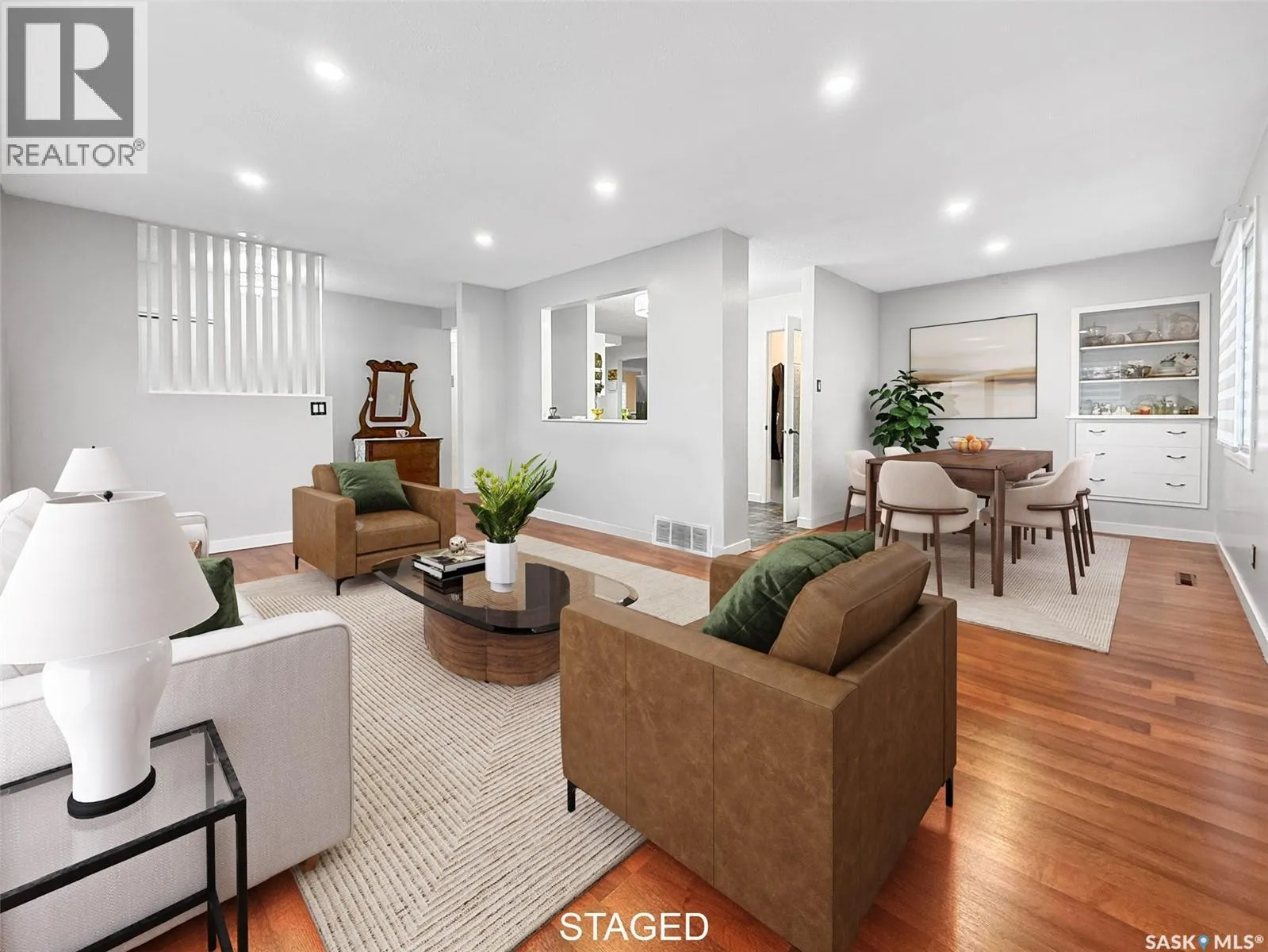 1102 Golden Place is a rare North Hill opportunityâhomes on this quiet, highly sought-after cul-de-sac seldom come available. Set on a corner lot directly across from Swift Current Comprehensive High School and Kâ 8 Irwin School, this location puts Billy Buffalo Park just steps away, with Elmwood Golf Course, restaurants, and everyday amenities only a short walk or drive from home. This well-built bungalow offers 1,633 sq. ft. of functional main-floor living. The bright L-shaped living and dining area features large north- and west-facing windows. The crisp white kitchen is finished with a stainless-steel appliance package and glass backsplash. Off the kitchen, youâll find a comfortable family room with newer garden doors leading to the deckâideal for indoor-outdoor entertaining. A separate office/den also includes garden doors and can easily serve as a fourth main-floor bedroom if desired. Three bedrooms are located on the main level, including a primary bedroom with a convenient 2-piece ensuite. Downstairs, and 4 piece refreshed washroom. The fully developed lower level provides a spacious family room with a corner wet bar, an additional bedroom, a 3-pc bathroom, workshop space, laundry/utility room, and ample storage.Outside, the yard is designed for low maintenance while still offering mature trees, privacy, and plenty of room to host. Find a concrete patio and large no maintenance backyard. A maintenance-free fence (2018) surrounds the space, and the double detached garage is complemented by additional gated RV parking. Key updates include metal roof on house and garage (2016), BathFitter tub (2014) and bathroom refresh, updated decks (2018), kitchen appliances (2019), exterior lighting (2022), basement paint and trim (2022), hot water heater (2024), and new energy-efficient zoned furnaces (2025). Imagine never packing our children a lunch again... this location can not be beat! Contact today for more information or to book your personal viewing today! (id:27476)